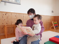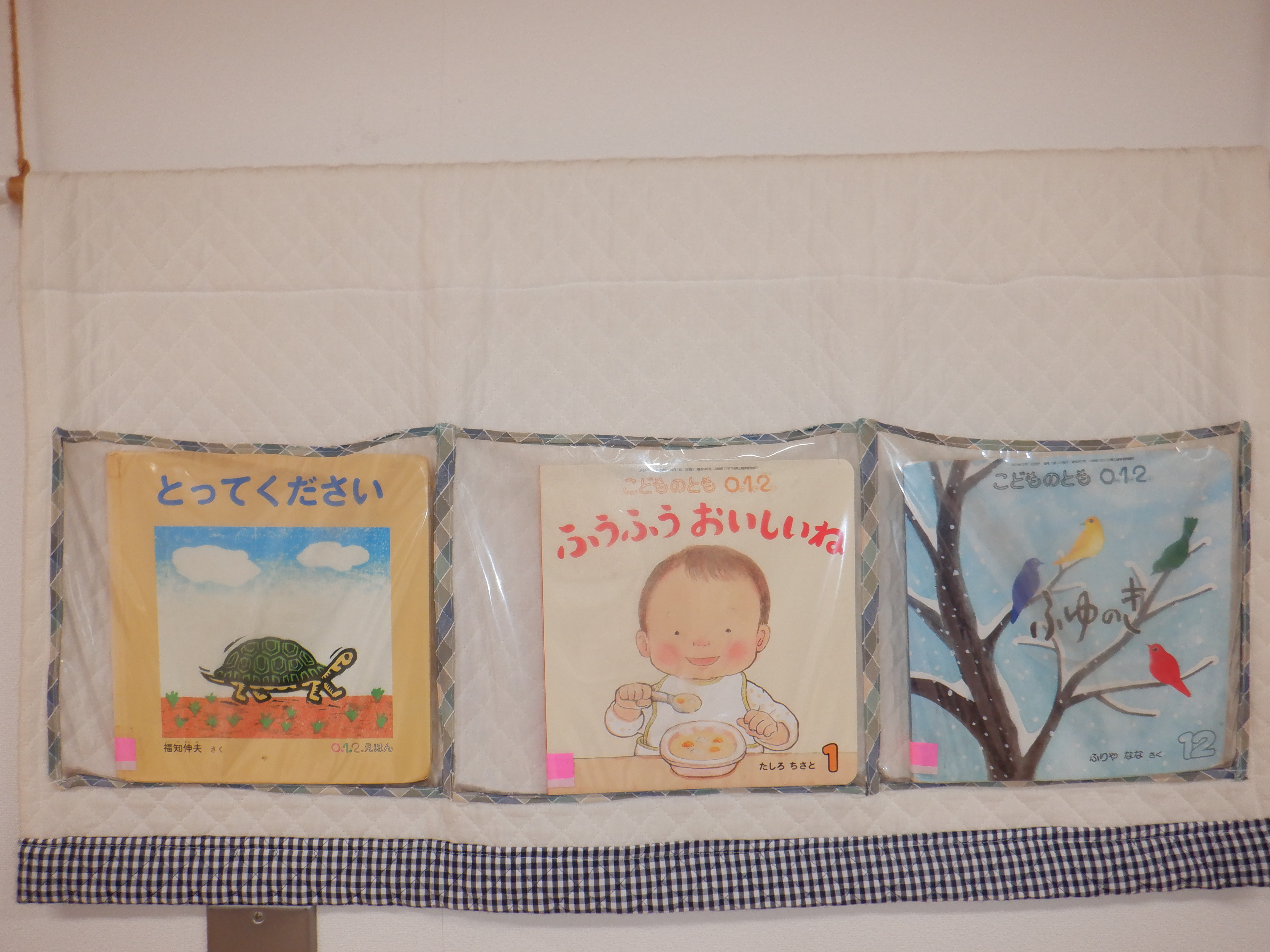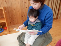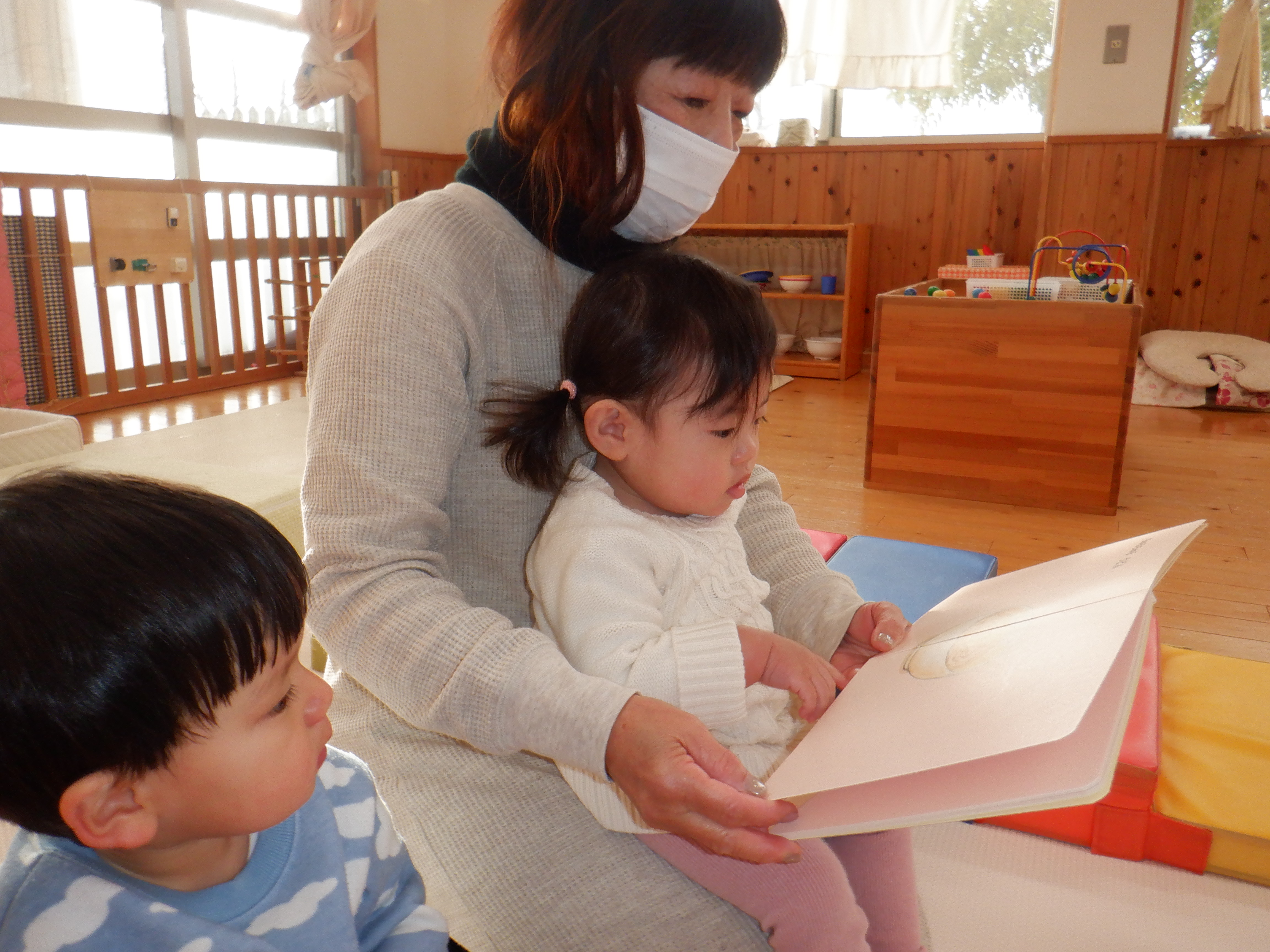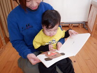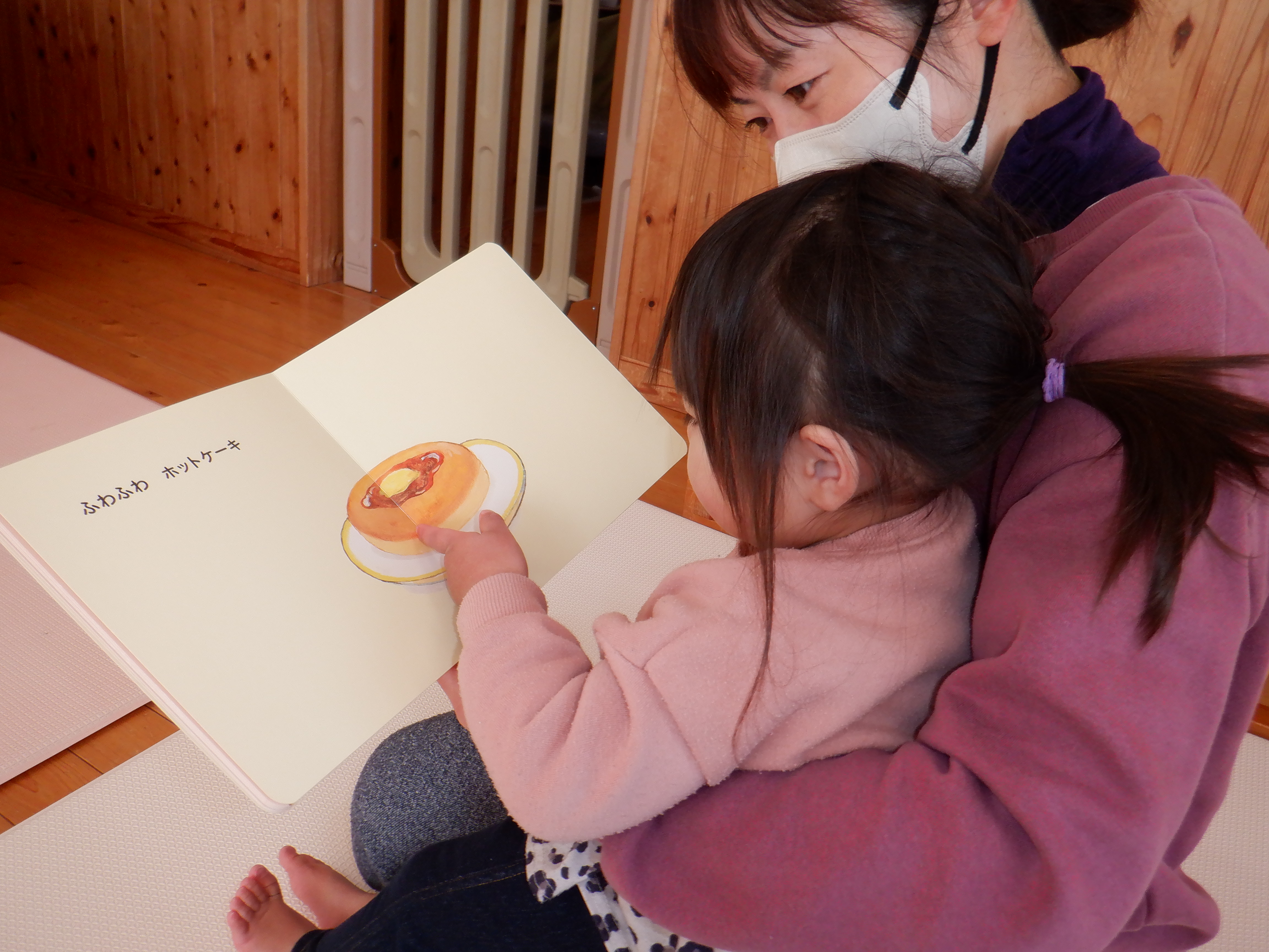 すみれ組では絵本を子どもが見える位置に掛けています。子ども達は指をさして保育者に読みたい絵本を伝え、保育者と子ども1対1で膝の上に座り読み聞かせをしています。言葉も出てきて絵を指差して保育者の言った事を真似したり、何度も出てくるフレーズを言っていたりします。食べ物が出てくる絵本では食べる真似をして保育者と目を合わせて嬉しそうな笑顔を見せ絵本に親しんでいます。