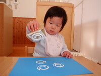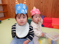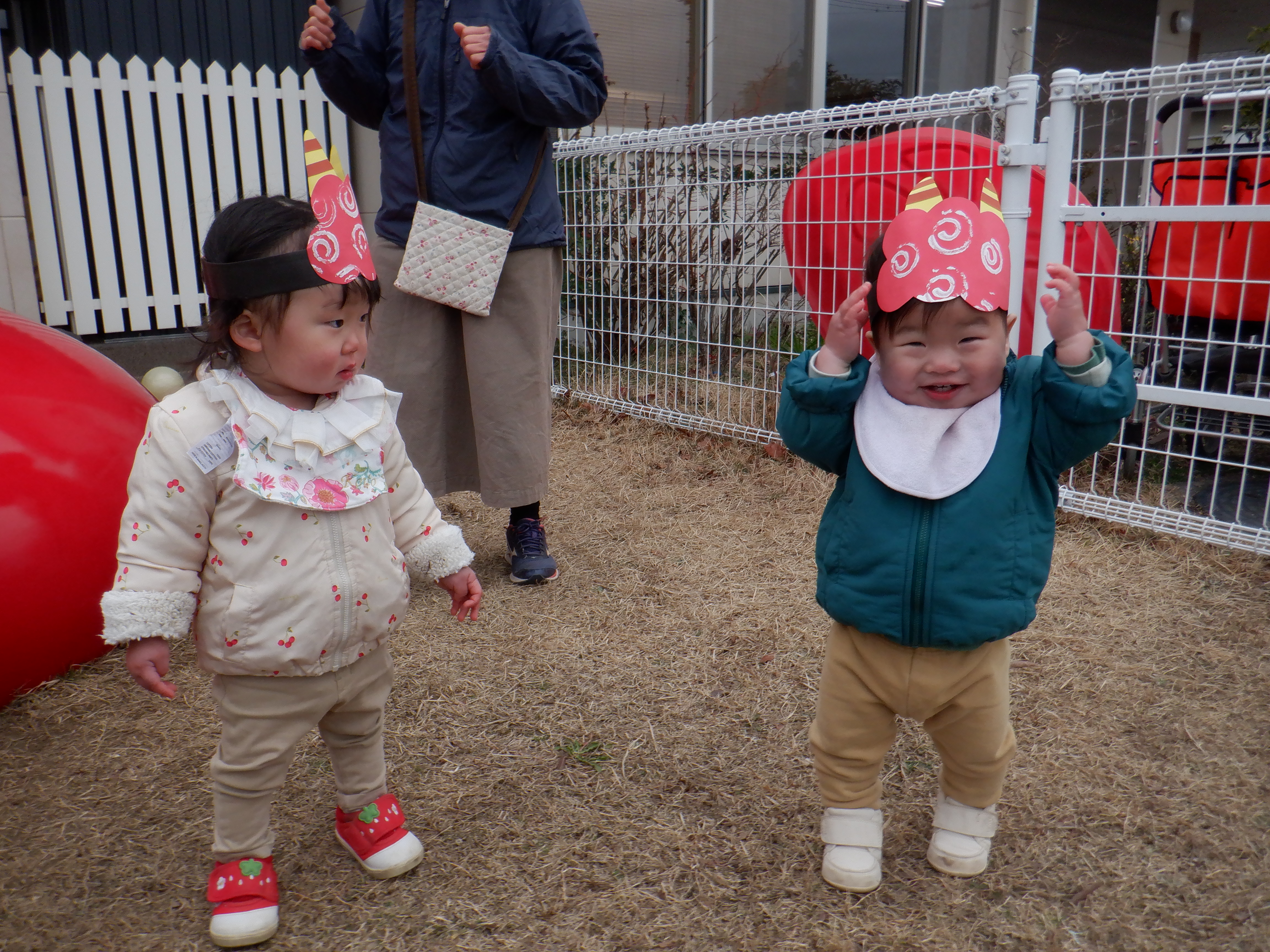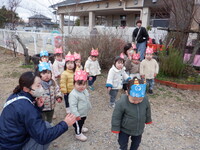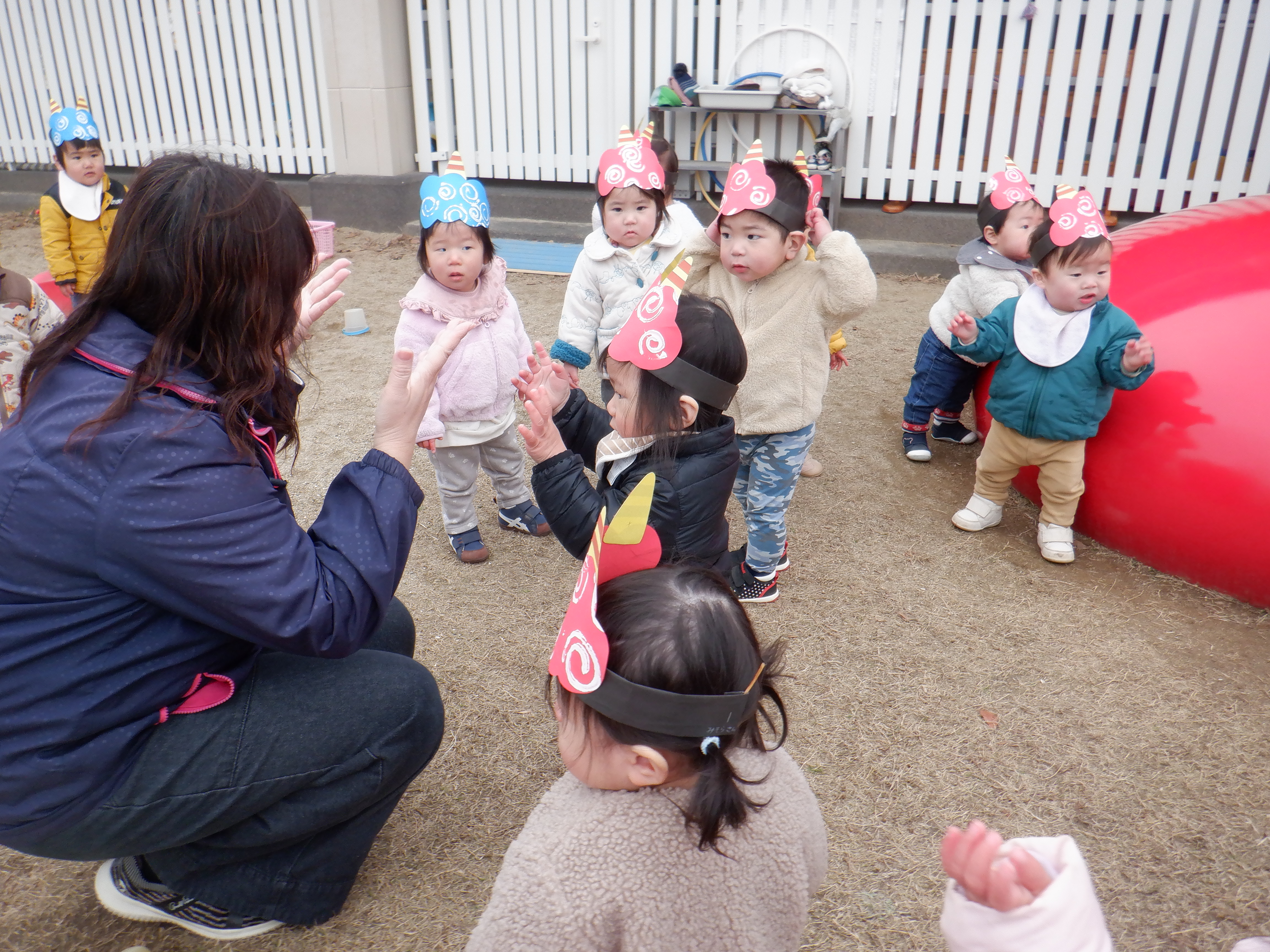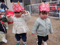 すみれぐみも節分の日にお面をかぶり、園庭で遊んだり、大きいクラスの子の豆まきを見に行ったりしました。お面を作ったばかりのころは怖がる子もいたのですが、お部屋に飾っているうちに慣れてきたのか、笑顔でお面を付けて行事を楽しむことができました。まめまきの歌も大好きで、リズムに乗って体を揺らしたり、声を出したりしています。
