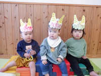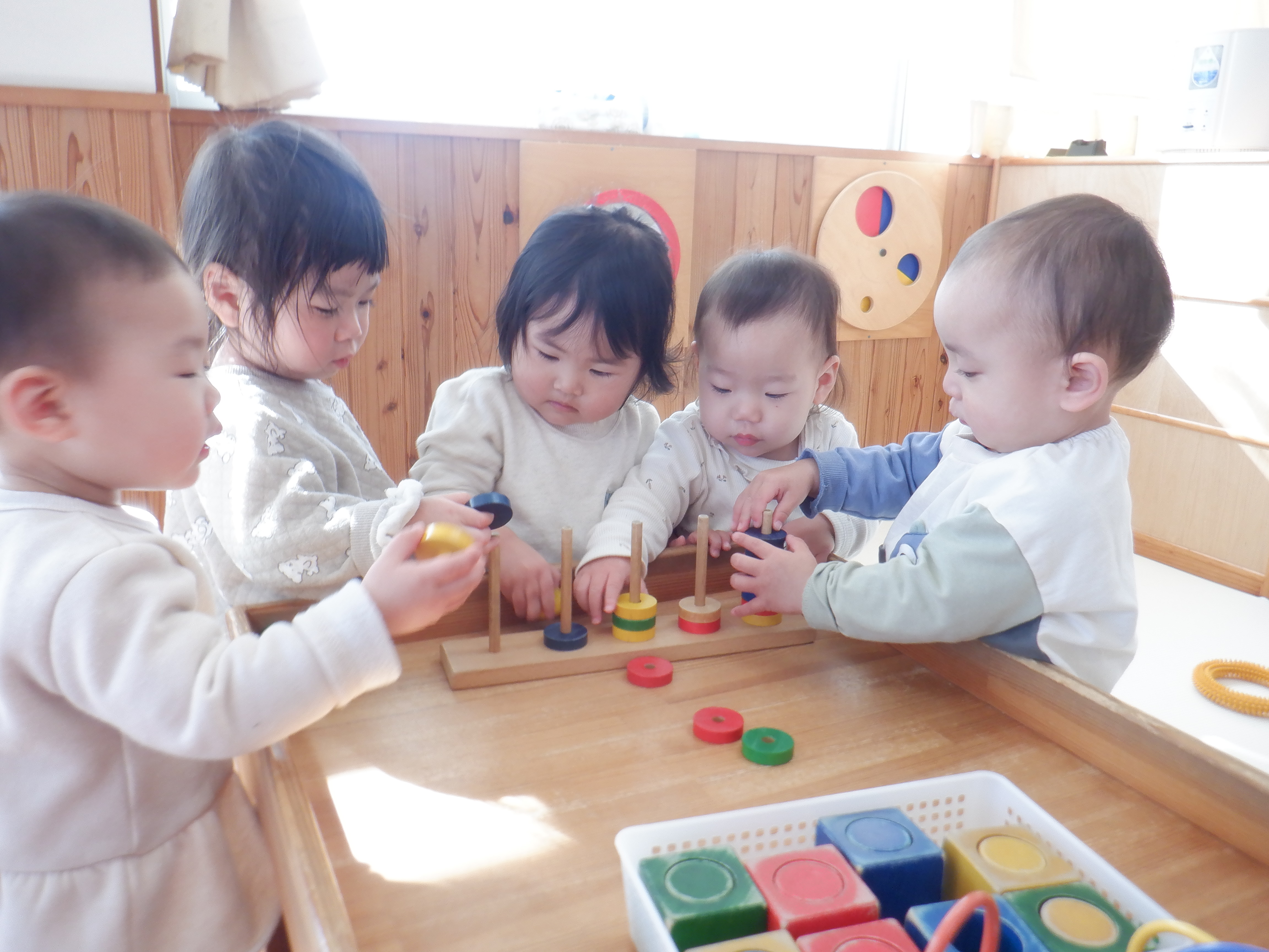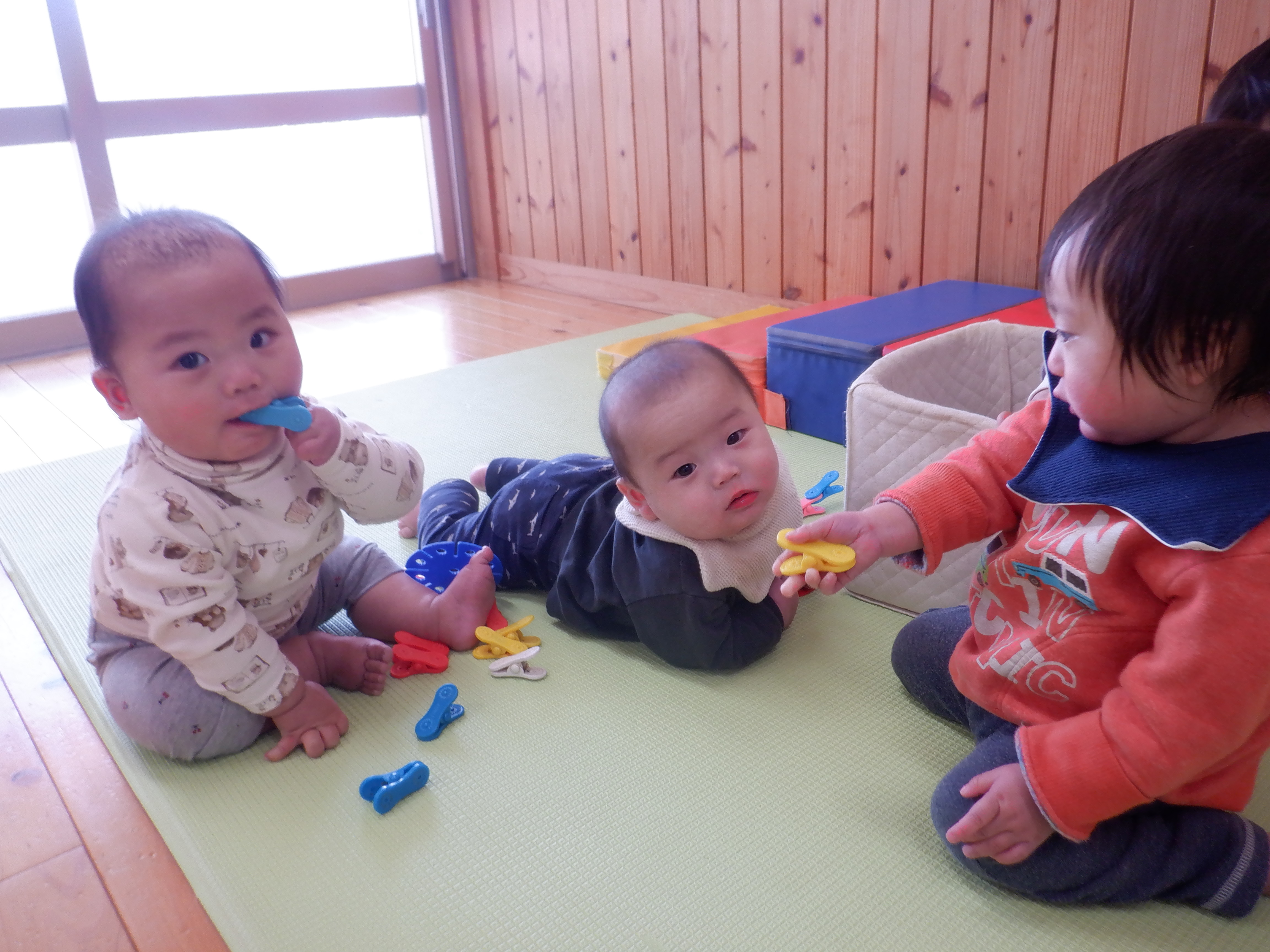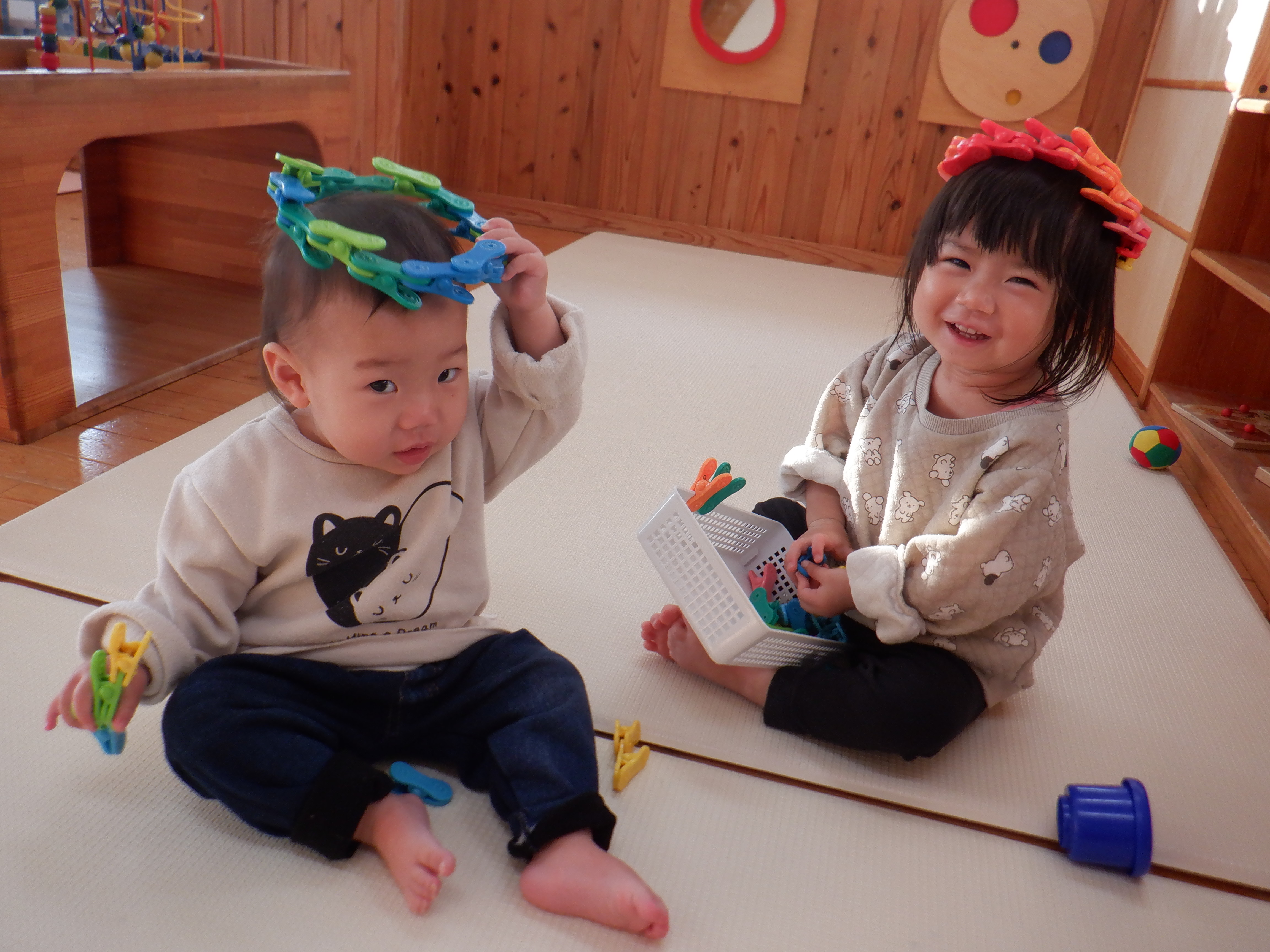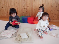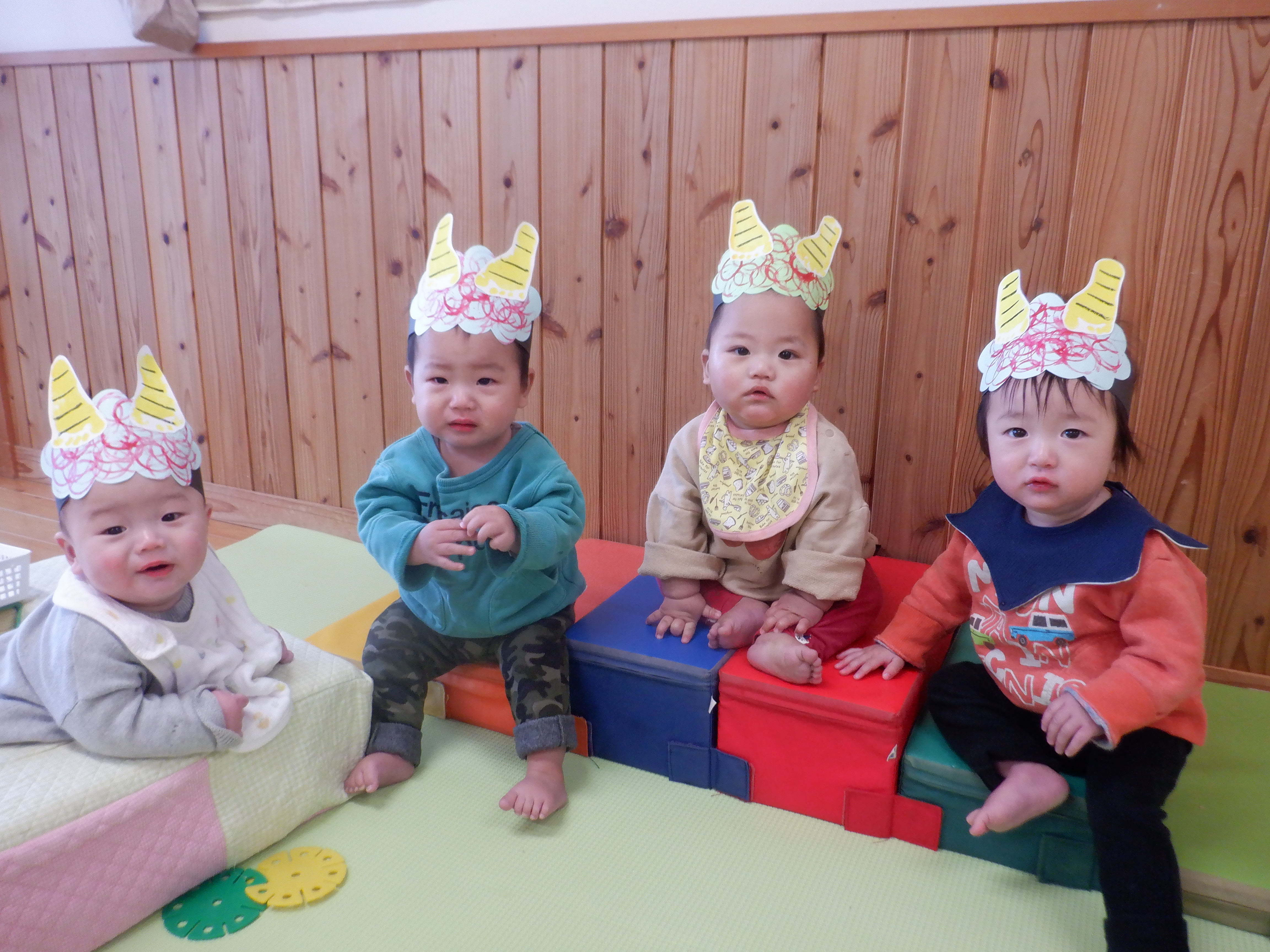 手先を使って遊ぶ、アイクリップやロンディー、プラステンなどでよく遊んでいます。集中している時はとても静かに手を動かしています。自分の思ったものができると保育者に見せてくれ一緒に喜び合いながら遊んでいると他の子どもたちも興味を持って同じ遊びをしようとやってきています。人形のお世話遊びも好きで抱いたり寝かしつけたり小さなお母さんがたくさんいます。先週の”お楽しみの小鬼さん”はさくらんぼ組の子どもたちの写真を載させてもらいました。