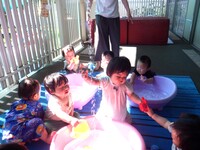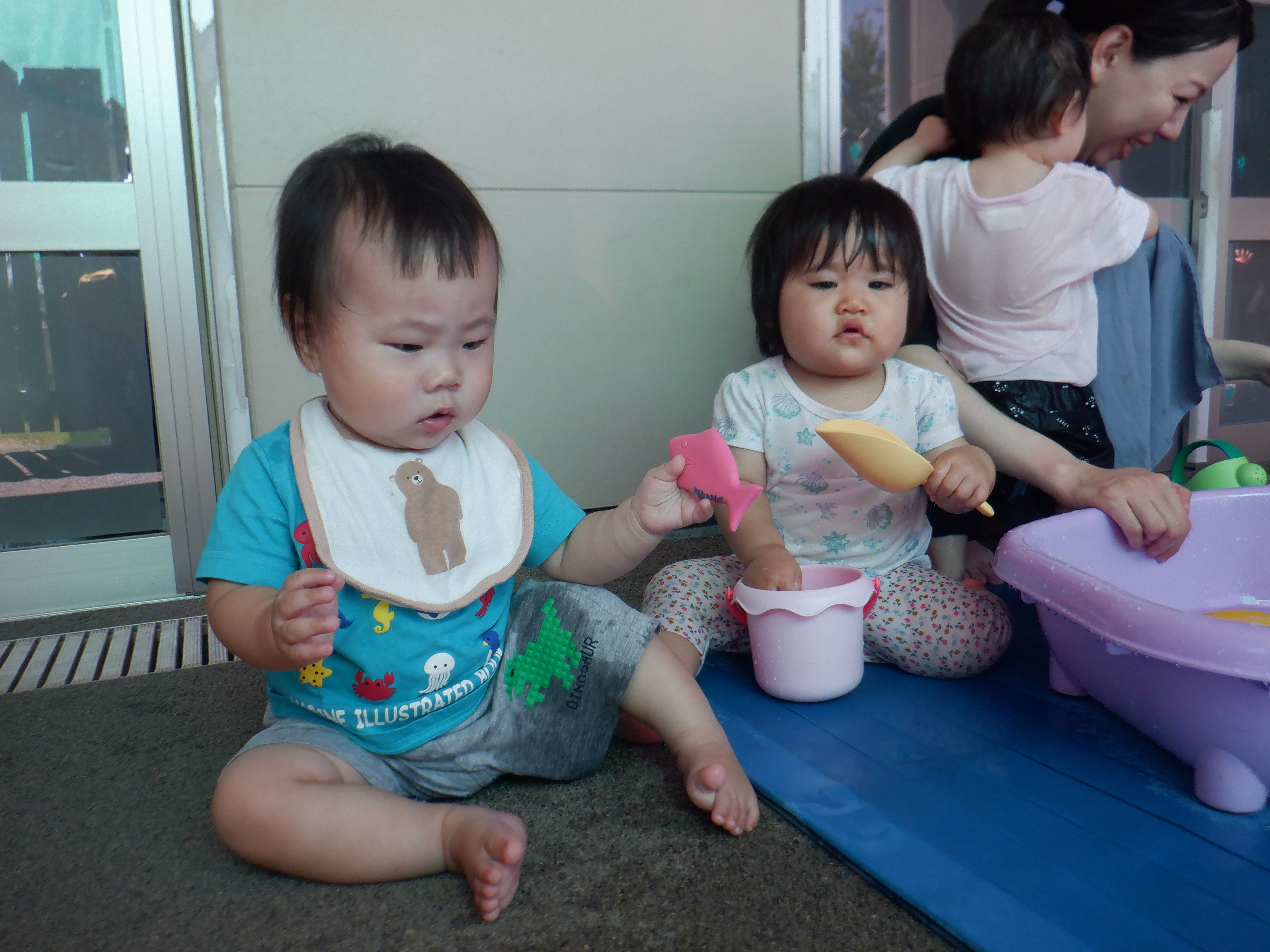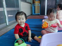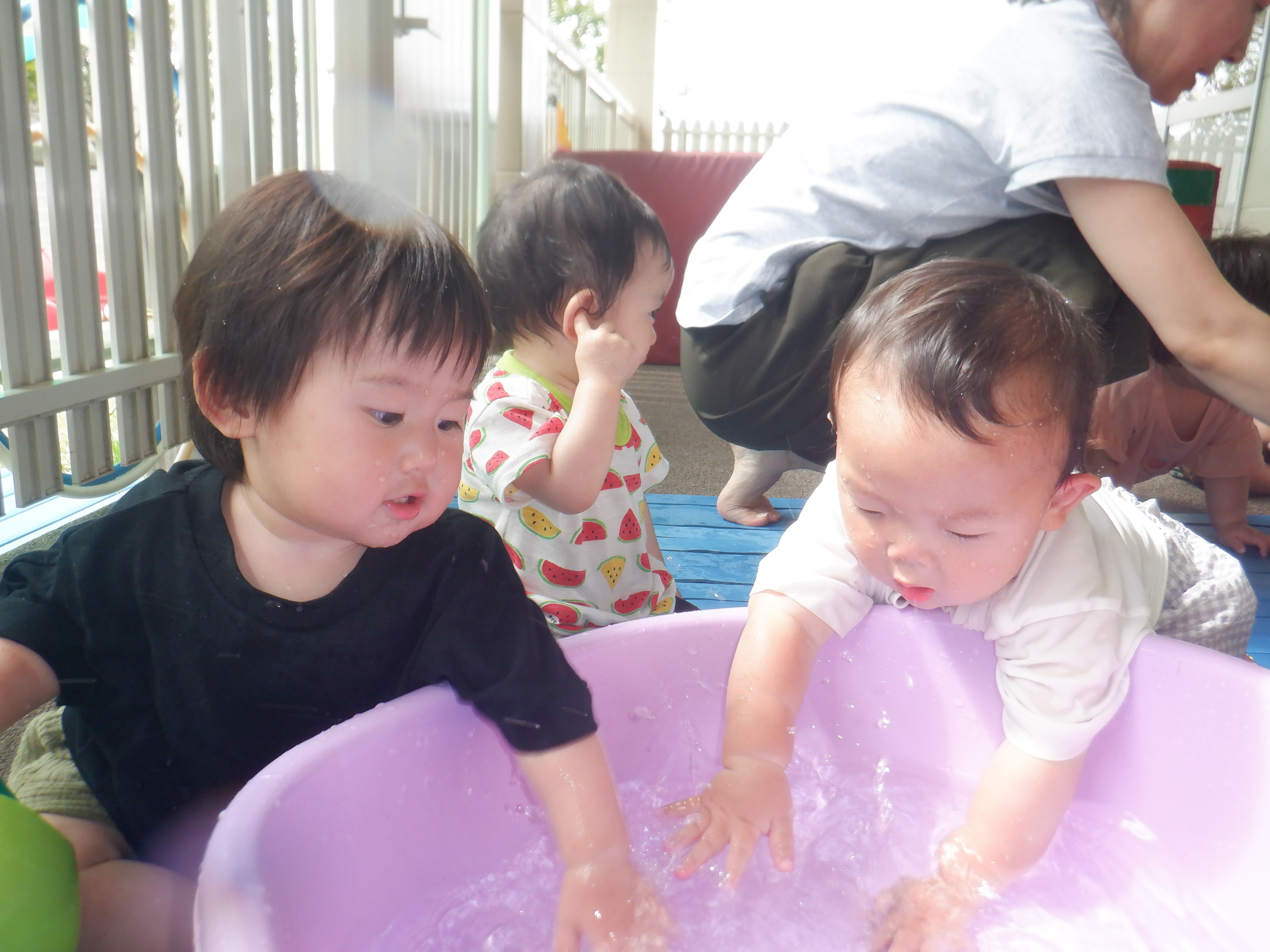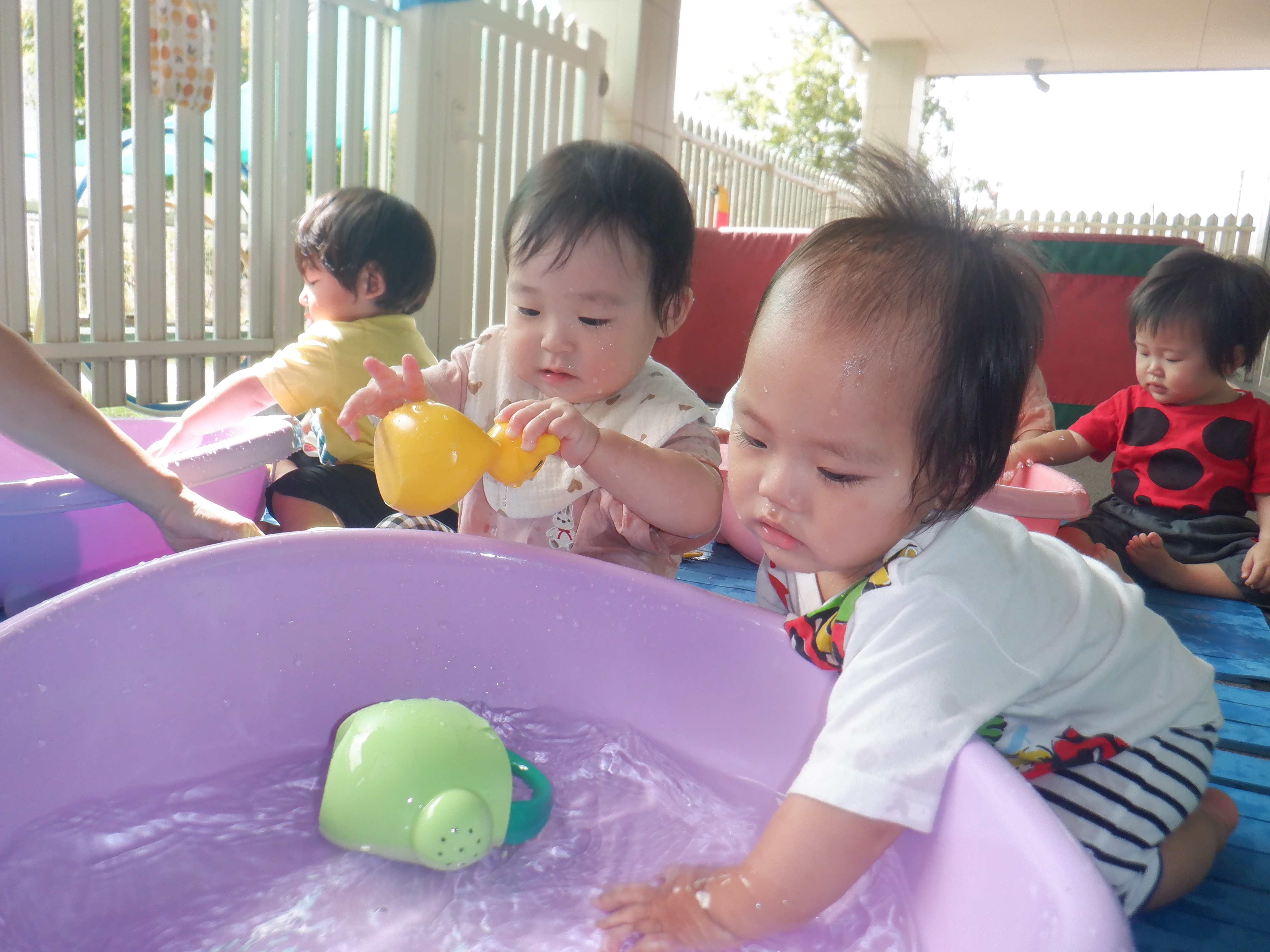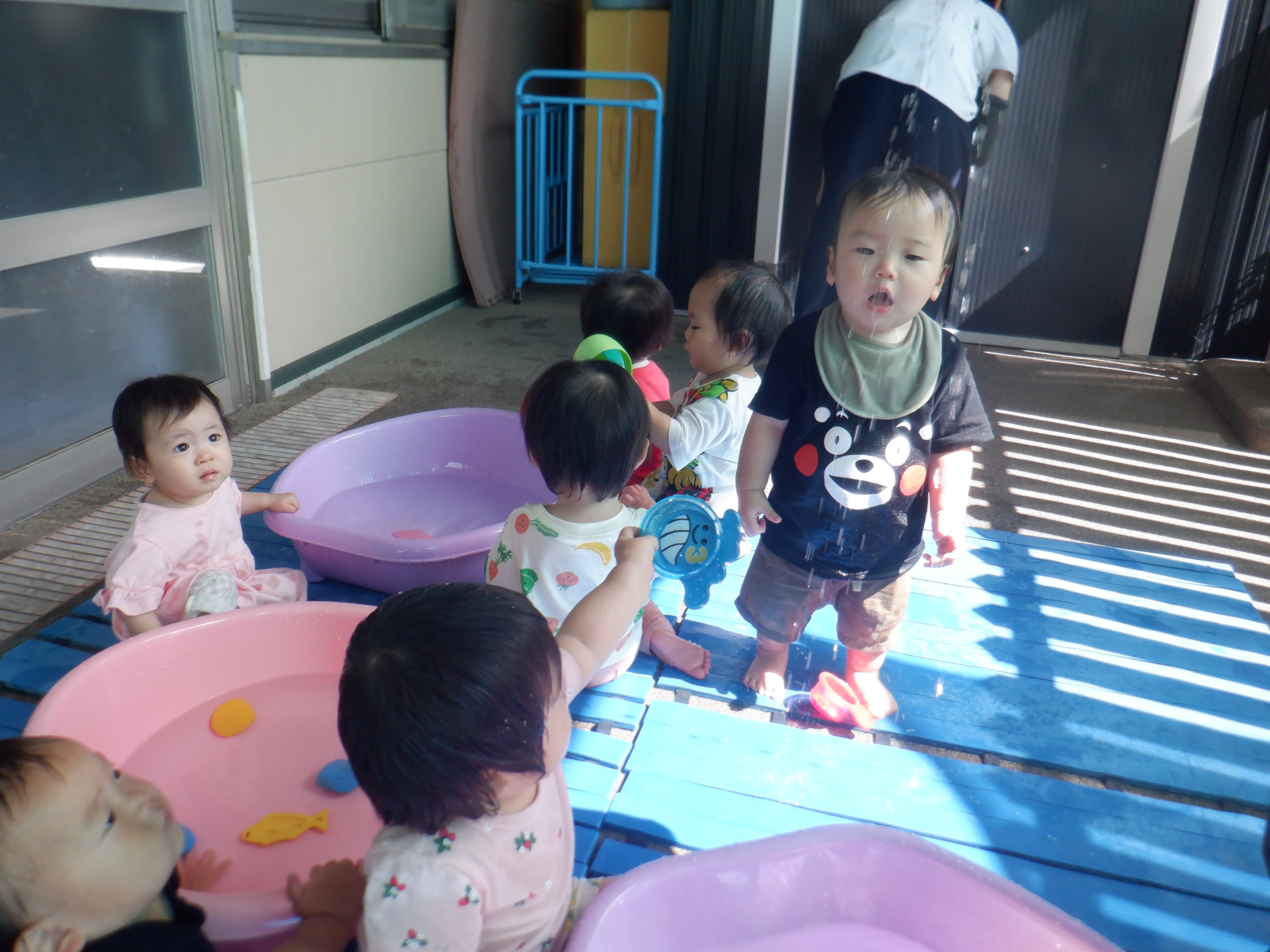 暑い日が続いてますね。すみれ組はテラスの影のある場所で水遊びを楽しんでいます。子どもたちは水に慣れてきて積極的に水に触れています。水しぶきがかかっても平気で気持ち良さそうにしています。水遊びの後は、1人1人シャワーをしてさっぱりしてお部屋に戻っています。その間、まだ生まれの遅いお子さんは、室内でゆったりと個々の遊びを楽しんでいます。