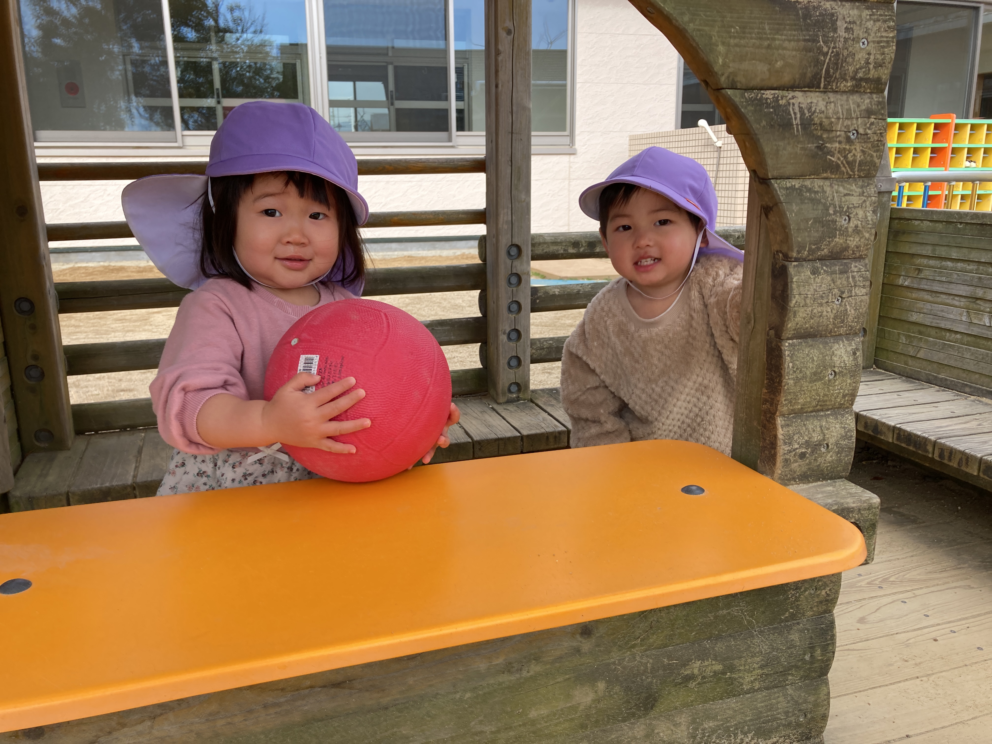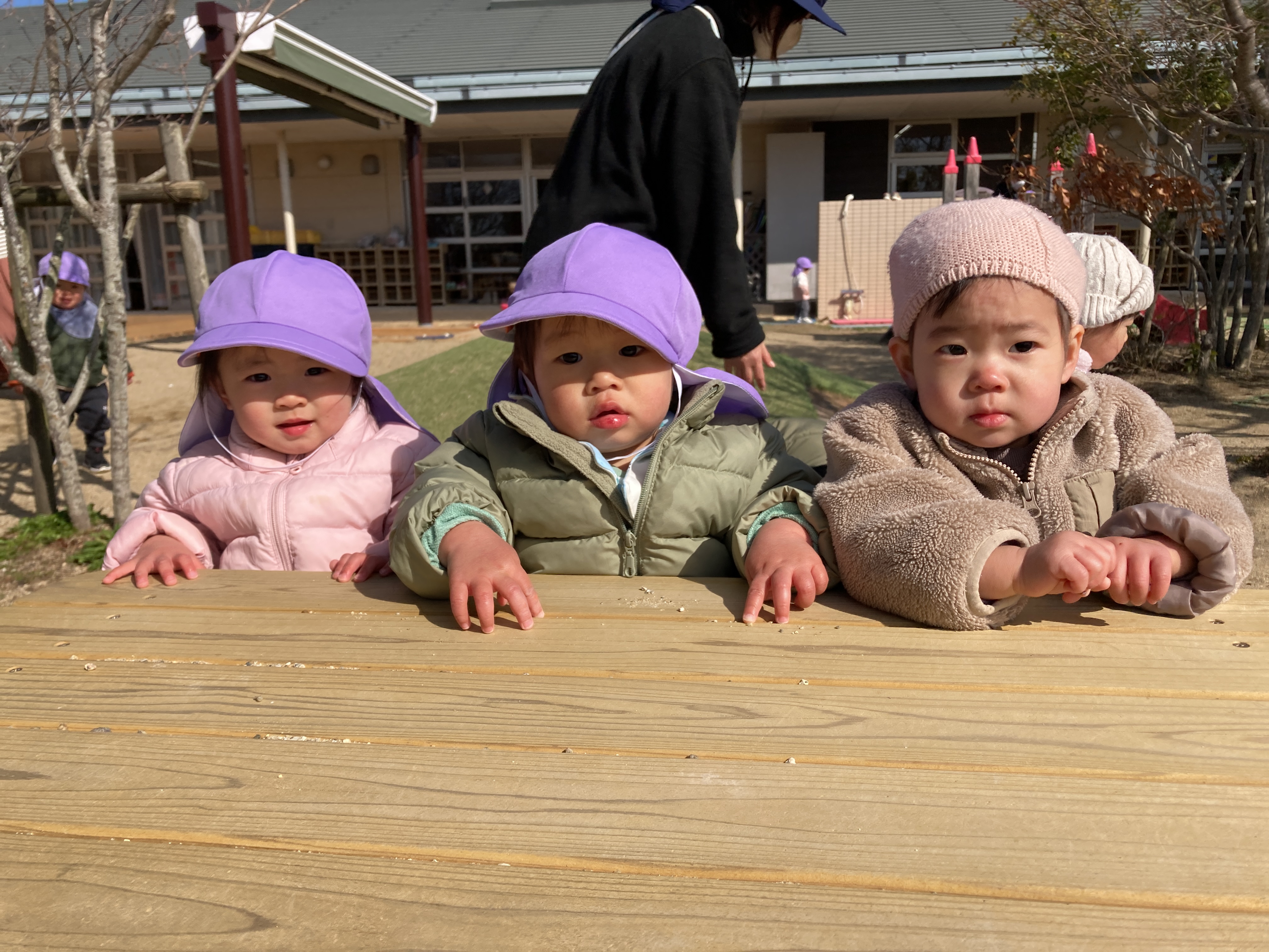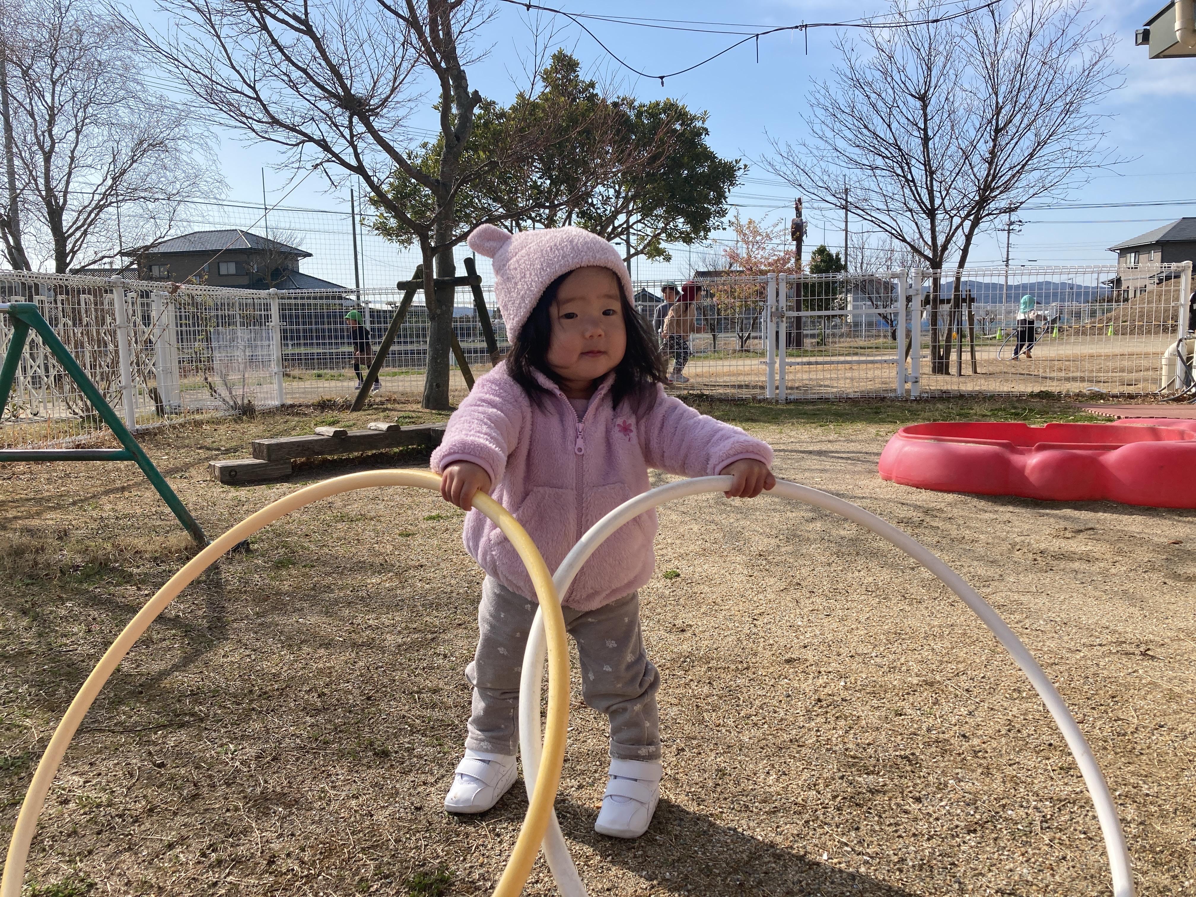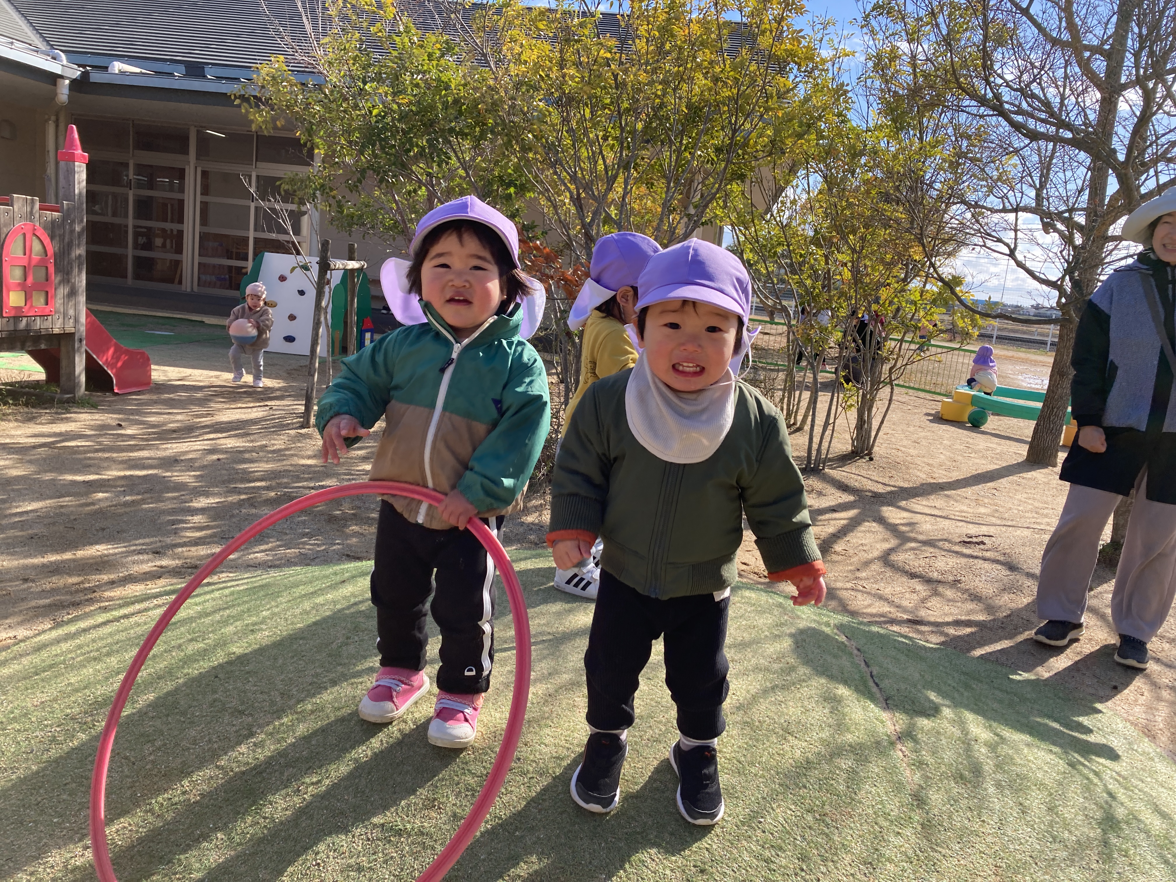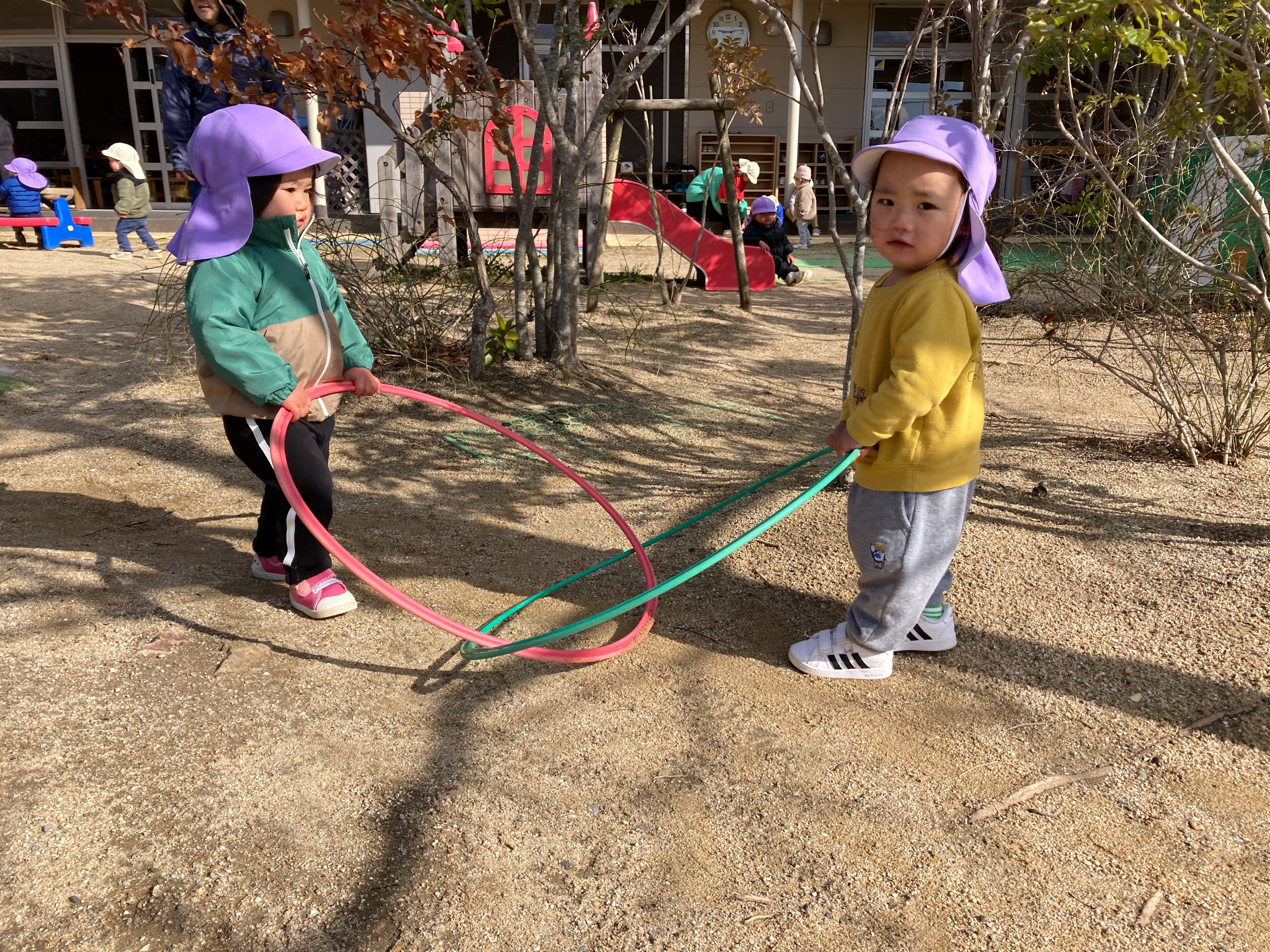 園庭では、フラフープを前に持ち散歩する子が多く、そのまま築山に登っていったり、友だちの後ろに並ぶように進んで行ったり、向かい合ってみたり、フラフープを上手に操りながら歩いて楽しんでいます。友だちと顔を見合わせて笑い合ったり、真似してみたり、じーっと観察してみたり、いつも楽しそうな笑い声など聞こえています。