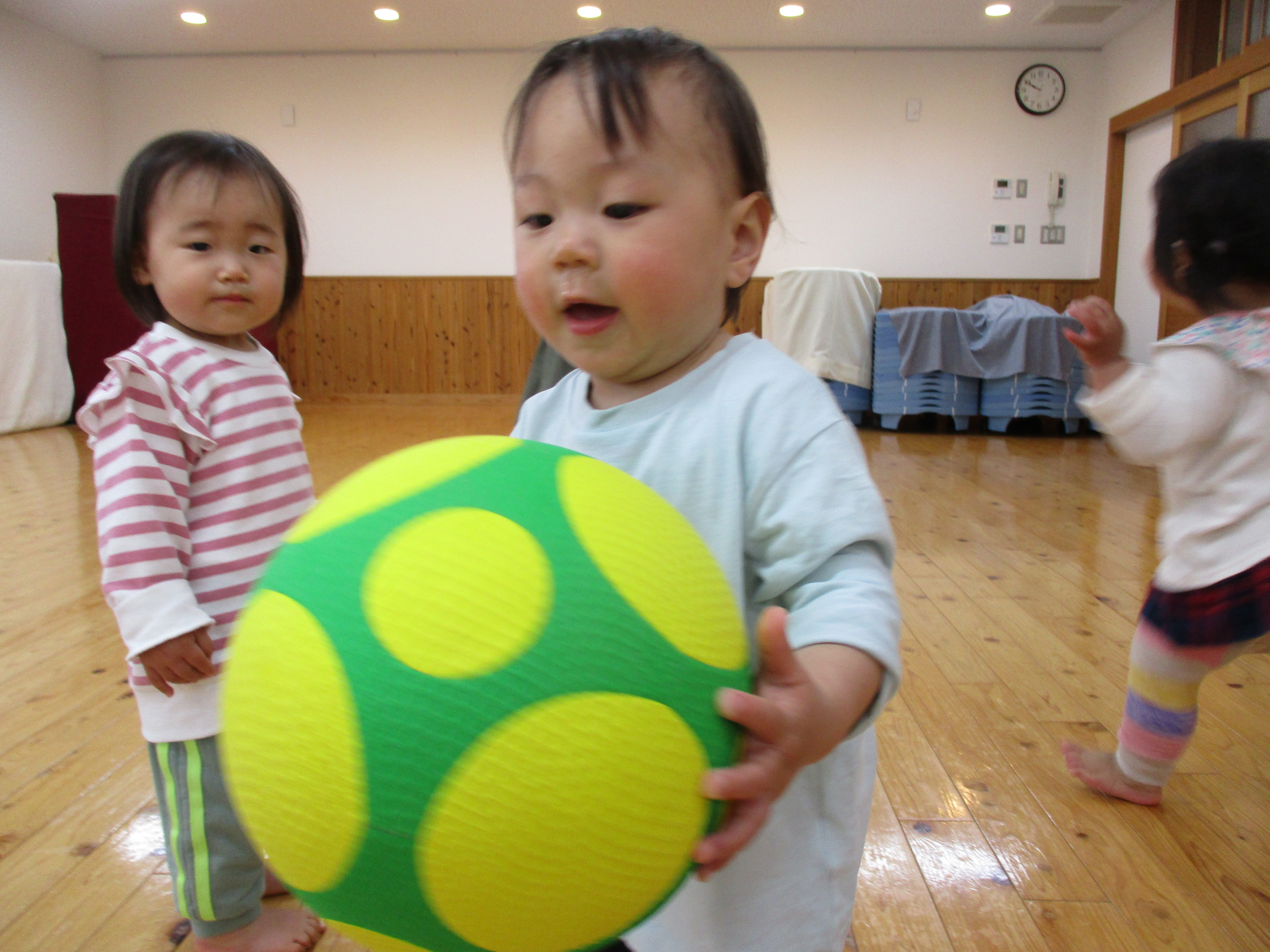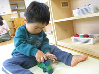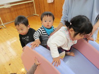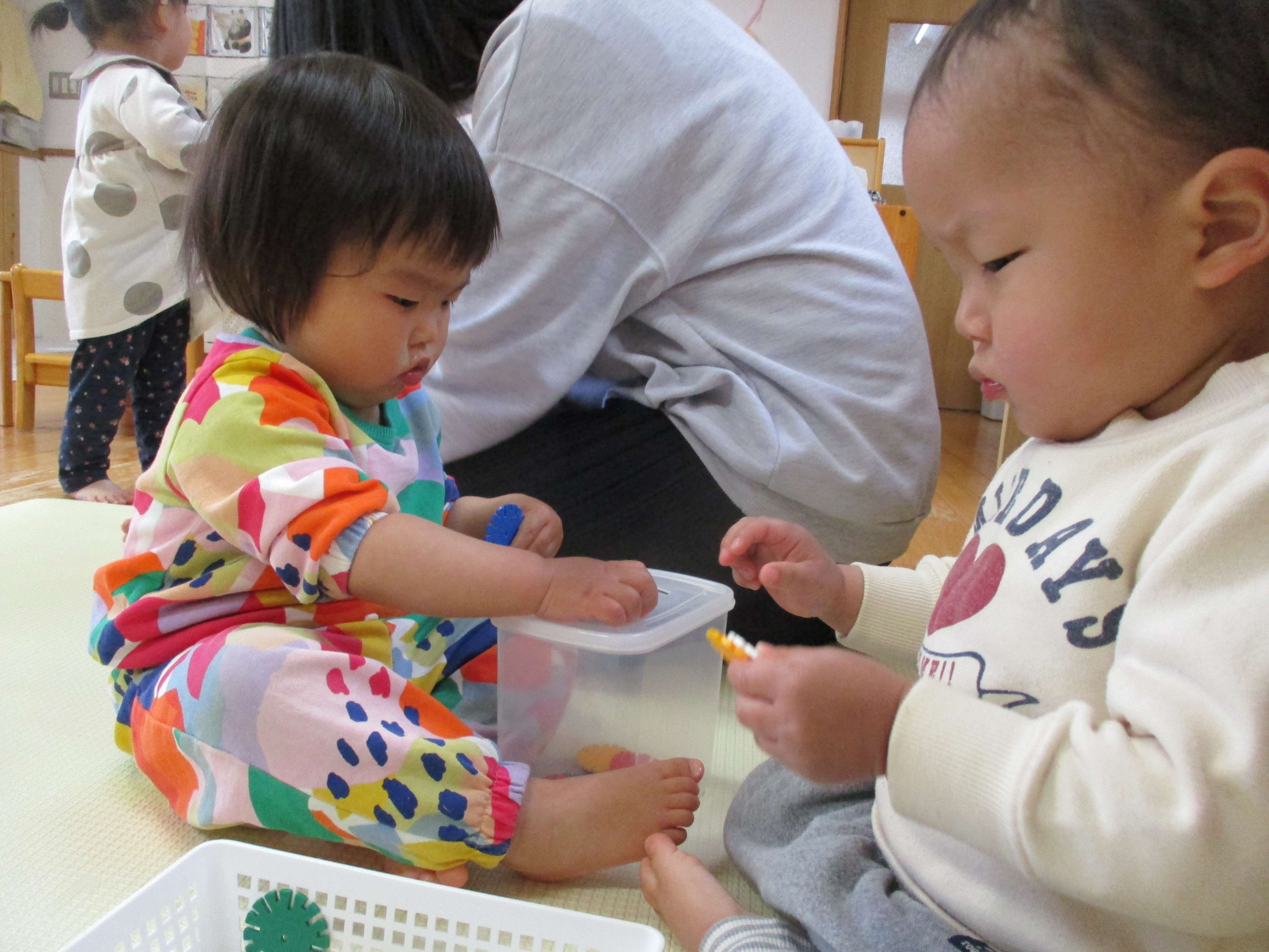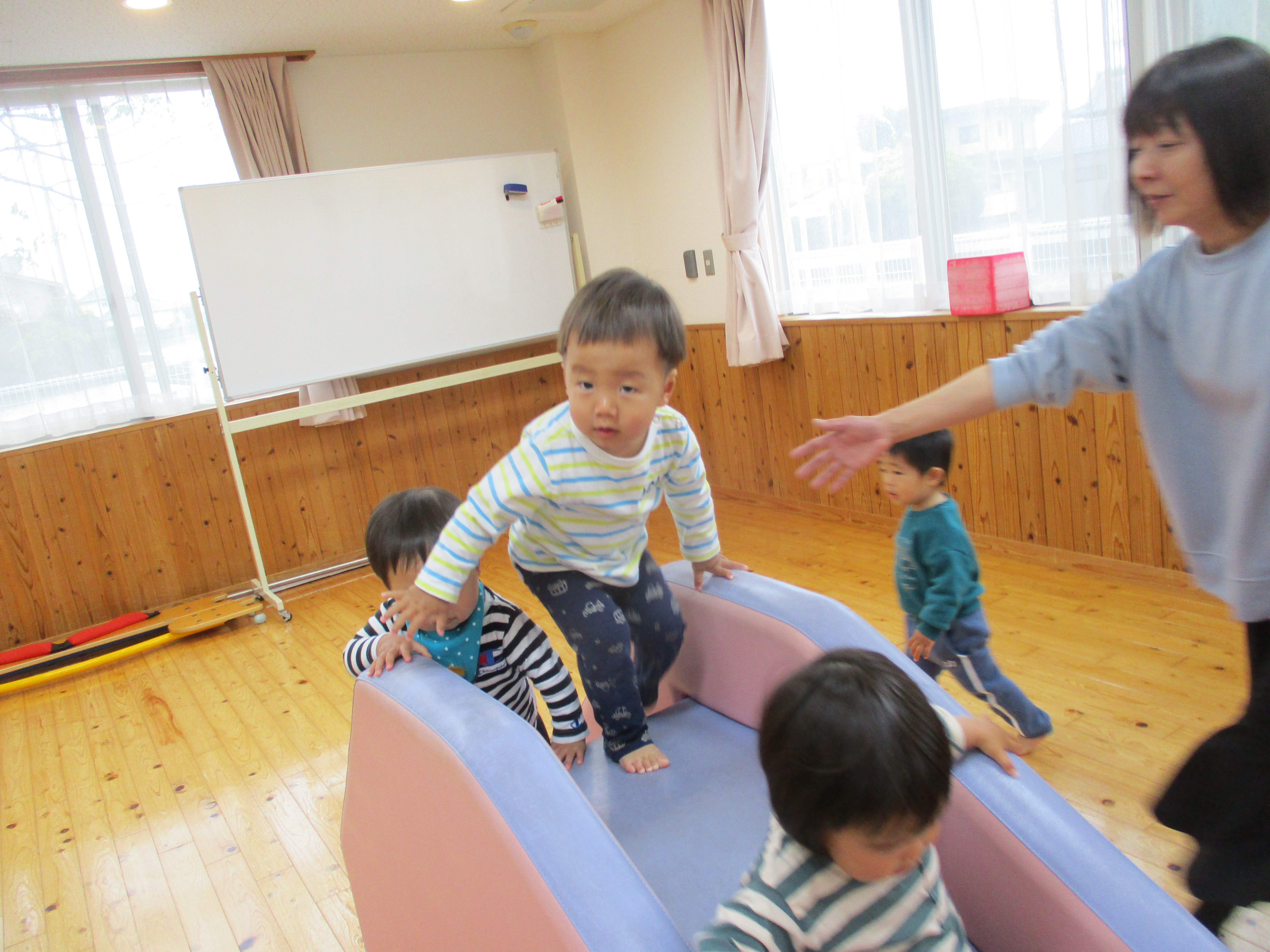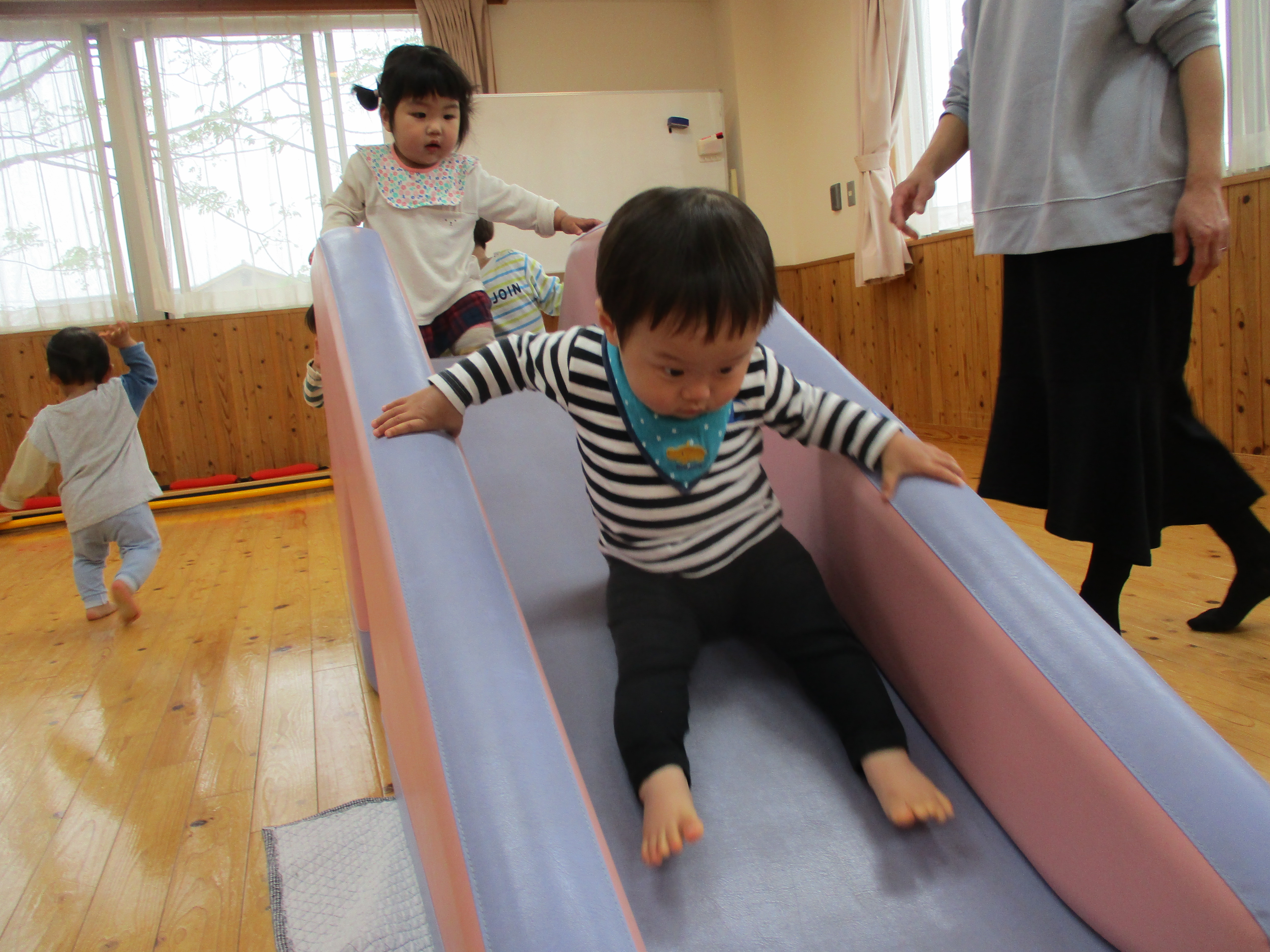 にじルームでは体を動かして伸び伸びと遊んでいます。保育者と一緒に「まてまてまて」をしたり、踏切のように「かんかんかん」と言って滑り台を楽しんでいます。ボール遊びでは遠くに投げたり、保育者が蹴ったボールを楽しそうに追いかける姿がみられています。保育室ではトーテムを高く積み上げたり、ロンディを箱の中に入れたりしてゆったりと過ごしています。