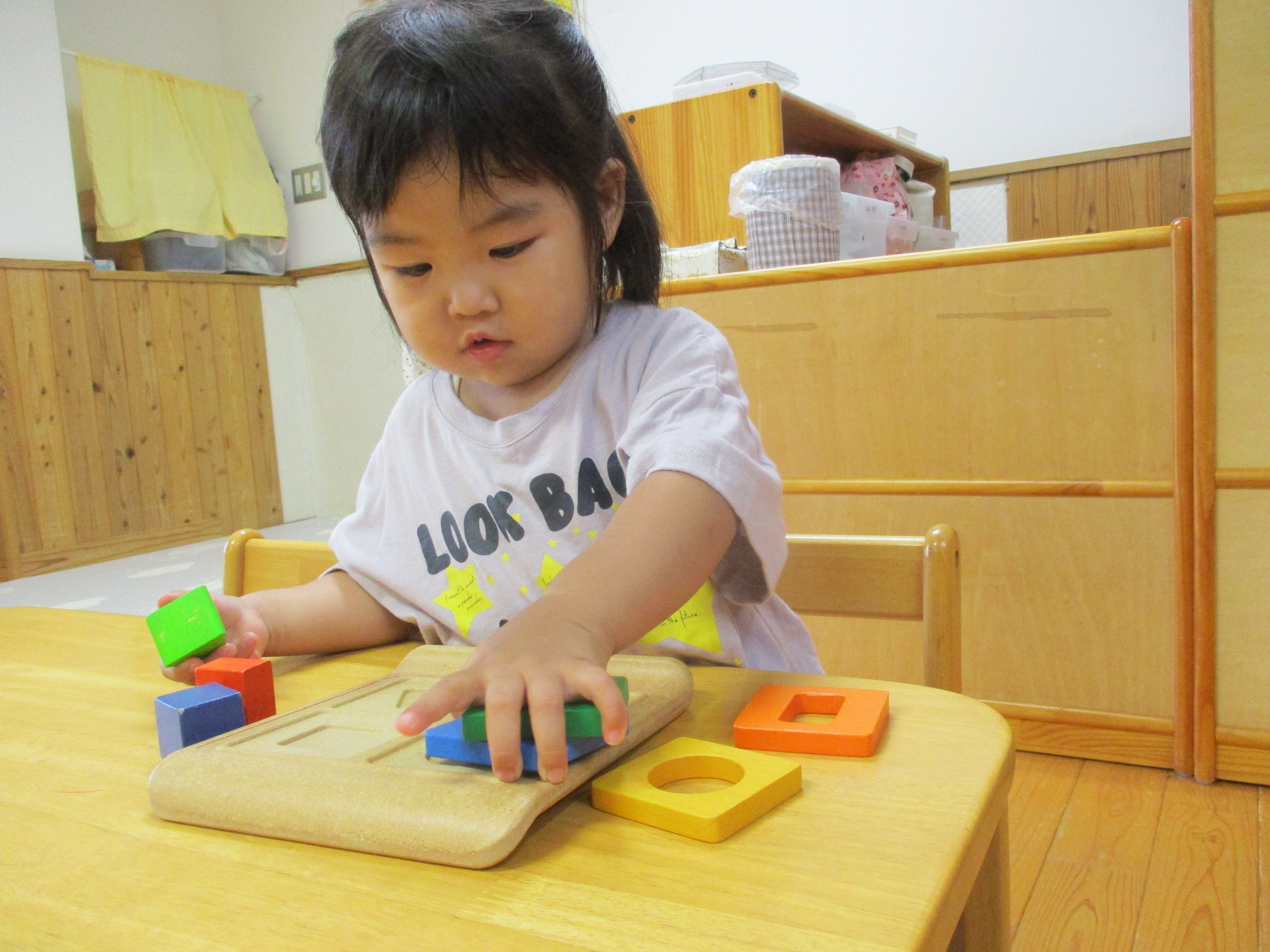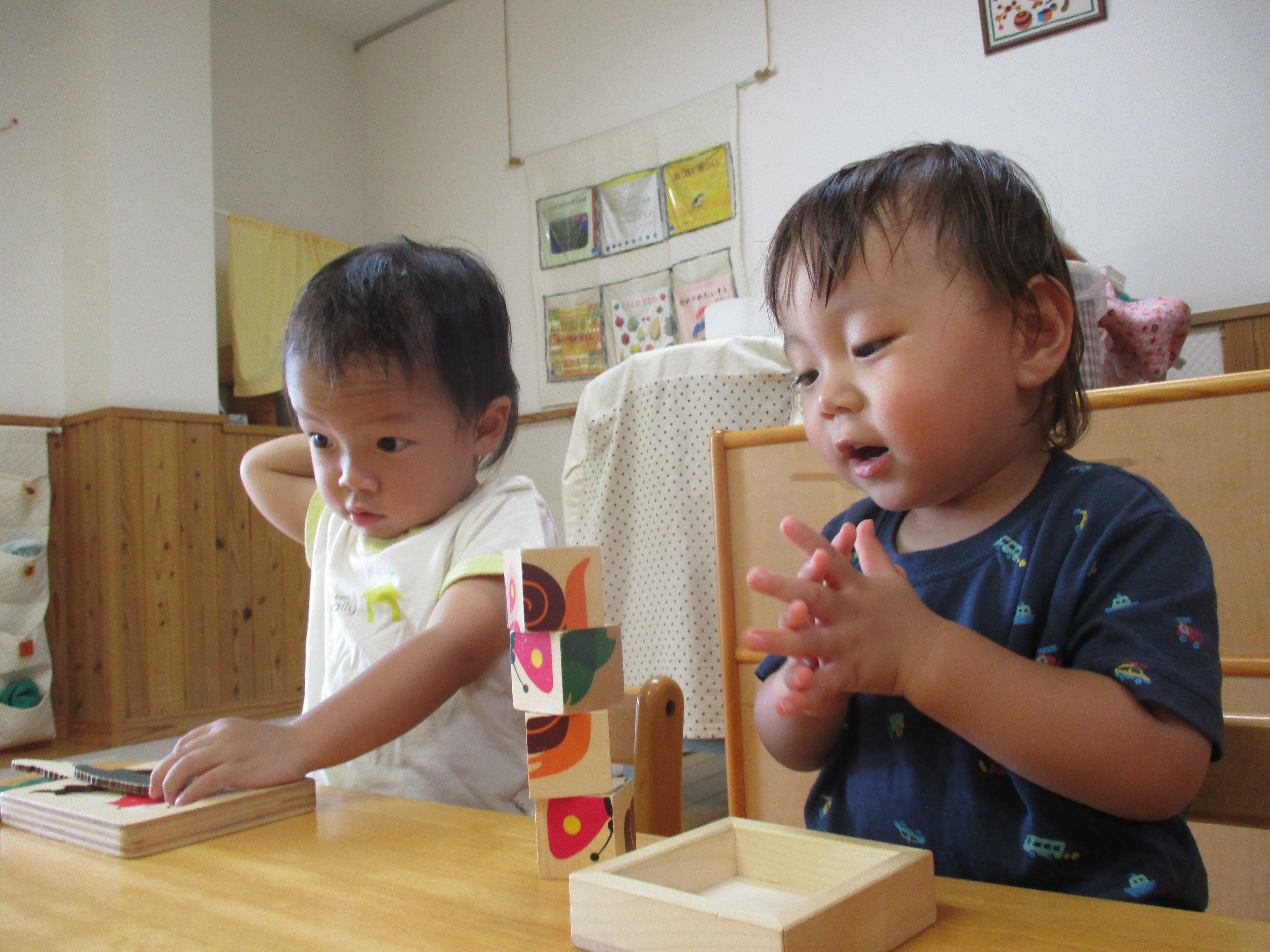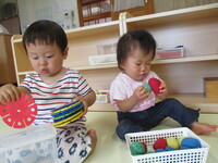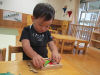 新しい玩具が増えて興味深々の子どもたちです。図形の型はめパズルをしたり、ワニの三段パズルをしようとしたりしています。