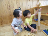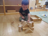 つみきを友だちと一緒に高く積み上げようとしたり好きなように組み立てたりして楽しんでいます。