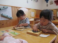 三段パズルや四段パズル、車や動物などいろんな種類のパズルがあります。クルクルと回して端と端を合わせてはめようとしています。