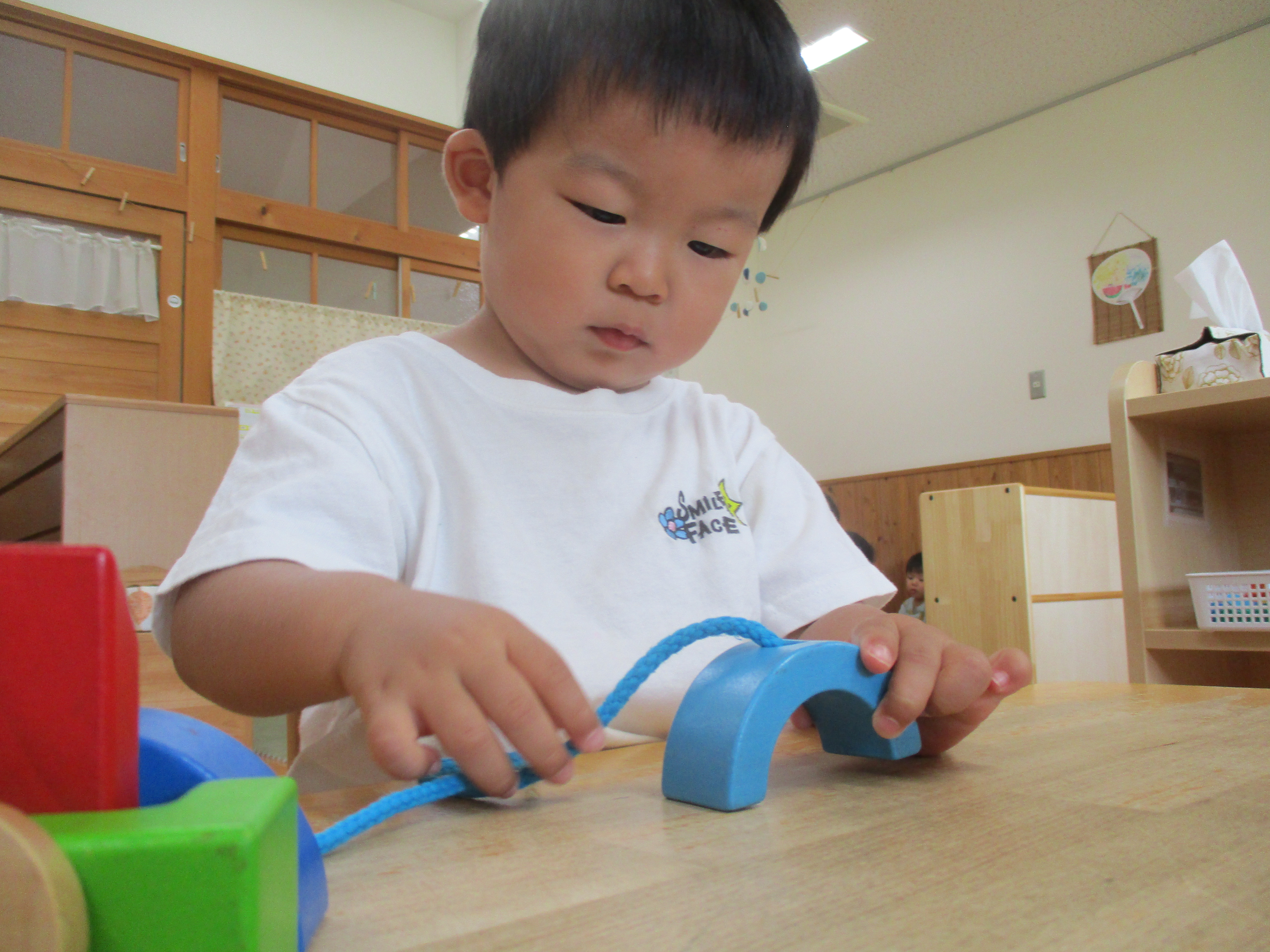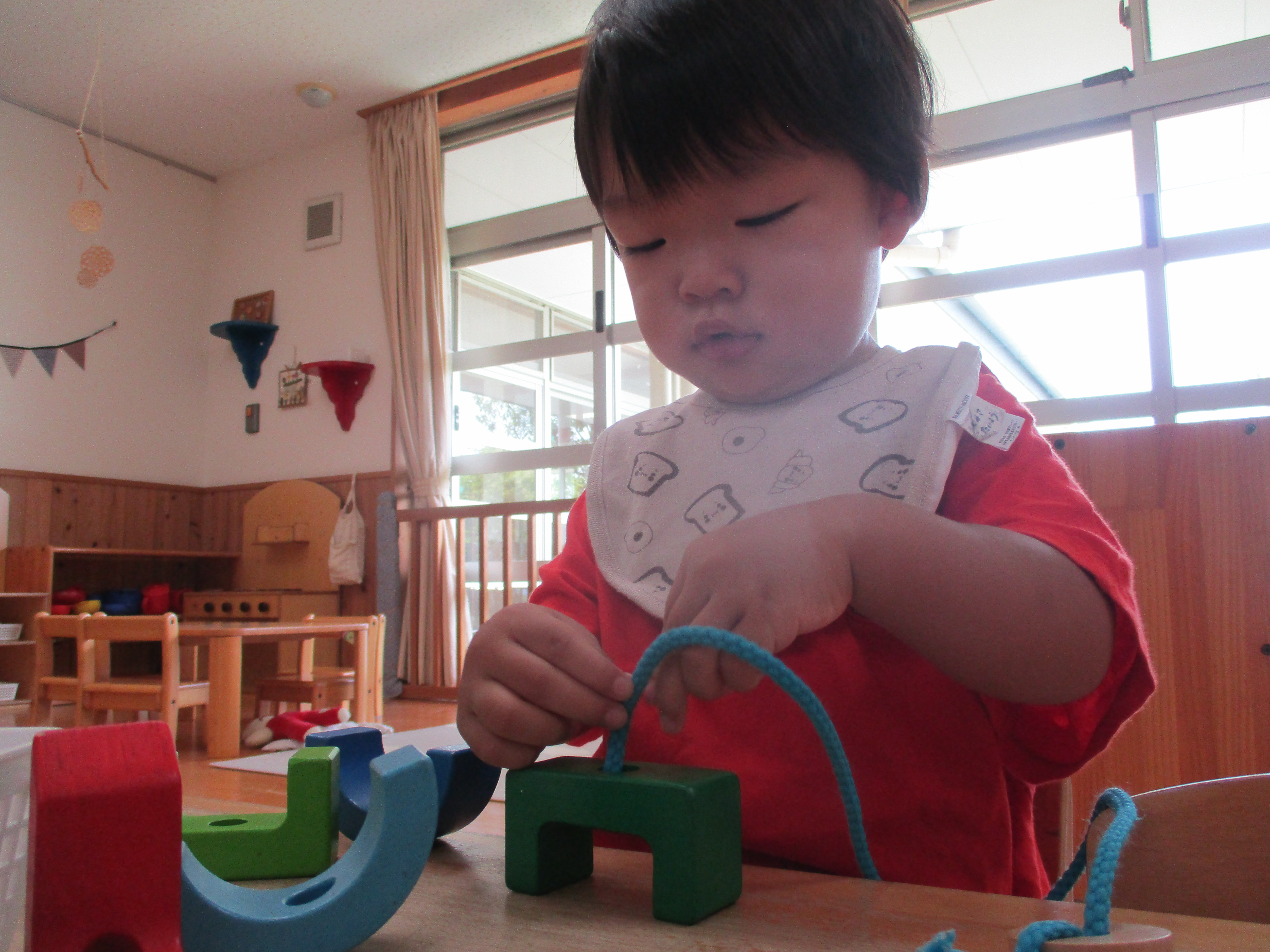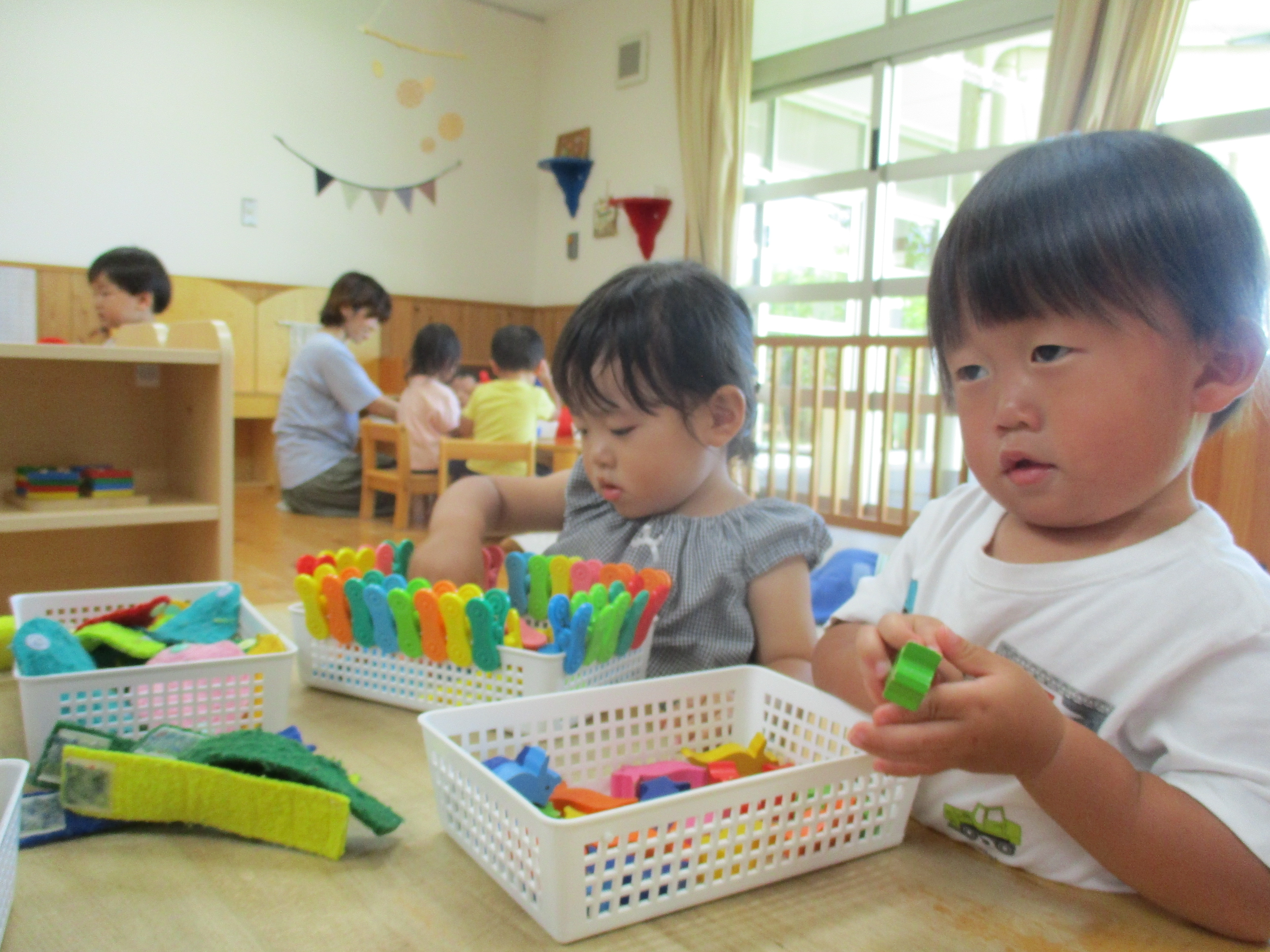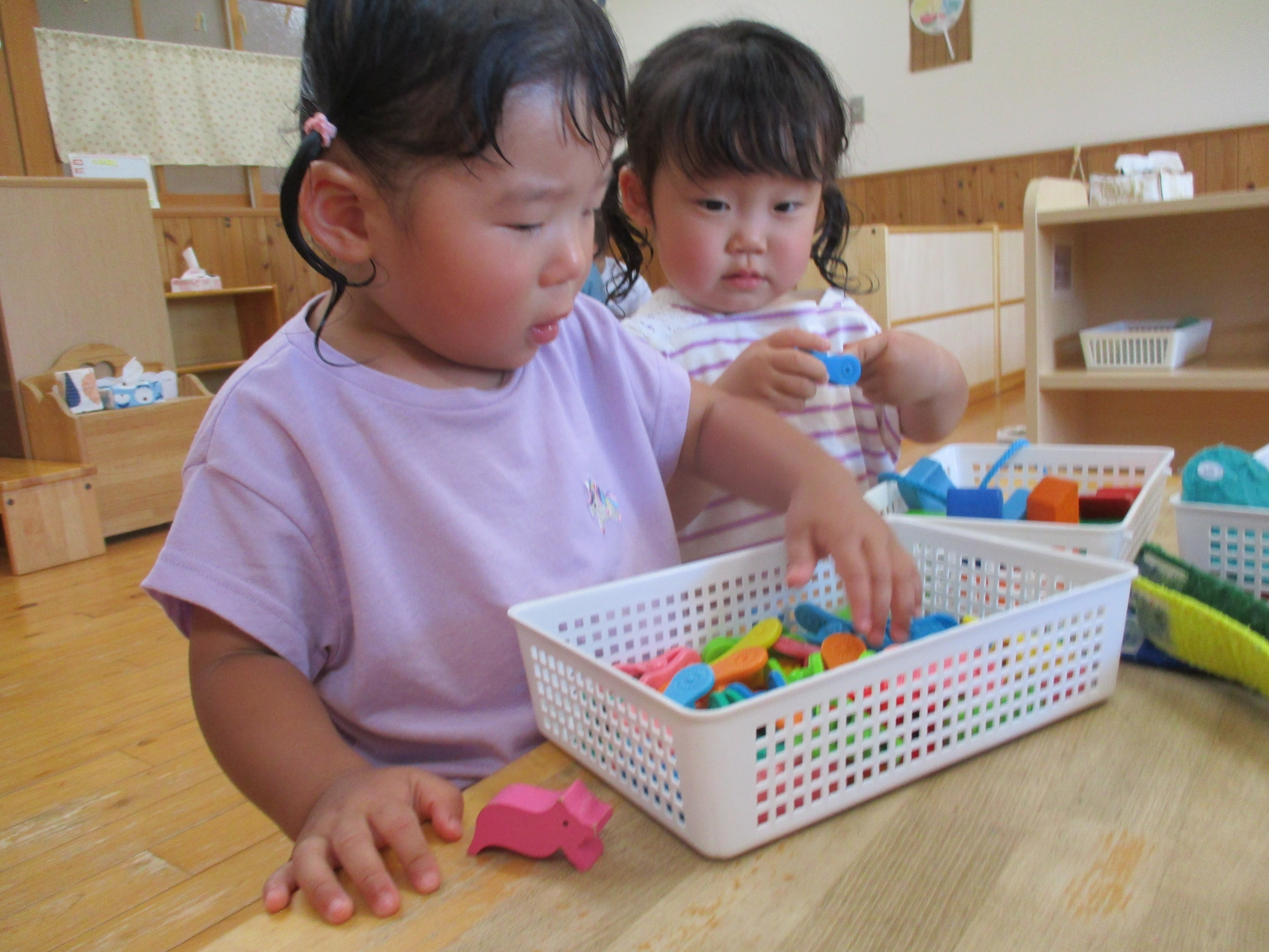 パズルやアイクリップなど様々な玩具を、動物や色を言いながら取り出したり、長く繋げたり、また、服や体にくっつけたりなどして自分がしたい遊び方で遊んでいます。