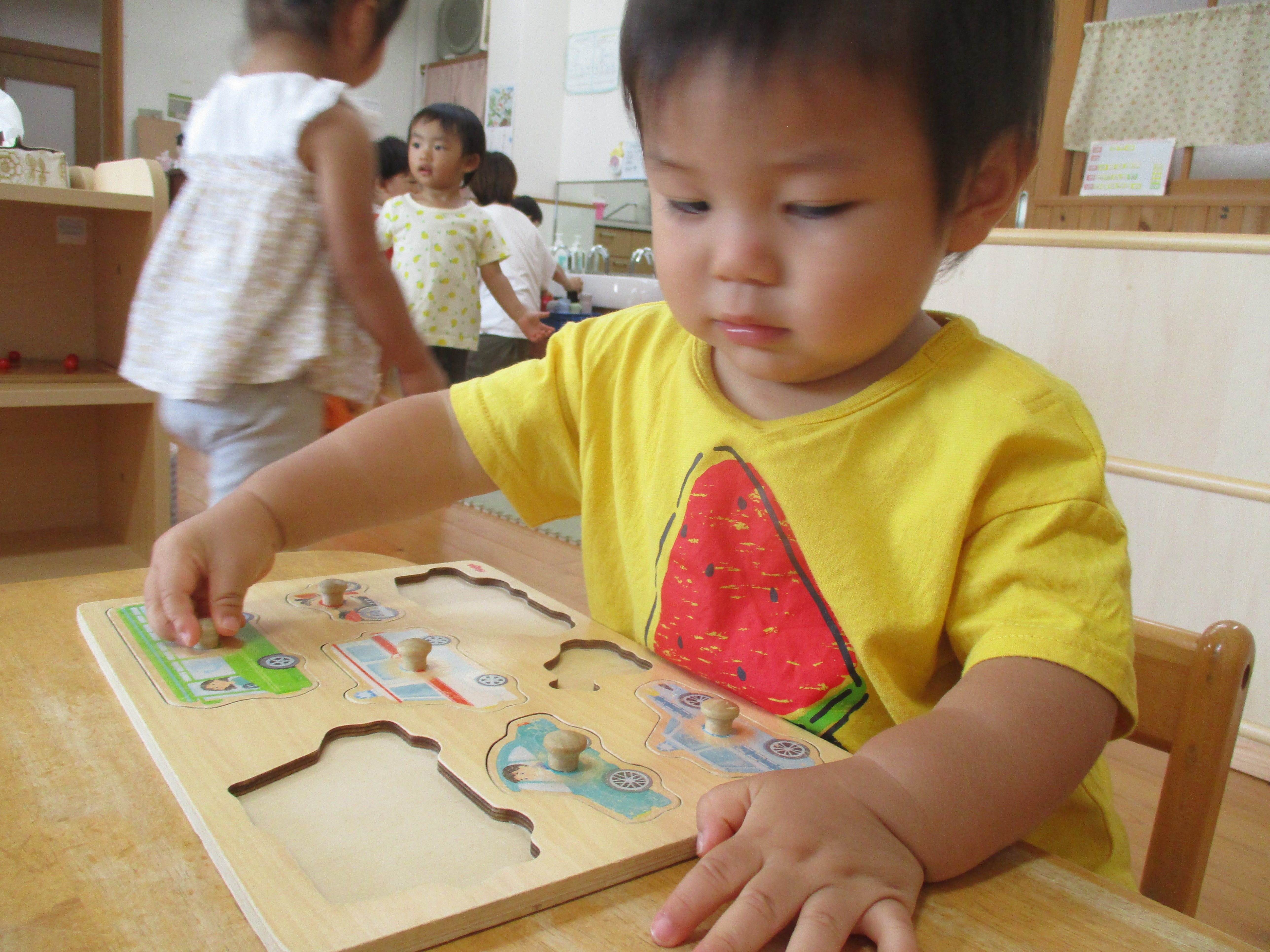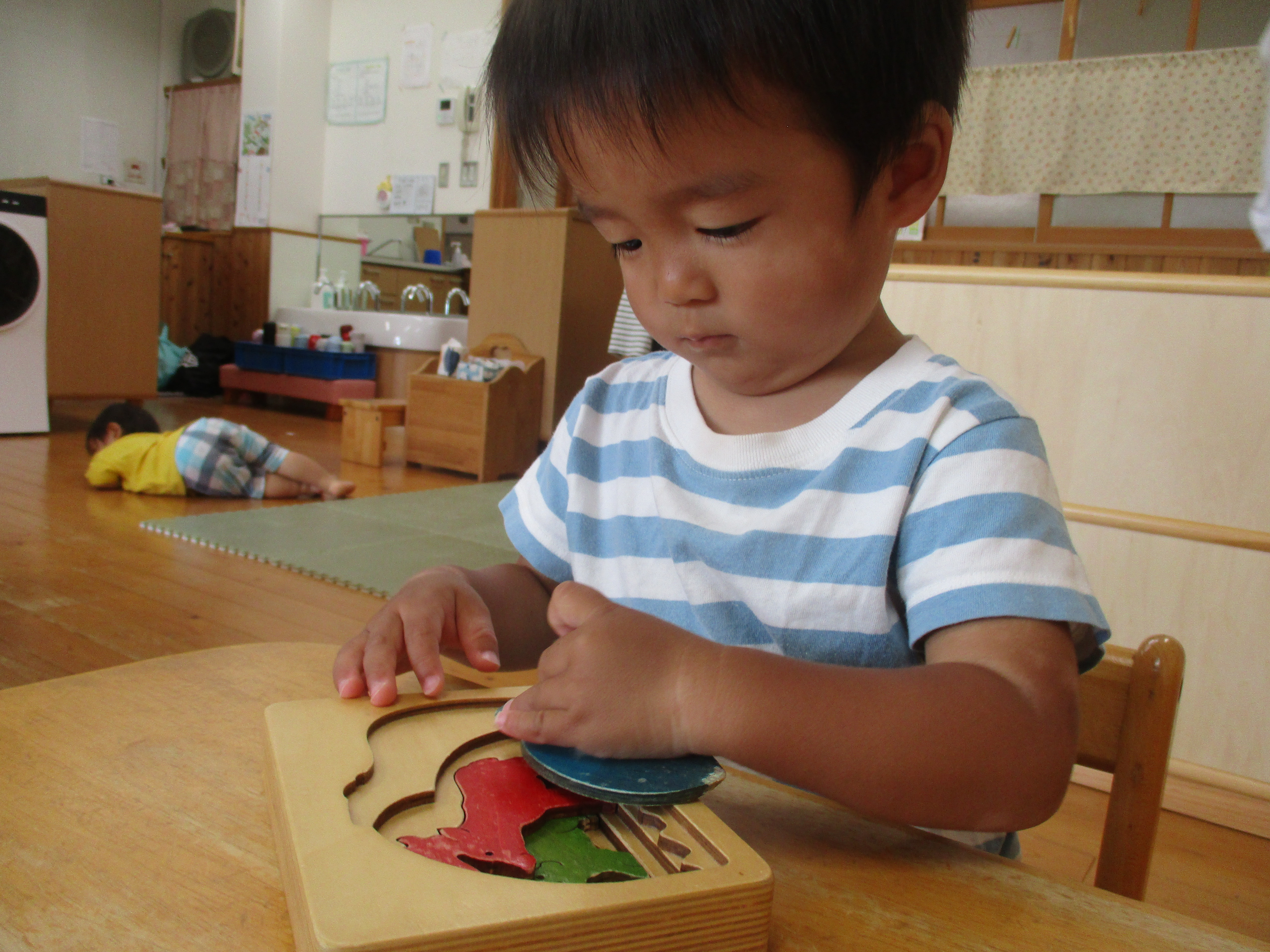 完成できると「見て」とうれしそうに見せたり、できない時は「やって」と喃語やジェスチャーで伝えようとしています。
