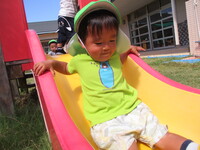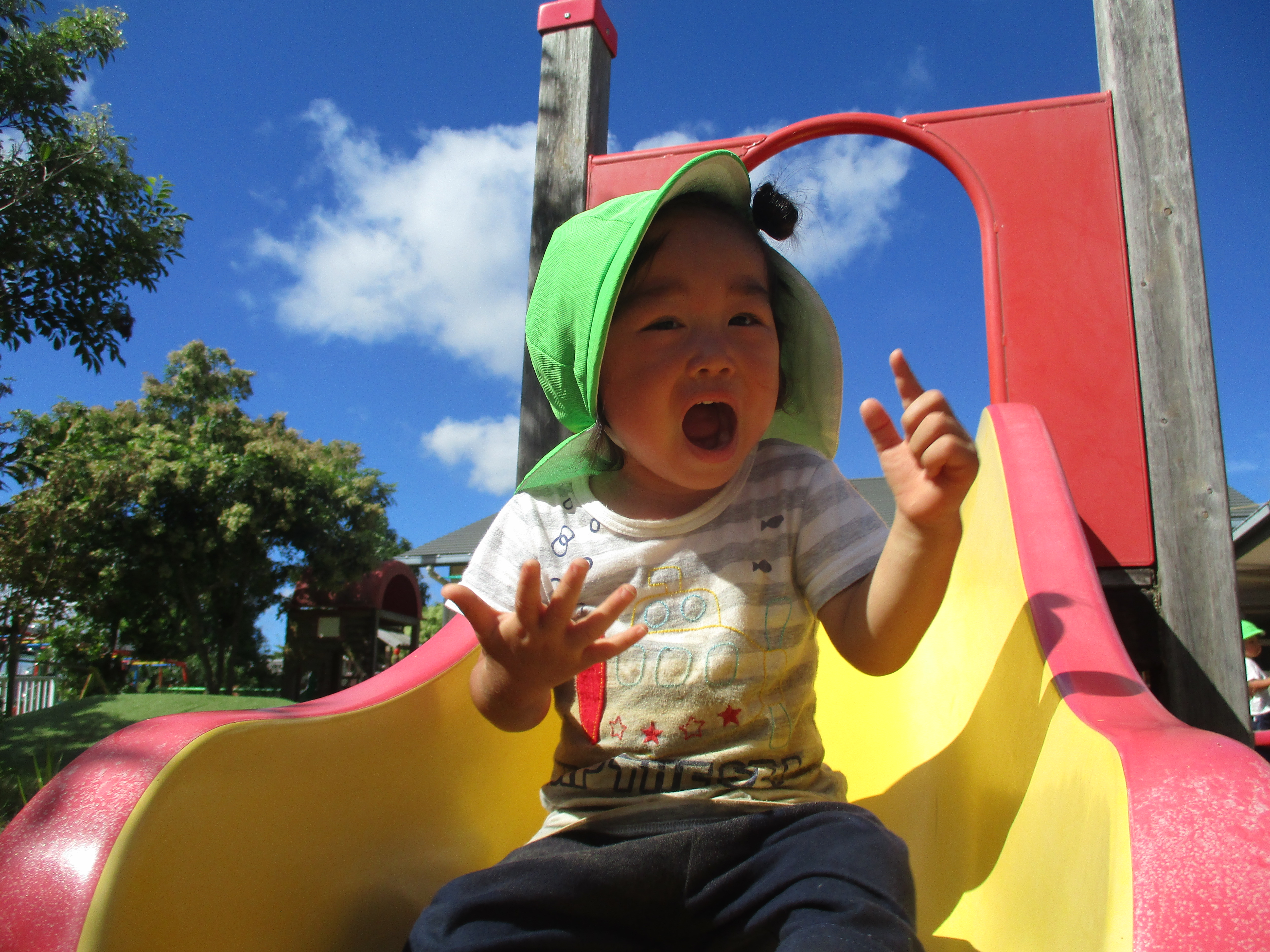 友だちとすべり台に登り順番にすべって楽しんでいます。早く滑れるとびっくりしながらも笑って何度も繰り返しています。