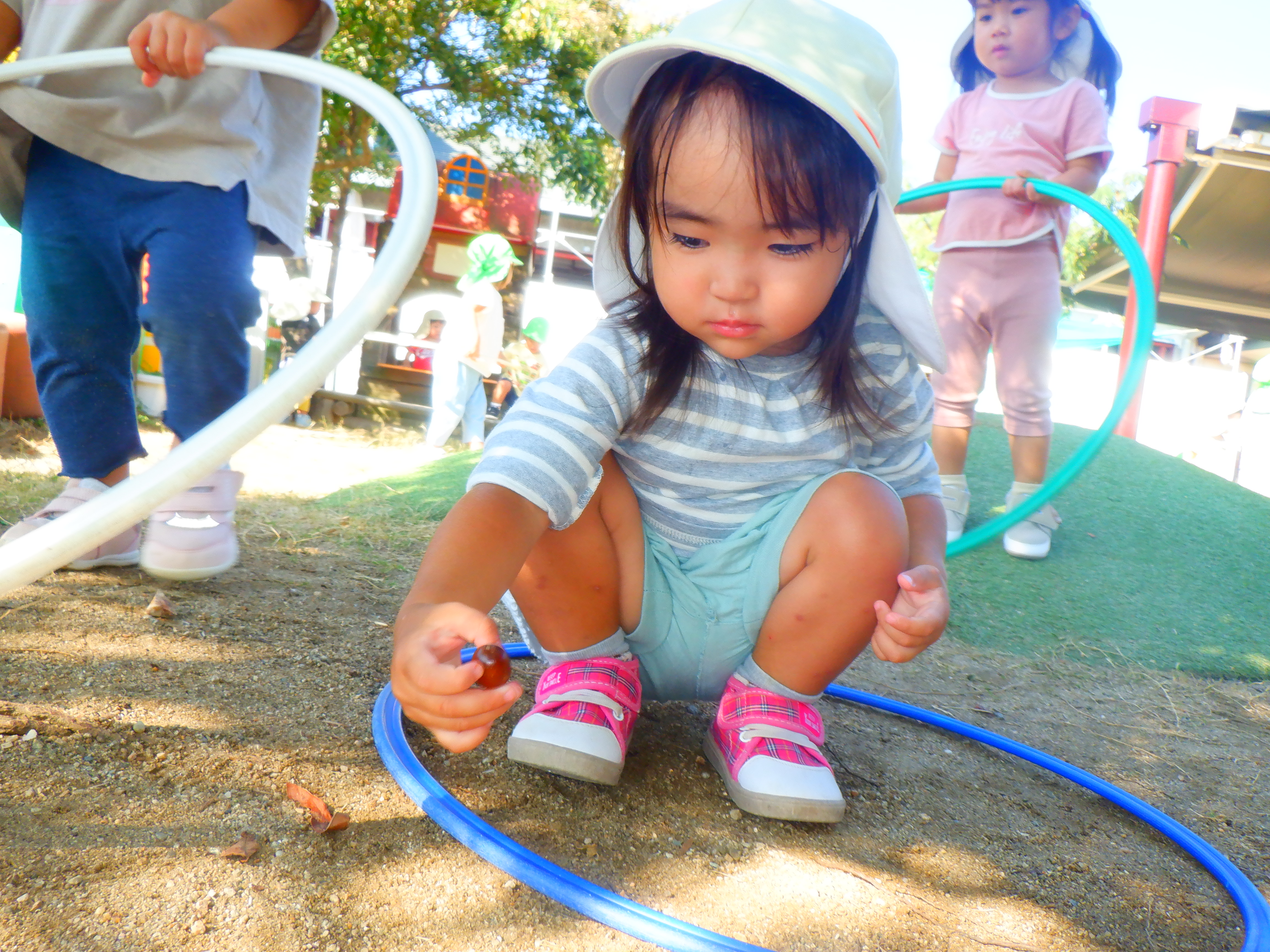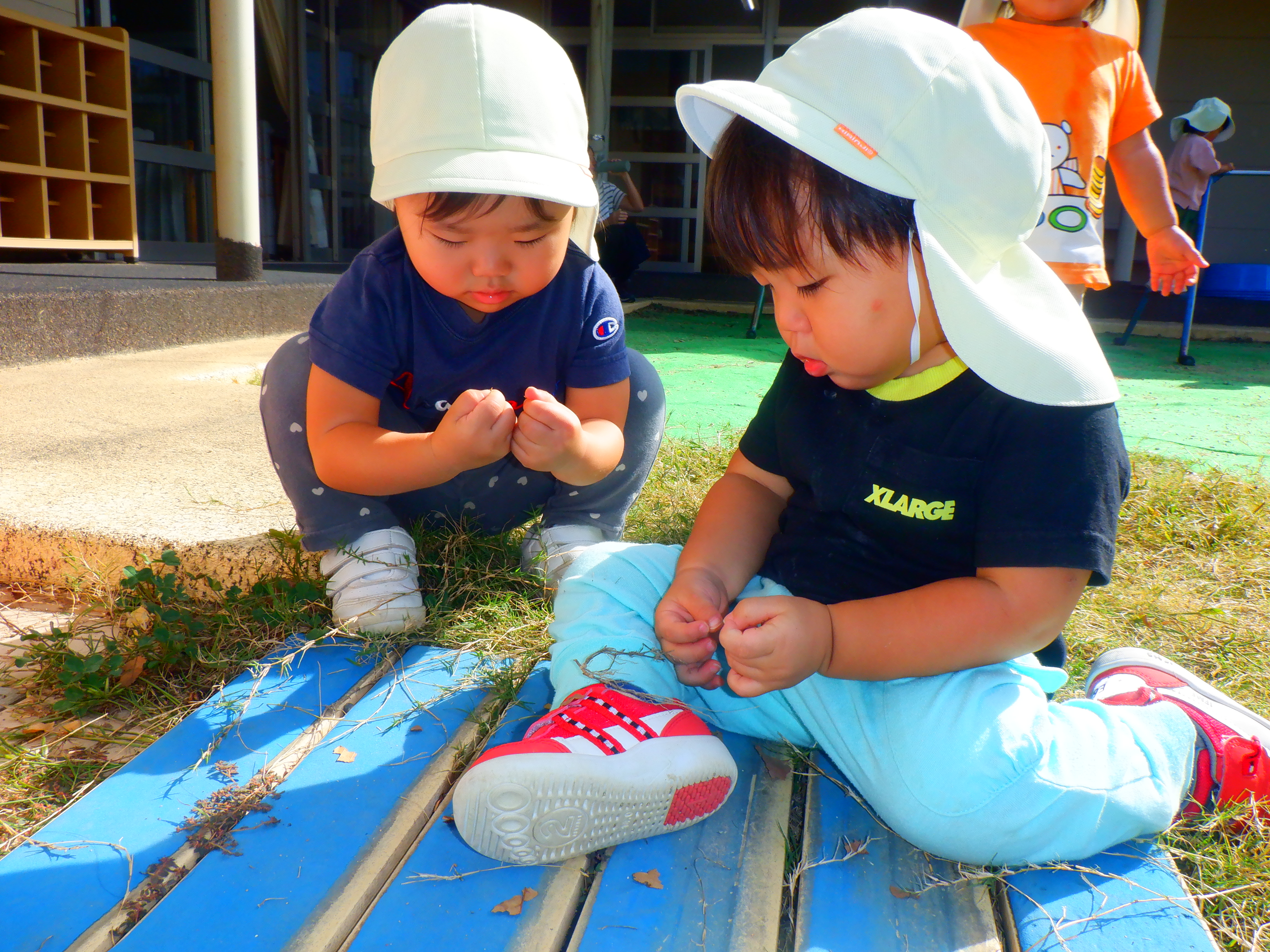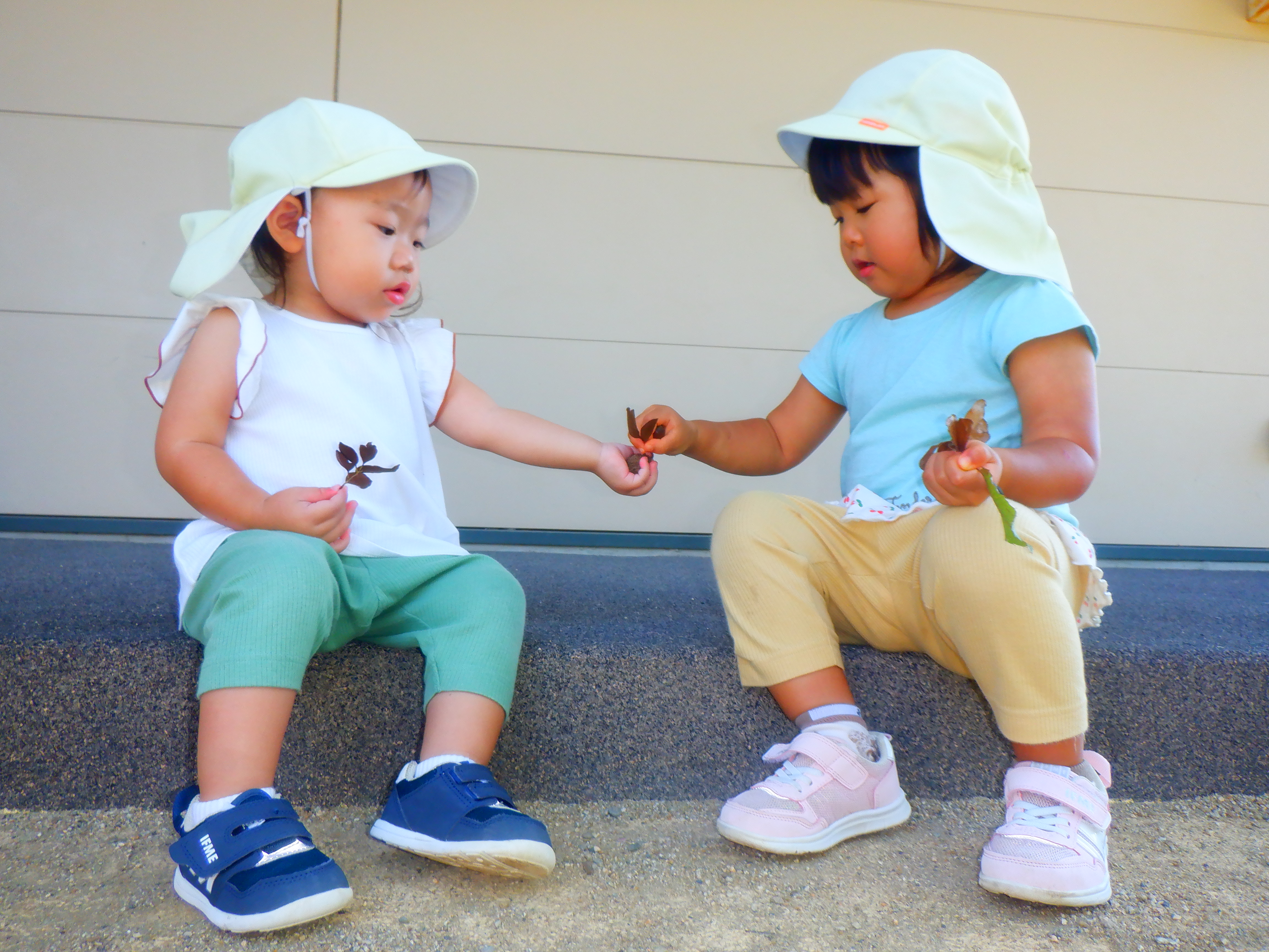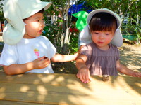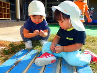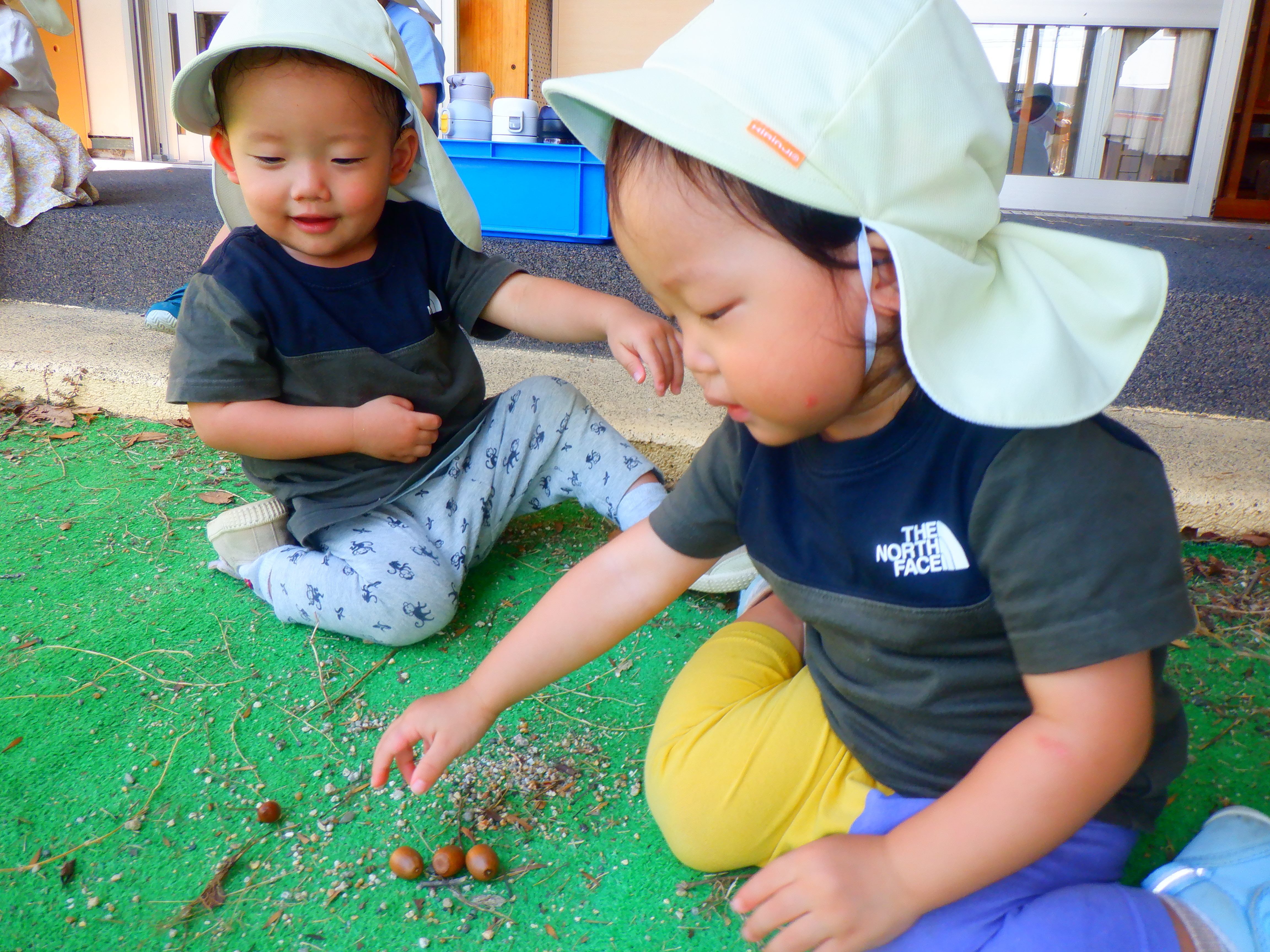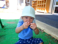 まだまだ暑い日もありますが、園庭には秋を感じられる発見が少しずつ増えてきました。赤や黄色の落ち葉を見つけると、集めたり葉っぱをちぎっては、ビリビリと音がするのを楽しんでいます。またどんぐりを見つけると「あった」と嬉しそうに見せてくれたり、どんぐりころころを歌ったりしています。これからも秋をたくさん感じていきながら、園庭でたくさん遊んでいきたいと思います。