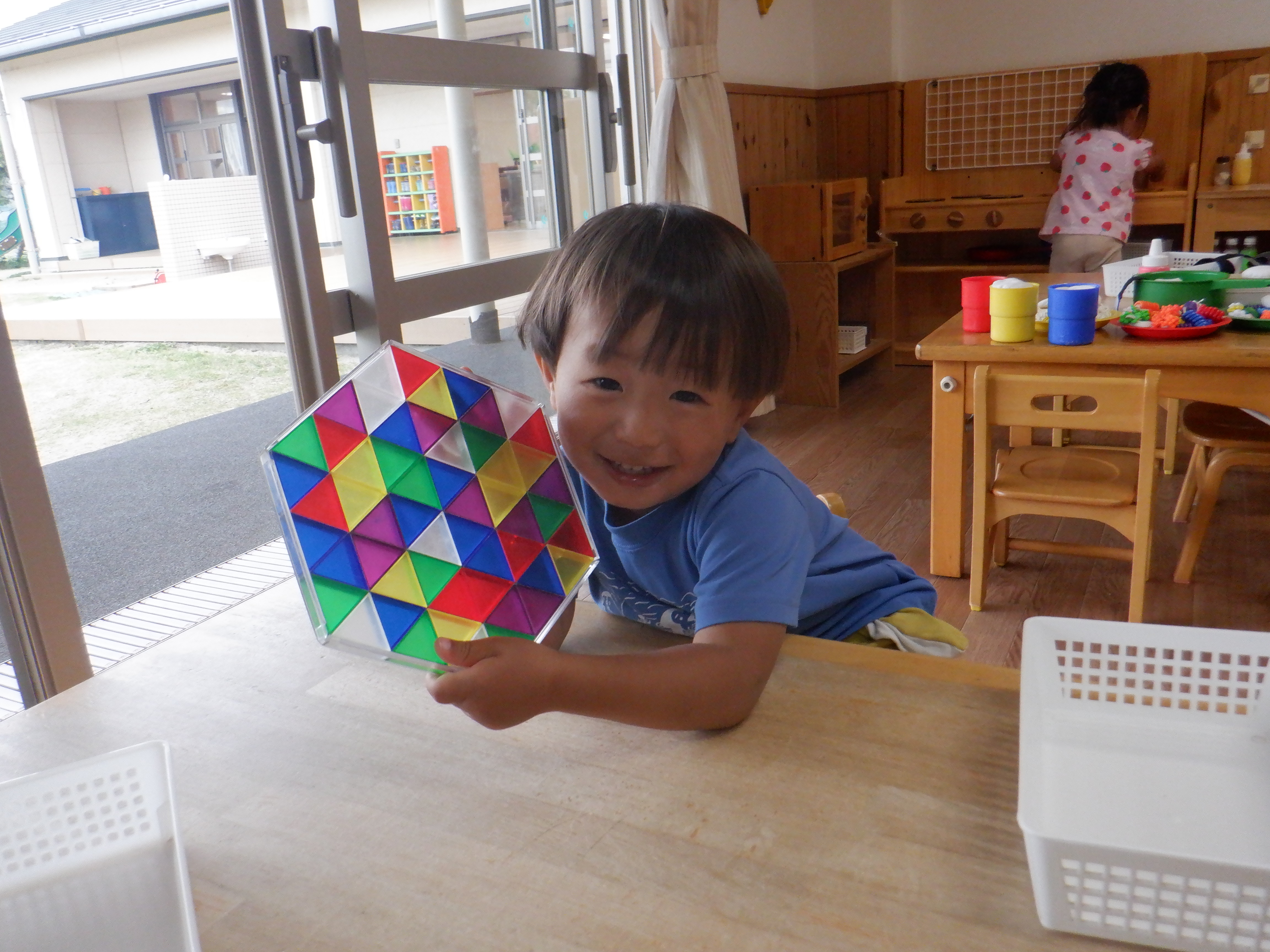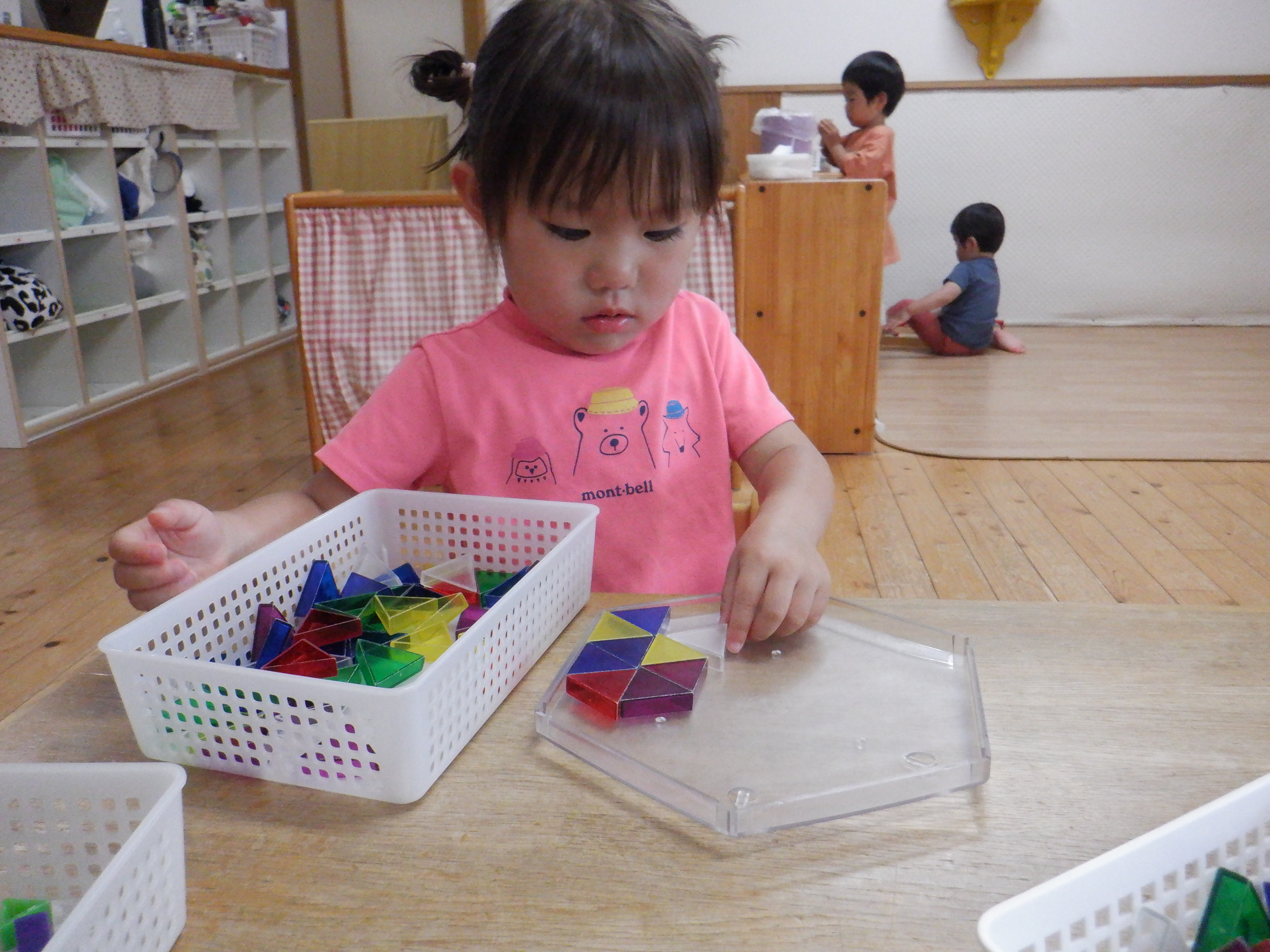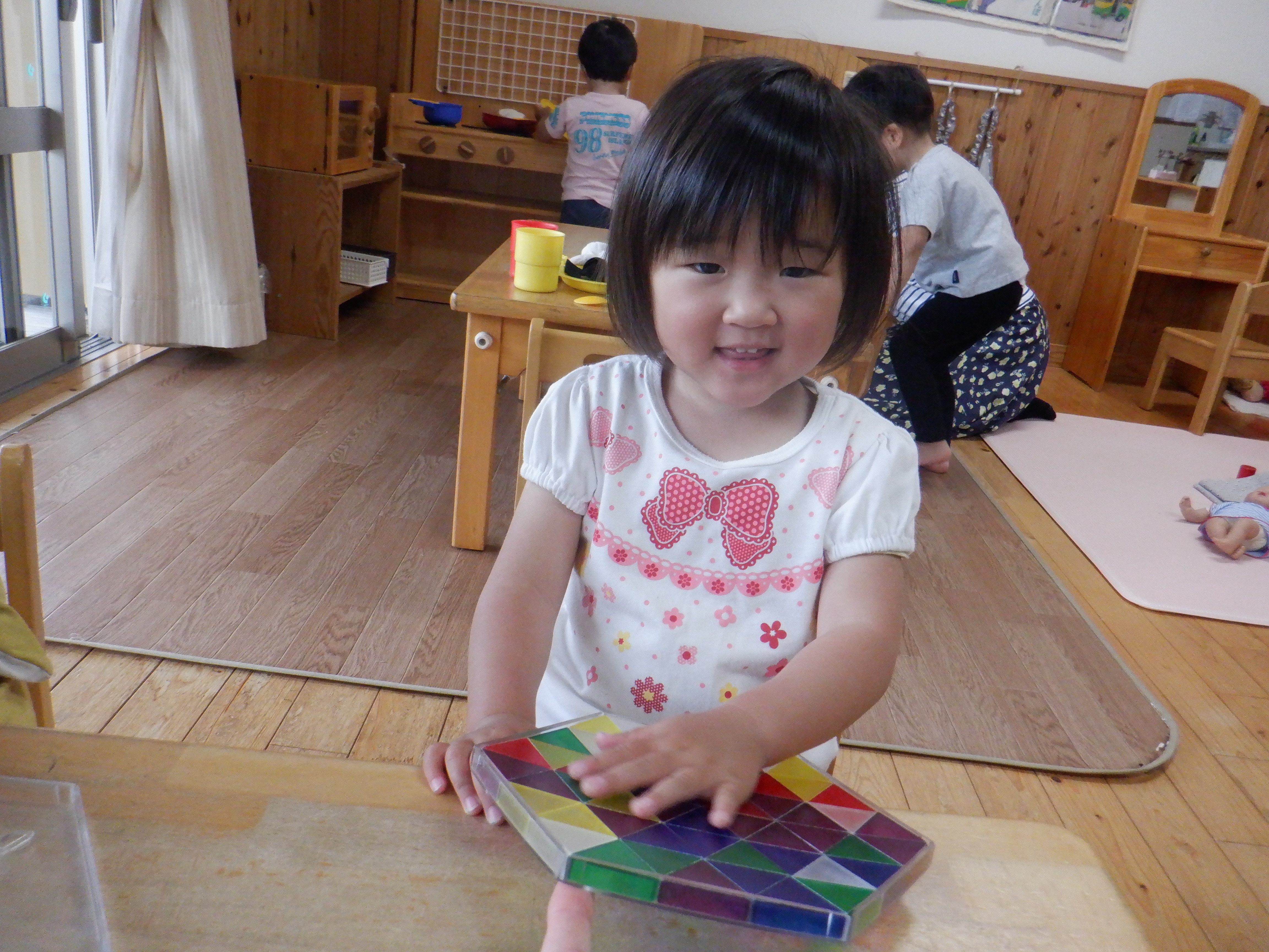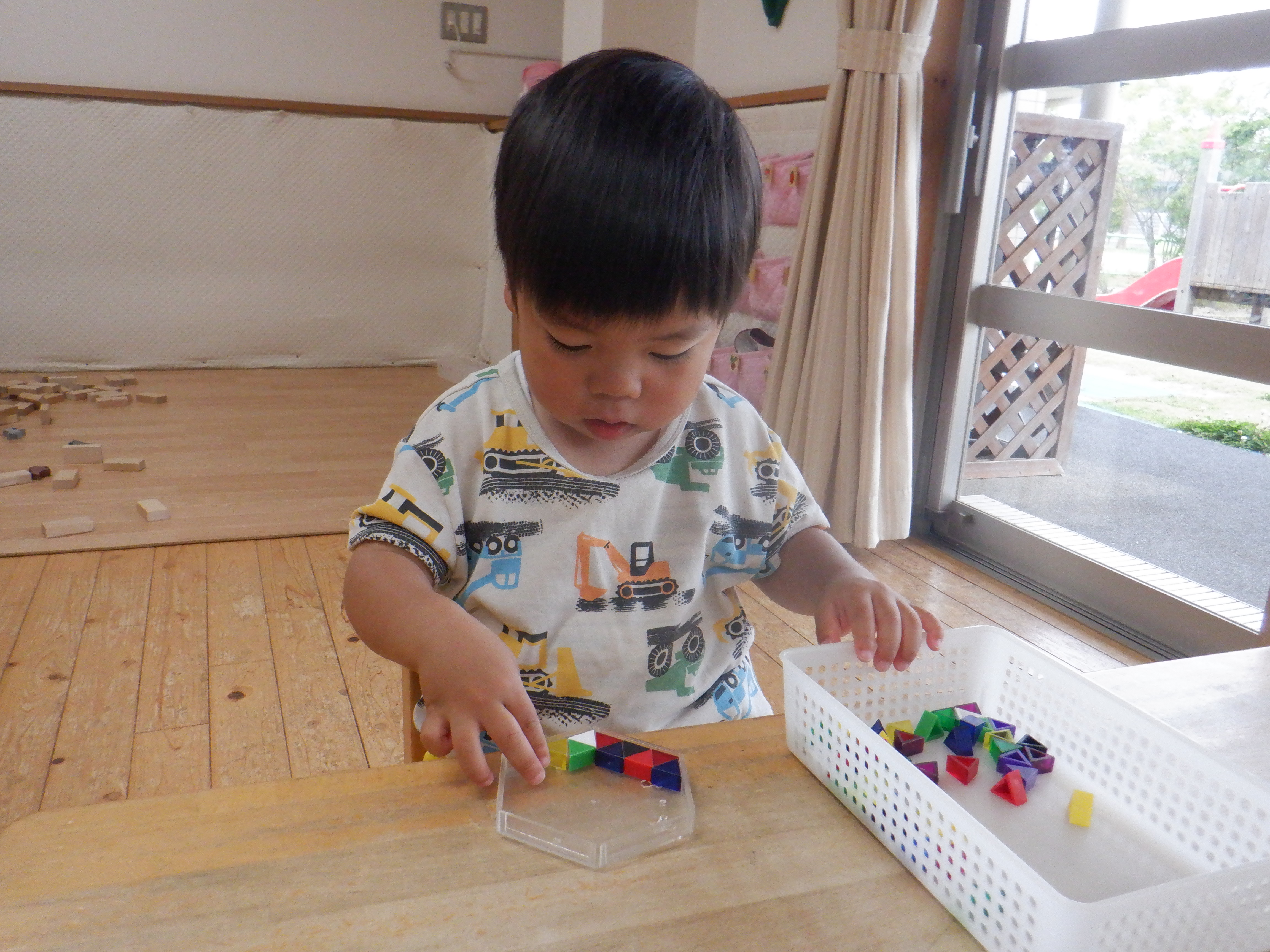 摘んだり握ったり、指を使って遊んでいます。プリズモでは、遊びを重ねるうち、並べながらはめこめるようになり、最後まで諦めずに完成させる子が増えてきました。出来上がったのを嬉しそうに見せてくれます。小さいサイズのピースもやってみようとしています。