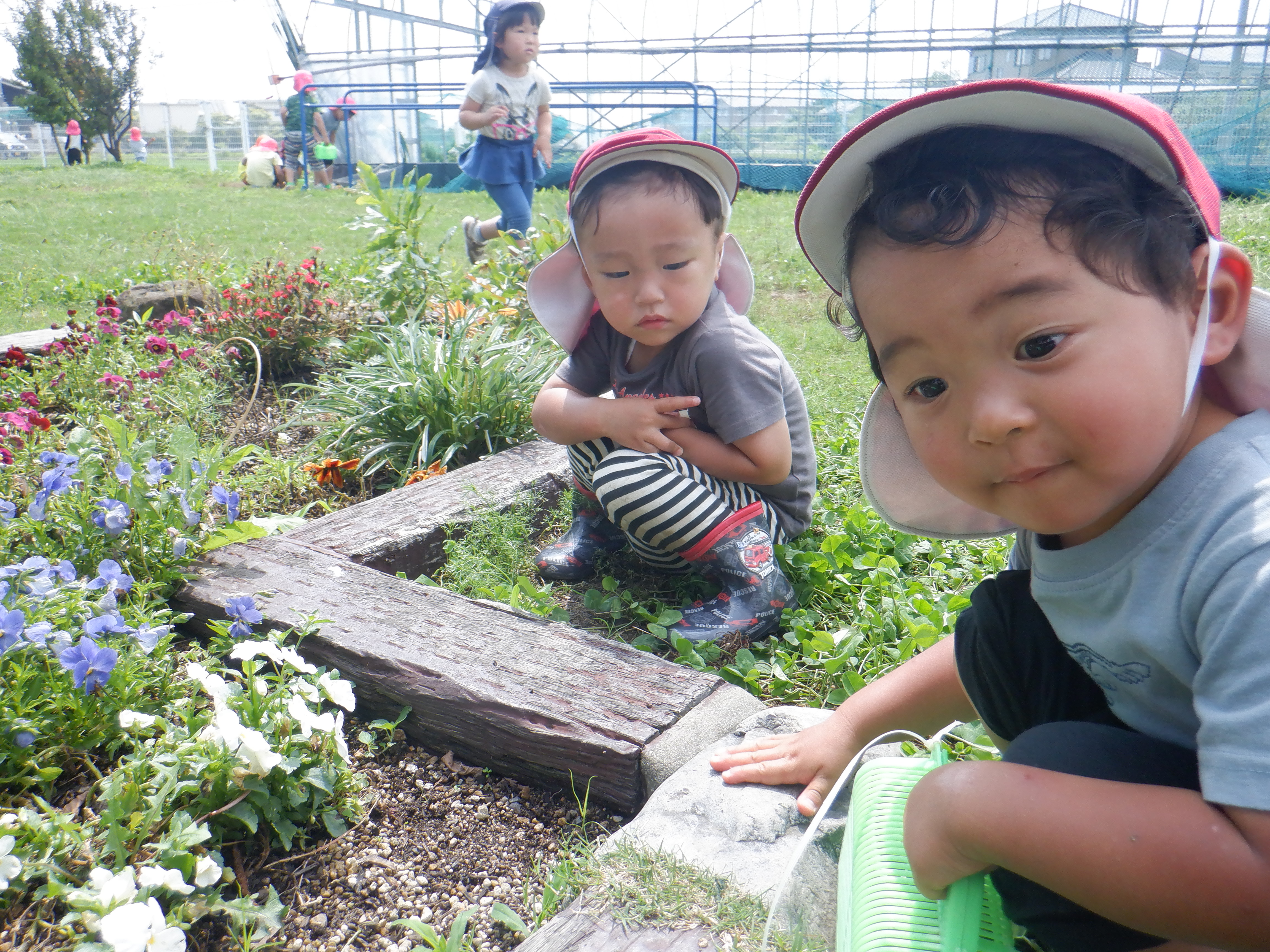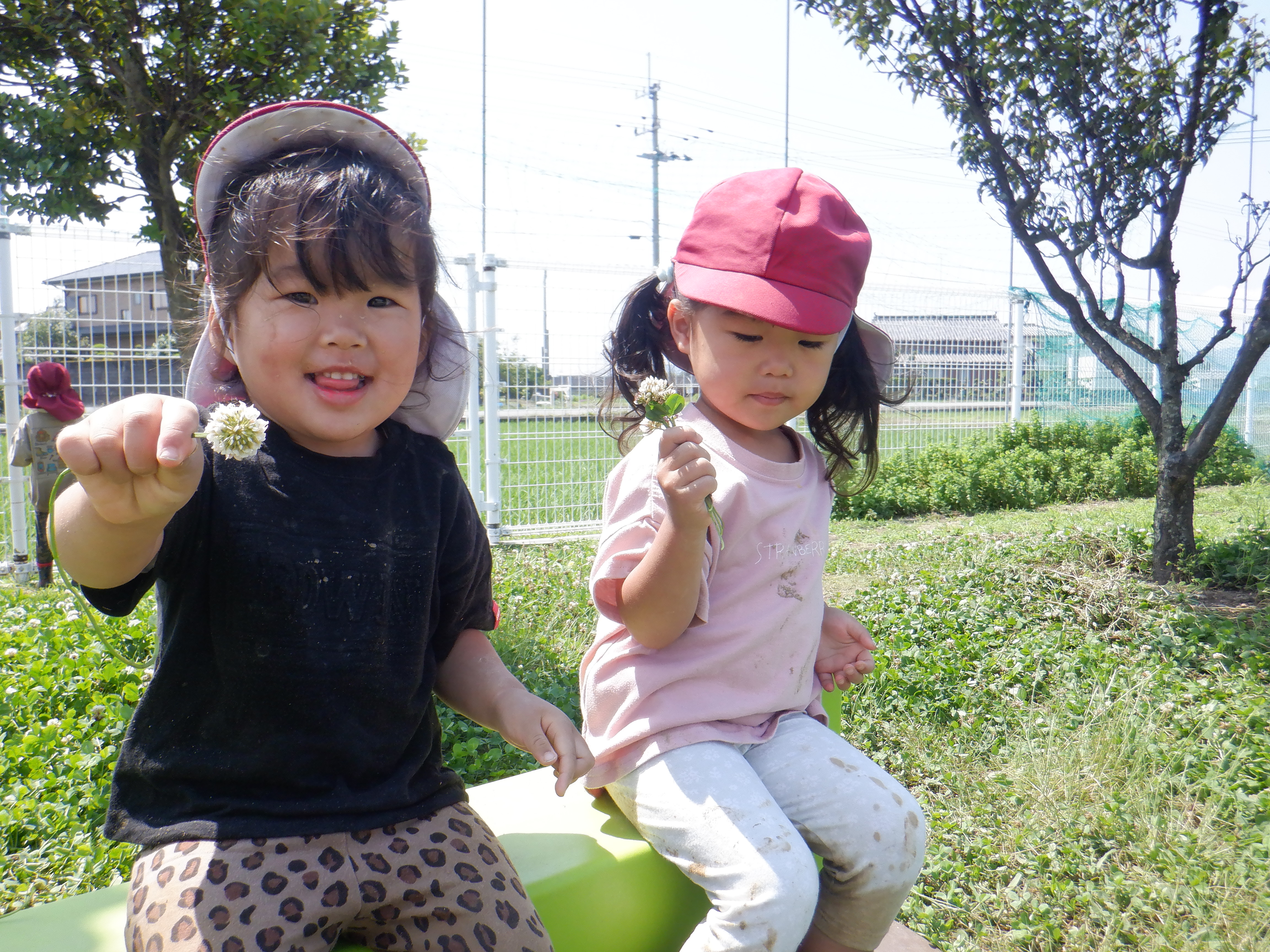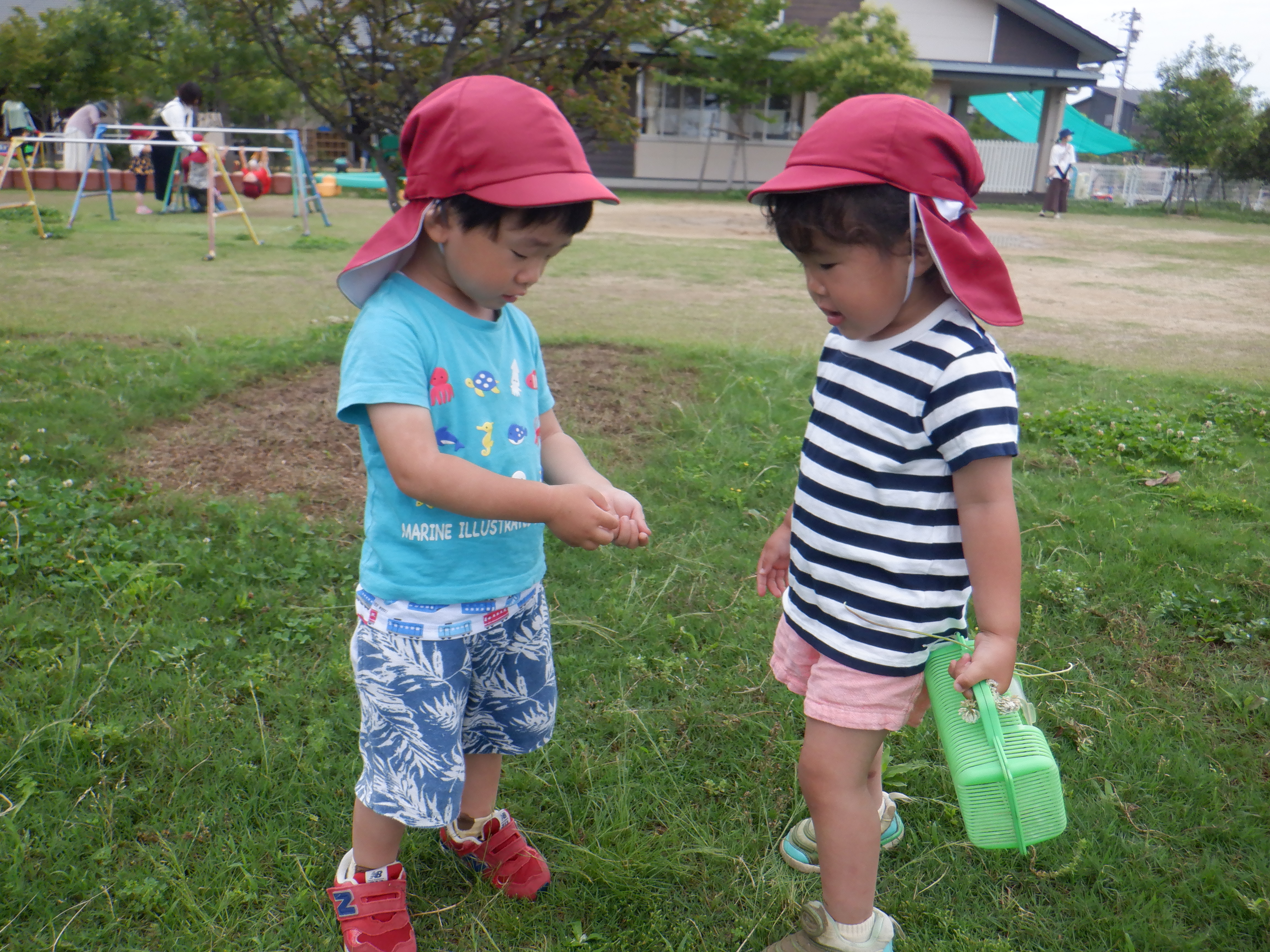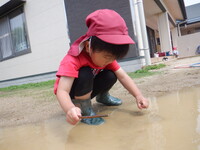 園庭のクローバーが一面に広がった所で、バッタやチョウ、カエルなどが飛んでいる姿がよく見られるようになりました。生き物探しに夢中の子どもたちです。「どこおるかなぁ。」と花壇や水溜り、木のまわりなど覗き込んでいます。捕まえることができると、嬉しそうに友だちや保育者に見せています。