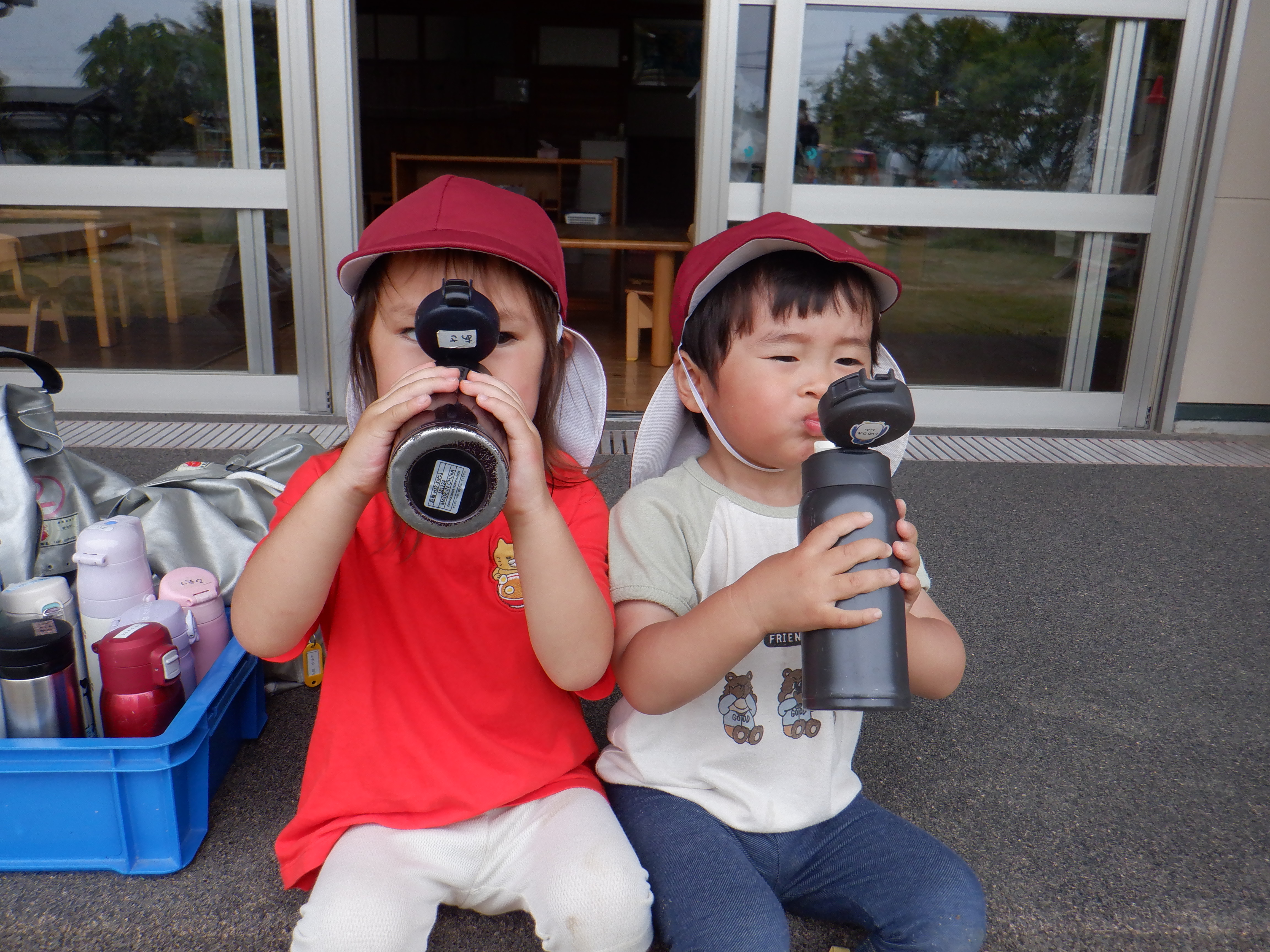 たくさん遊んで喉が乾くと、自分でテラスに行き、「美味しい。」と言いながら、水筒のお水やお茶を飲んでいます。