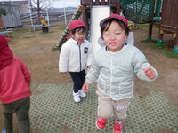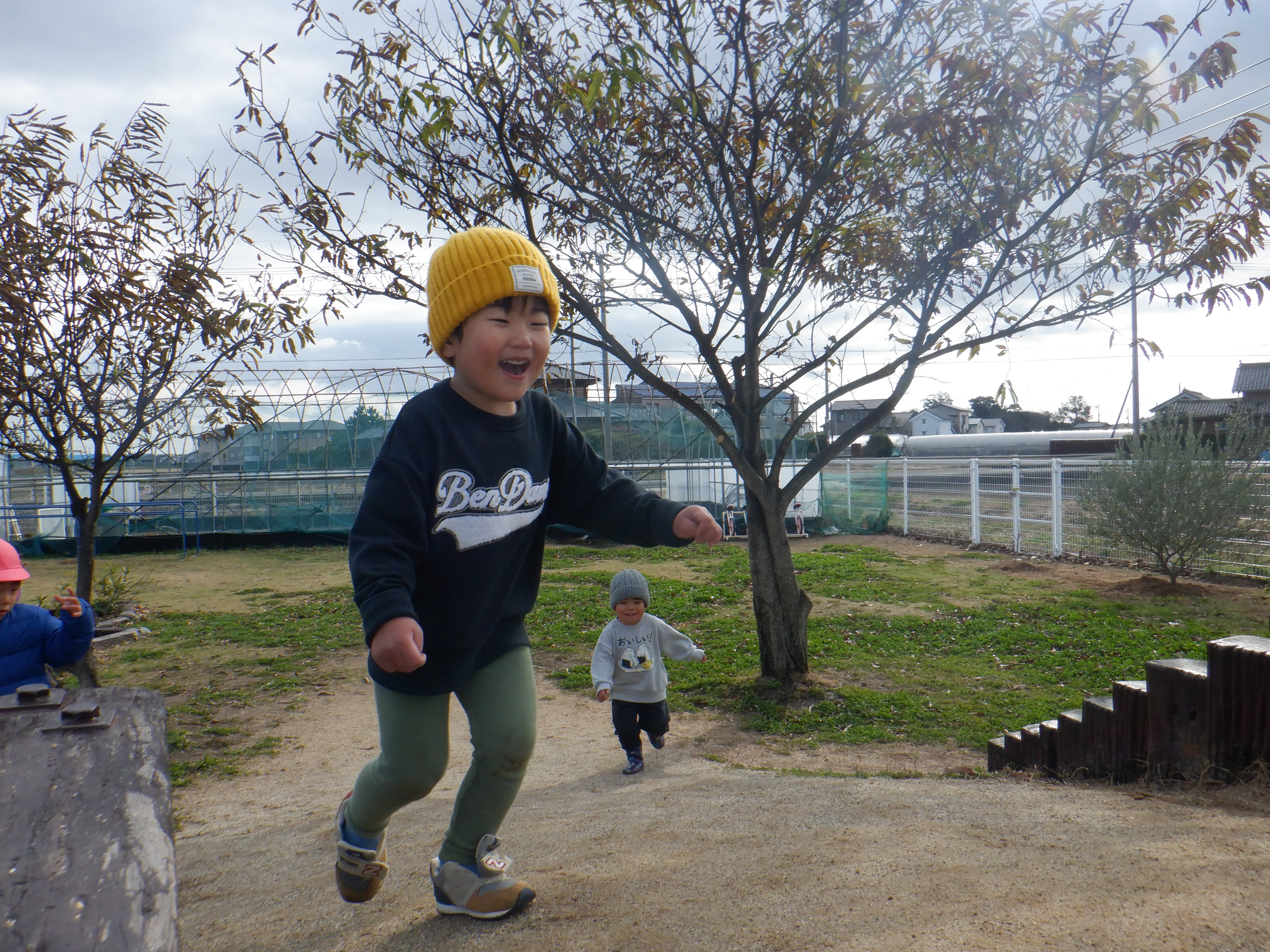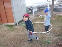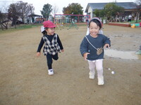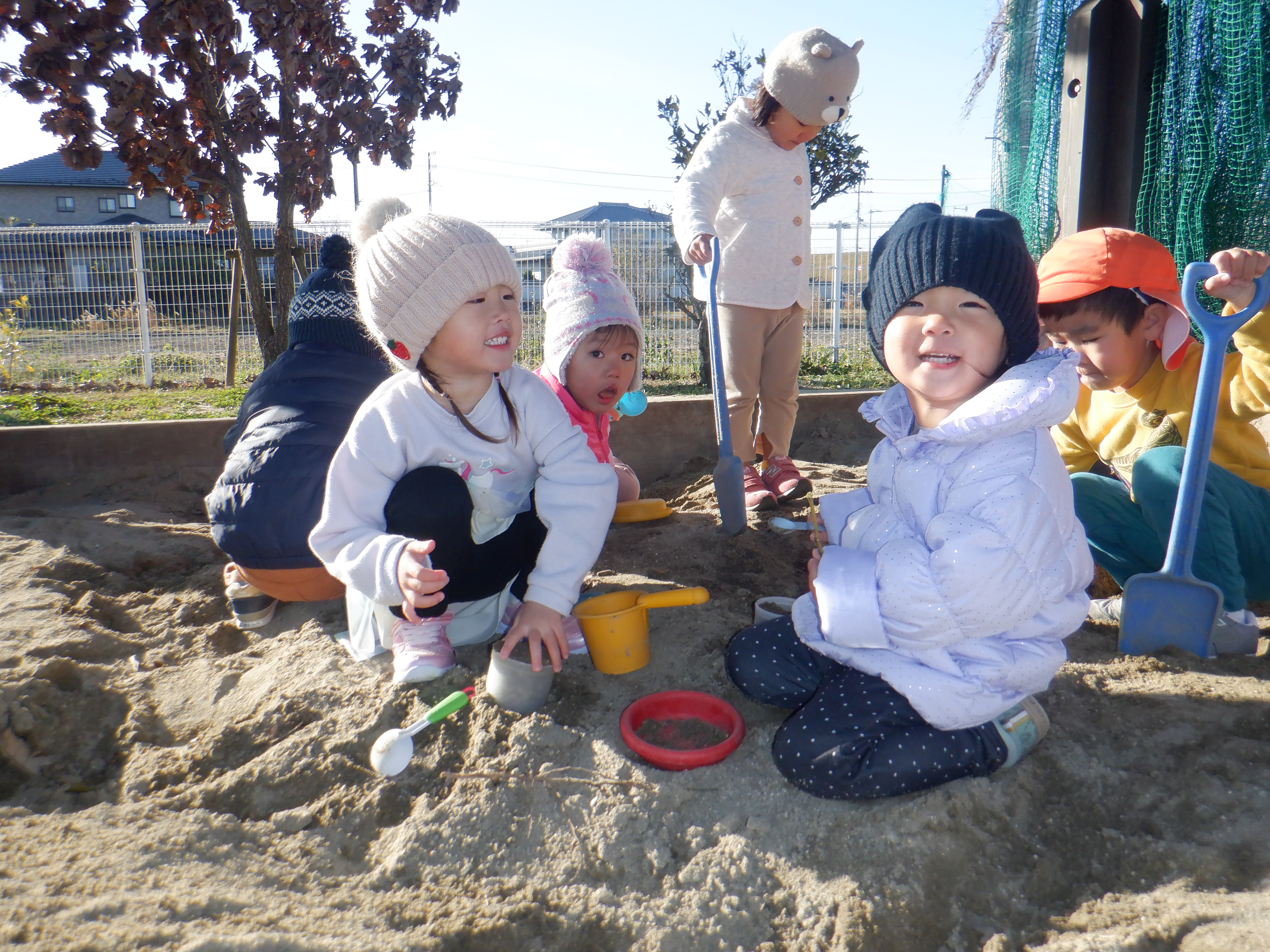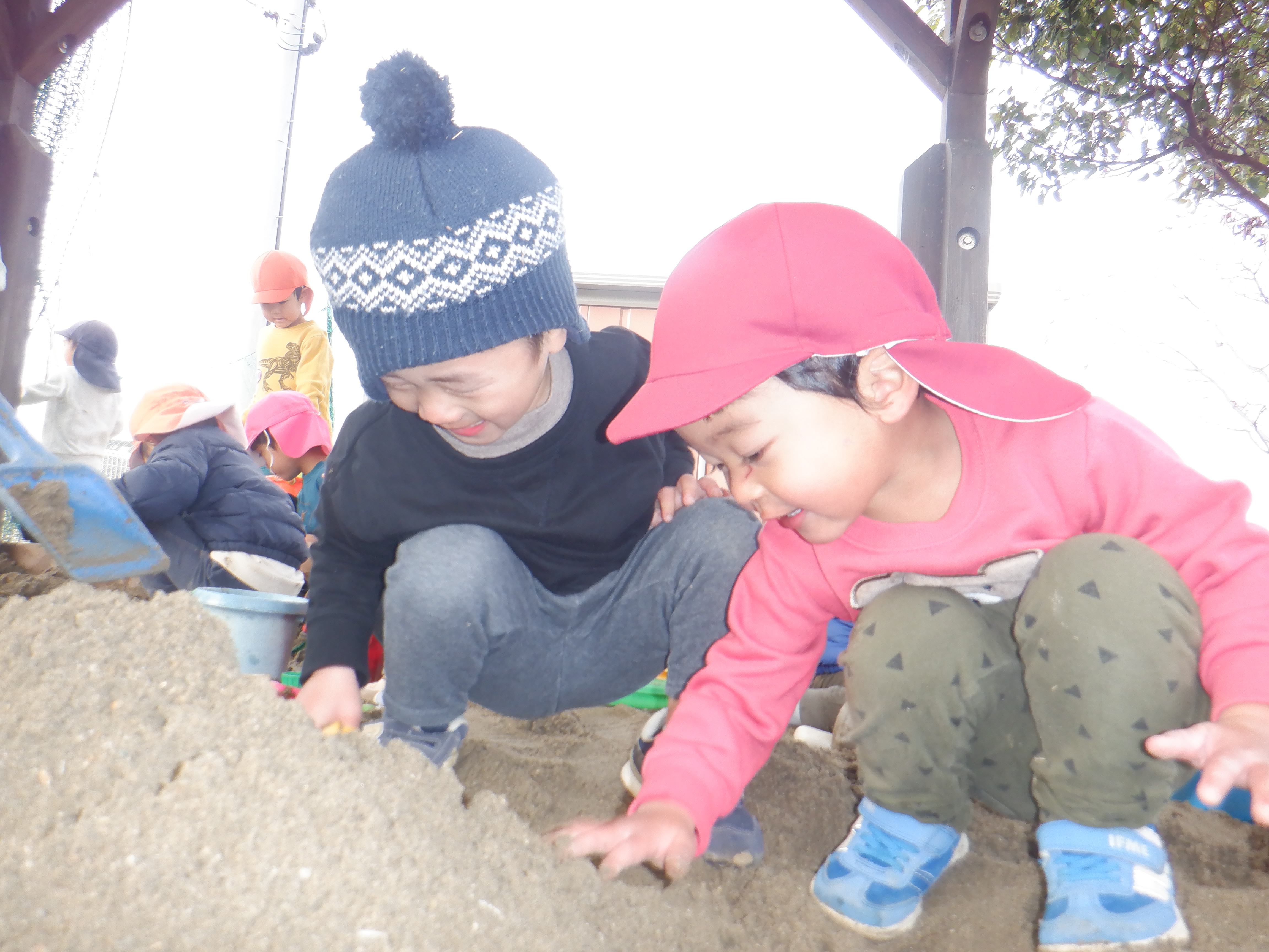 寒さに負けず毎日元気に園庭で遊んでいます。最近よく「一緒に〇〇しよう!」と言う声が聞こえてきます。一緒に遊びたい友だちを誘い追いかけっこや砂場遊び、かくれんぼなどして楽しんでいます。友だちが転んでしまうと「大丈夫?」と声を掛けたり友だちの使いたい玩具を「一緒に取りに行く?」と尋ねている優しい姿も多く見られます。