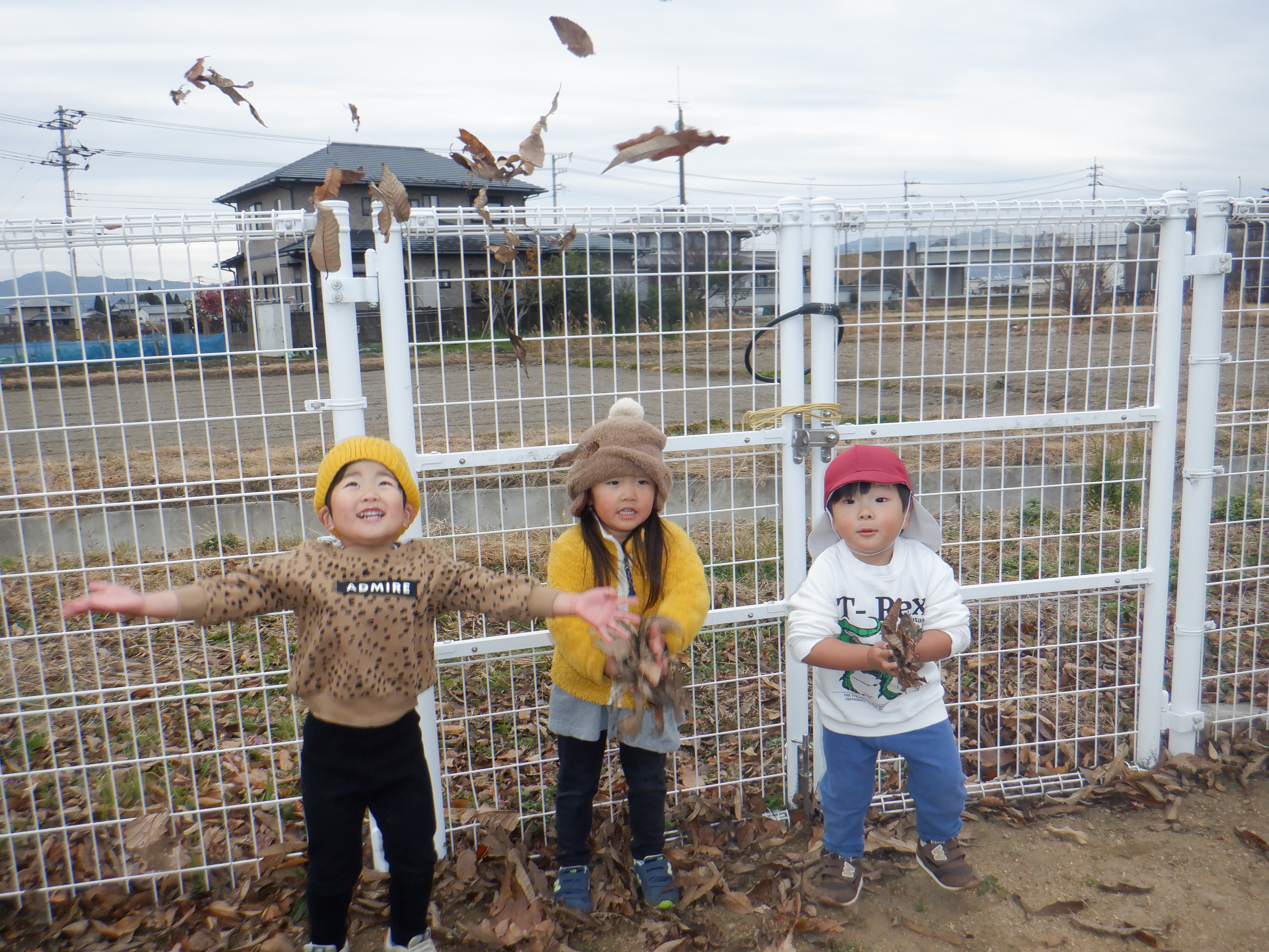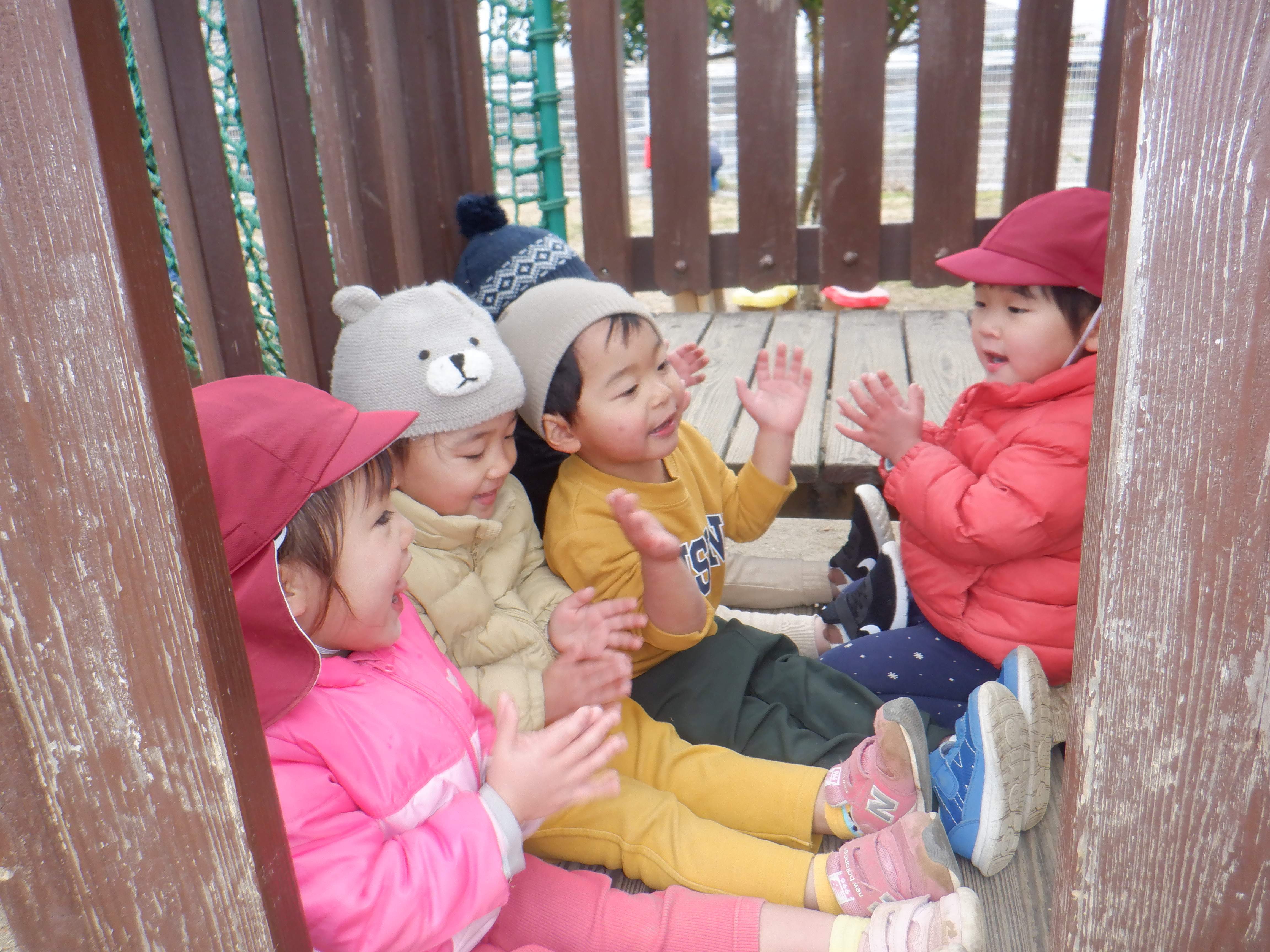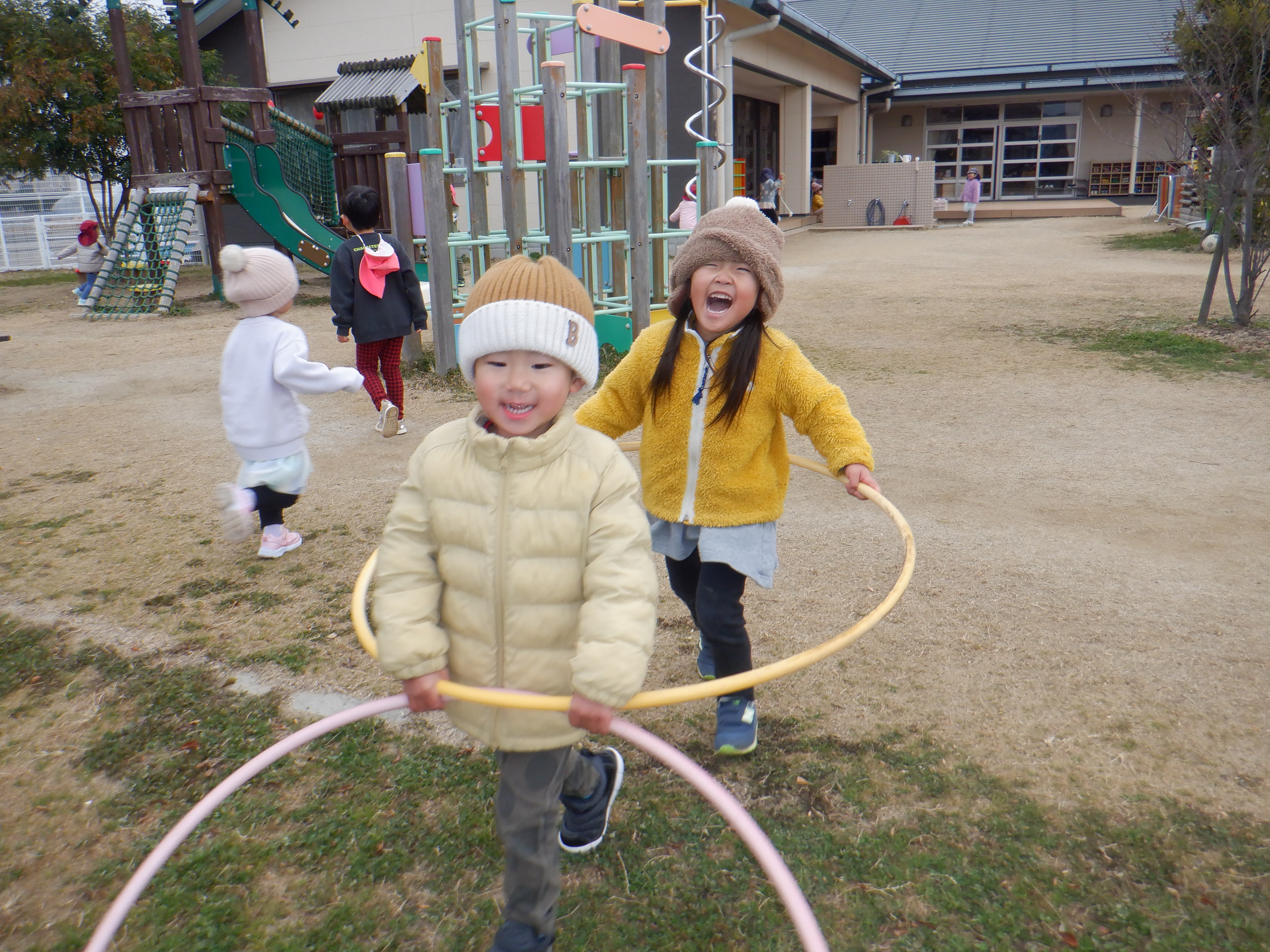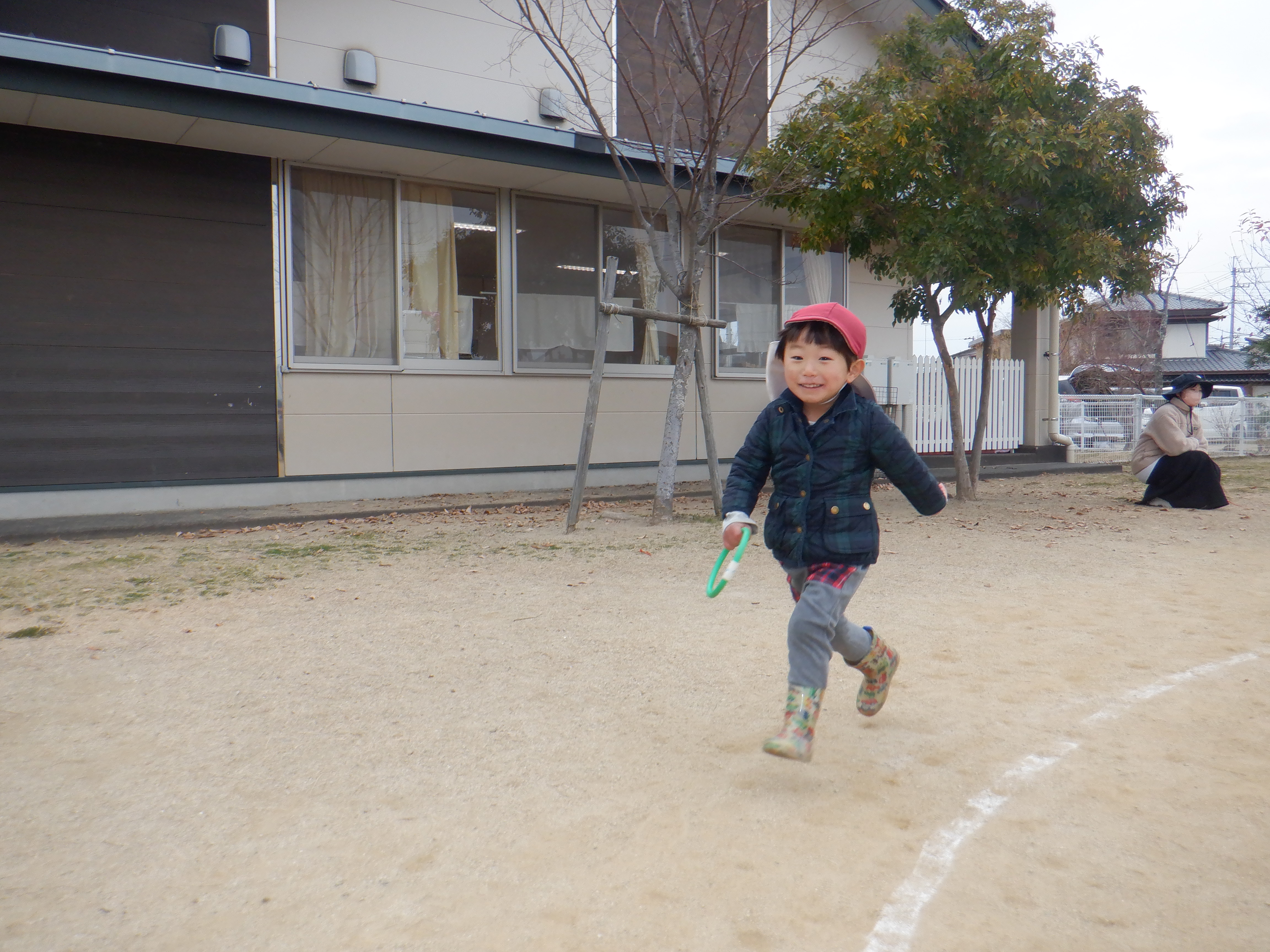 あけましておめでとうございます。今年もよろしくお願い致します。園庭では滑り台を家に見立てて誕生会を開いたり、砂場でご飯を作ったりと気の合う友だちと遊びを見つけて楽しんでいます。異年齢クラスがリレーを始めると続々とばらぐみの子どもたちも集まってきました。上手にバトンを受け取りかっこよく走っていました。