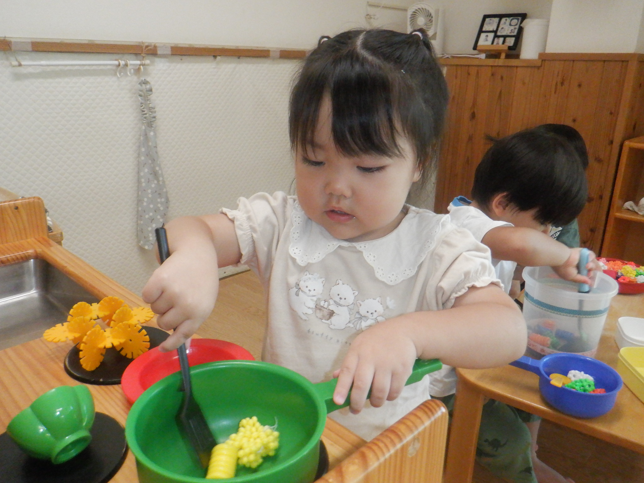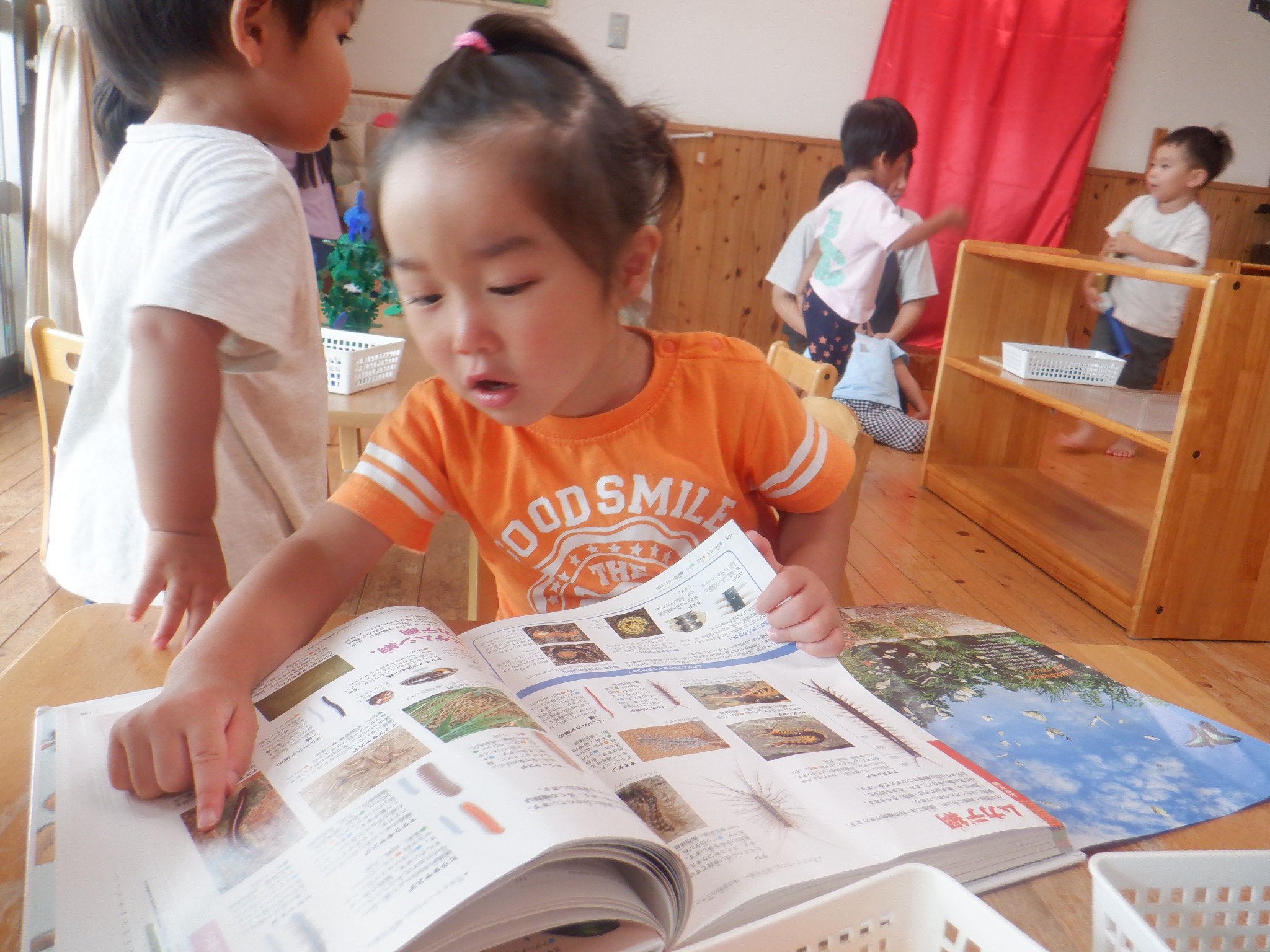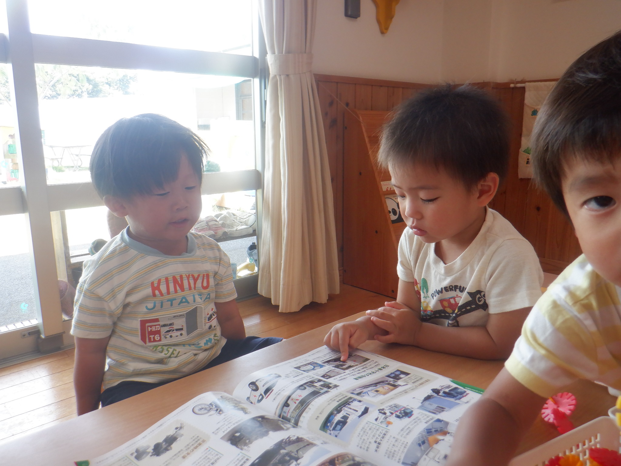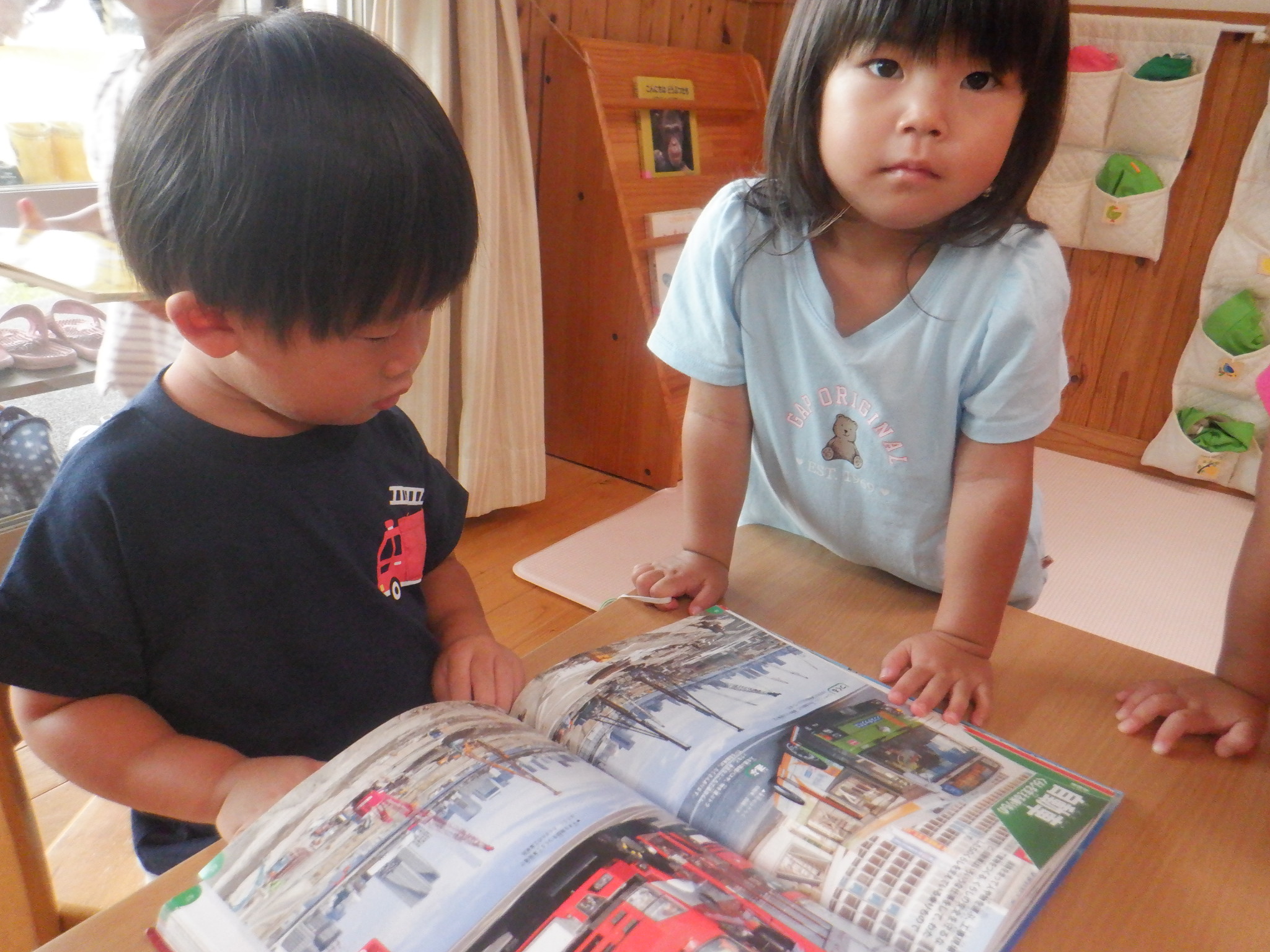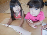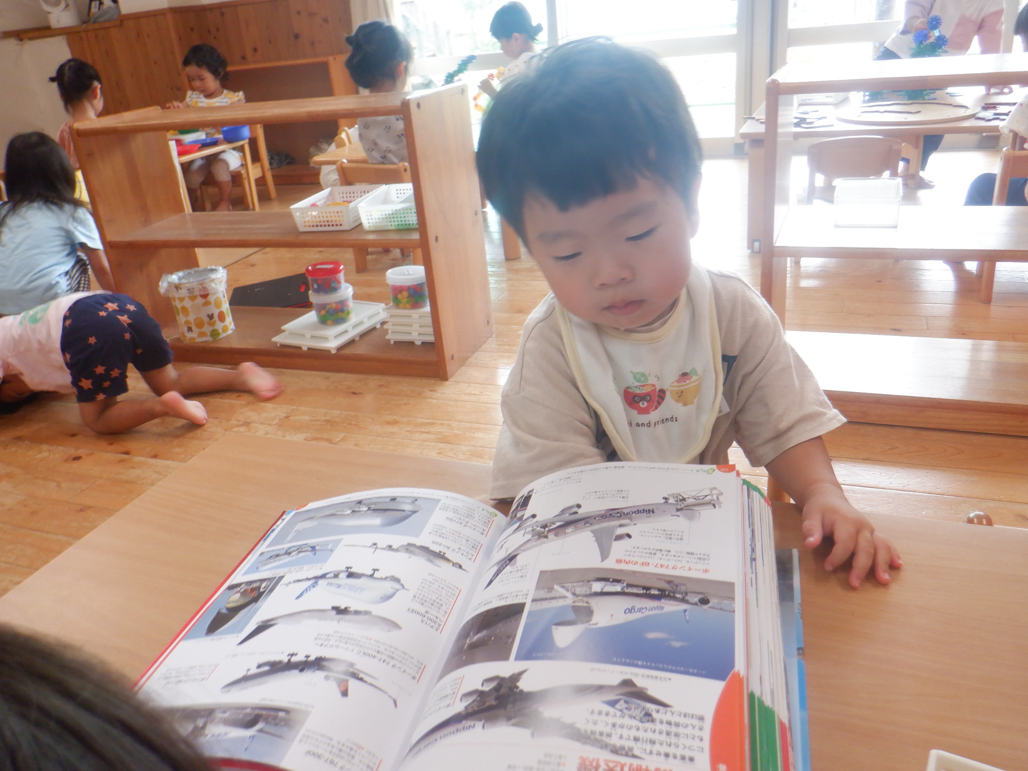 絵本を子どもたちが手に取れるようにしています。友だちと読んだり、1人で「ちょうちょ、とんぼ」と言葉にして読んだりとそれぞれの楽しみ方で絵本を手にしています。食べ物が出てくる絵本を見た後はままごとが賑わいます。車と虫の図鑑では「これはお母さんの車」「汽車乗ったことある〜」と子どもたち同士で会話を楽しんでいます。