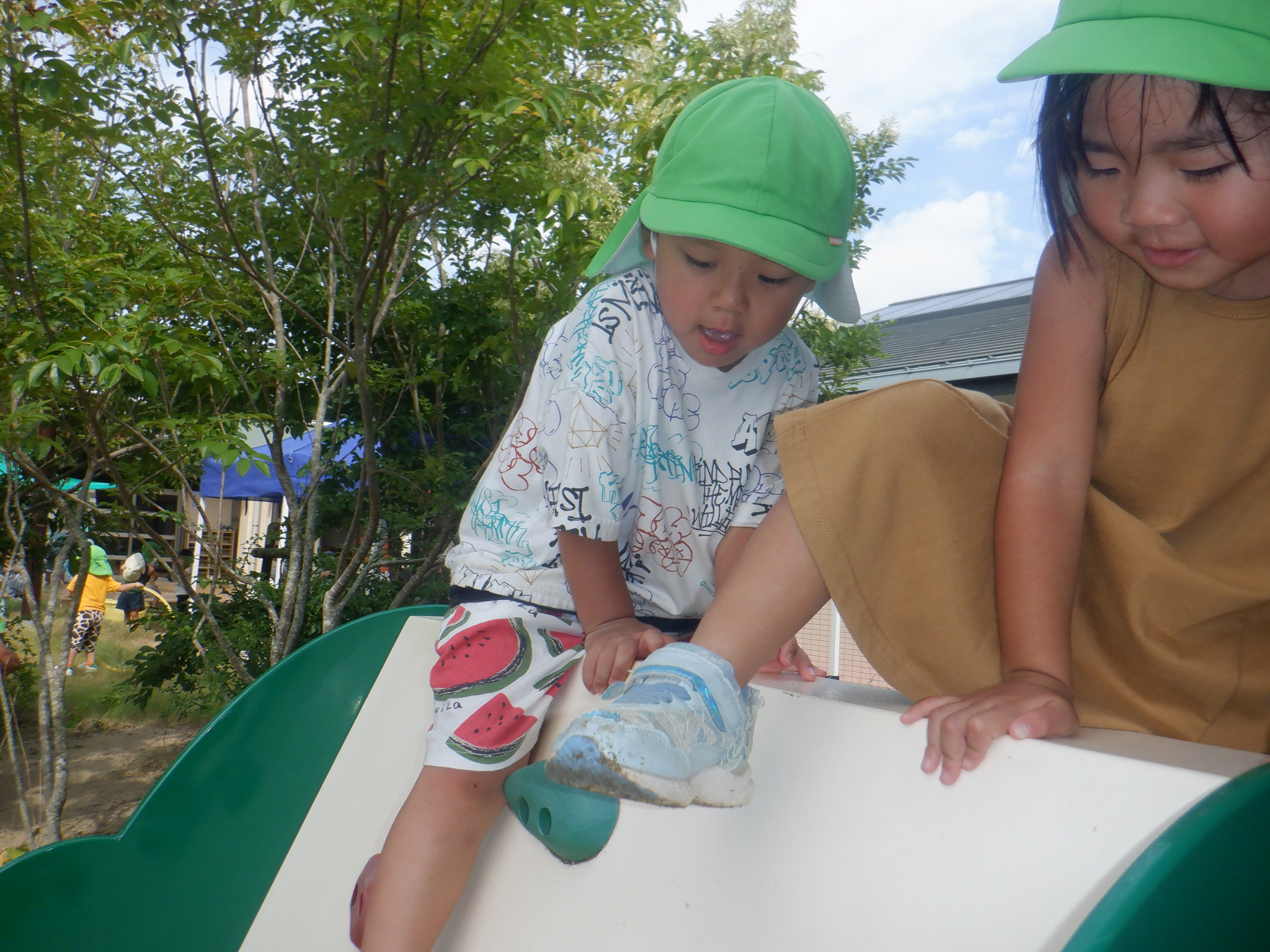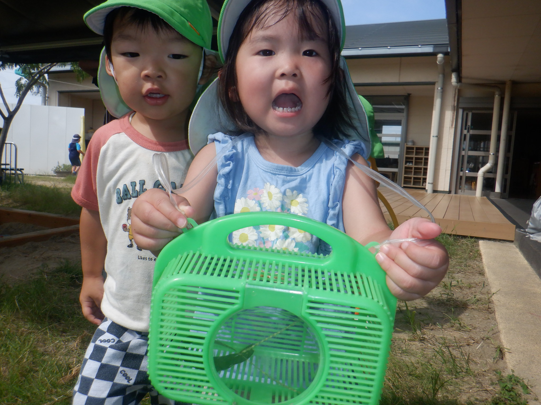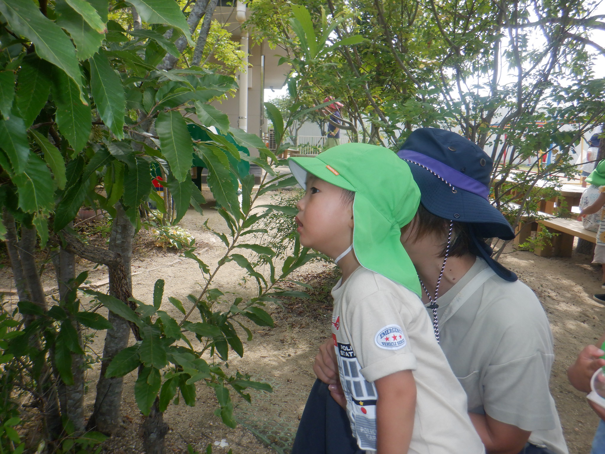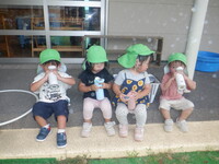 水遊びが終わり園庭で遊んでいます。バッタを追いかけたり、木に虫がいないか探したりと子どもたちで盛り上がっています。森のお店屋さんでは「いらっしゃいませ〜」とお客さんを呼んでやりとりをしています。「はい、かしこまりました!」と難しい言葉も使いこなしていました。まだまだ暑さが続きますが水分補給とシャワーをしながら元気に乗り越えていきたいと思います。