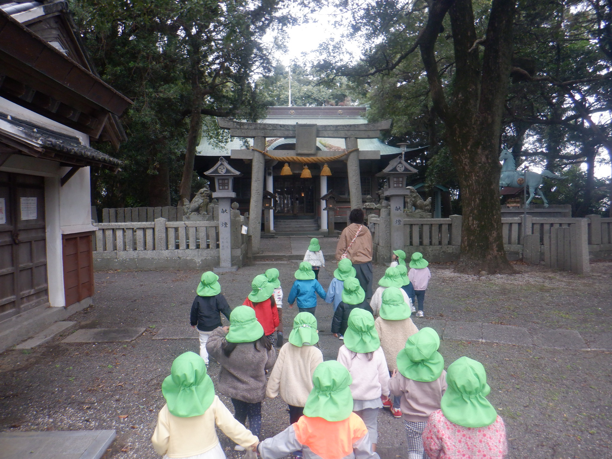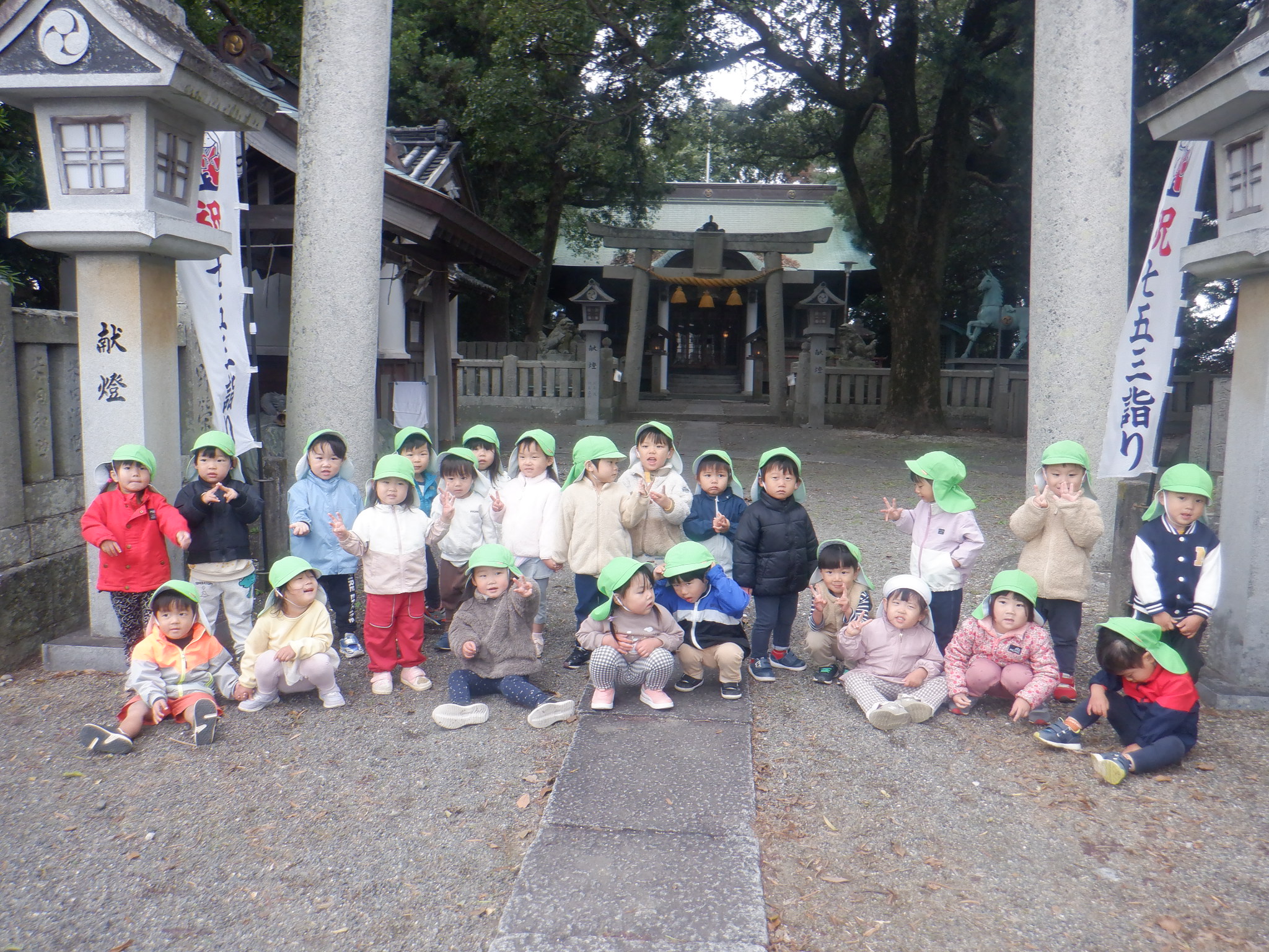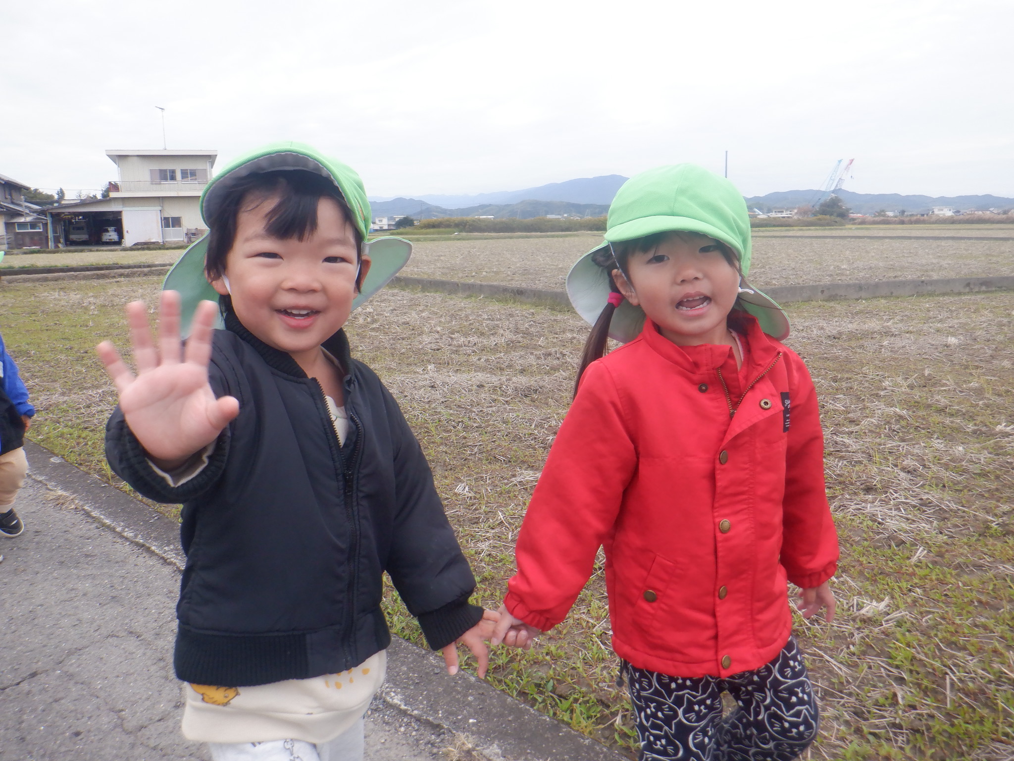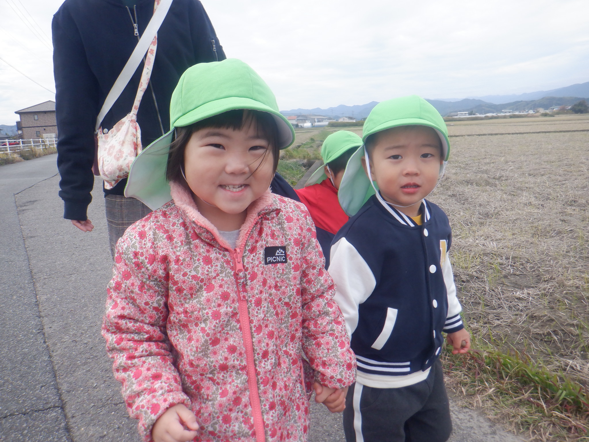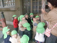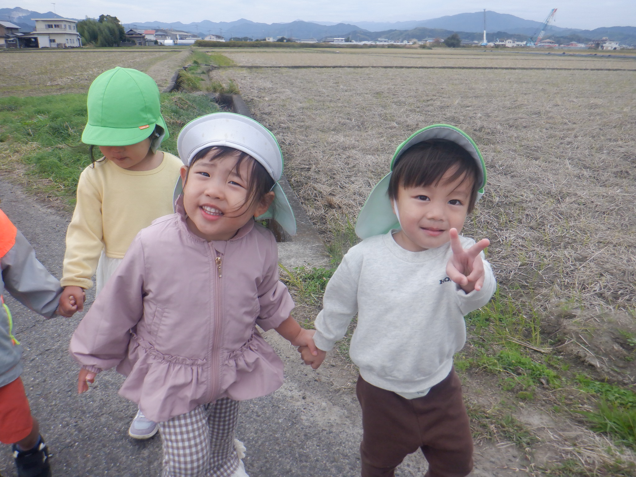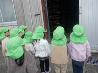 コスモスが綺麗なので散歩でよく見に行っています。農道を歩きながら、クレーン車やたくさんの実のなった柿の木、飛行機などをみて楽しんでいます。今日は今まで通ったことのない道を「たんけん」と言いながら歩きました。椎茸を栽培している所を見たり、八幡神社に行って、みんなで鈴を鳴らしました。近所の方々も笑顔で声を掛けて手を振ってくれたりと楽しい探検になりました。