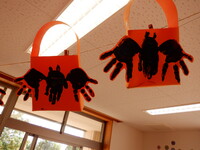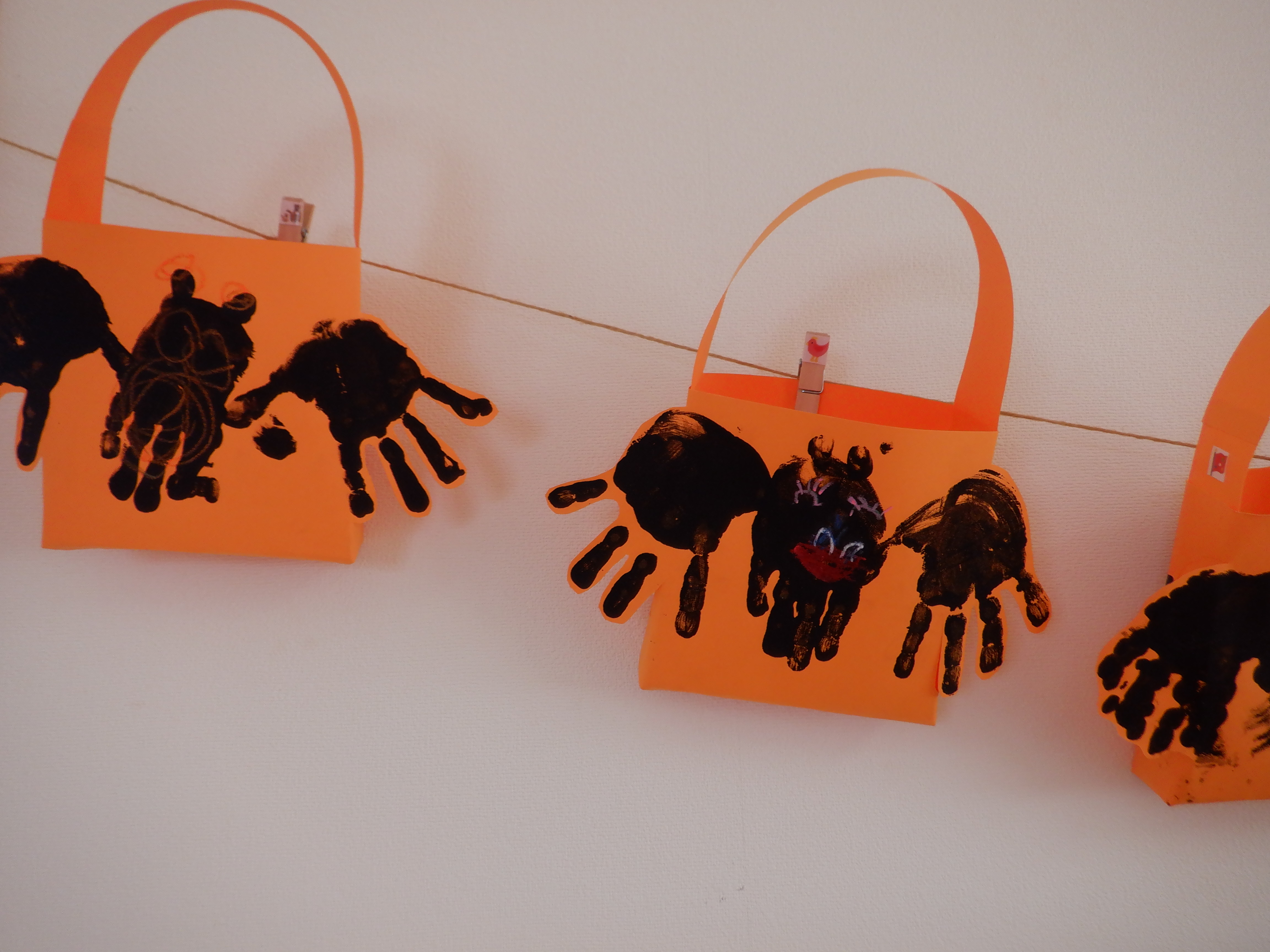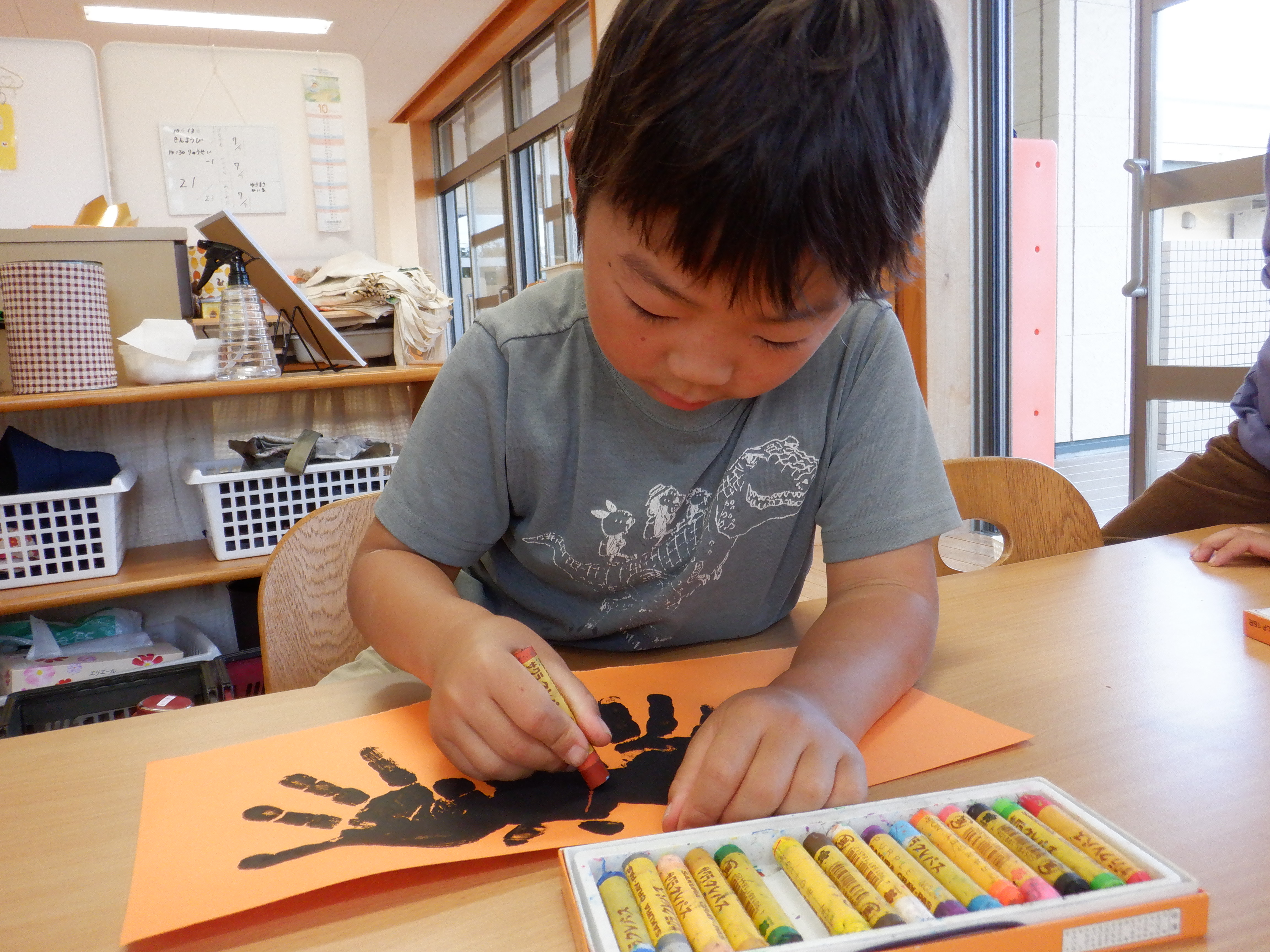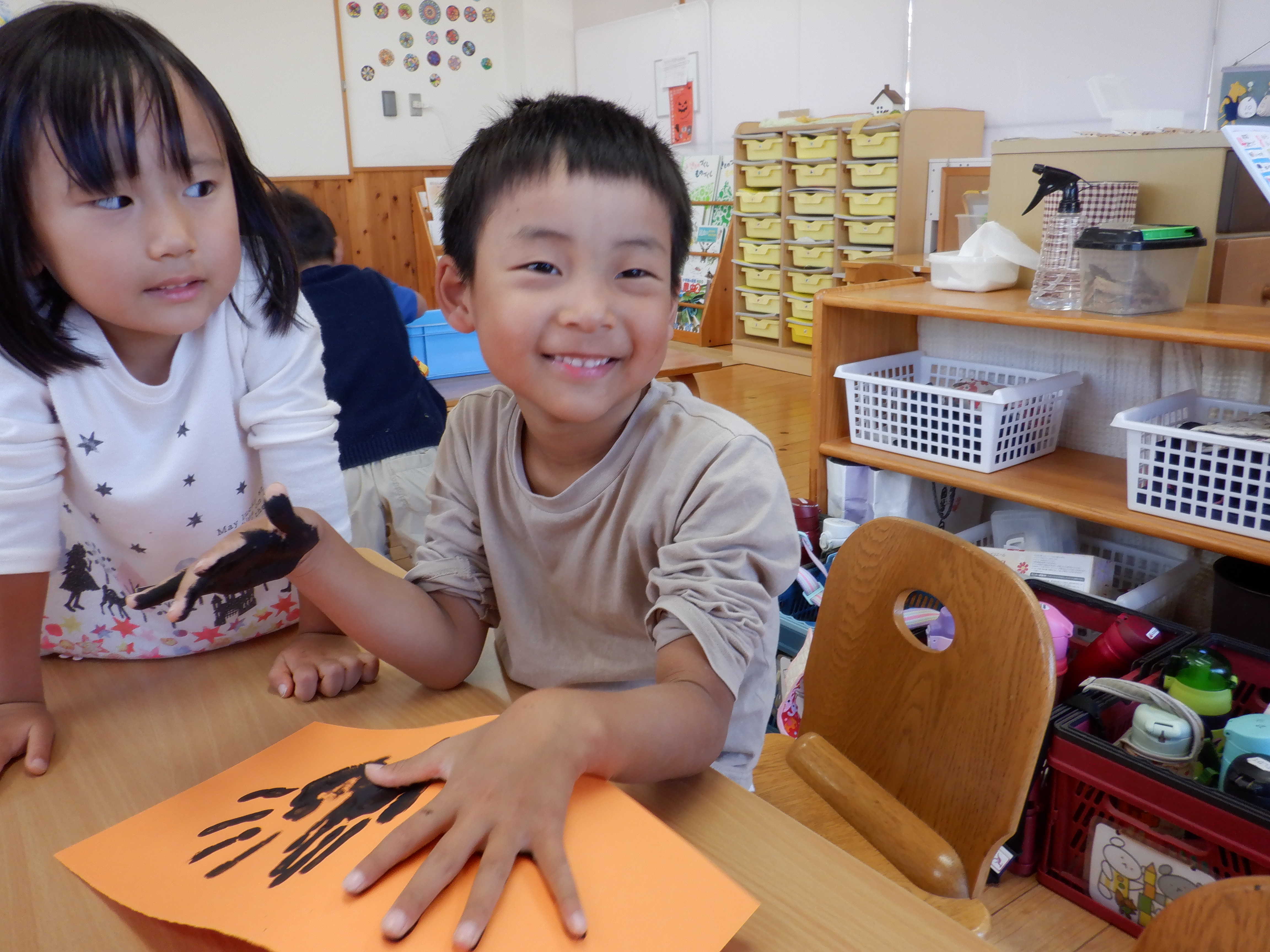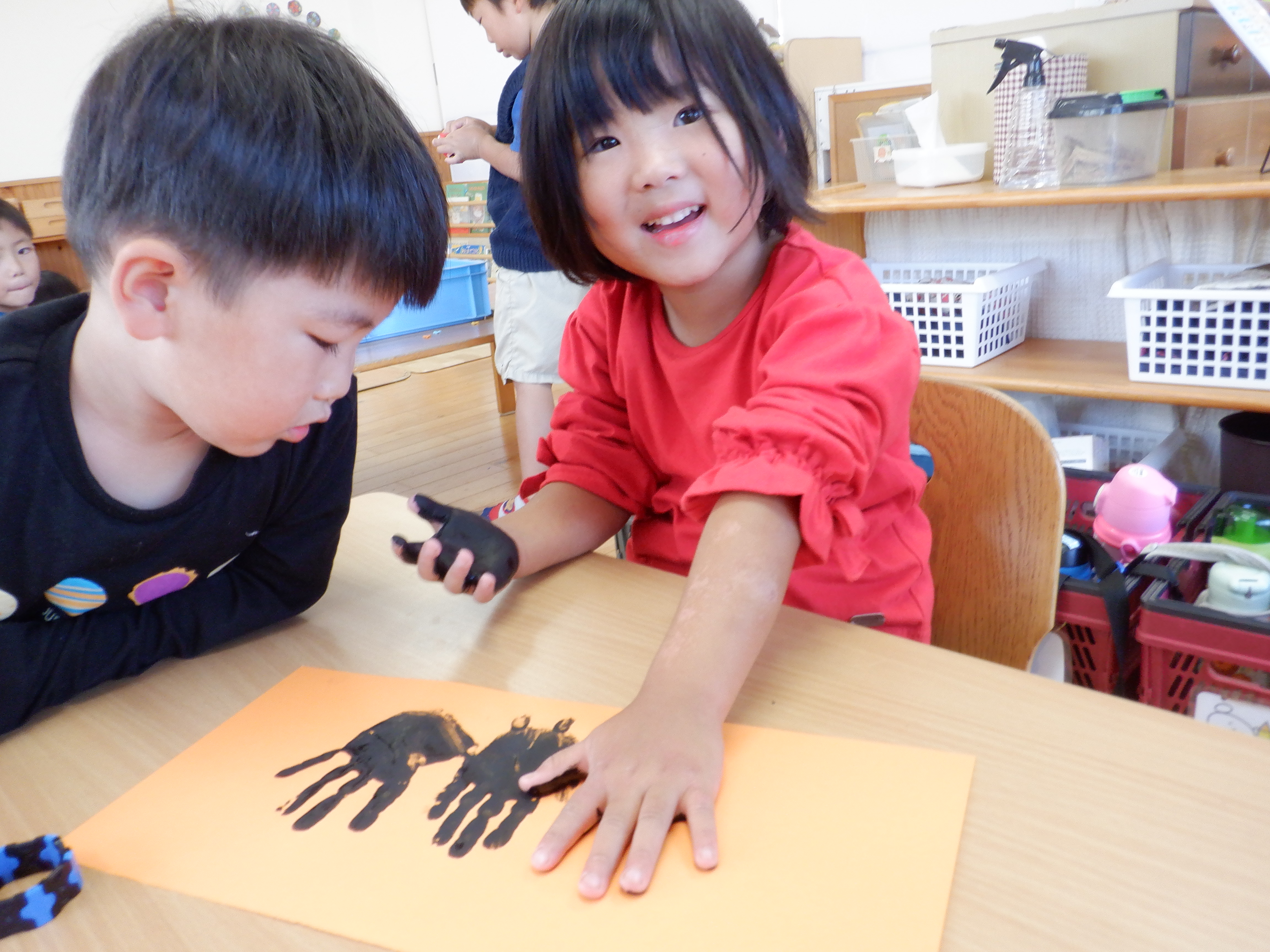 コウモリのお菓子入れを作りました。手で大きな羽を表現していました。コウモリの顔を描くのに赤い目にしていたり、お髭を描いてあげる子もいました。