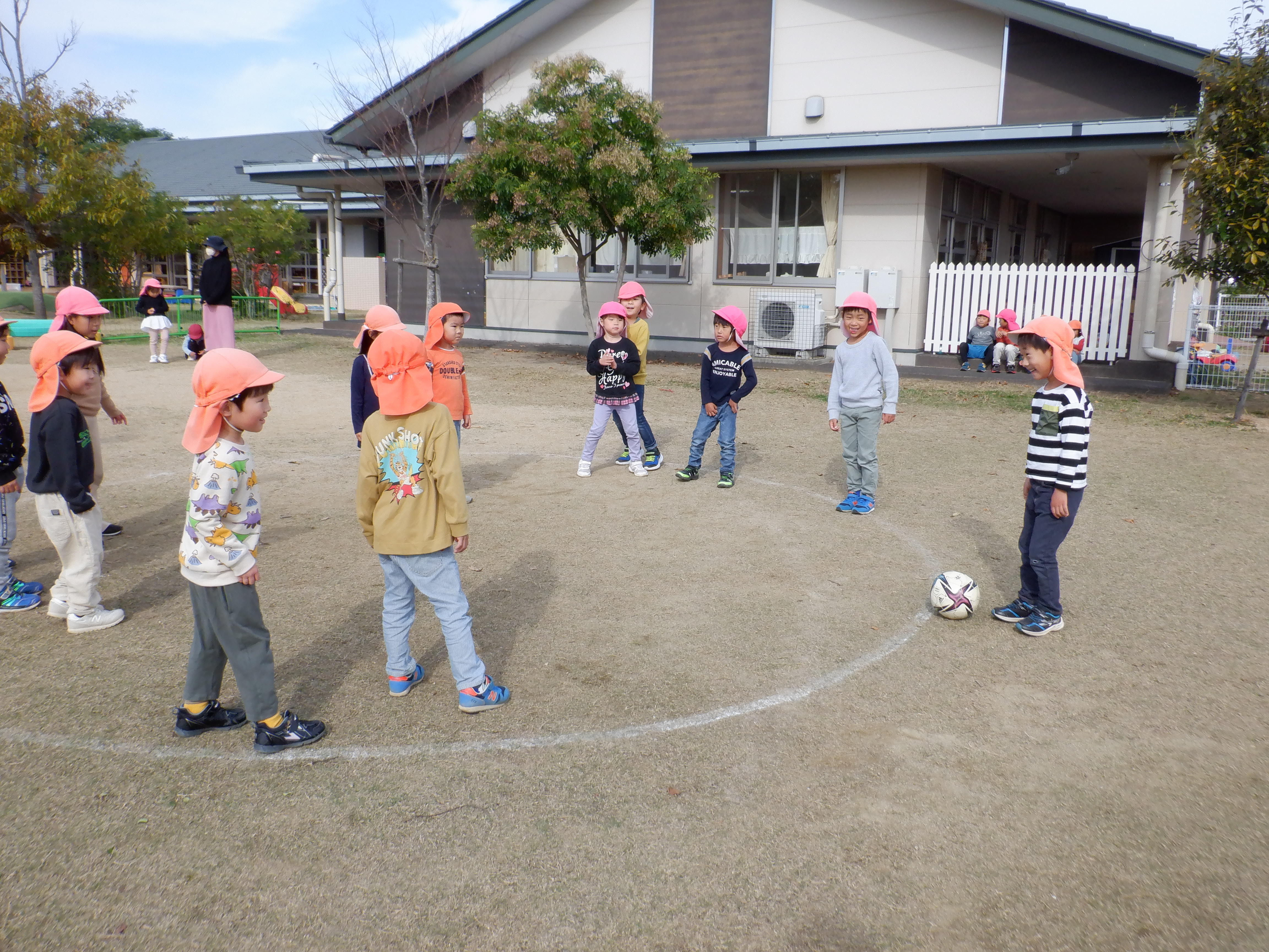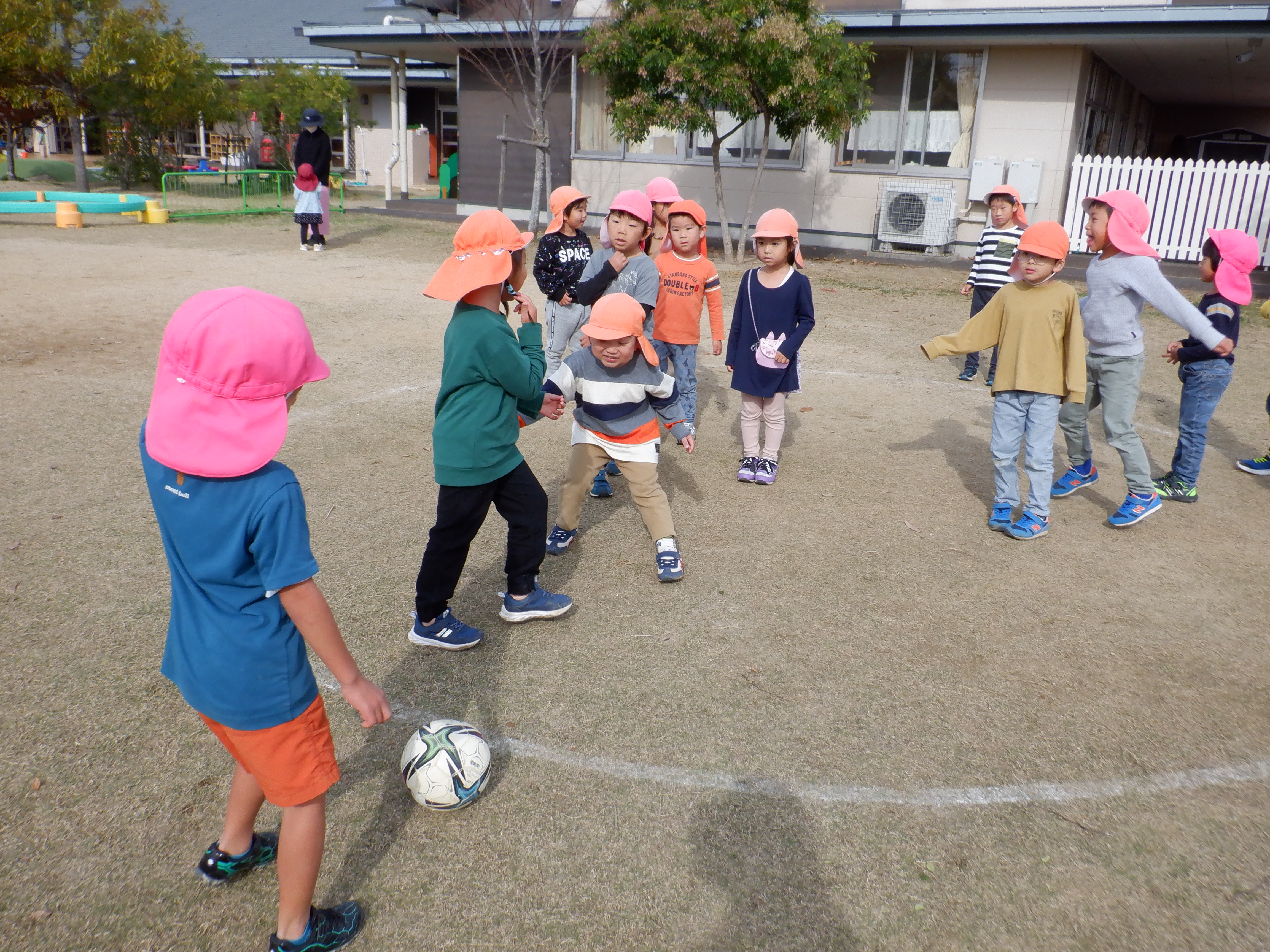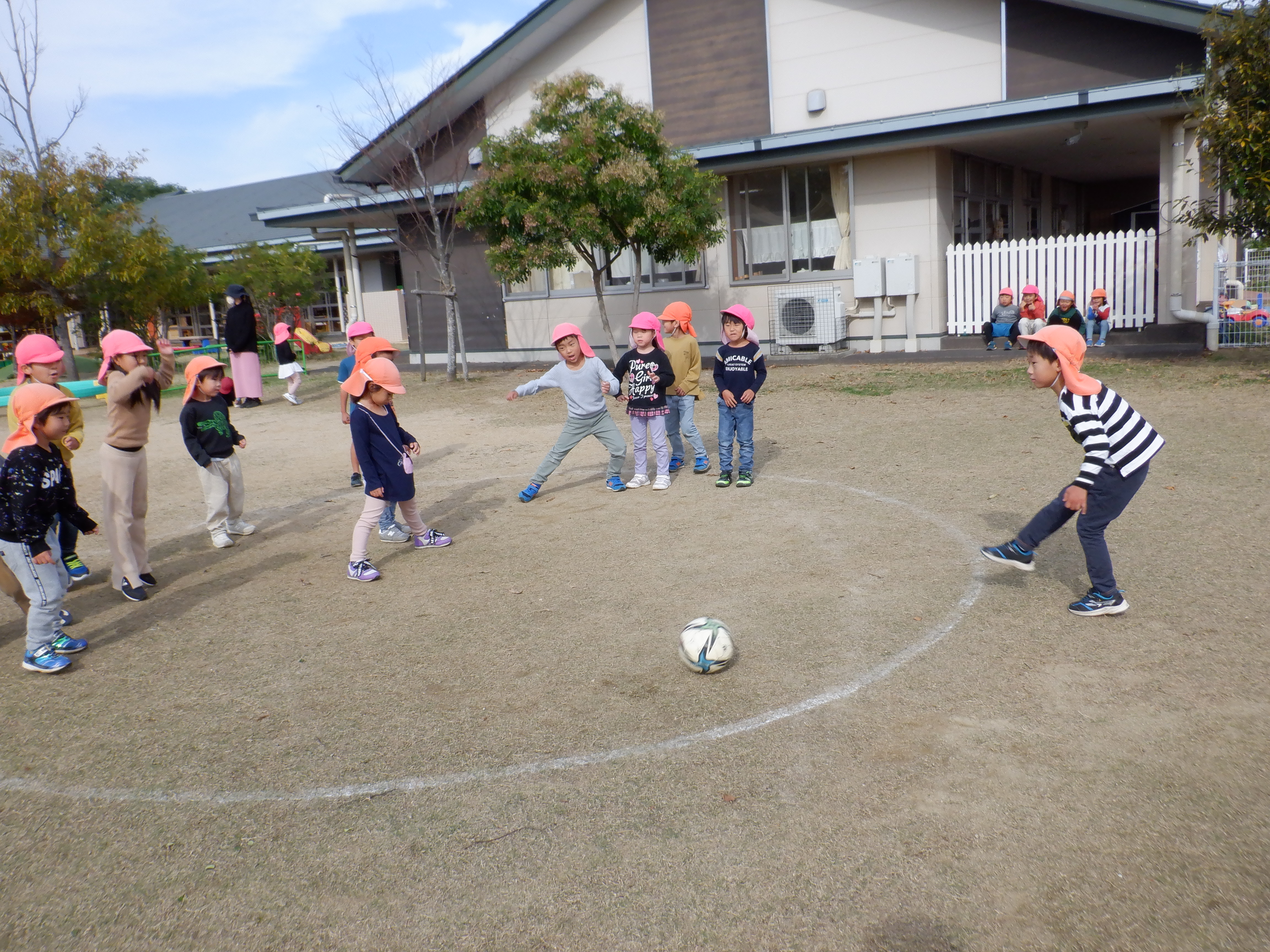 中の子はボールをしっかり見て避け、外の子は力強くボールを蹴っていました。