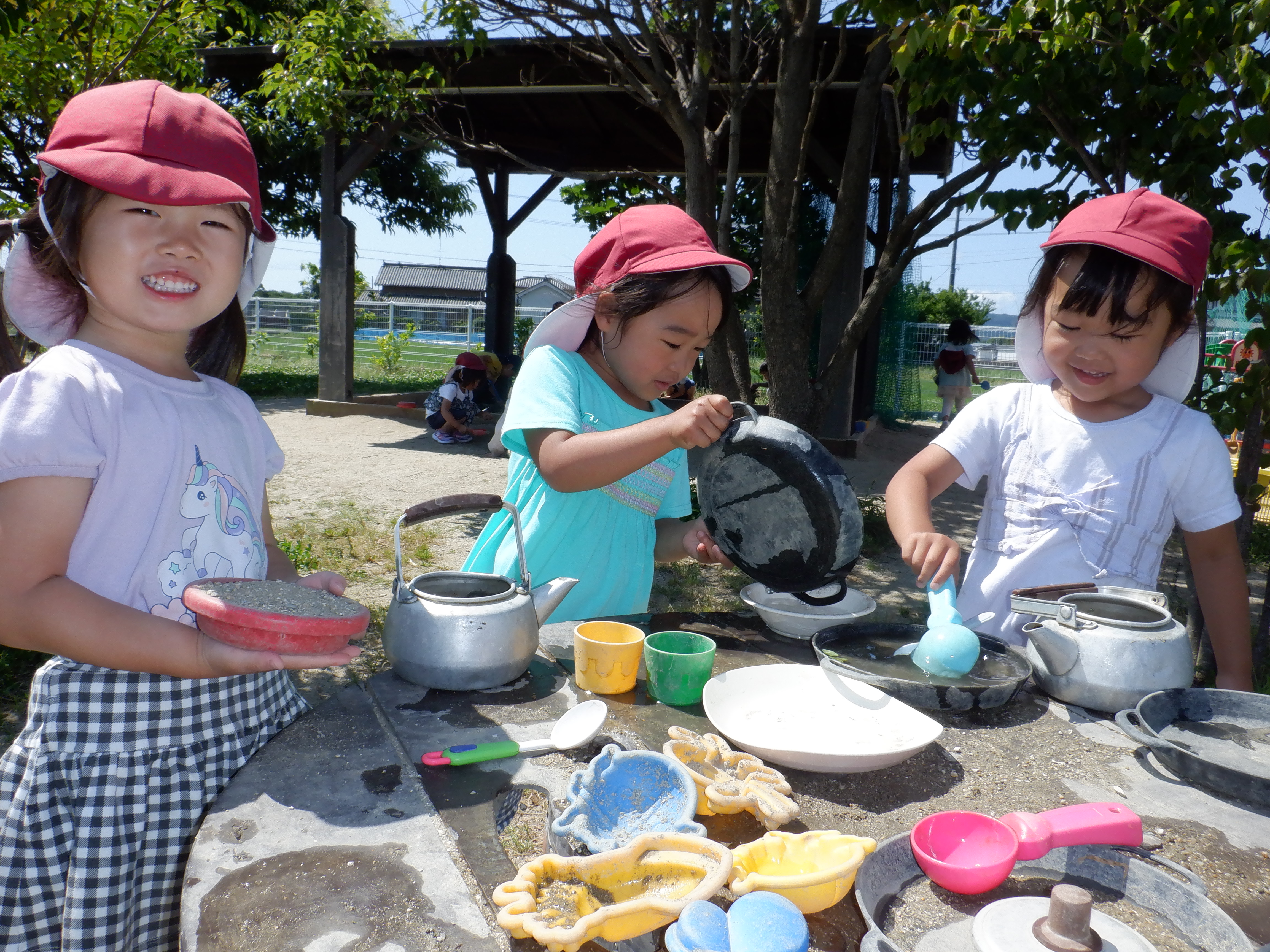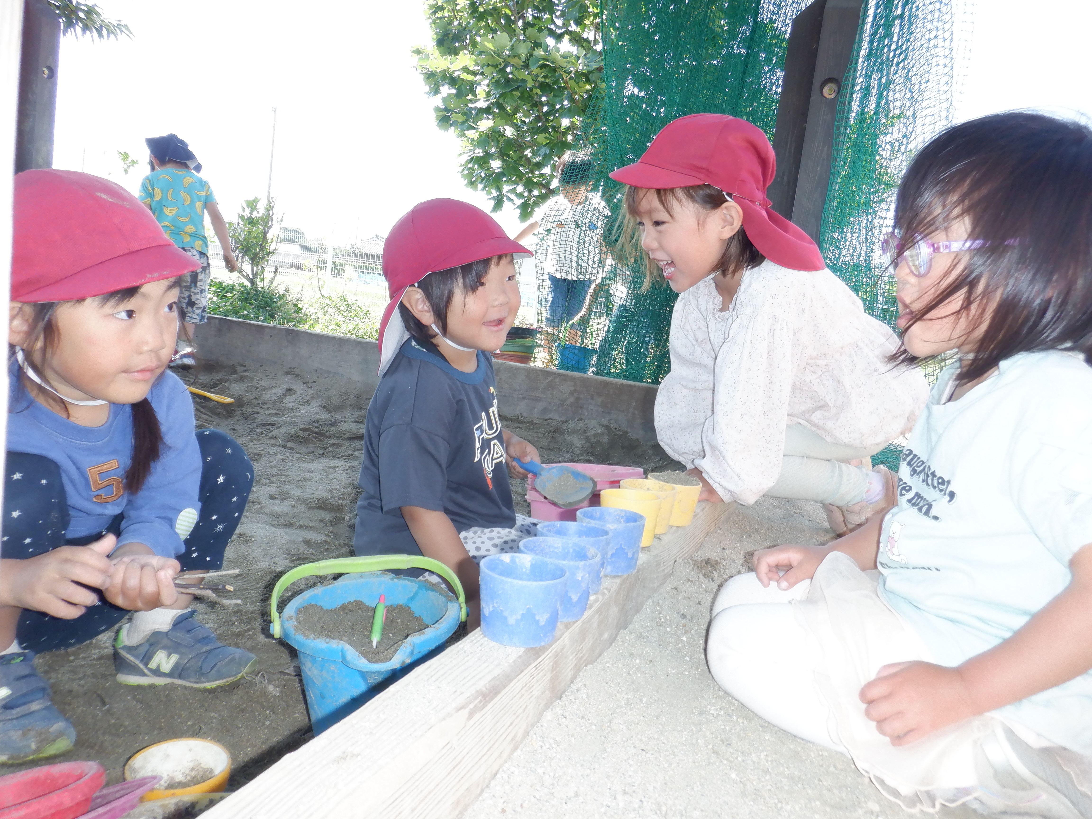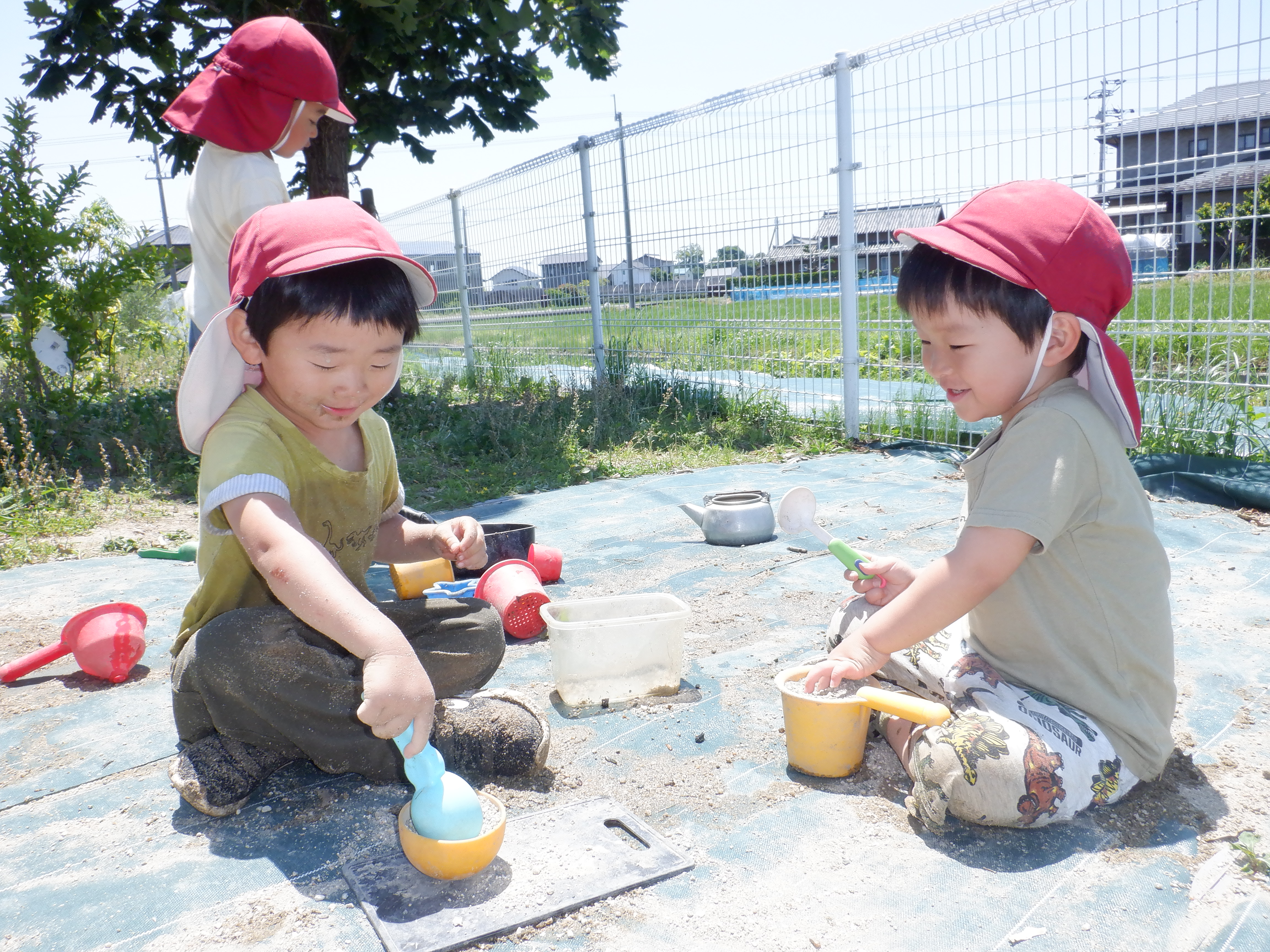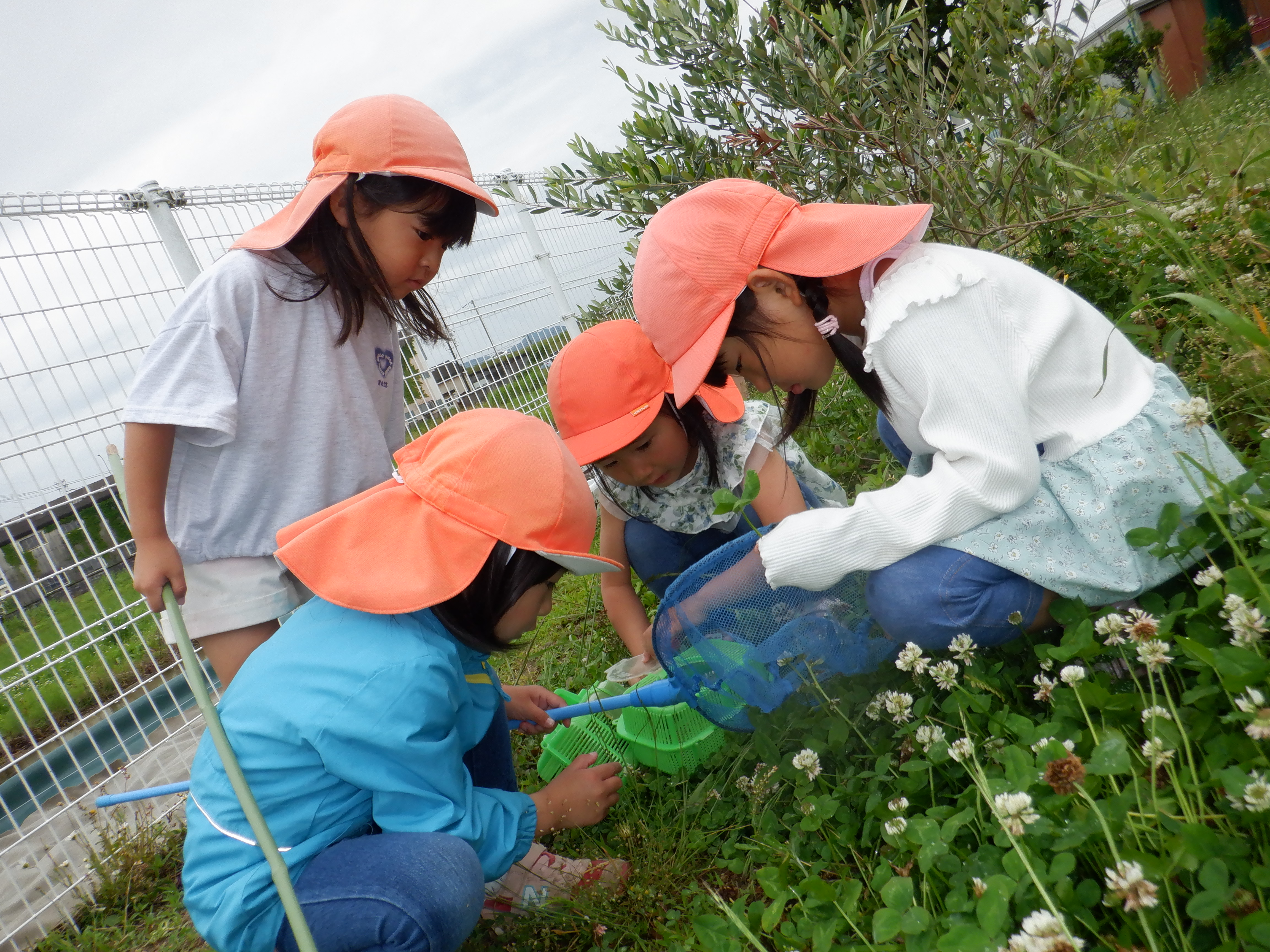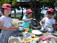 草花や砂を使ったり、やかんに水を入れてカップに注いでみたりしながらごっこ遊びをしたり、粘土質の土に水を混ぜて泥団子を作ってみたり…。防草シートの上では先週の遠足の体験から、ピクニックごっこでたくさんの料理を広げて遊ぶ姿もあります。最近は沢山の生き物が遊びにきてくれるようになり、チョウやバッタ、カミキリムシなどいろいろな虫を虫網や手で捕まえて観察しています。