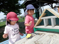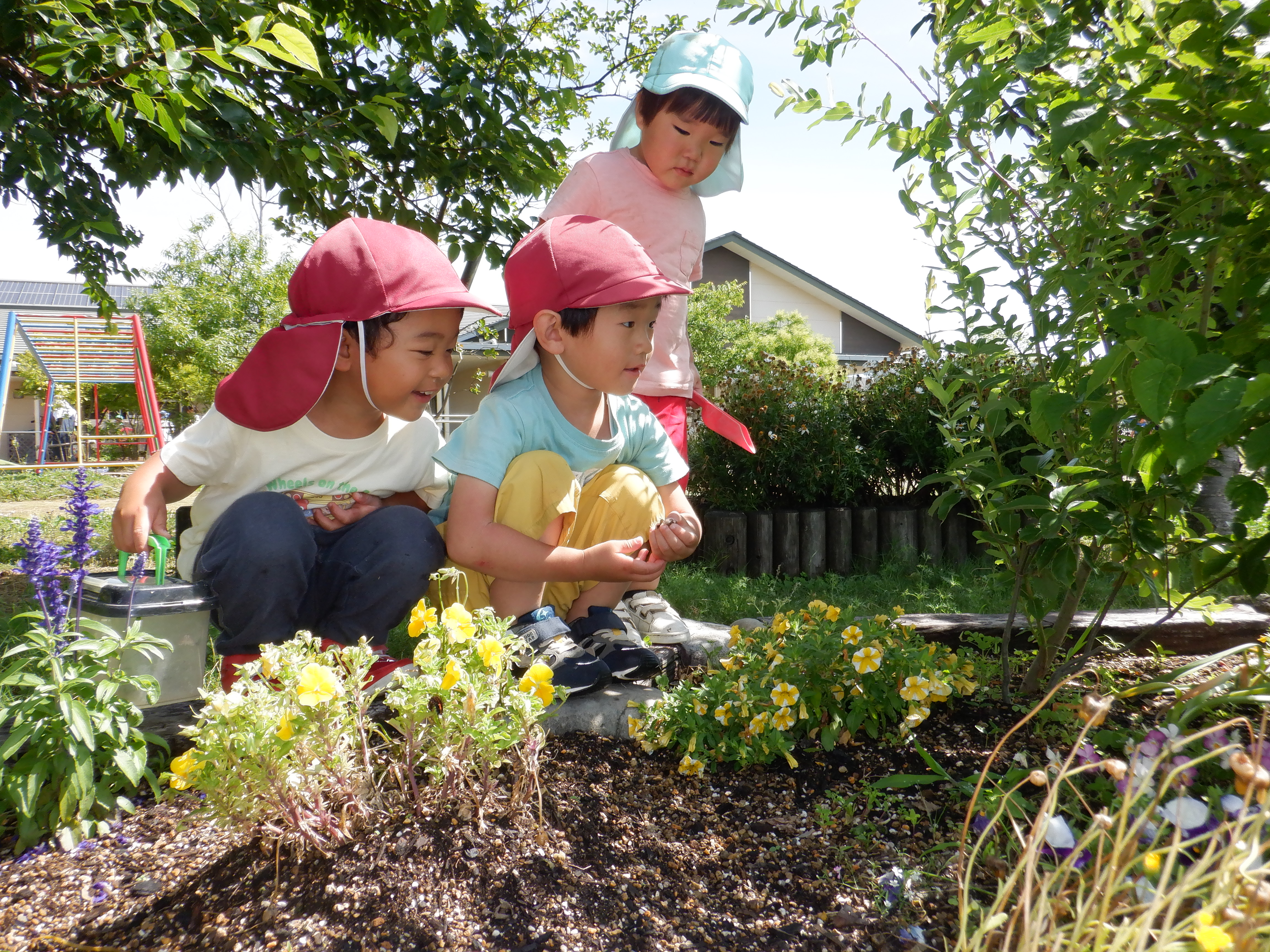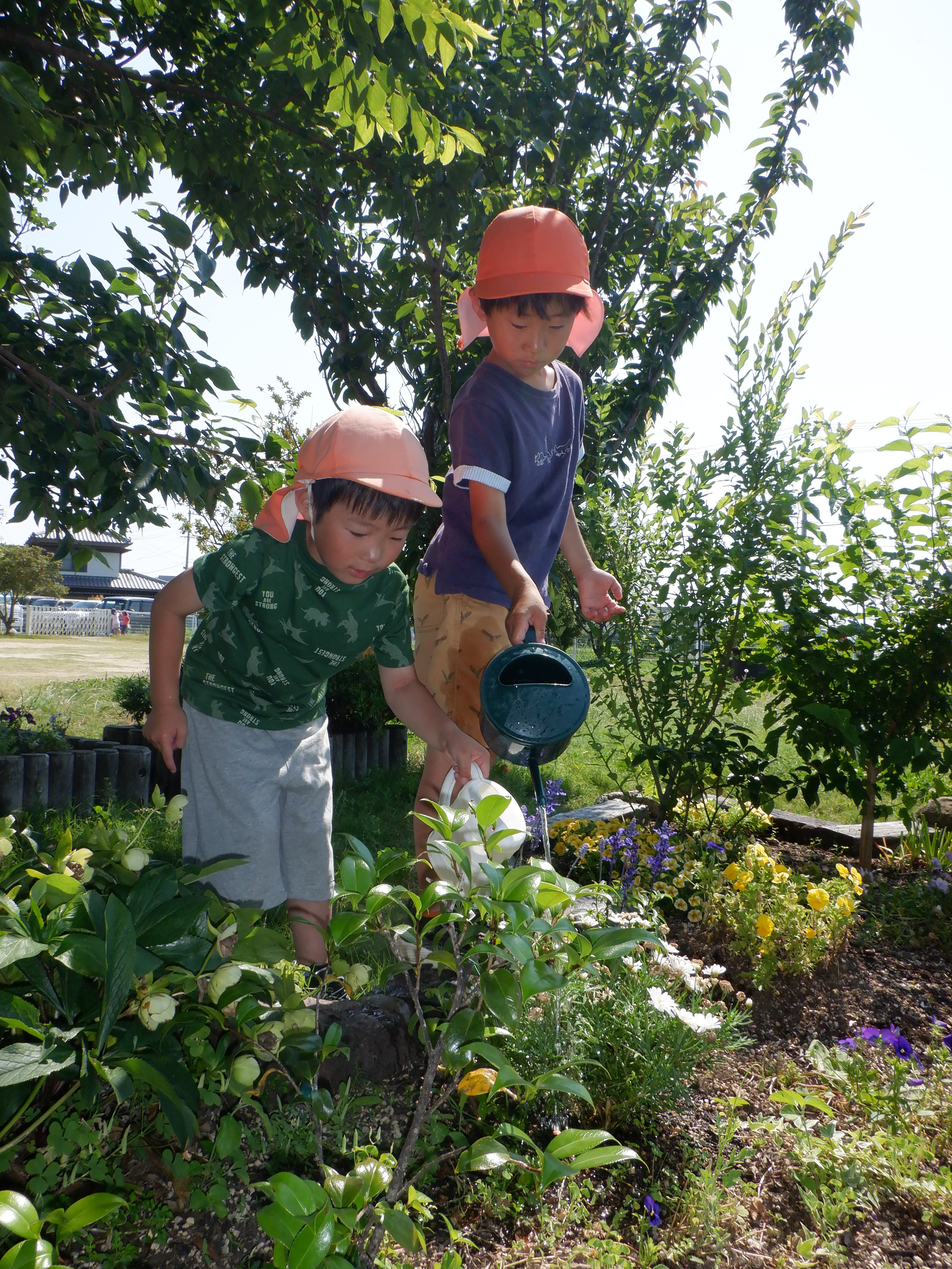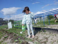 天気の良い日は、園庭に出るとまず水やり。夏野菜、サツマイモ、アサガオ、ひまわりとたくさん育てているので何回も水を入れに戻りながらも「おっきくなってきた」と嬉しそうに水やりをしています。