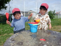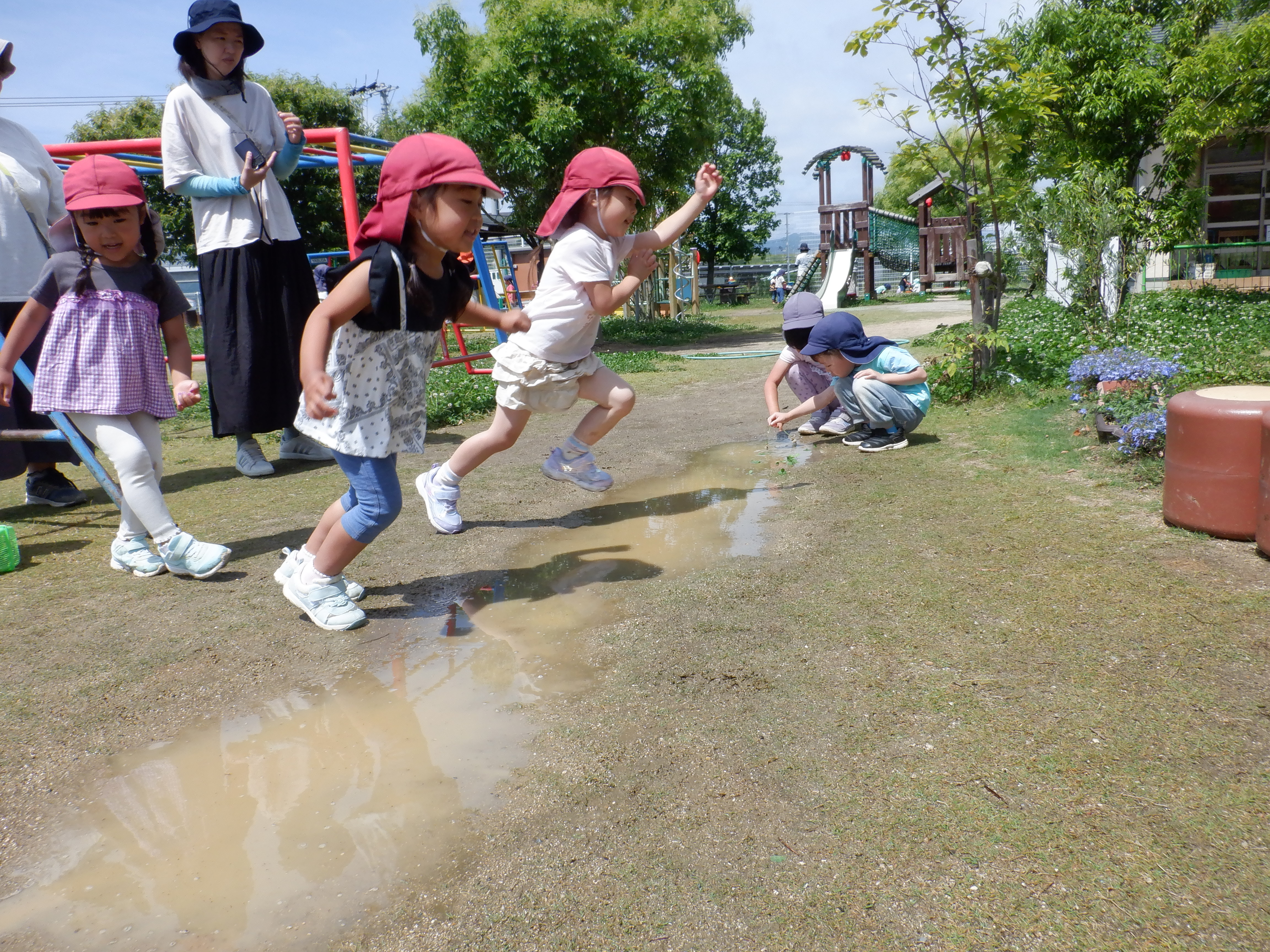 の園庭は楽しいことがいっぱい。水溜りを飛び越えることができるか挑戦してみたり、水たまりに手をつけて濡らし手形スタンプをしてみたり、水を集めて水遊びをしてみたり…いろんな遊びを見つけて遊んでいます。また、暑い日にはなかなか見つけることのできないカエルが雨上がりには雨上がりにはたくさん遊びに来てくれるので、いろんな草花に隠れていないか探しています。