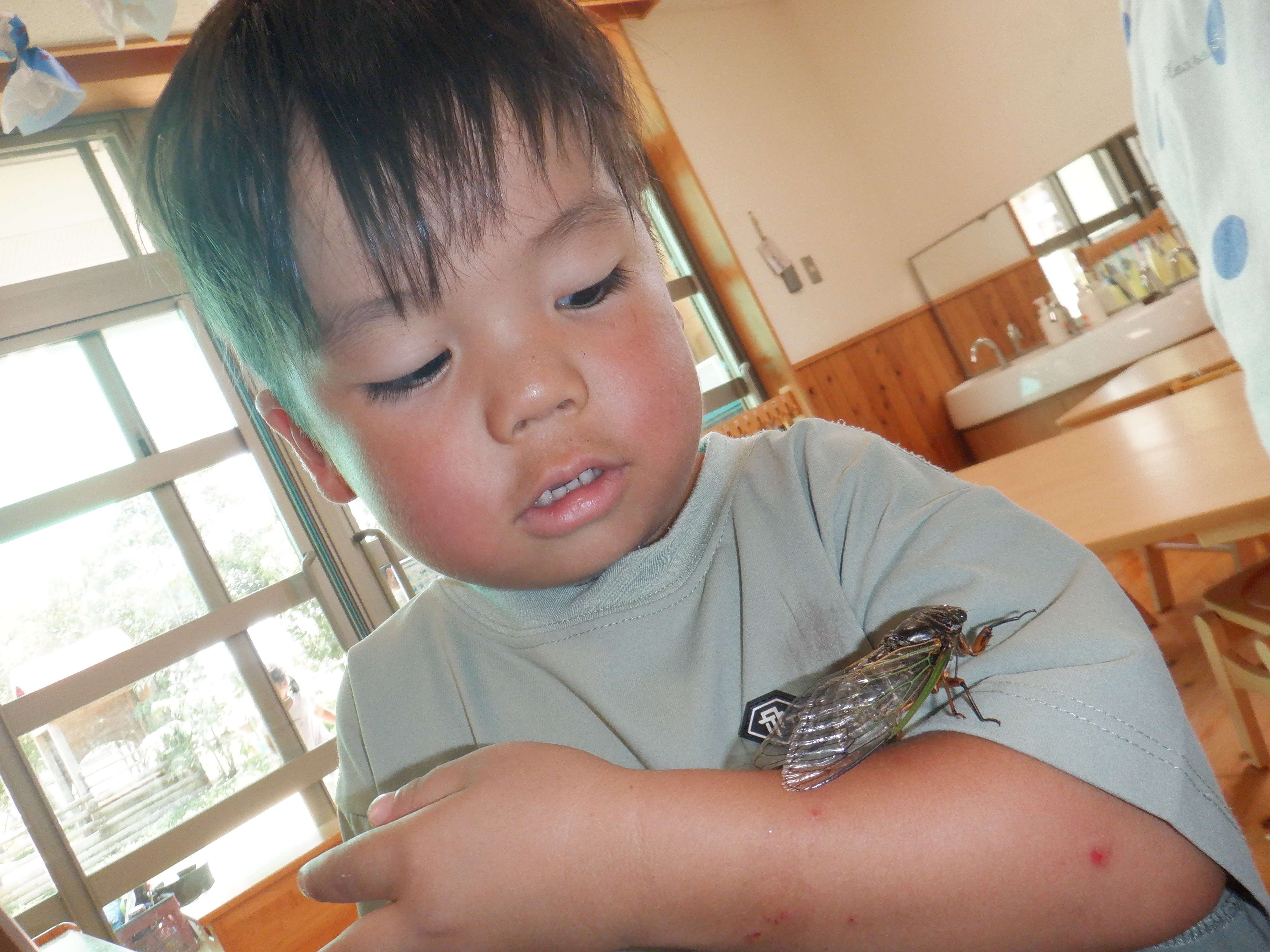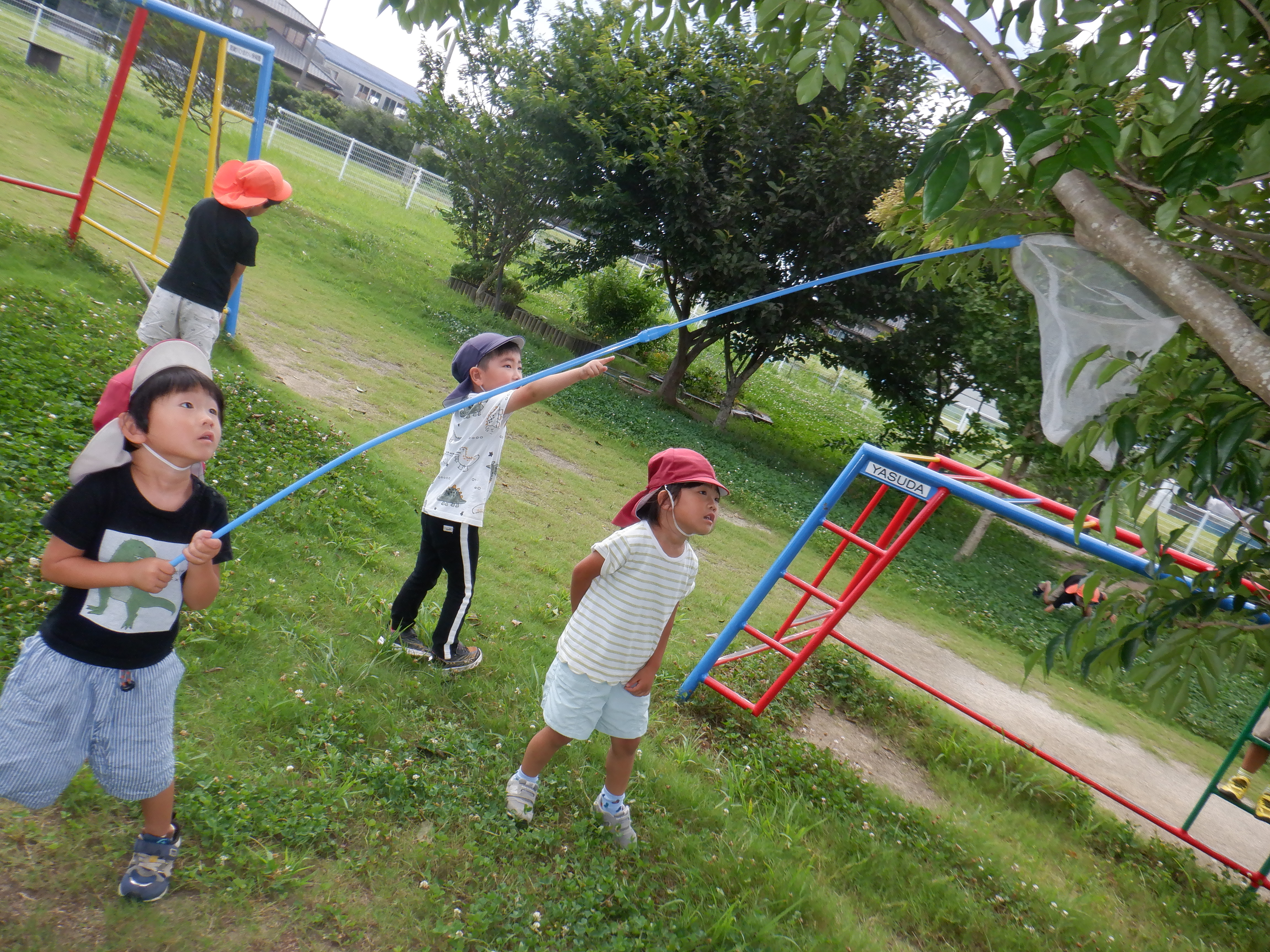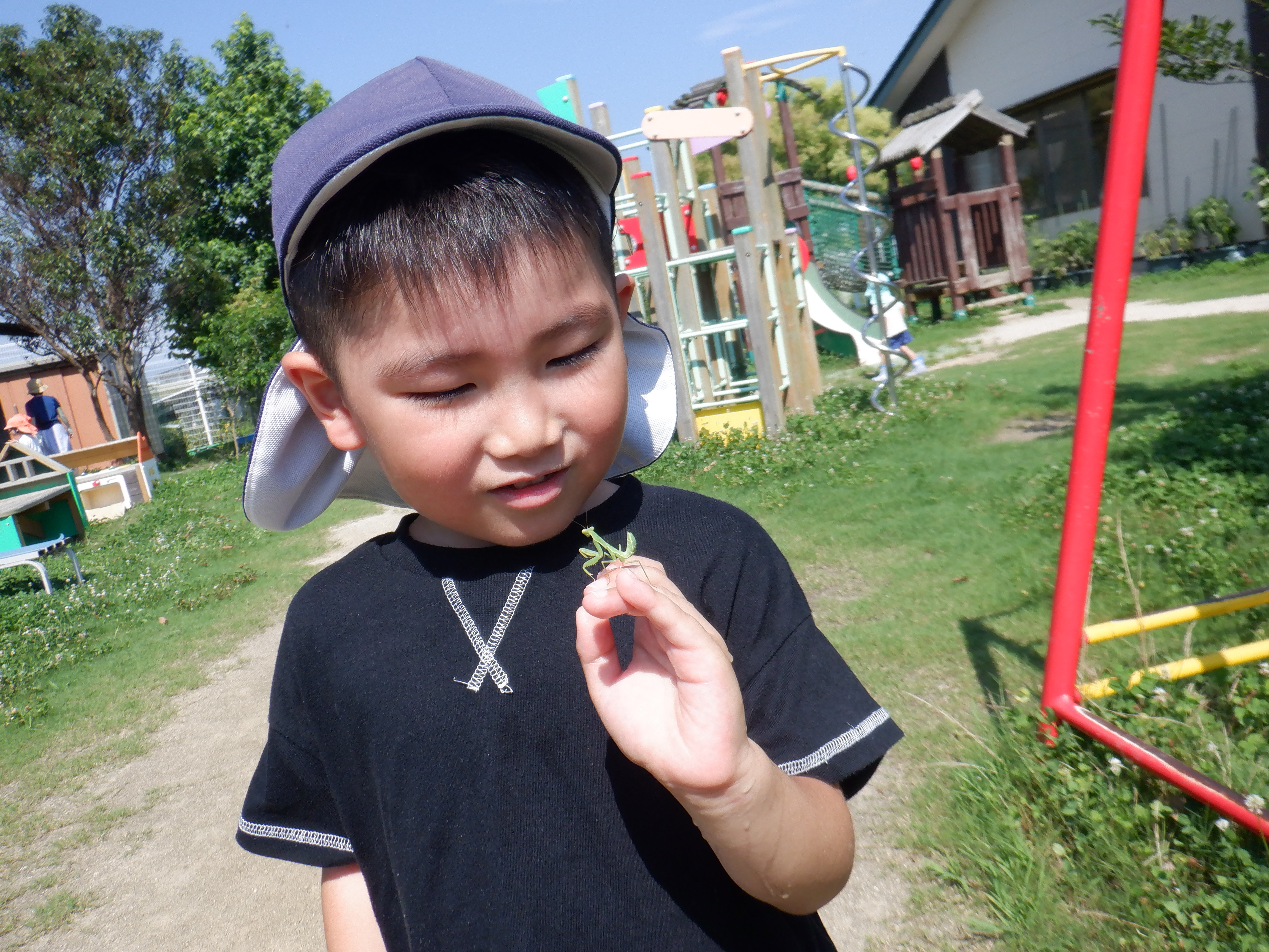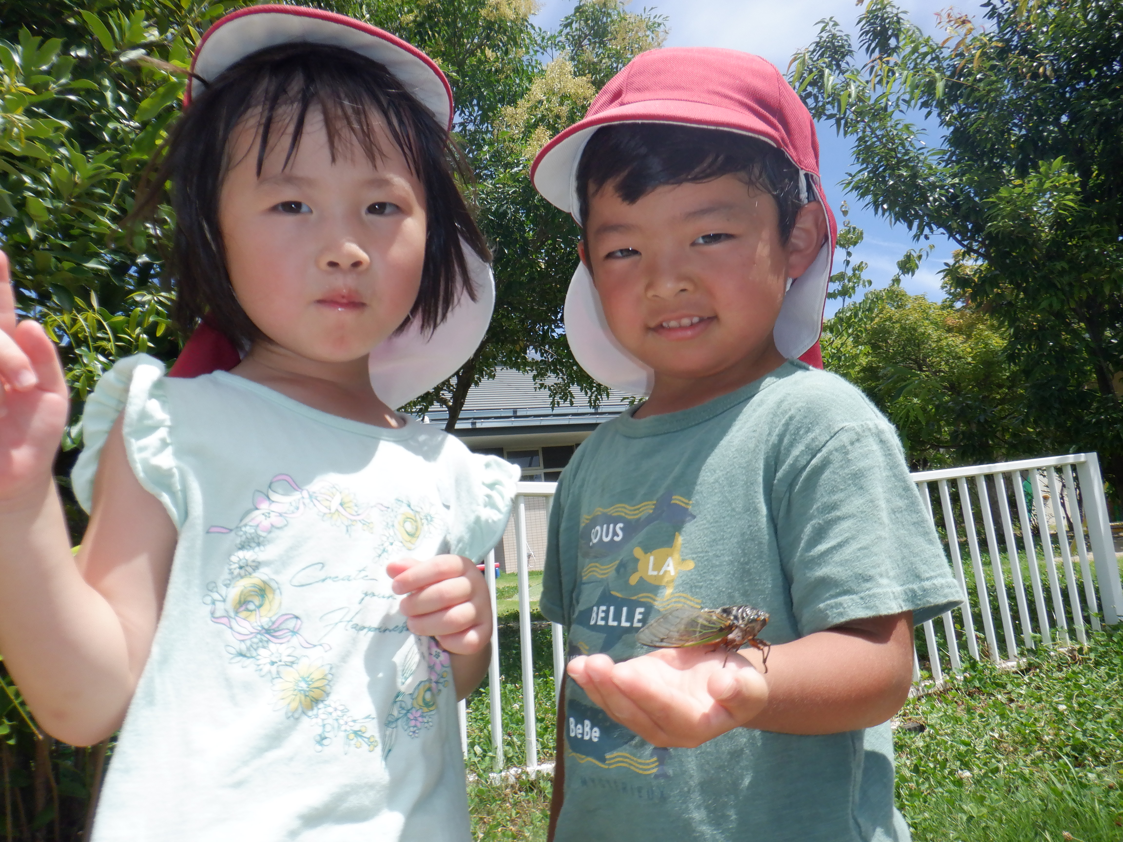 園庭には蝉の鳴き声やトンボが上空にたくさん来たりと楽しいことがいっぱい。夢中で虫捕り網を持って追いかけたり、蝉の声を頼りにそ〜っと探したりしています。捕まえると嬉しそうに見せに来てくれます。虫の友だちもいっぱいできたね。