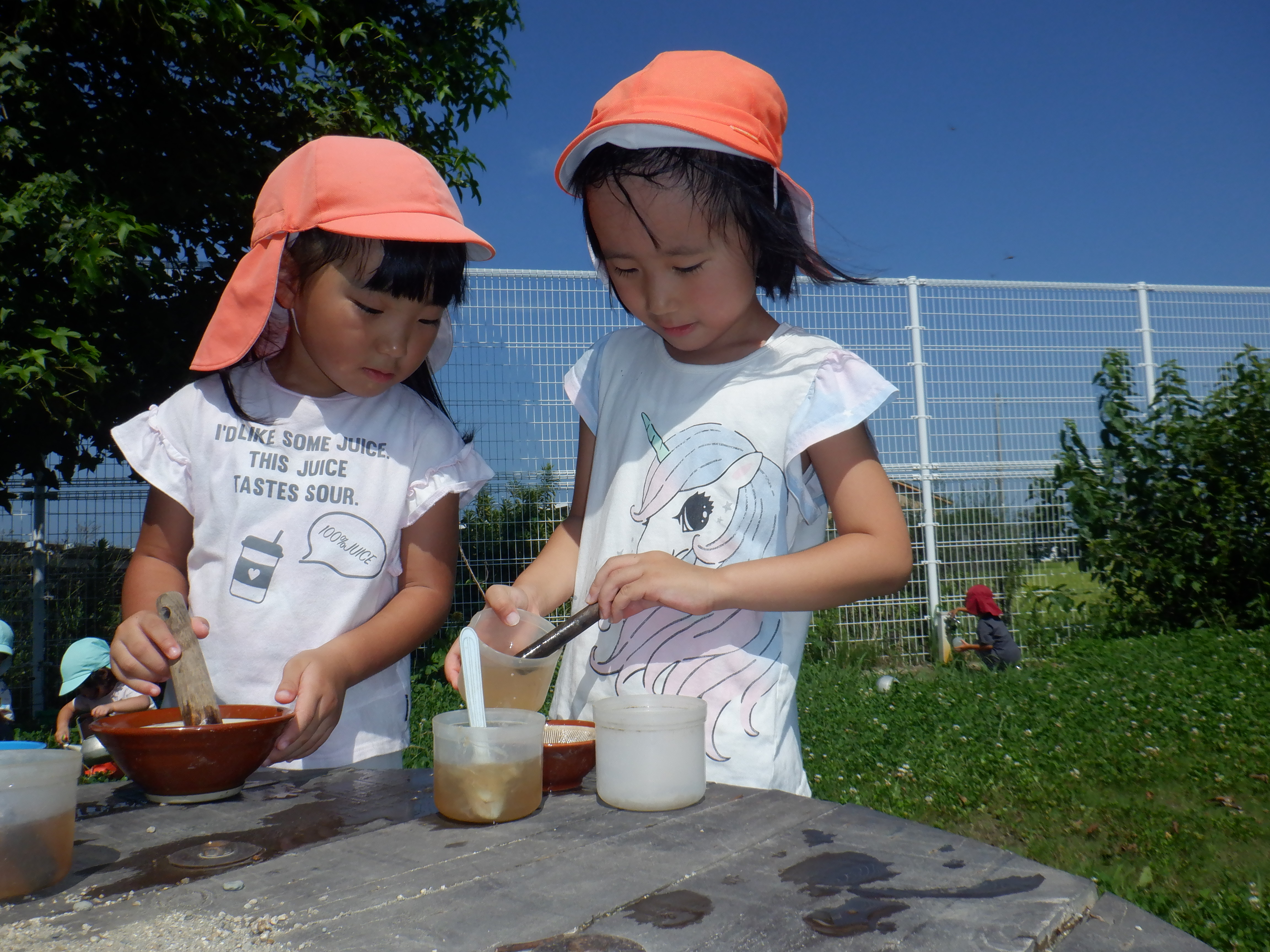 みんなで育てている朝顔がたくさん咲いたのですが、ほとんどの花が白色でした。「これジュースできんでぇ」と言いながらもすり鉢で擦ってみると水の色がだんだん薄橙色になっていき、「うわ〜、白色の花でももジュース出来た」と大喜びでした。白い花でも色水が出来ることに気づき、新たな発見をすることができました。