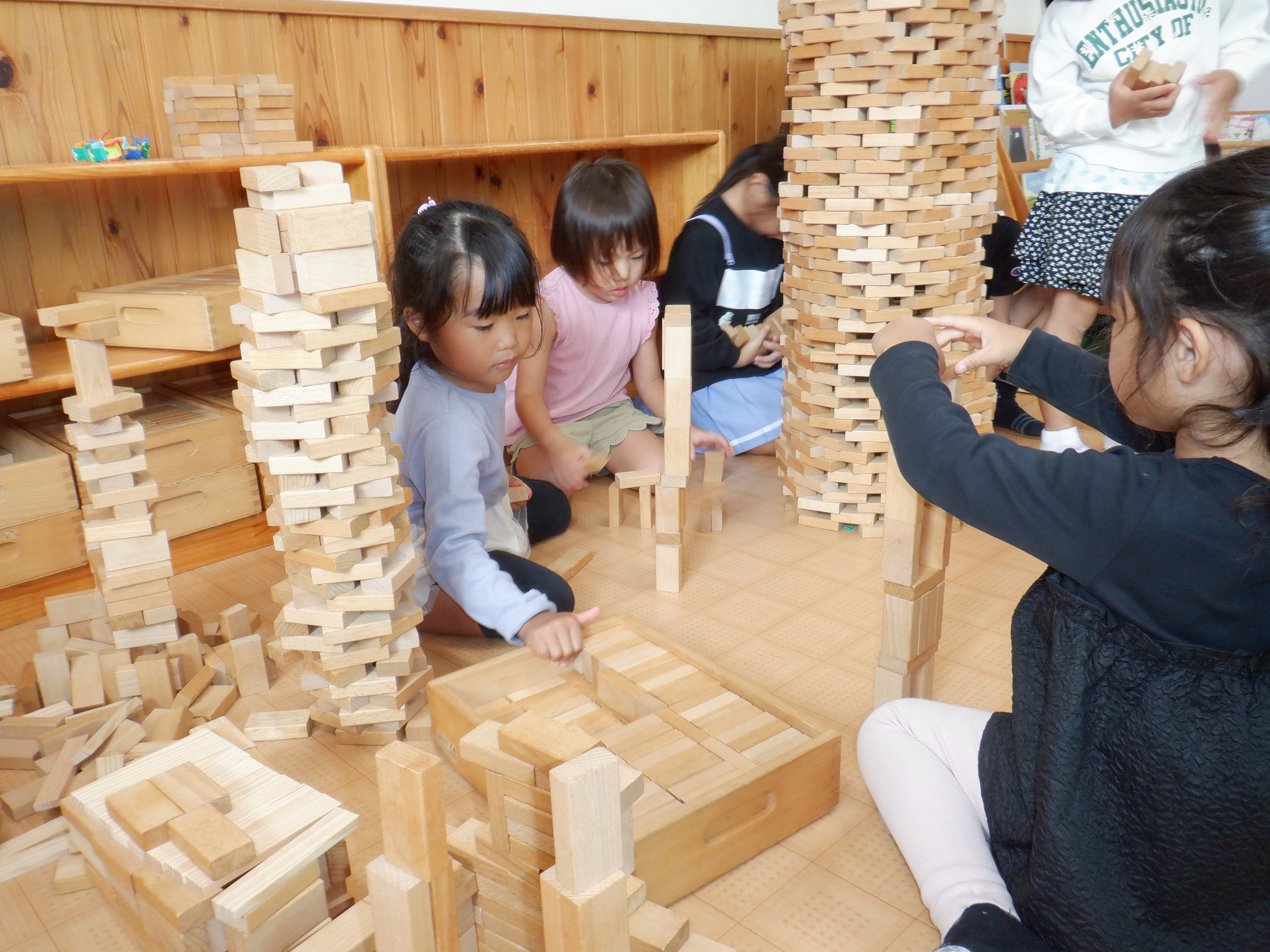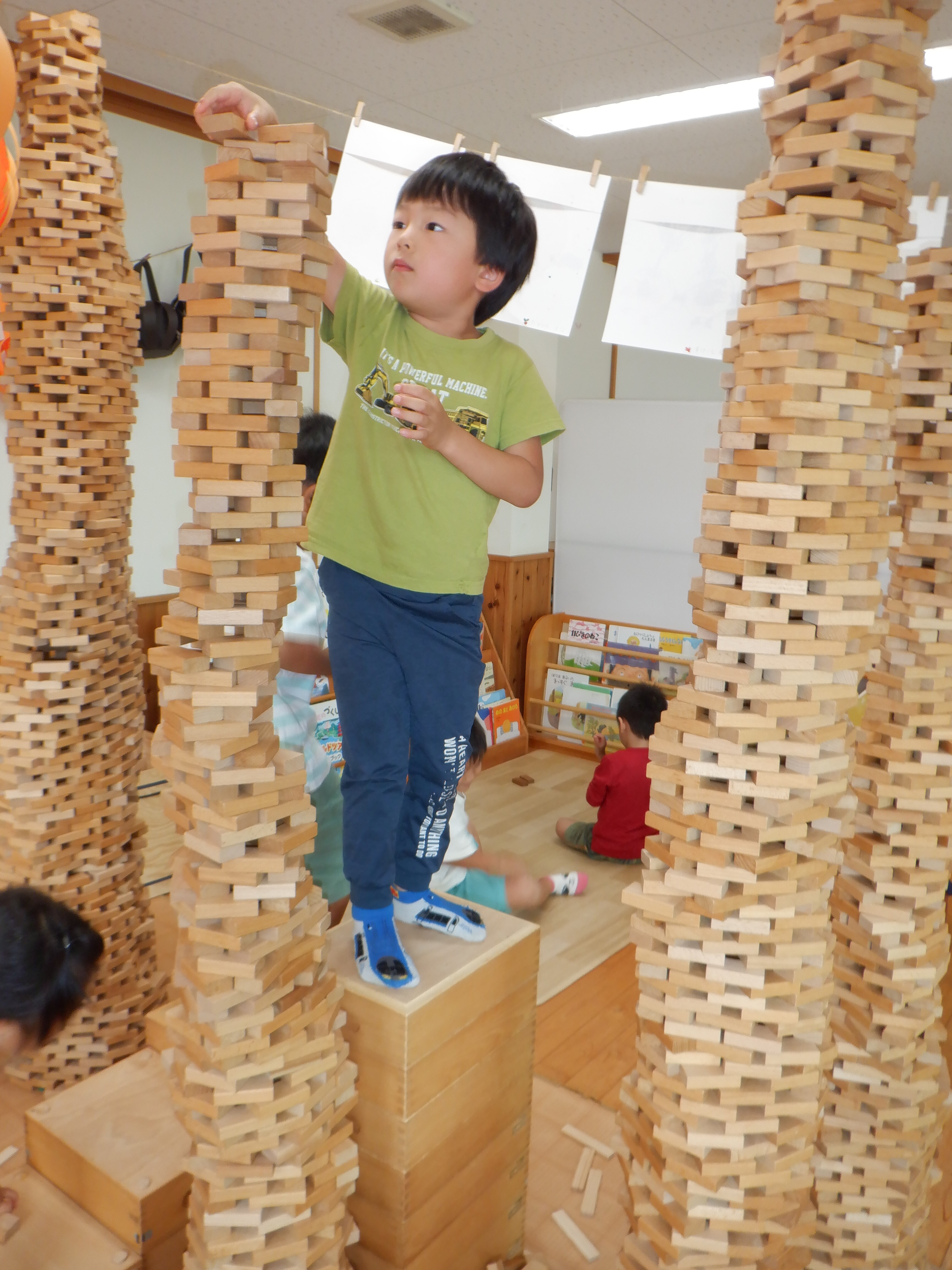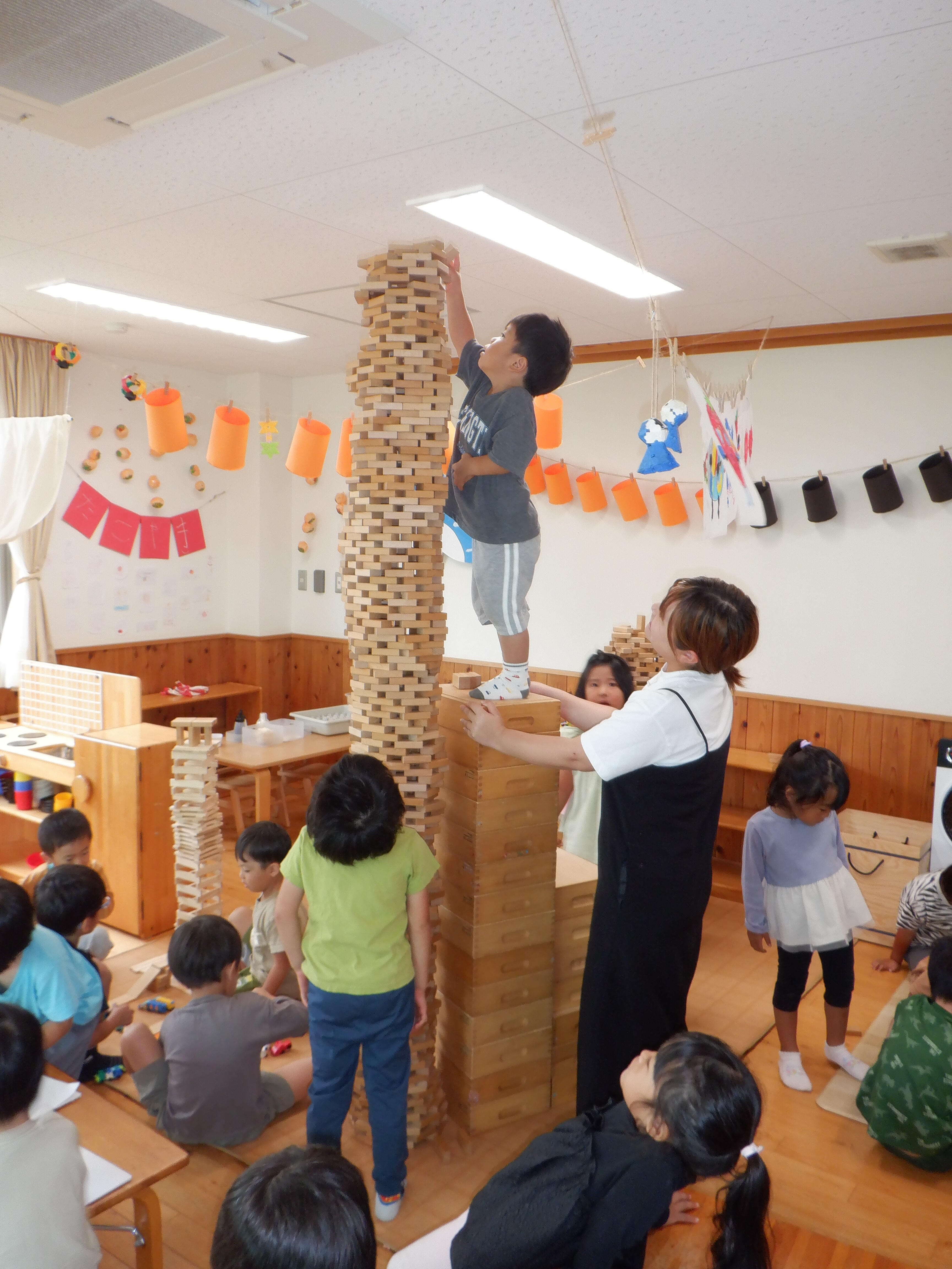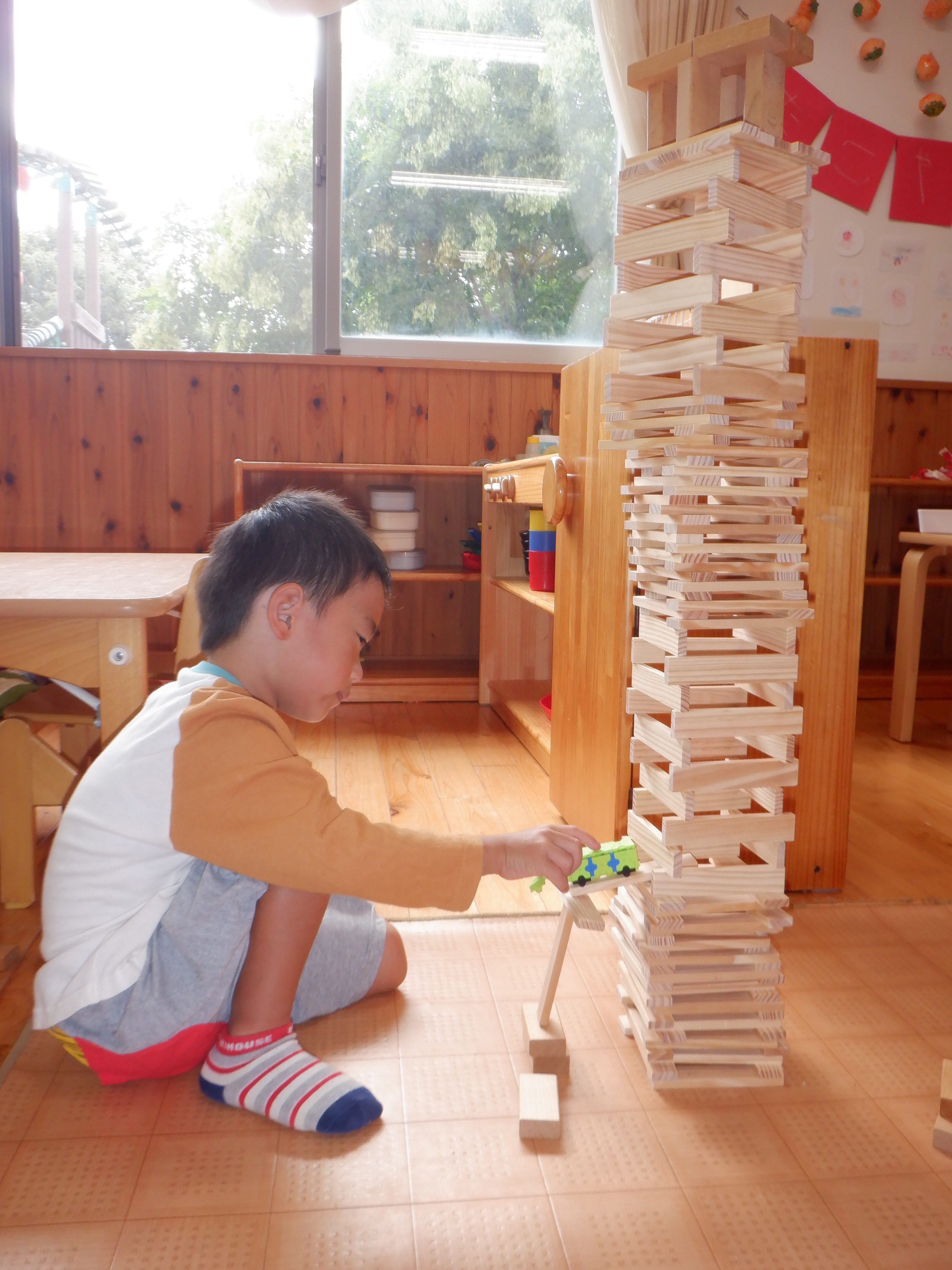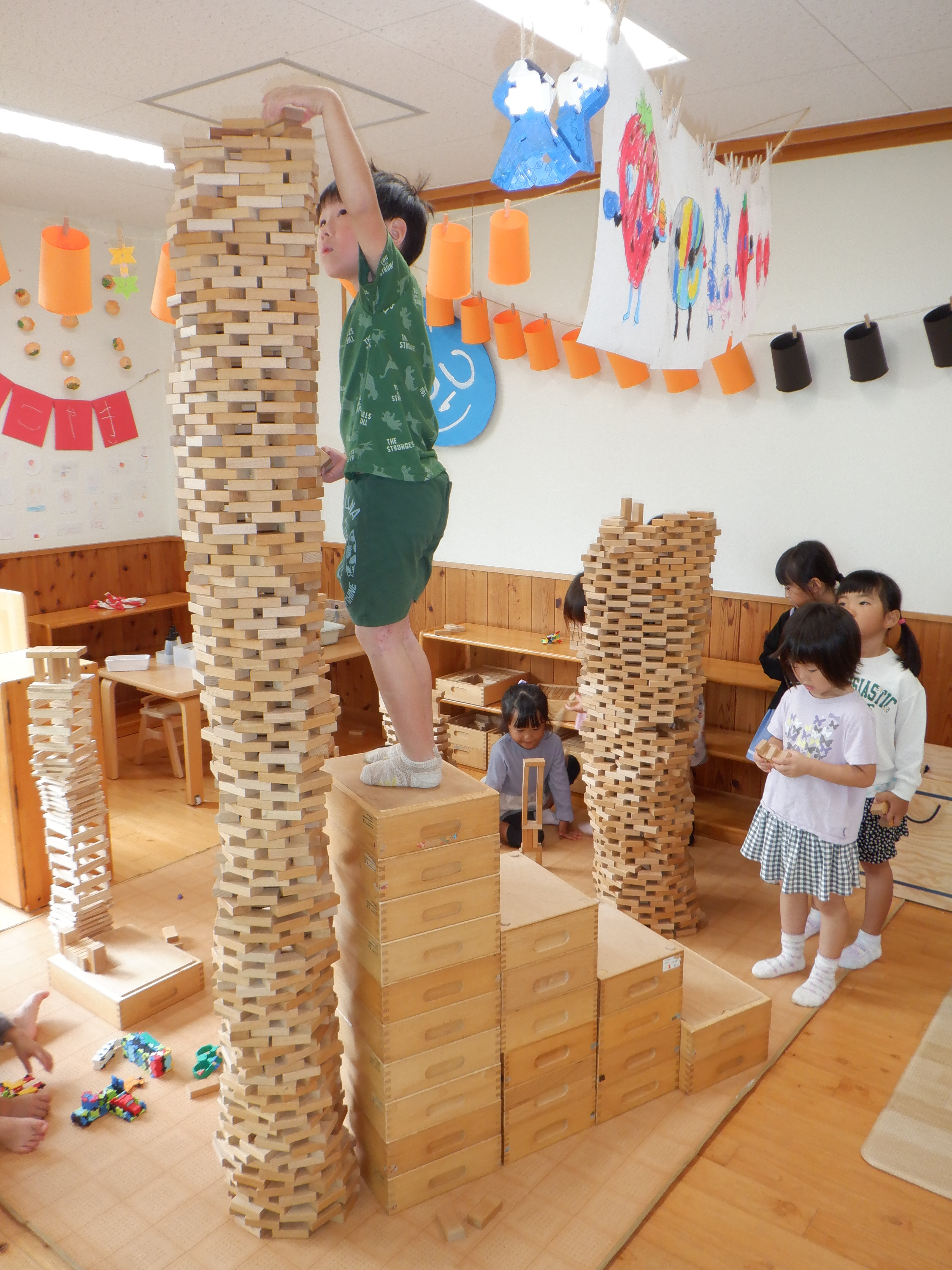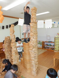 今けやき組の部屋は積み木コーナーが盛り上がっています。初めは高く積んでみようと始まったのですが、手が届かなくなり椅子に乗り積み、それでも届かなくなった時、以前は脚立を持ってきていたのですが、積み木でお風呂作りをした際に積み木の空箱を階段にしたことを思い出したようで、子どもたちが考えて階段を作ってさらに積み続け「天井までする!」と挑戦していました。そして天井までの高い塔が完成すると満足ではなく、「もう一個しよ」と、どんどん塔ができています。塔だけでなく、塔の合間に街を作ったり、カプラで作ってみたりとそれぞれの遊びを楽しんでいます。