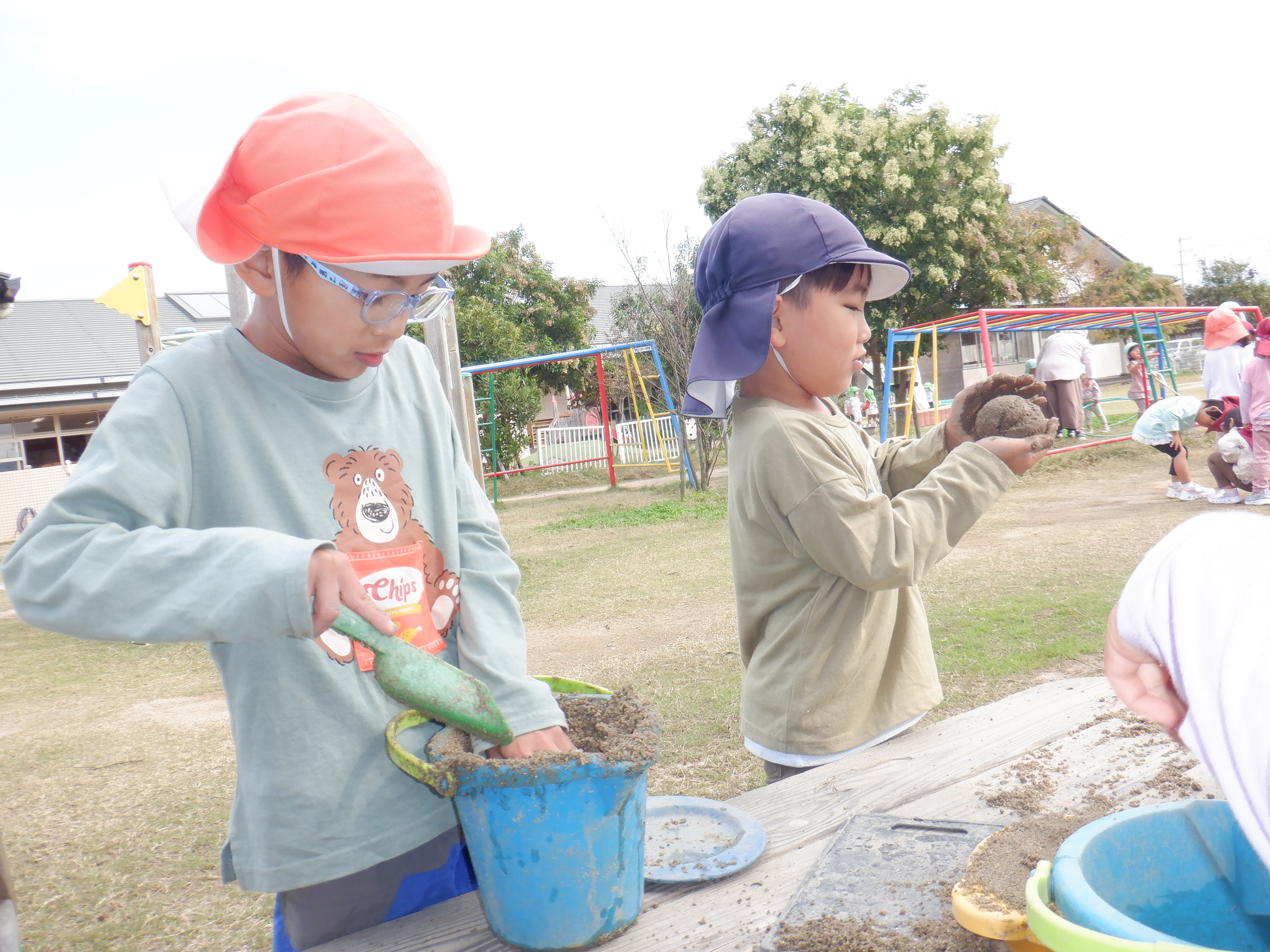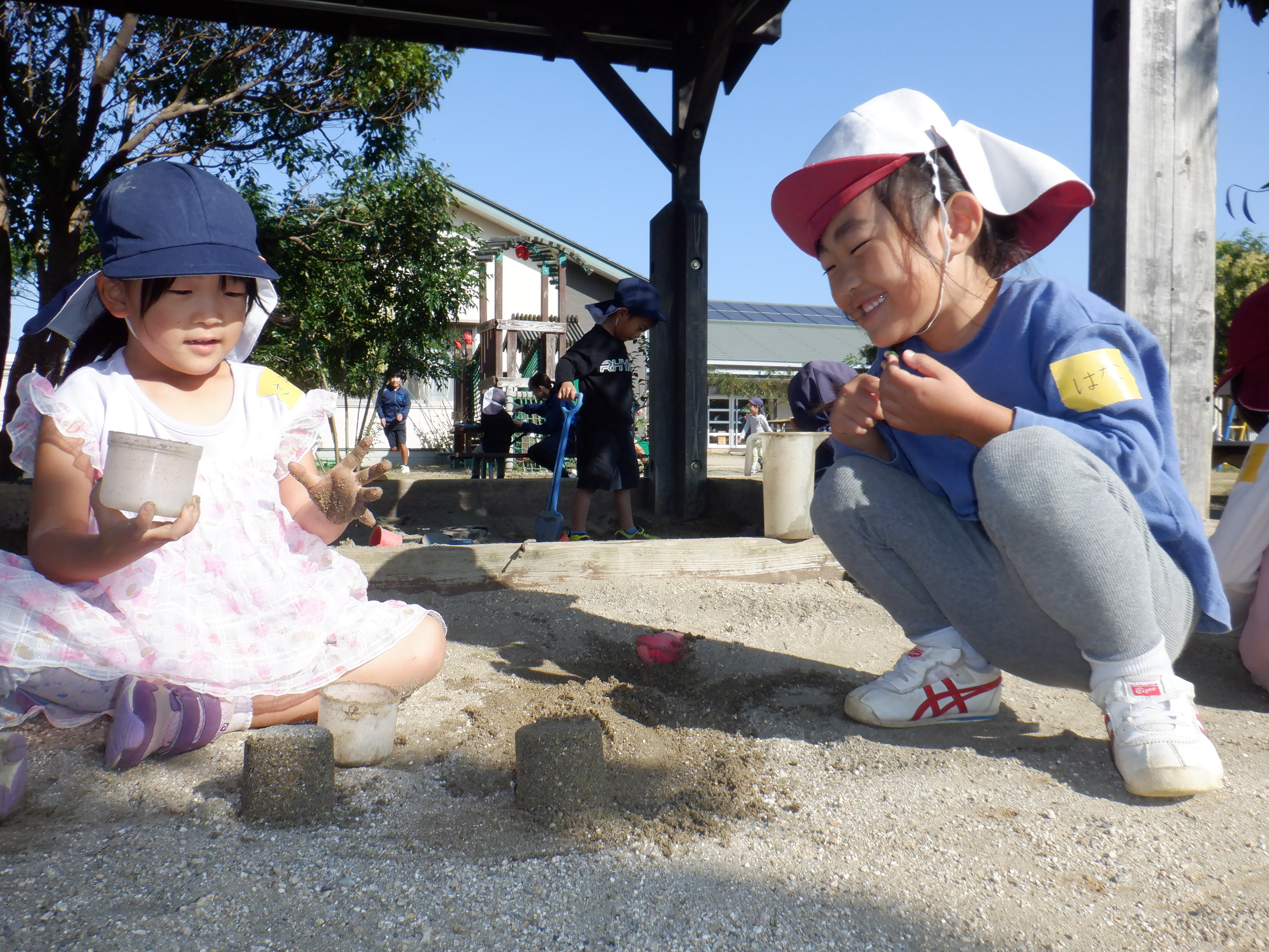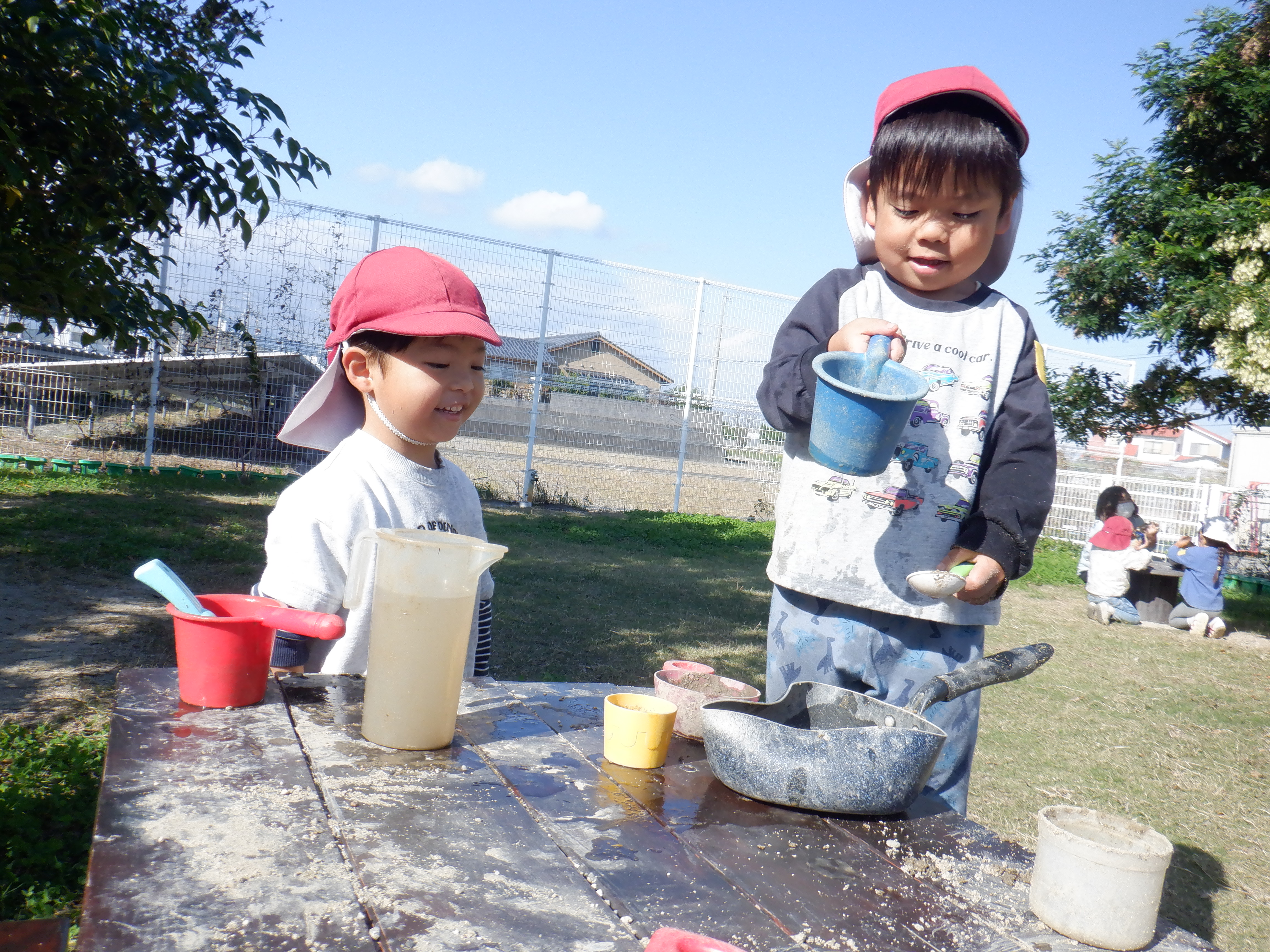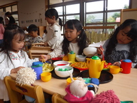 園庭ではお店屋さんをよくしています。お団子屋さんやケーキ屋さん、レストランなどいろんな店の店員さんになり、「何がいりますか?」と注文に合わせて作ってくれます。
