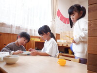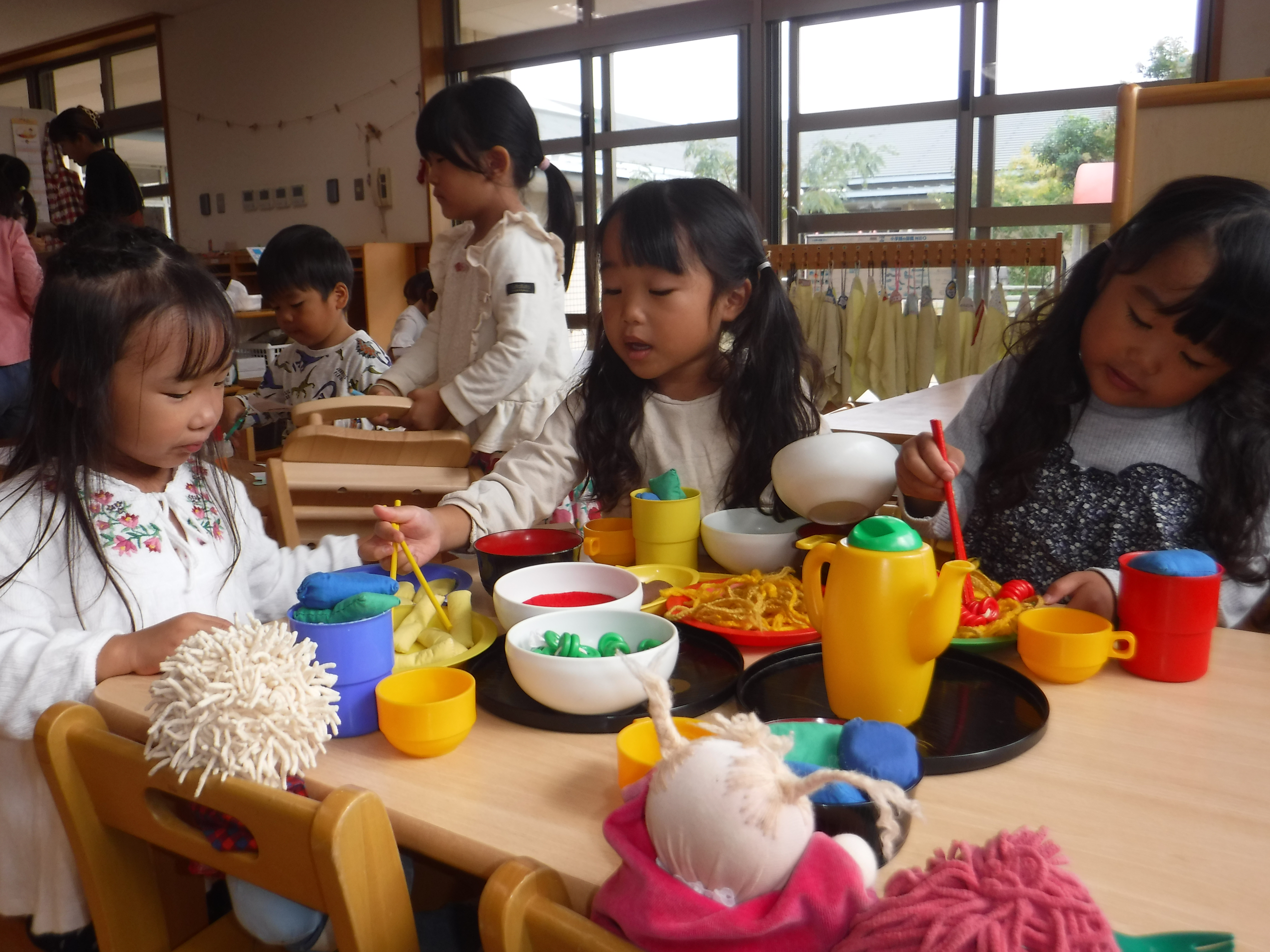 園庭でも部屋でもよくごっこ遊びをしています。部屋では、たくさんの料理を作り、子どもたちはお母さんやお兄ちゃんなど役になりきって遊んでいます。お世話人形の赤ちゃんたちも、一緒にご飯を食べたり服を着替えさせてあげたりとお世話をしてくれています。