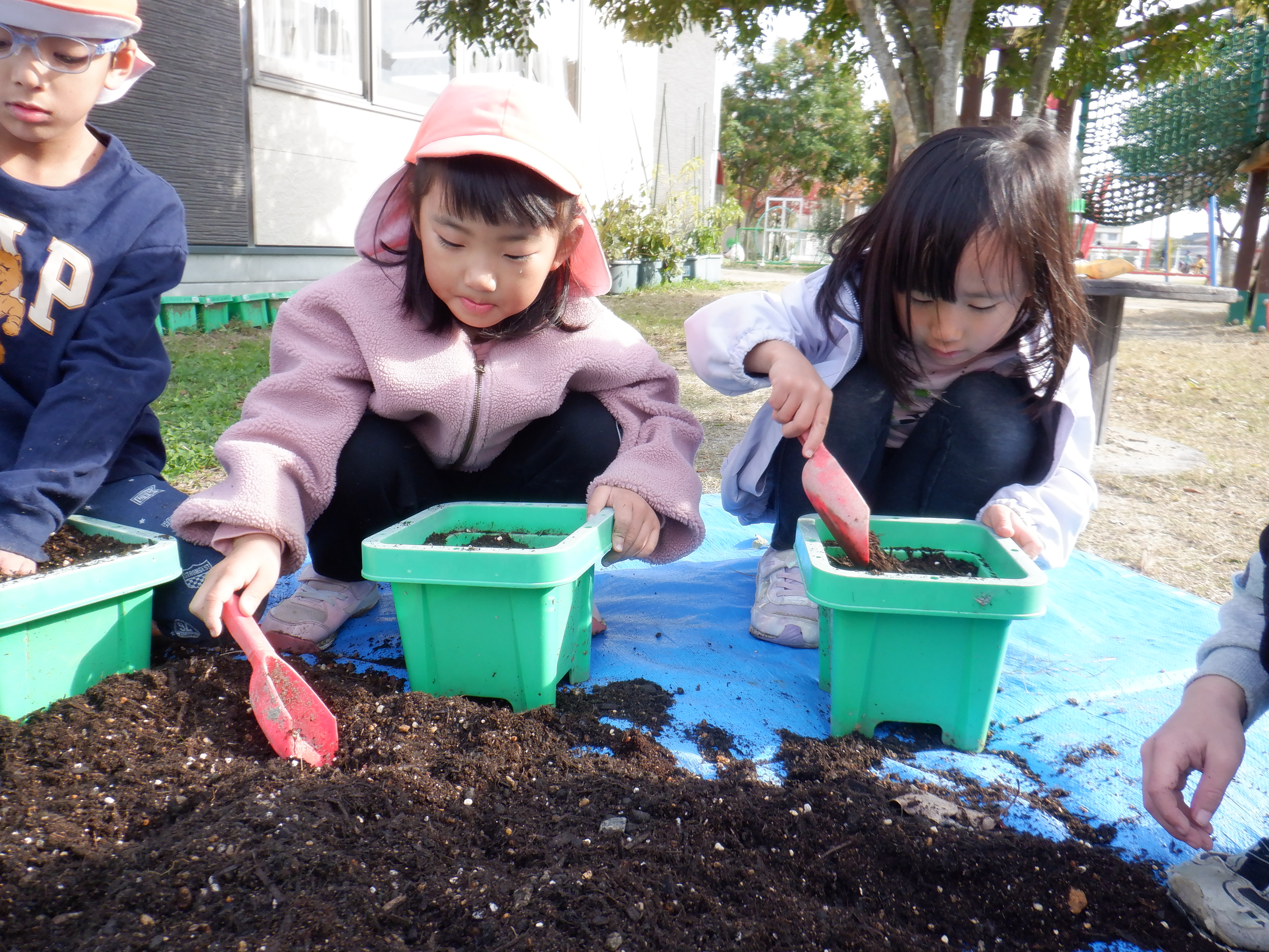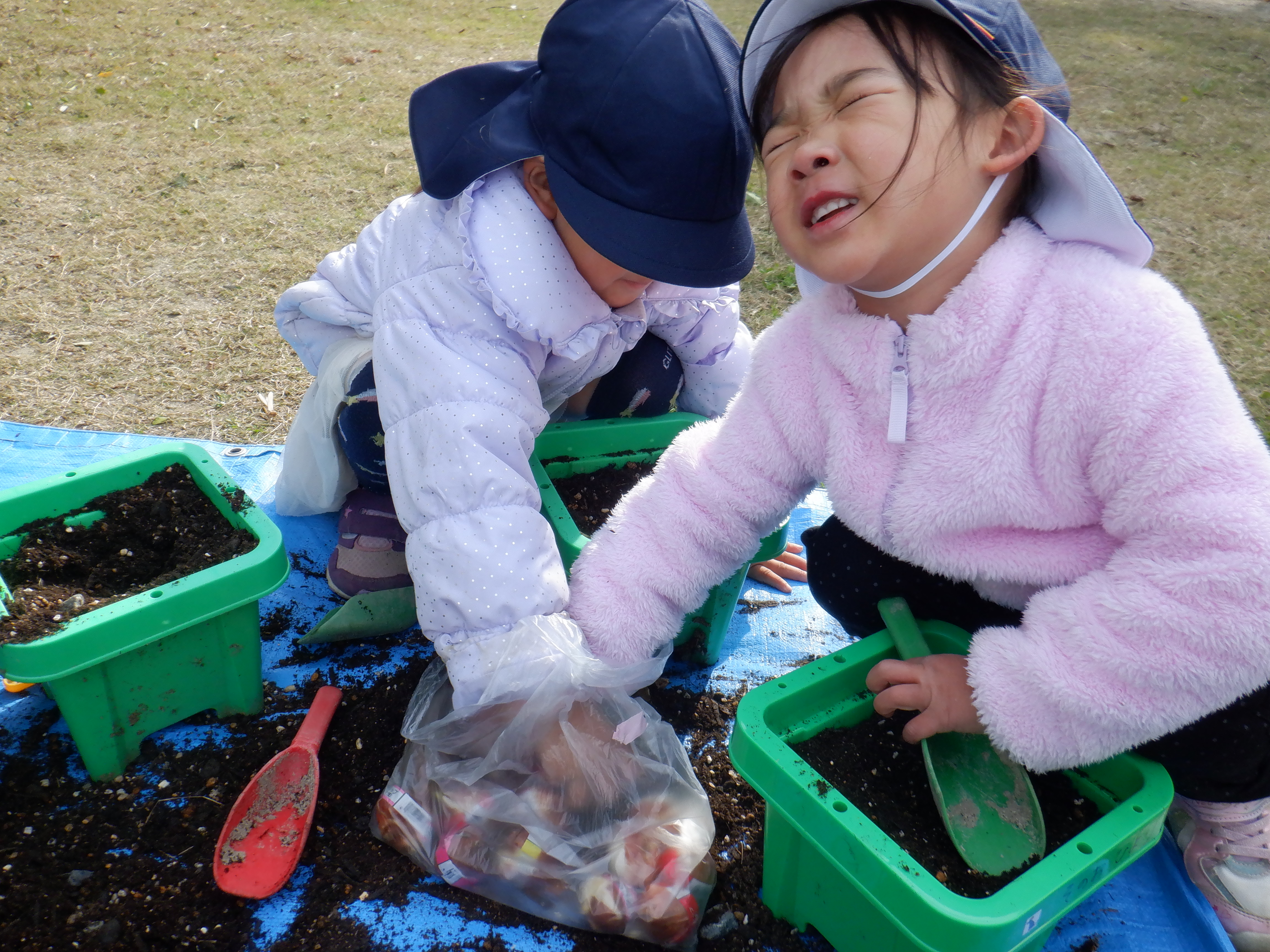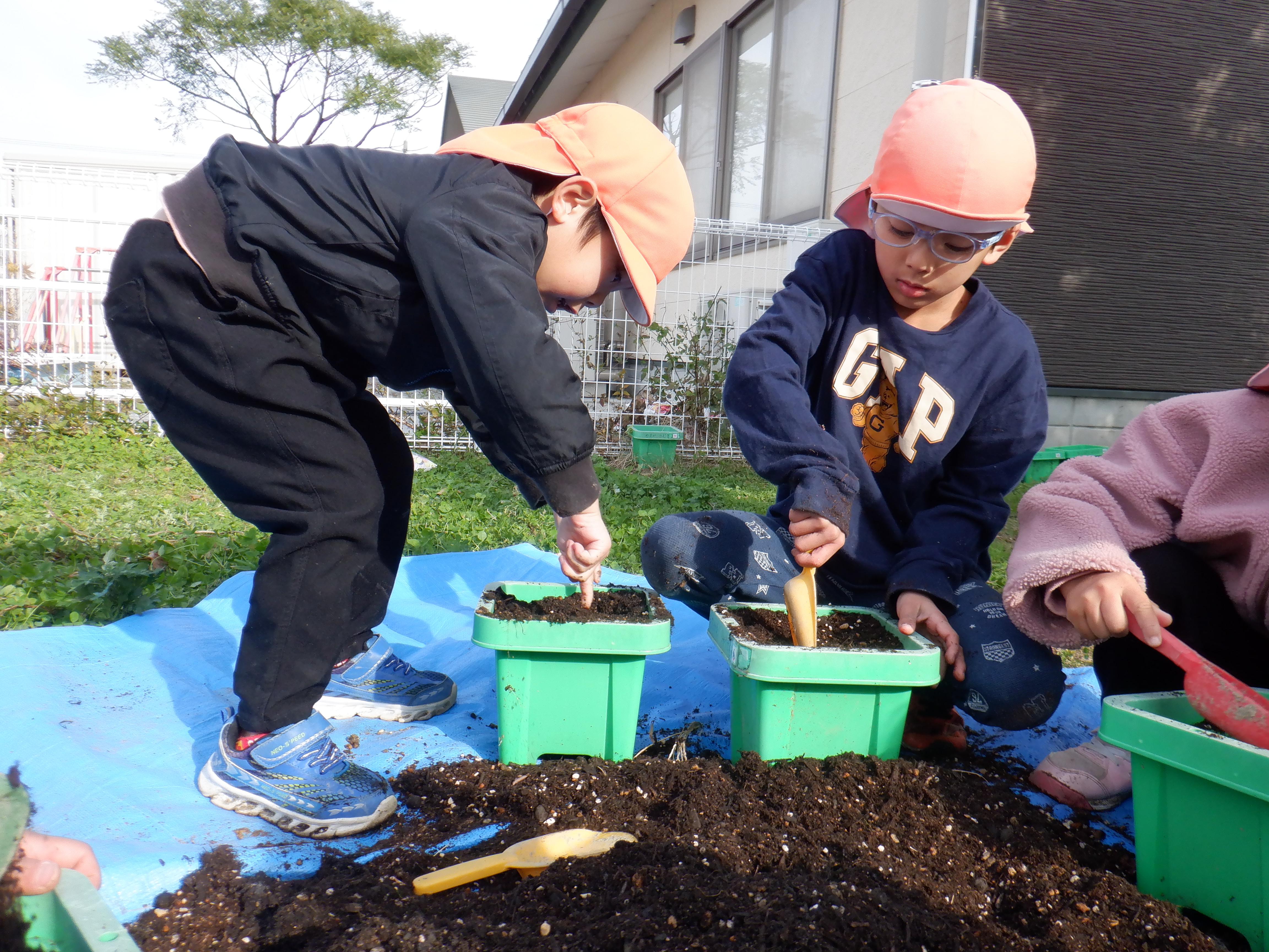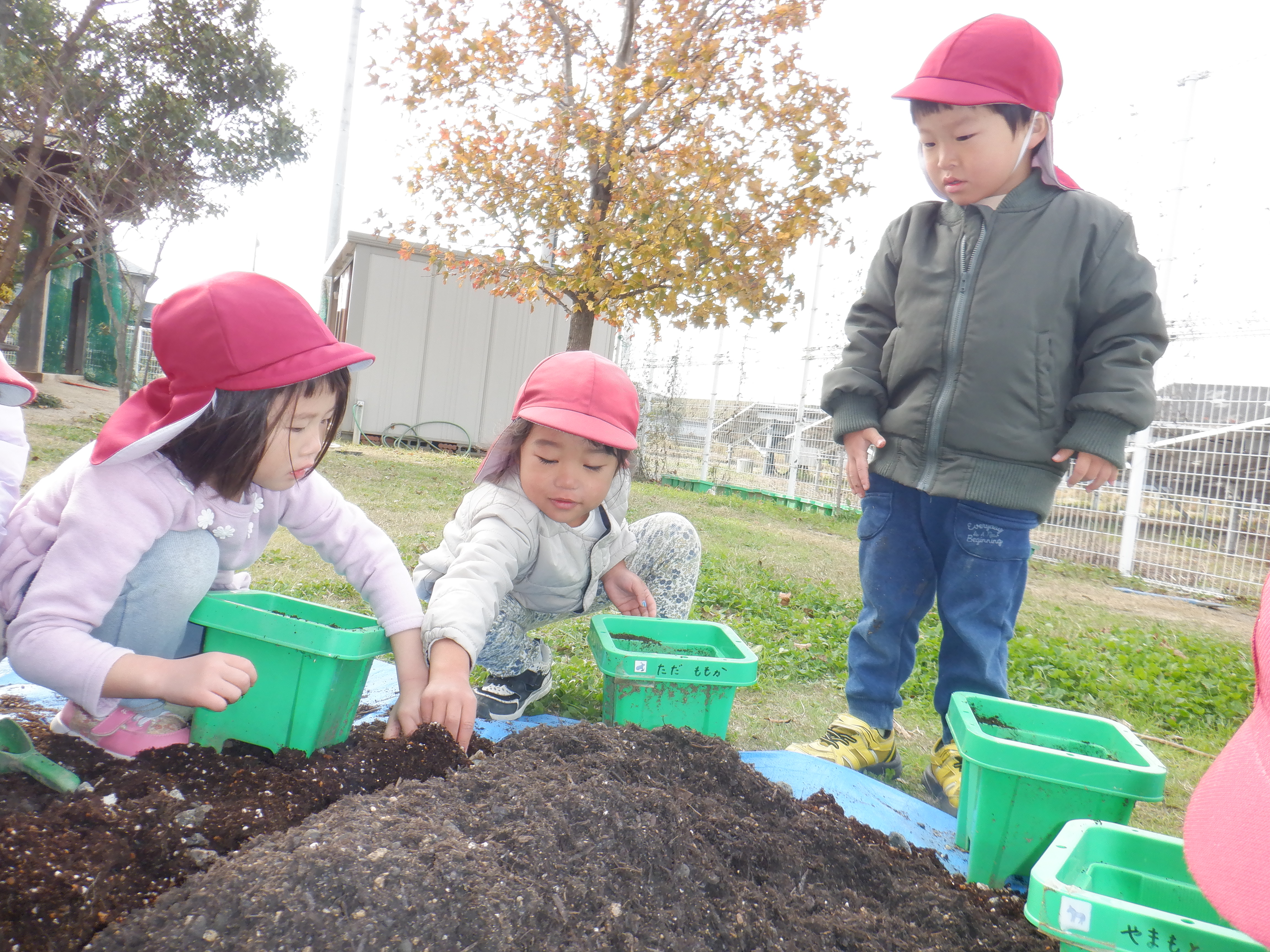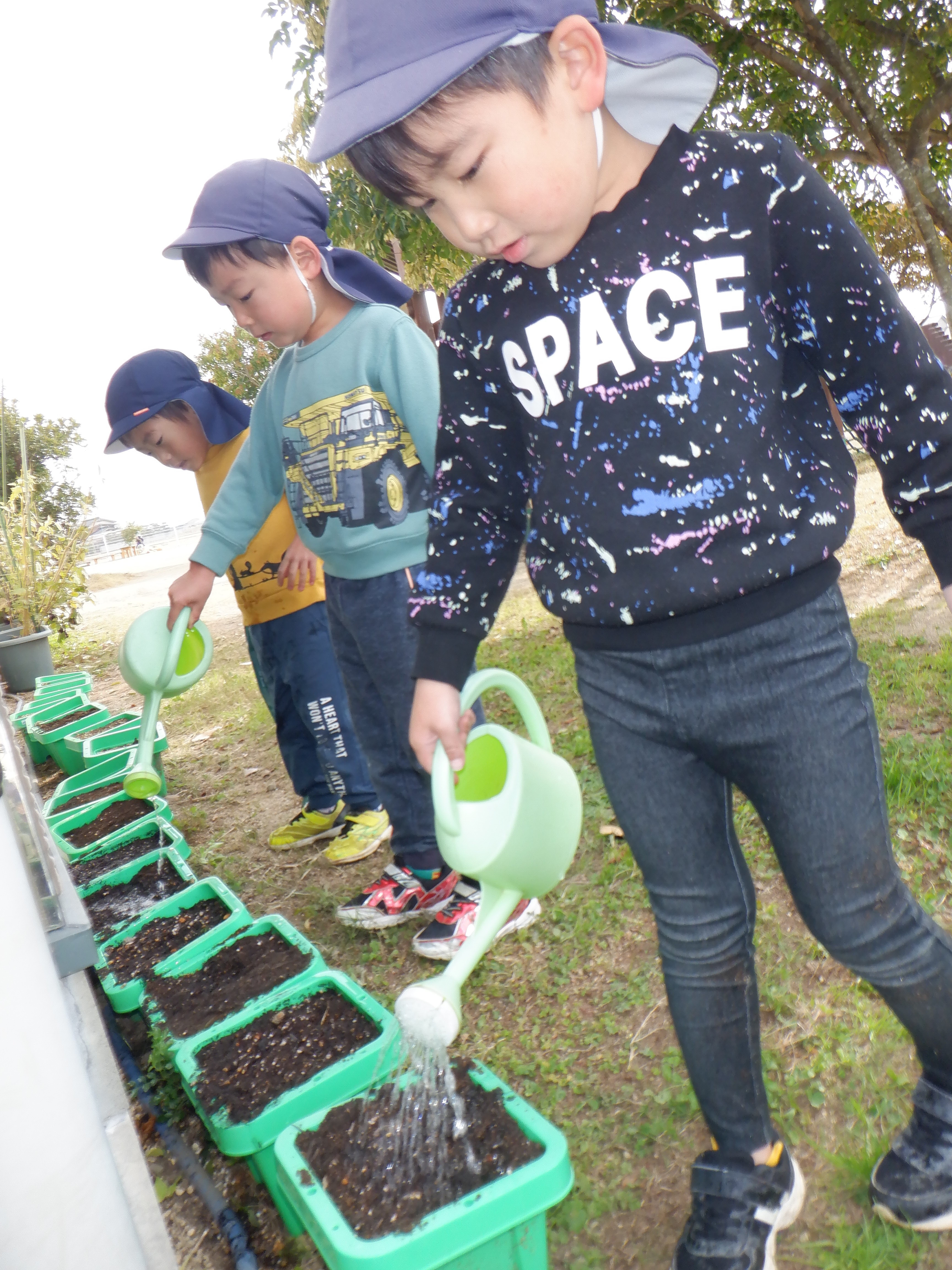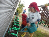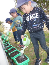 鉢にチューリップを植えました。目を瞑って「何色かな〜?」と言い、くじ引きのように楽しみながら球根を選びました。球根を鉢の中に入れ優しく土をかぶせていました。雨が降っていない日は毎日園庭で遊ぶ前に水やりをしています。「今日は〇〇ちゃんお休みやけんしとこ」と休んでいる友だちのことも気にする優しい姿も見られました。