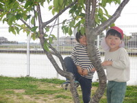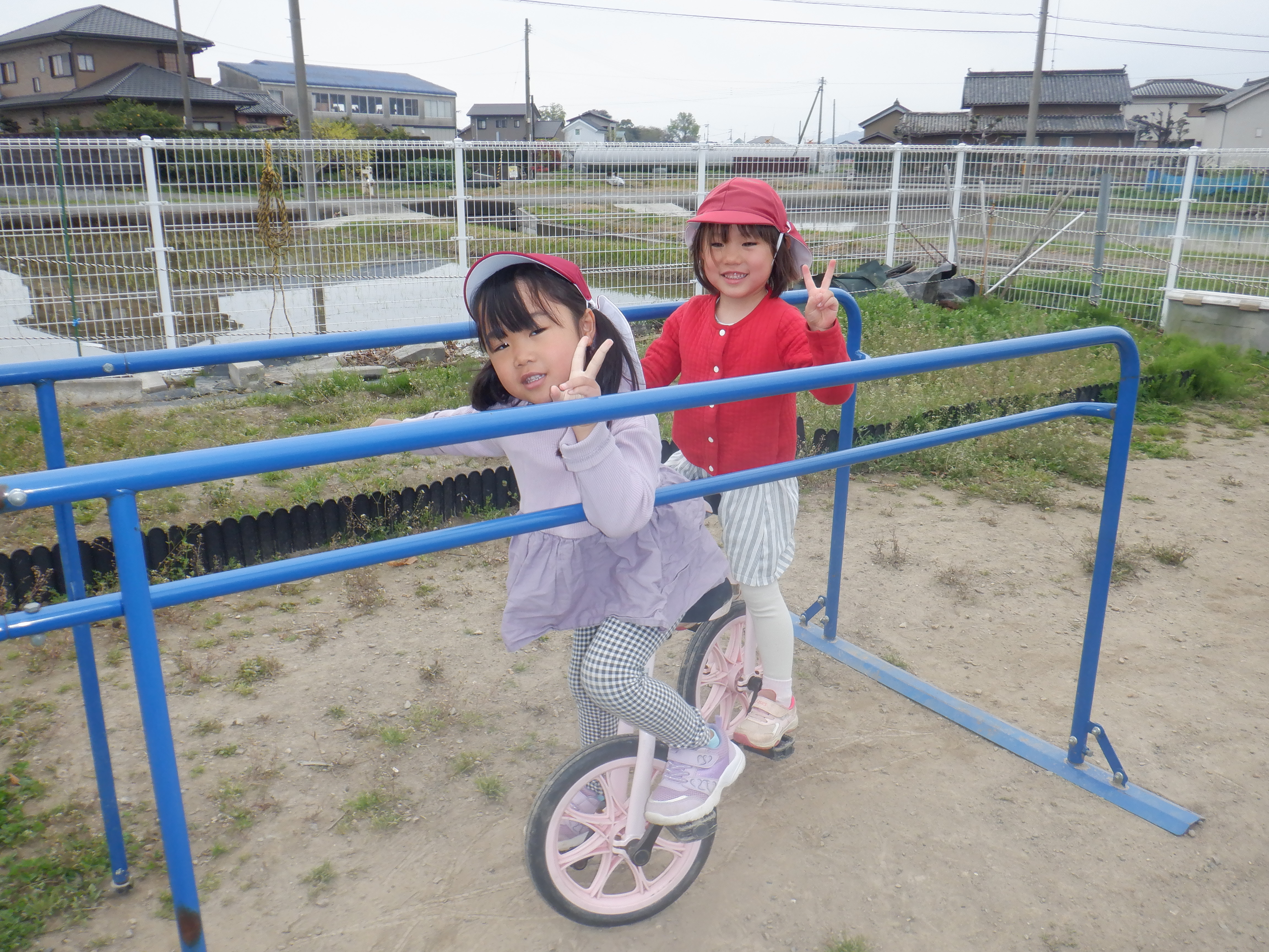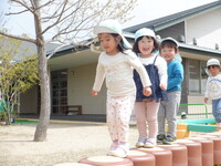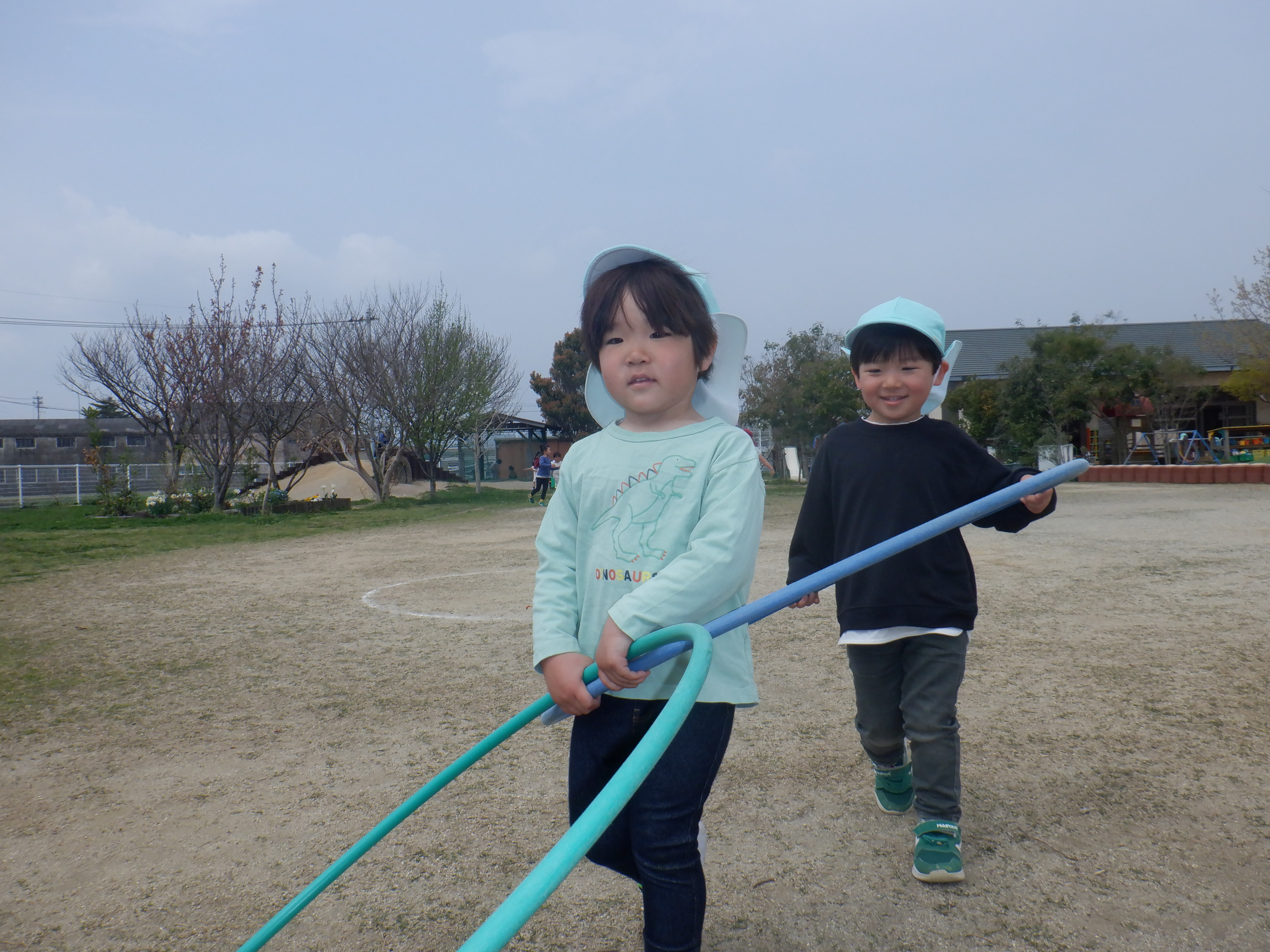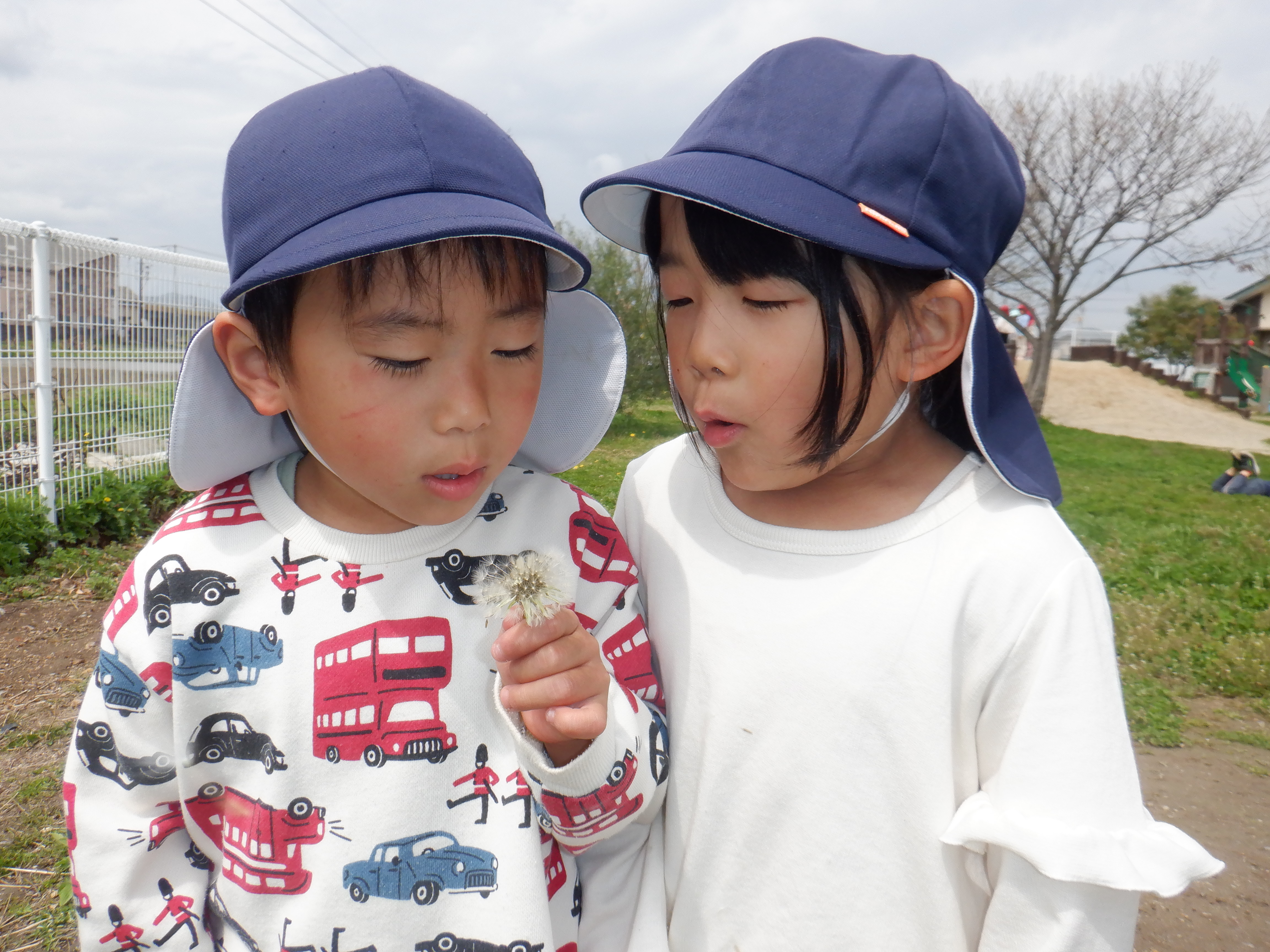 園庭遊びが大好きな子どもたちは毎日元気いっぱい遊んでいます。暖かくなってきてダンゴムシやてんとう虫を見つけて友だちや保育者に「見て!」「ここにおったよ」と見せにきてくれます。たんぽぽや四つ葉のクローバー探しもブームになっています。年齢は違っても気が合う友だちと追いかけっこや競争をして関わり楽しんでいます。