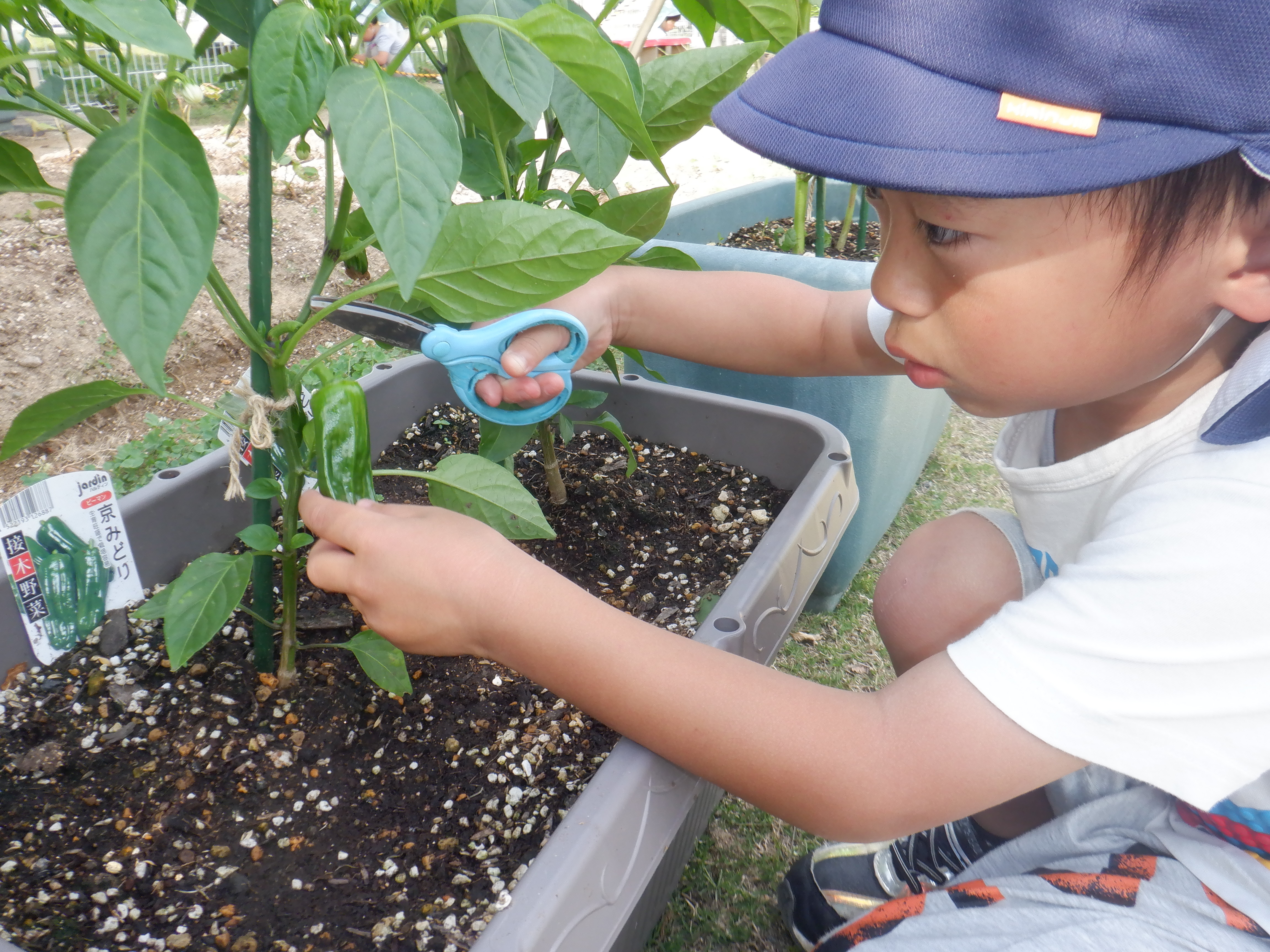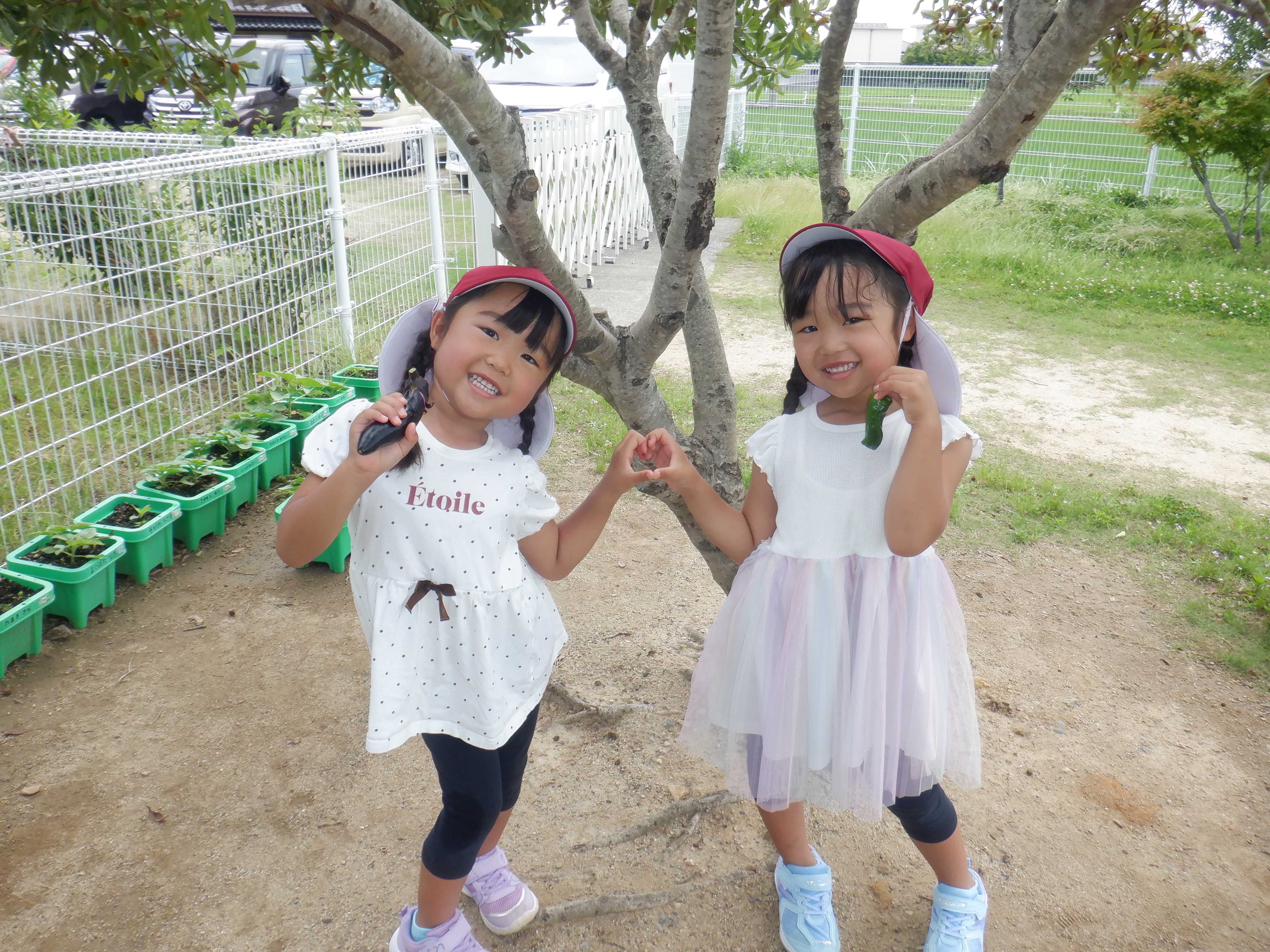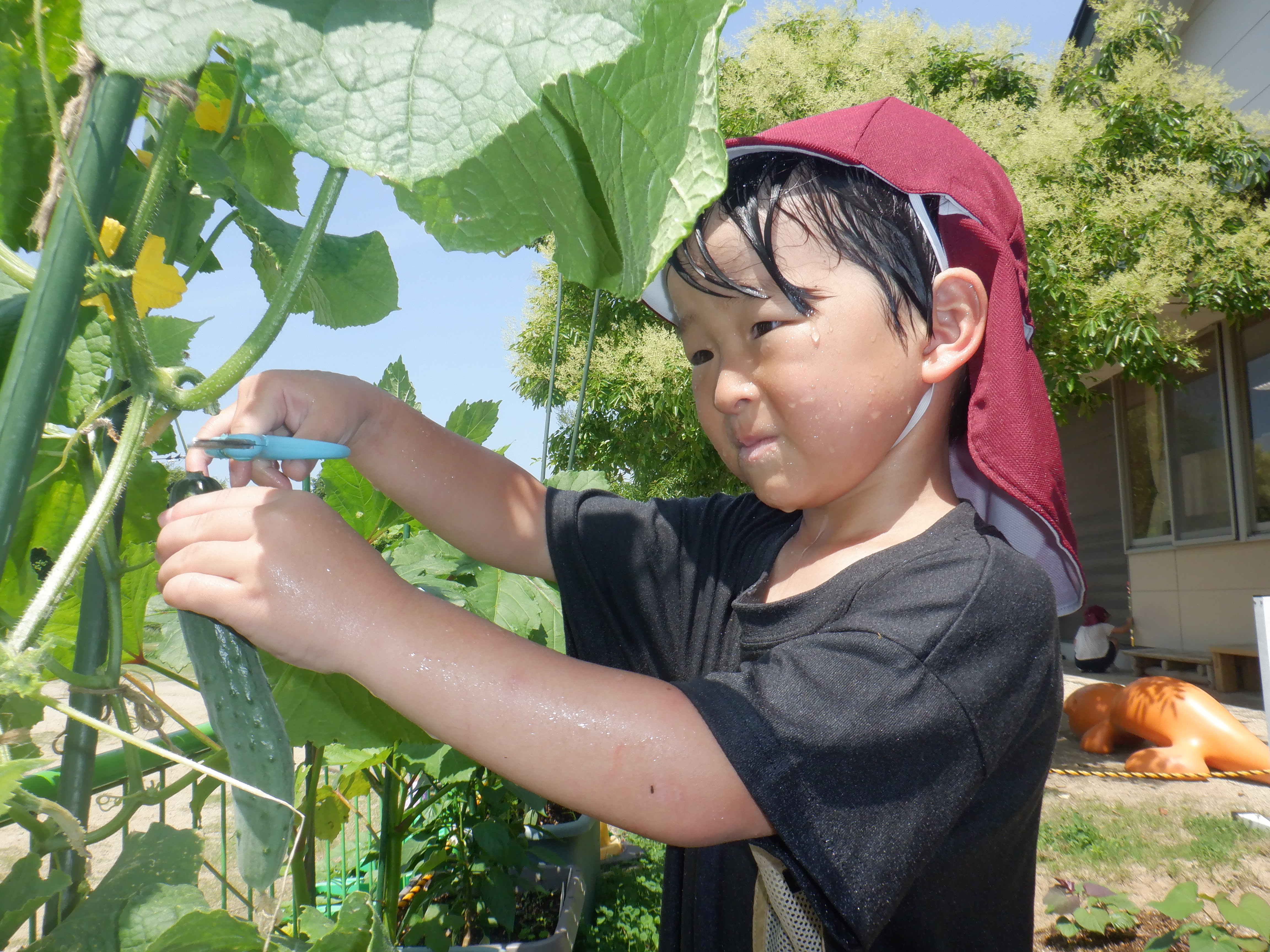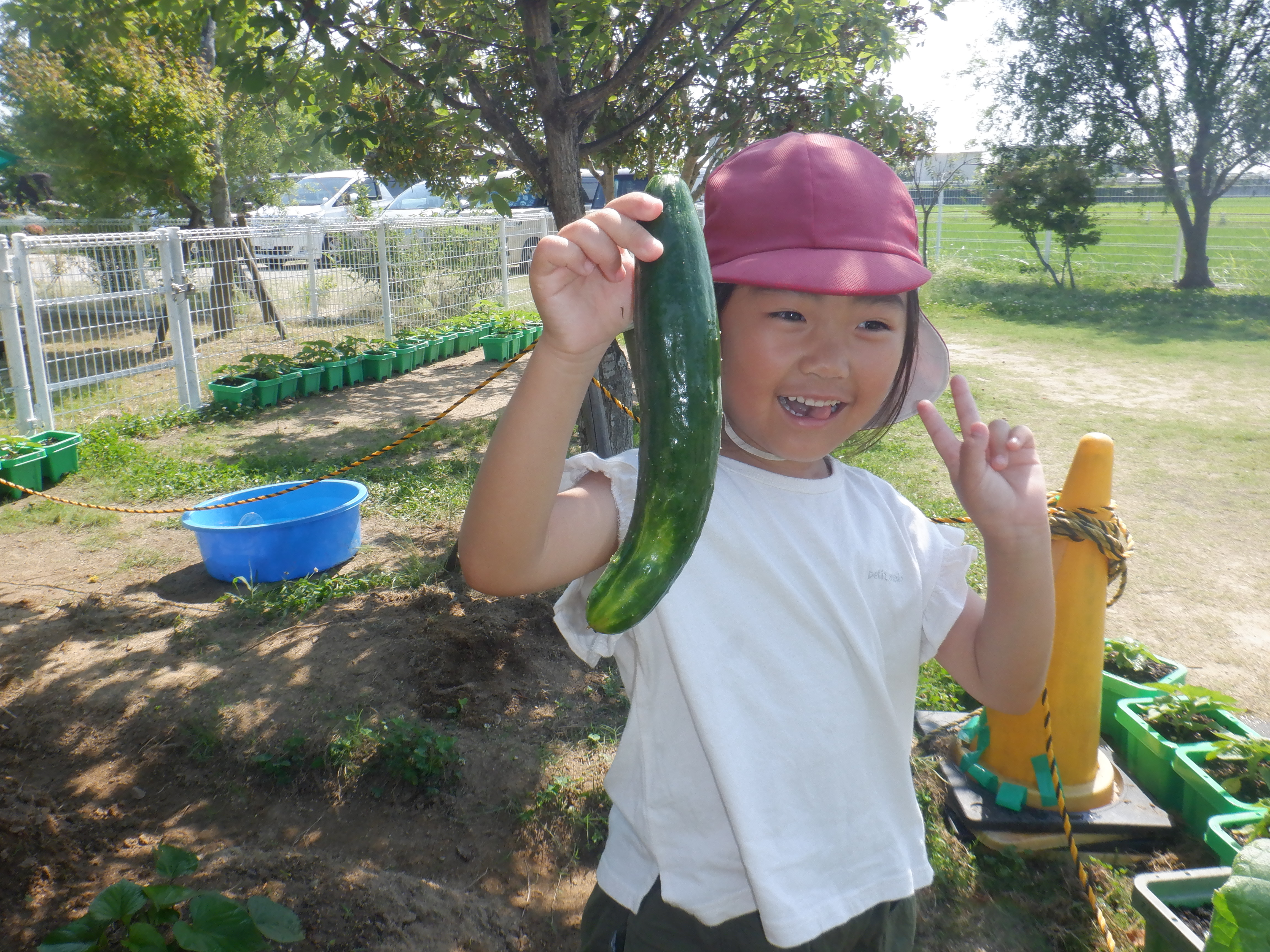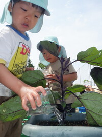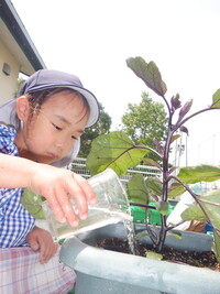 毎日水やりをしてみんなで育てている野菜が大きくなり収穫しています。一日でとても大きくなっている野菜を見て驚いたり「早く食べたい!」と友だちと話をしていたりと収穫できる日を楽しみに育てていました。収穫できた日には「家で〇〇にピーマン入れてもらう」とワクワクしていました。みんなで頑張って育てた夏野菜子どもたちとおいしく召し上がってくださいね。