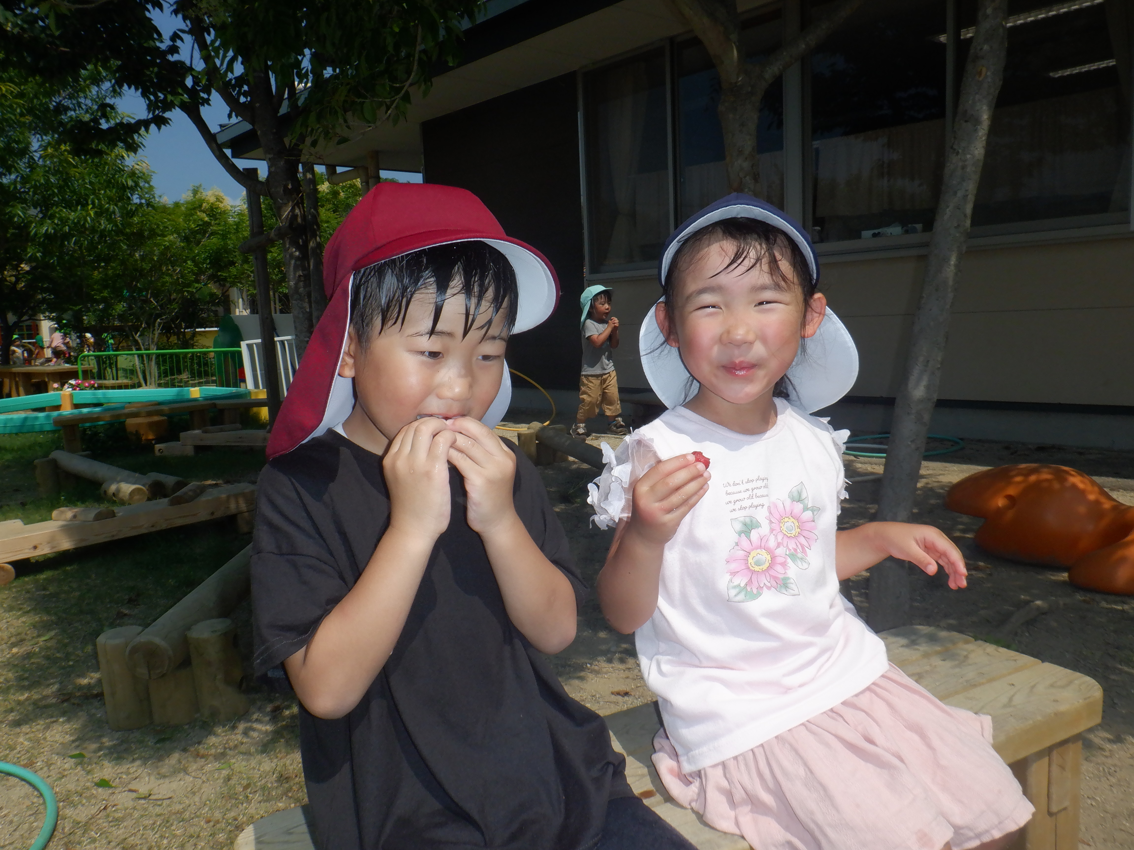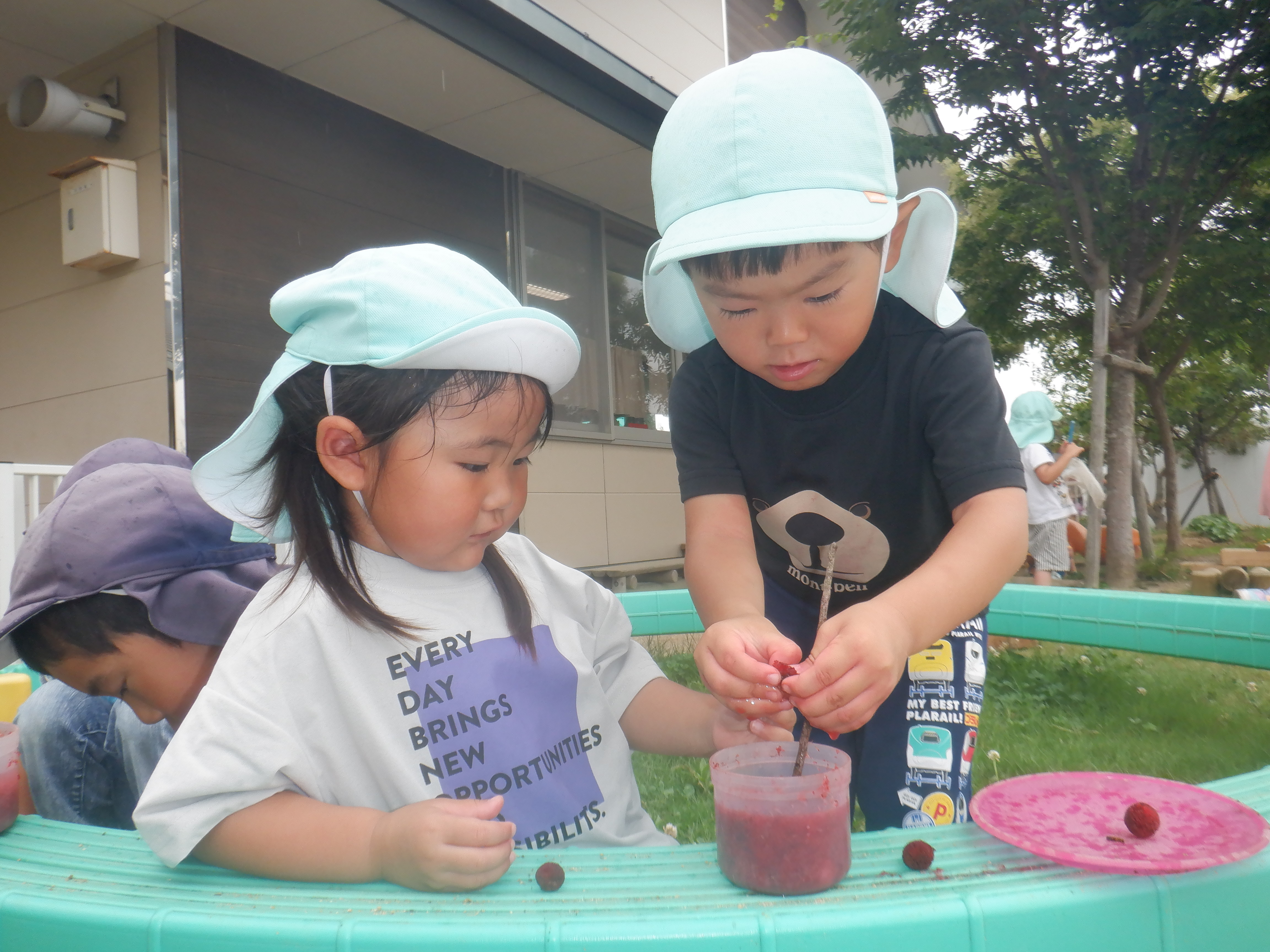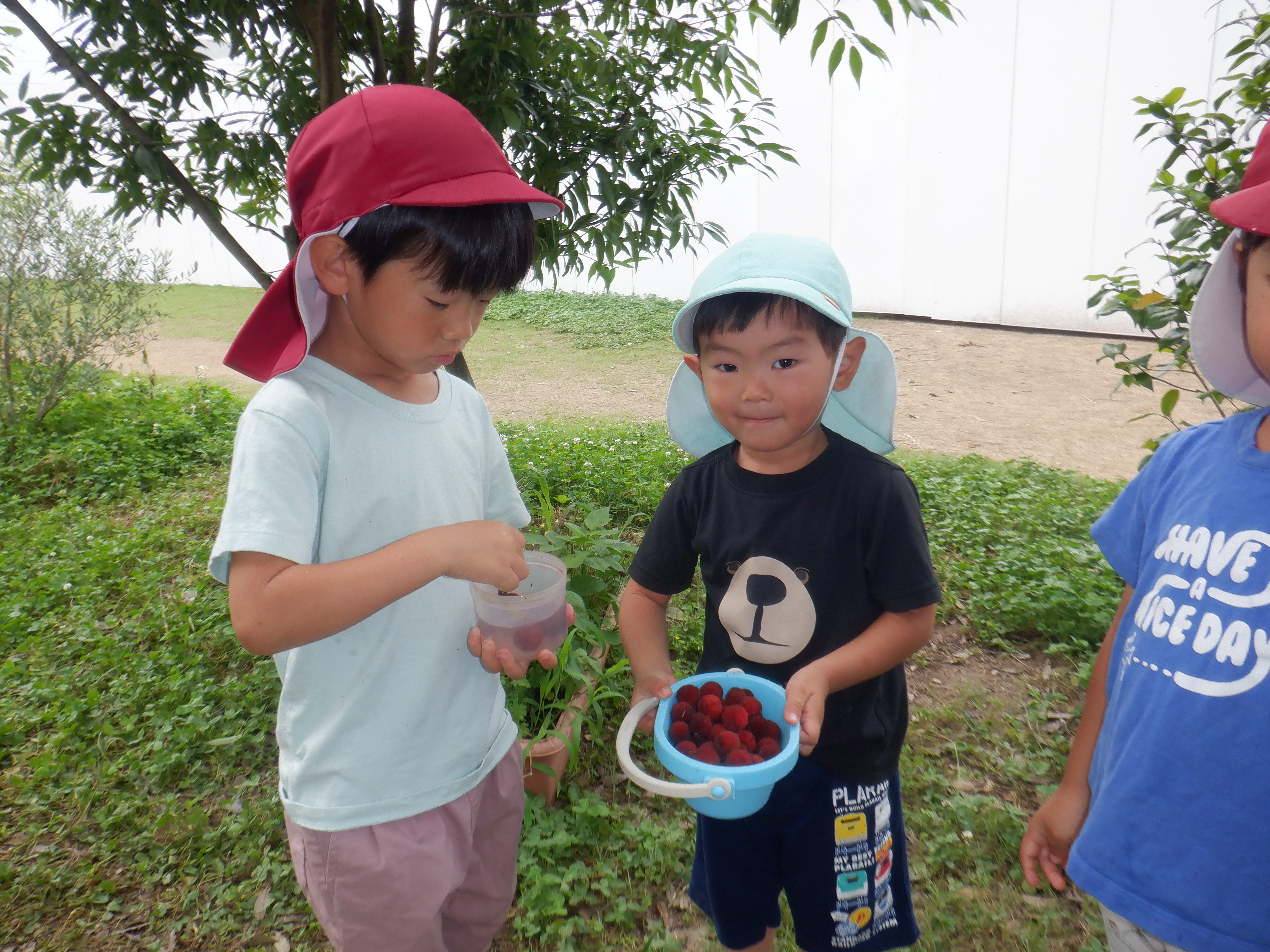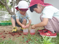 今年も園庭のヤマモモが豊作です。子どもたちは実がまだ赤くなっておらず食べられない時に「早く食べたい〜」「これもう食べれるそう!」と待ち遠しい様子でした。ほとんどの実が赤くなり美味しそうな食べ頃になったので自由に収穫し食べています。友だちと顔を見合わせ「美味しいな〜」「ちょっと酸っぱい」「お水で洗ってから食べるんよ〜」と話をしながらぱくぱくと食べていました。また木の下に落ちてしまっているヤマモモや黒くなってしまって食べられないヤマモモを沢山集めヤマモモを手で揉んだりして「ヤマモモジュースの完成!」と作って楽しんでいました。