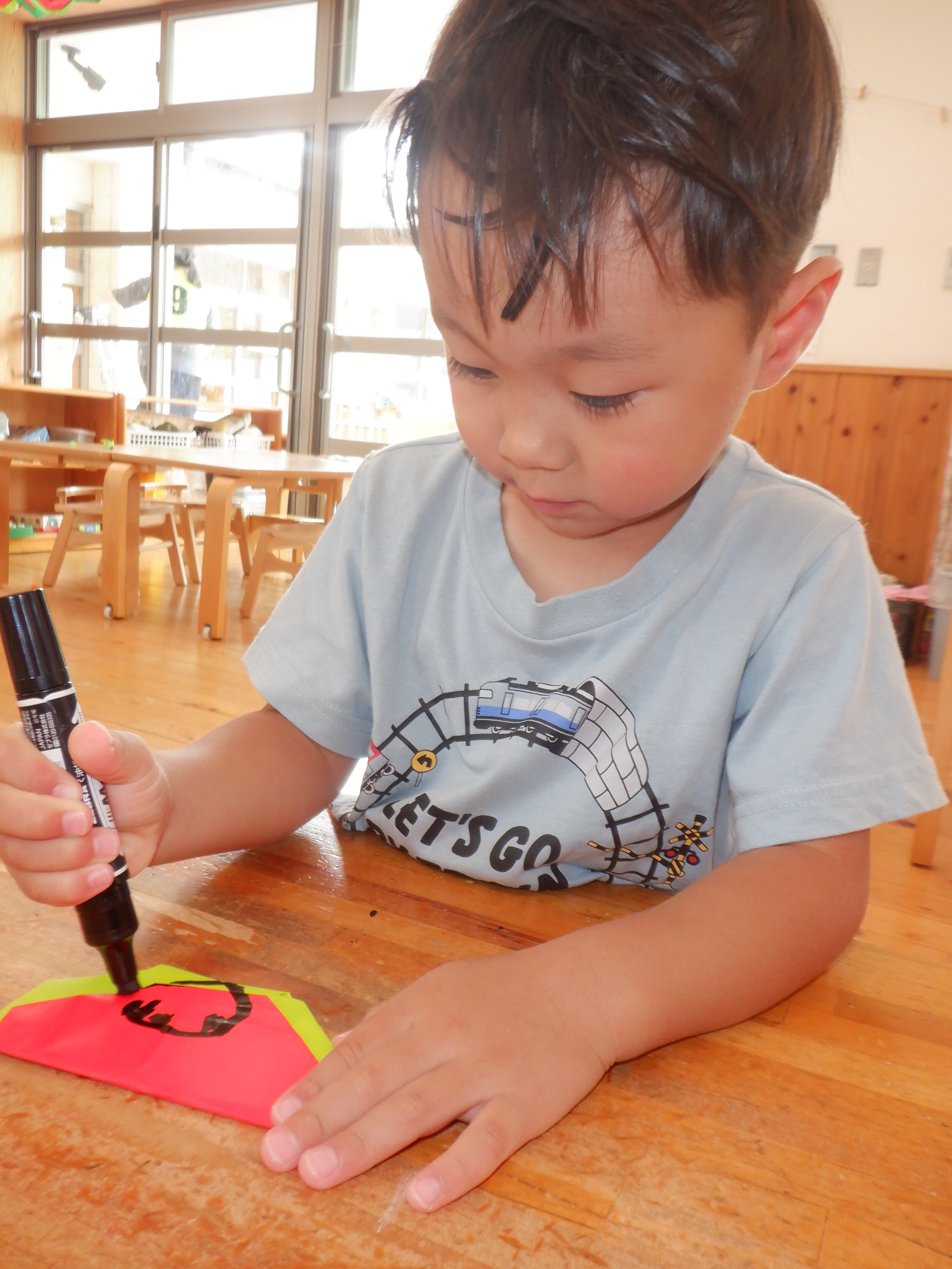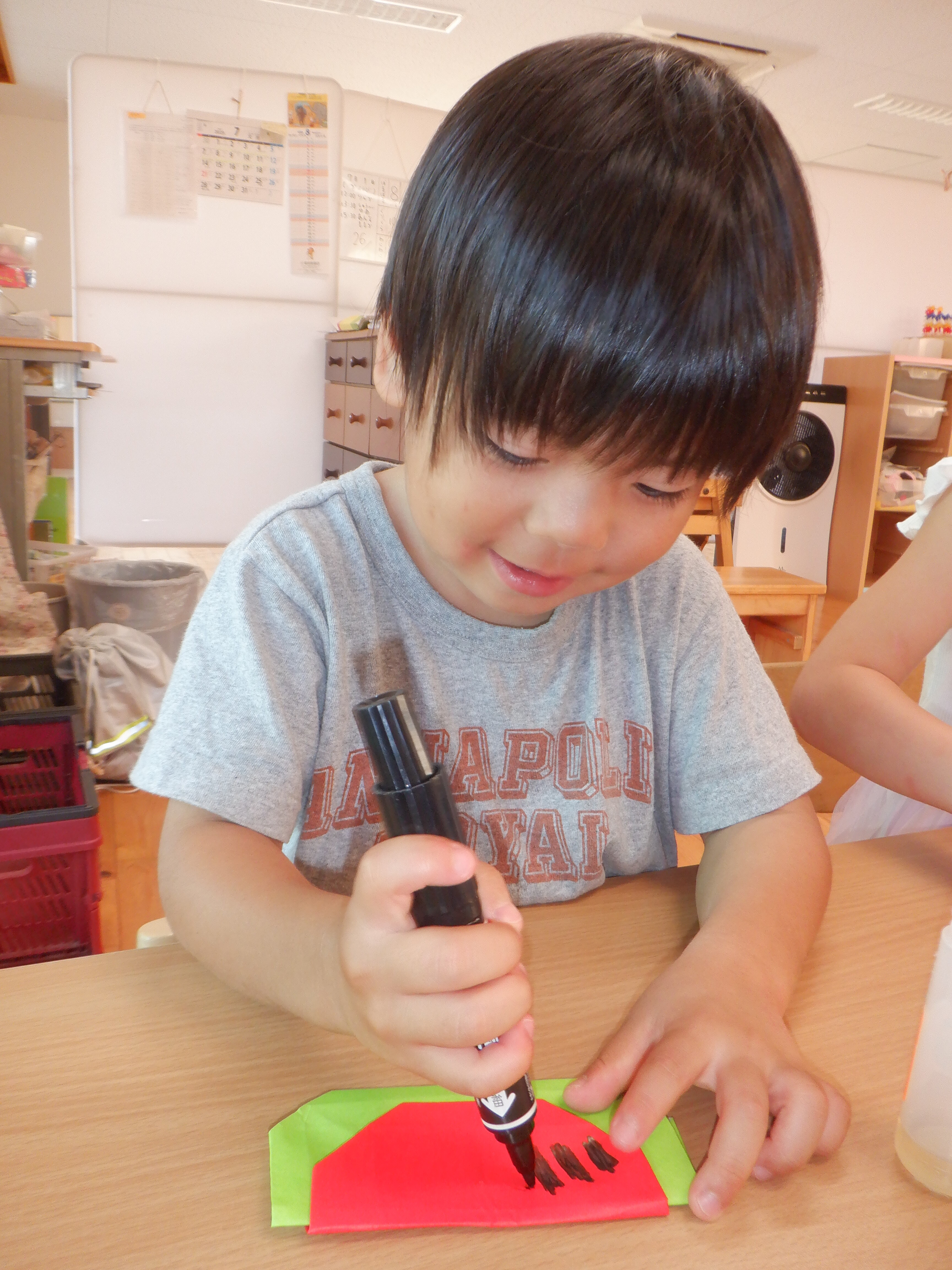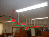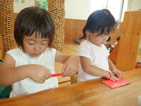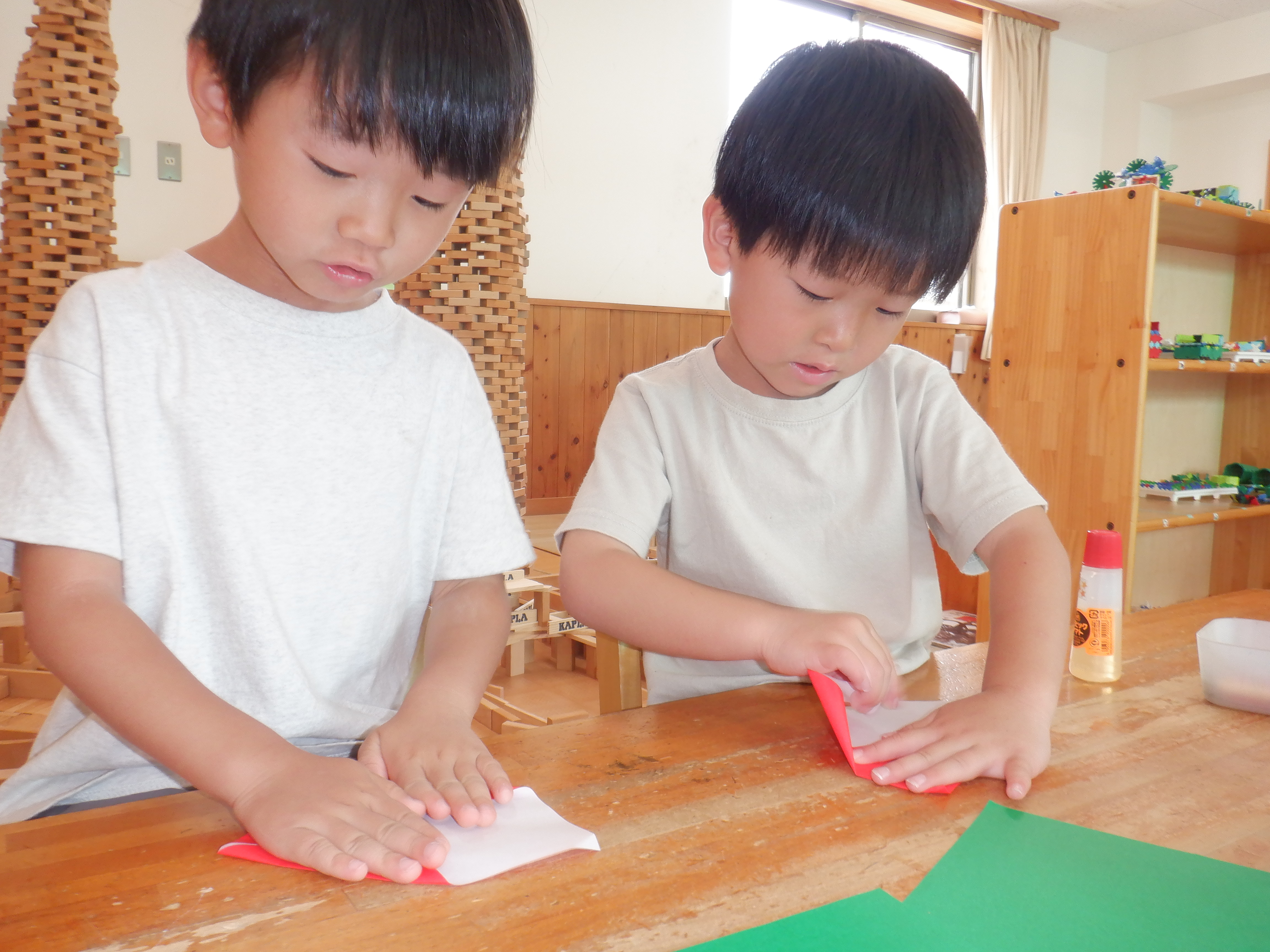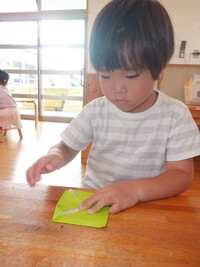 園庭遊びも暑くなってきました。沢山汗をかいた後はシャワーをしてさっぱりした状態でゆったりと室内で過ごしています。折り紙でスイカを作りました。わにわにさんは保育者が手を添えながら一緒に作りました。ぐりぐら・ばるばるさんは保育者の折り方を横で見ながら折っていました。「難しい…」と言いながら最後まで諦めずに作っている姿が素敵でした。