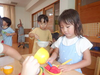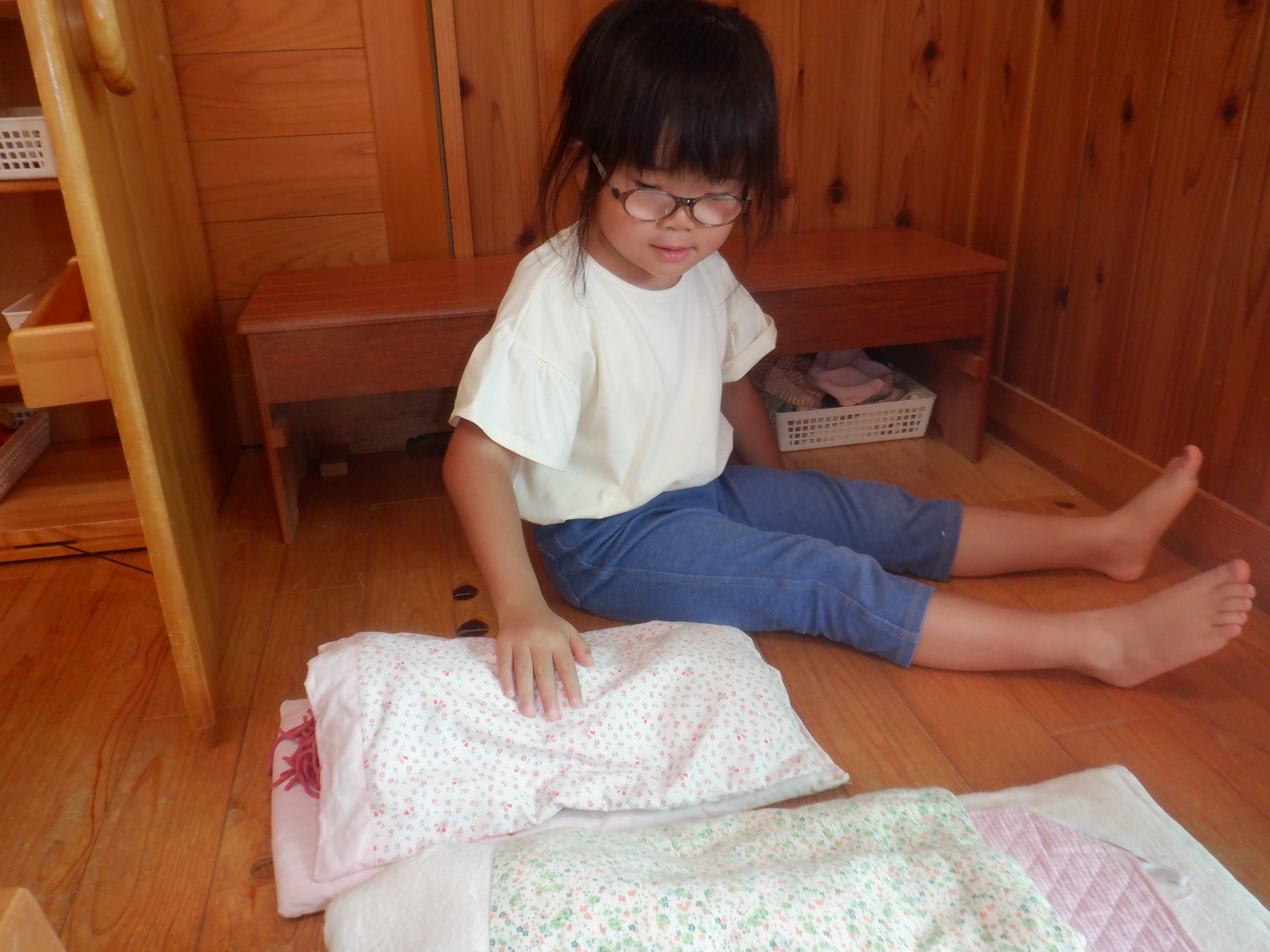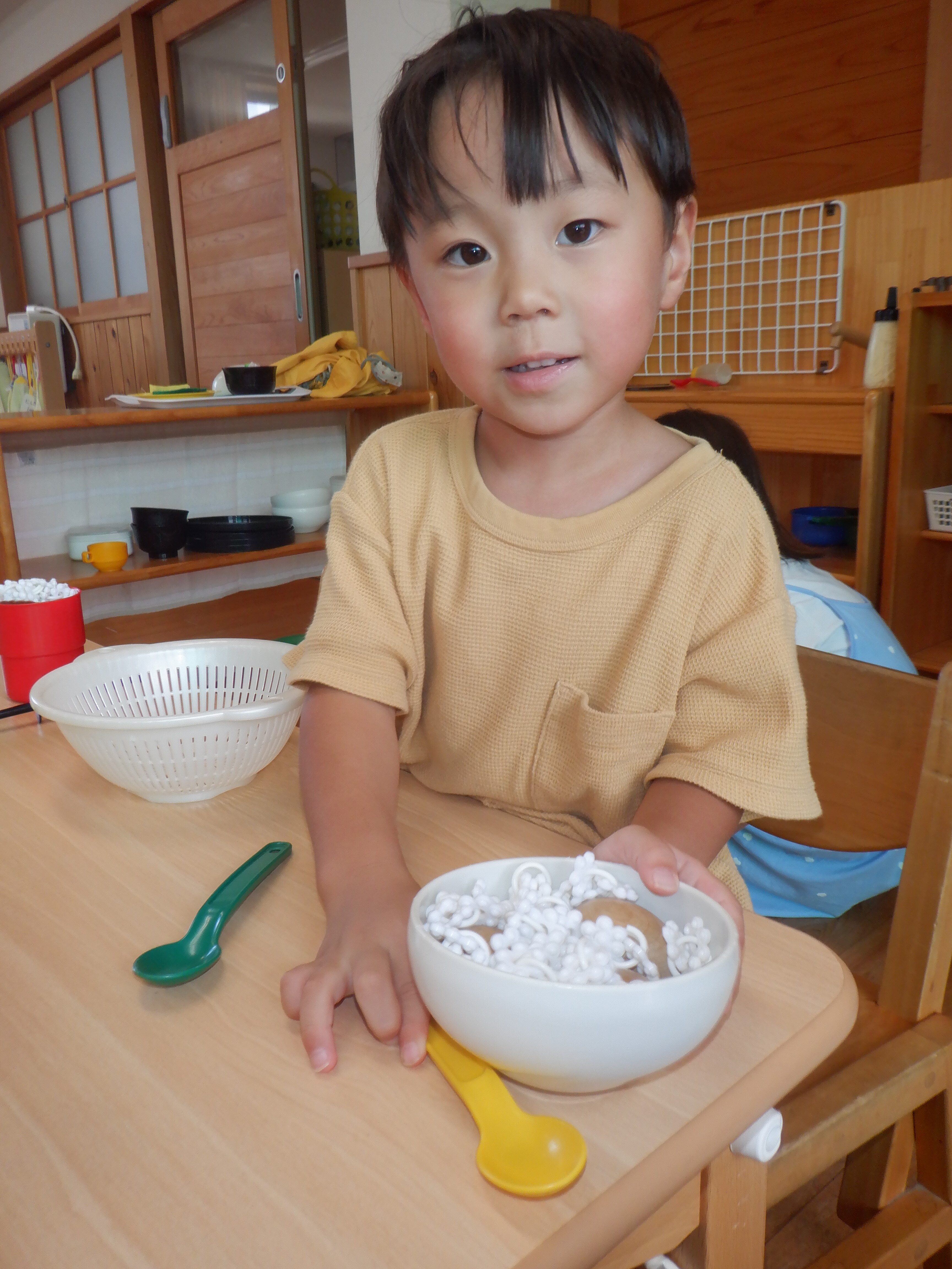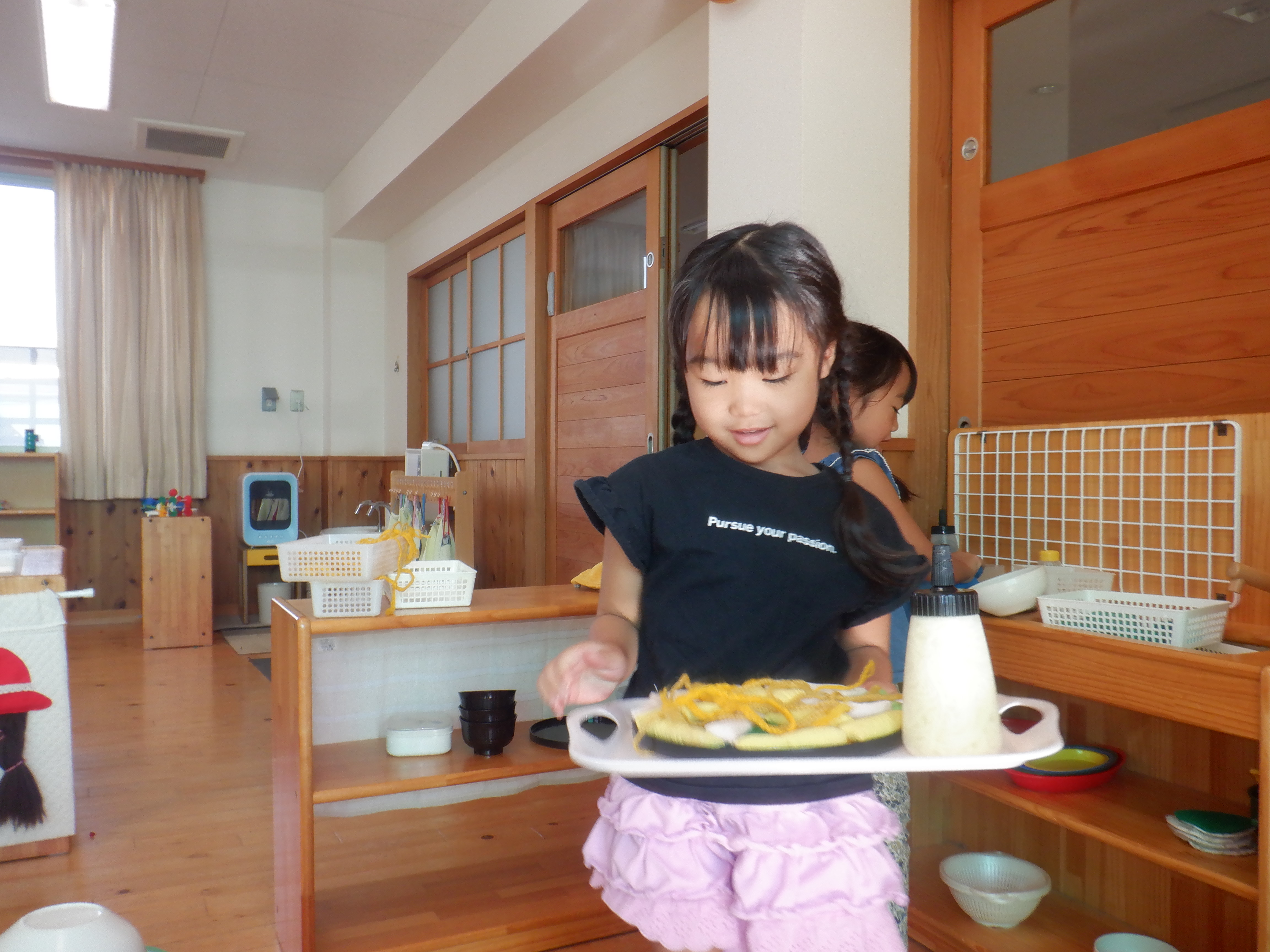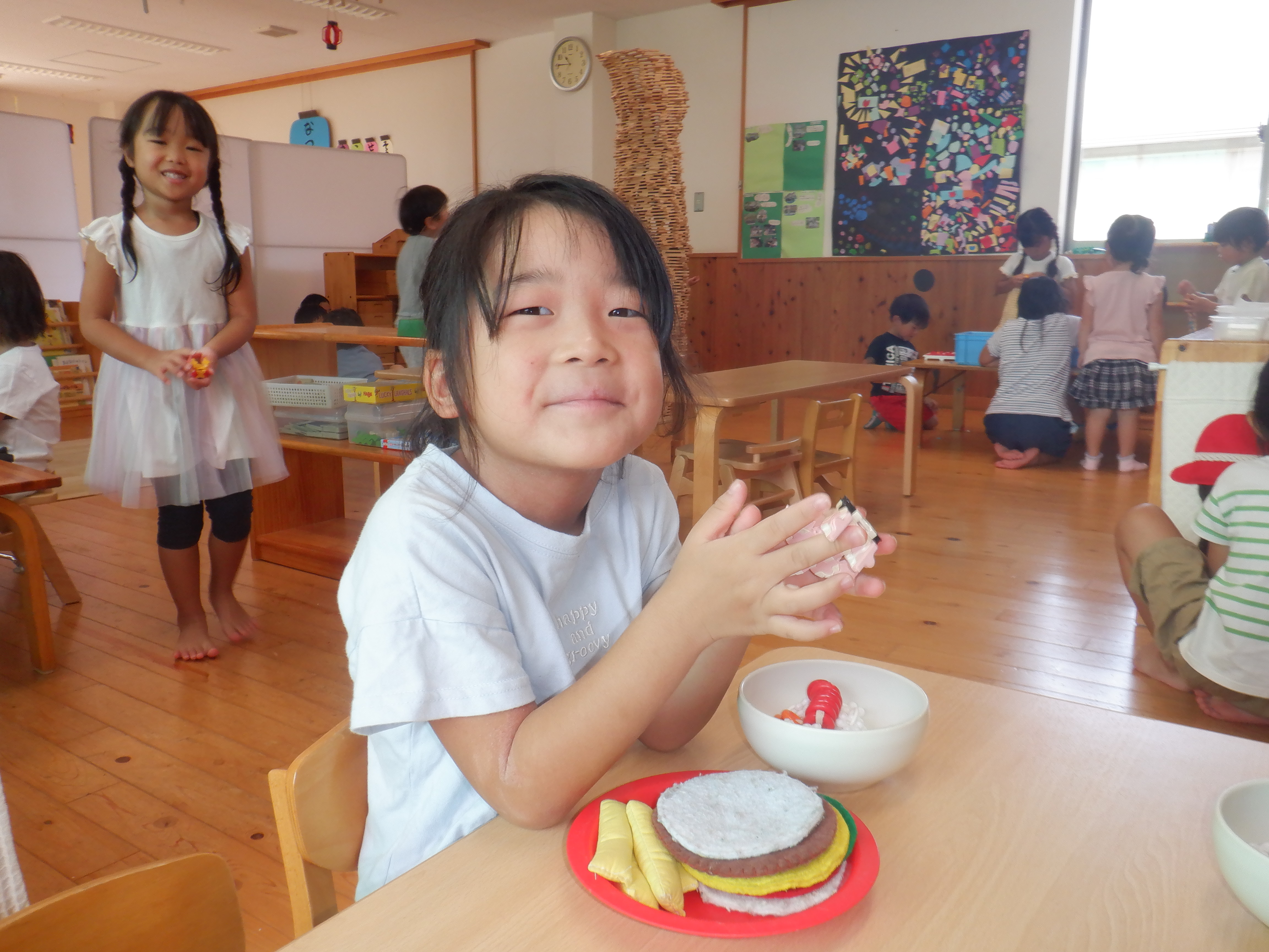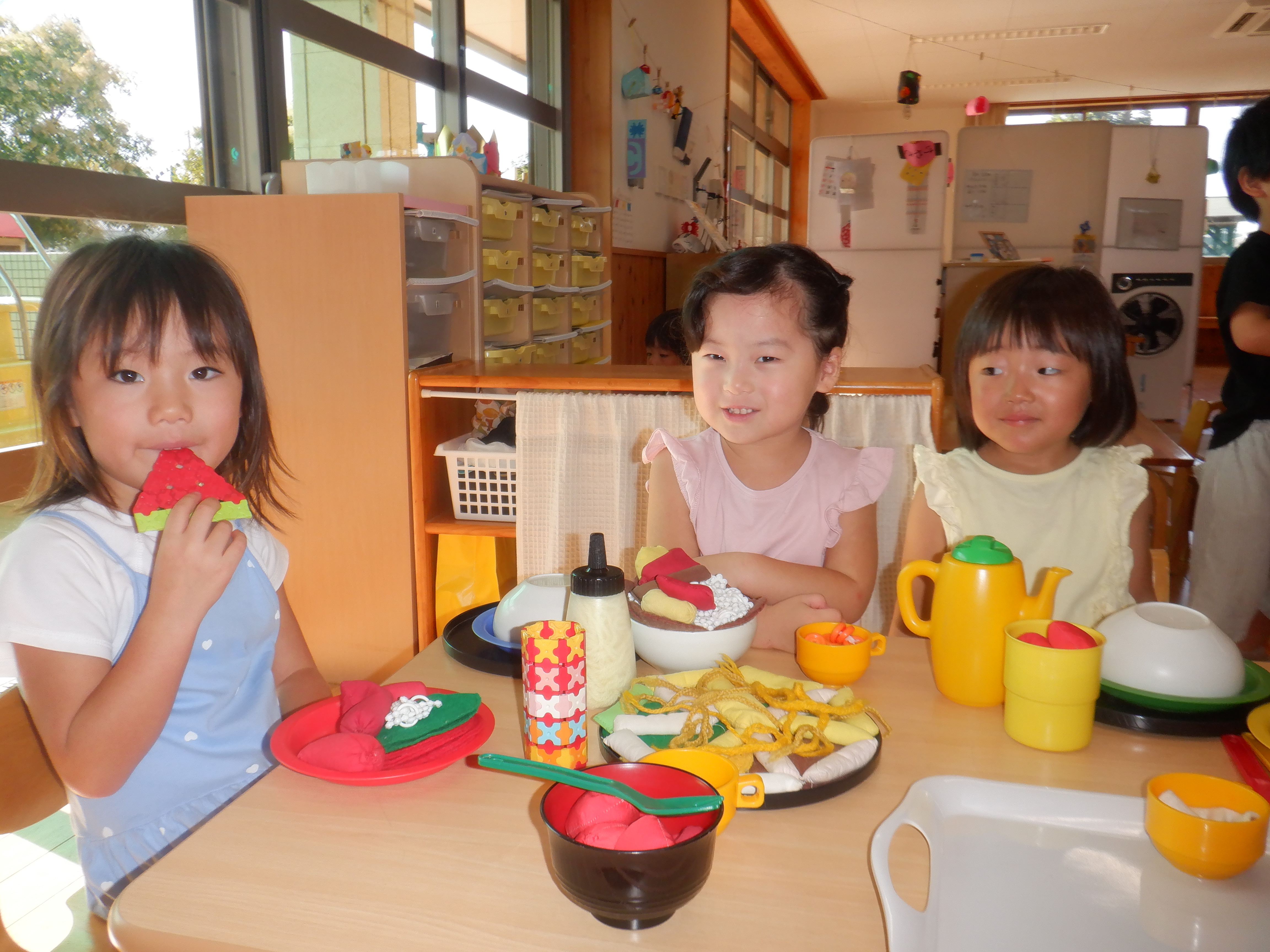 室内遊びではままごと遊びが盛り上がっています。お店やさんごっこでは定員役、お客さんに分かれてみんな役になりきっています。子どもたちが実際にお店に行って体験したことなどをそのまま真似したり保育園ごっこでは朝の玄関の様子などを真似していました。「体調変わりないです〜」「お願いします〜」と保護者の方や保育者になりきっている姿がありよく見ているな〜と感じます。今日はLaQで作ったスイカをままごとコーナーに持ってきて食べていました。