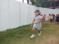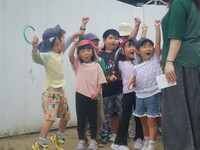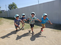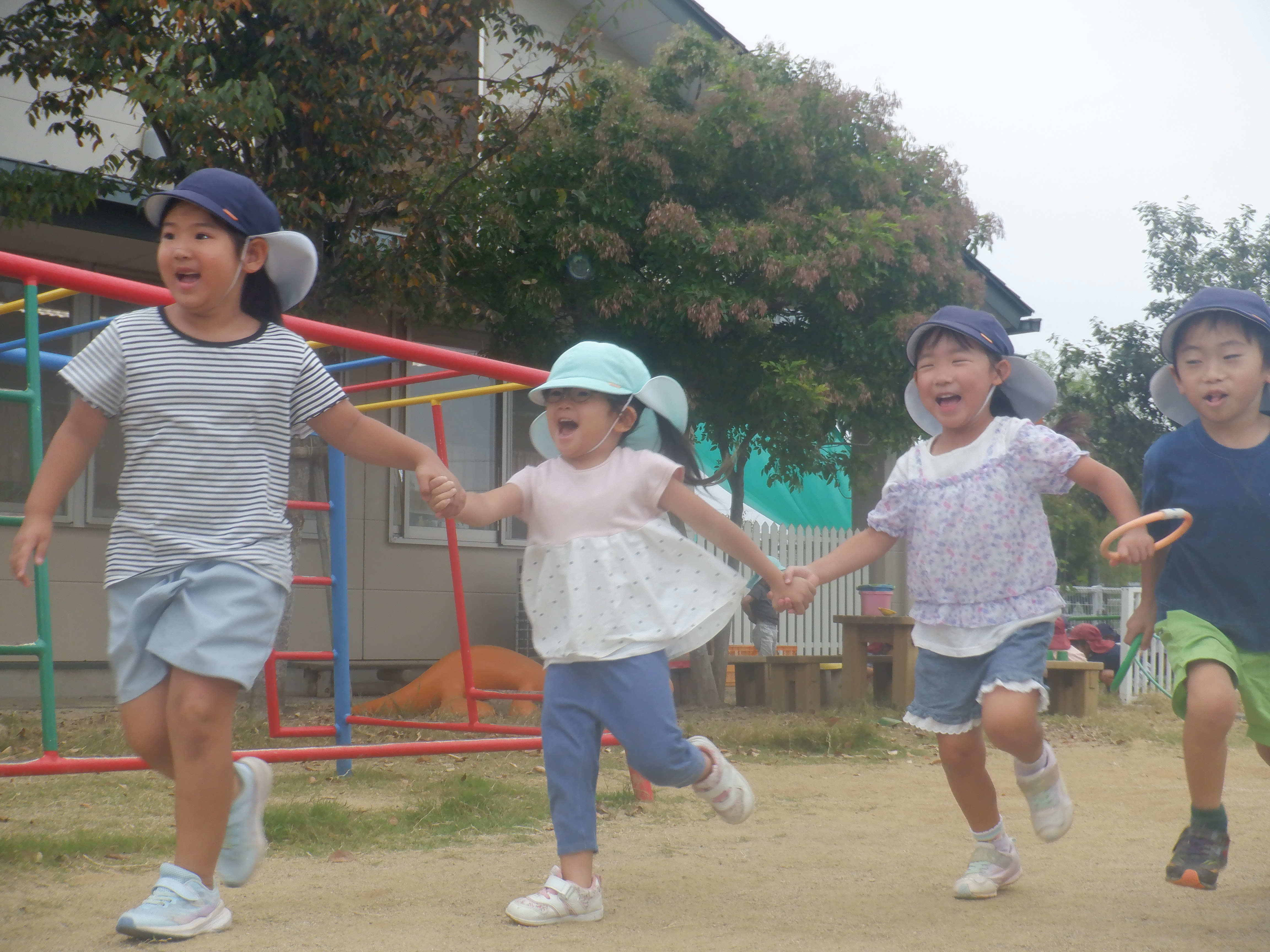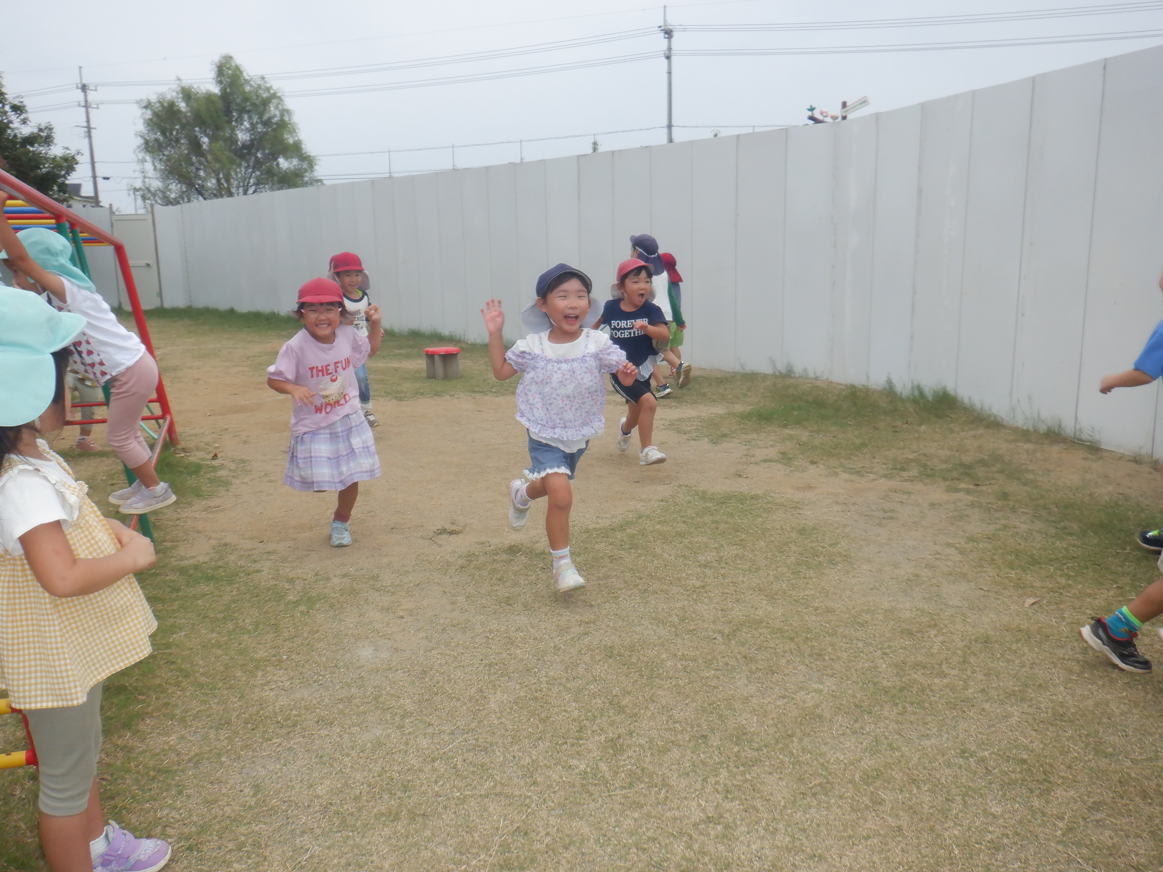 ぐりぐら・ばるばるさんでリレー遊びをしました。友だちが走っているときは、後ろから「頑張れー!」と応援してくれます。自分の番が来ると真剣な表情になり全力で走っています。横で応援していたわにわにさんも「やりたい!」とやる気満々だったのでリレー遊びをしました。ばるばるさんが手を握って走ってくれたり「次は〇〇ちゃんに渡すけんな」と優しい姿が沢山見られてほっこりしました。