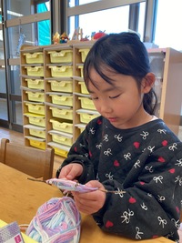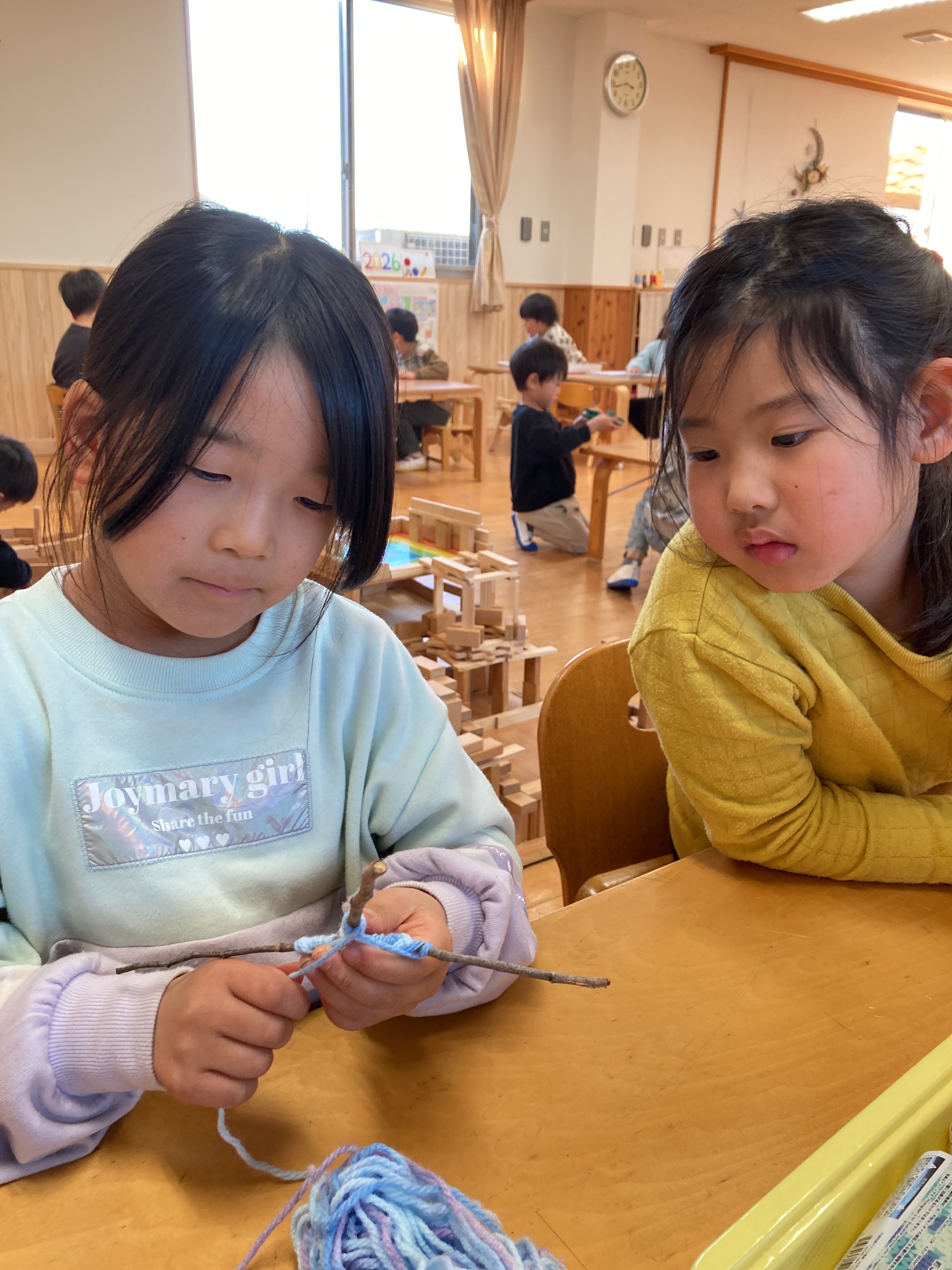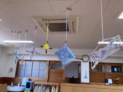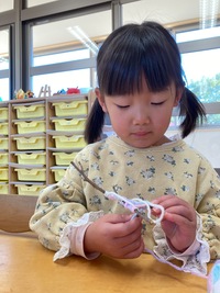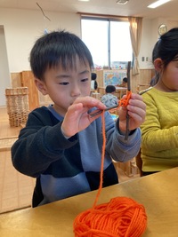 園庭で遊んでいると子どもたちは沢山の宝物を見つけています。貝殻や綺麗な色の石などなど…その中でも多いのは木の枝です。太さが違ったり形が違ったりと何かの物に見立てて遊んでいる子どもたちです。そんな木の枝と毛糸を使ってガーランドを作りました。長い枝は巻く箇所が多かったり巻きづらいのですが「簡単!」「楽しい!」と作っている子どもたちでした。