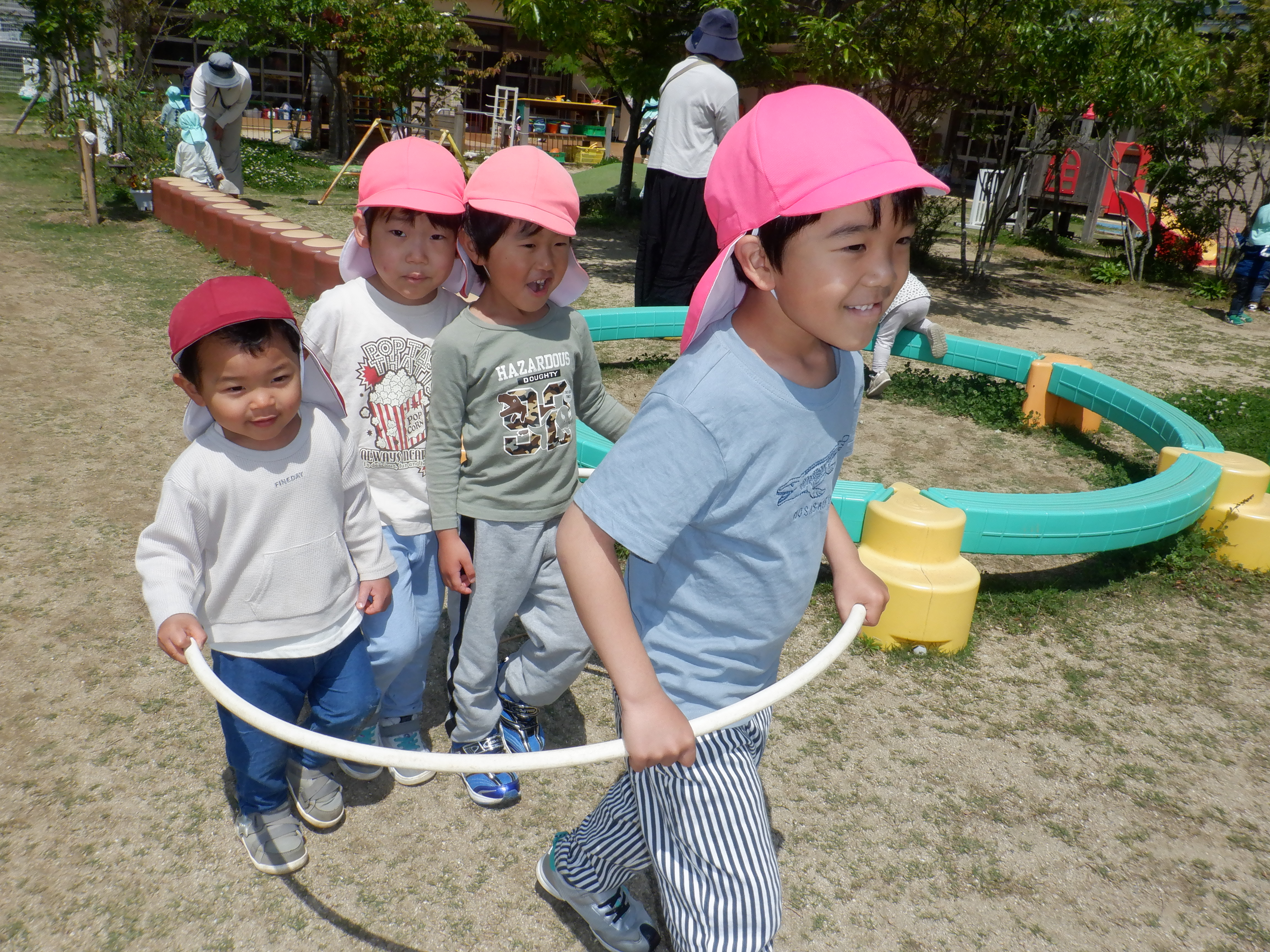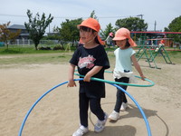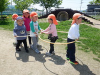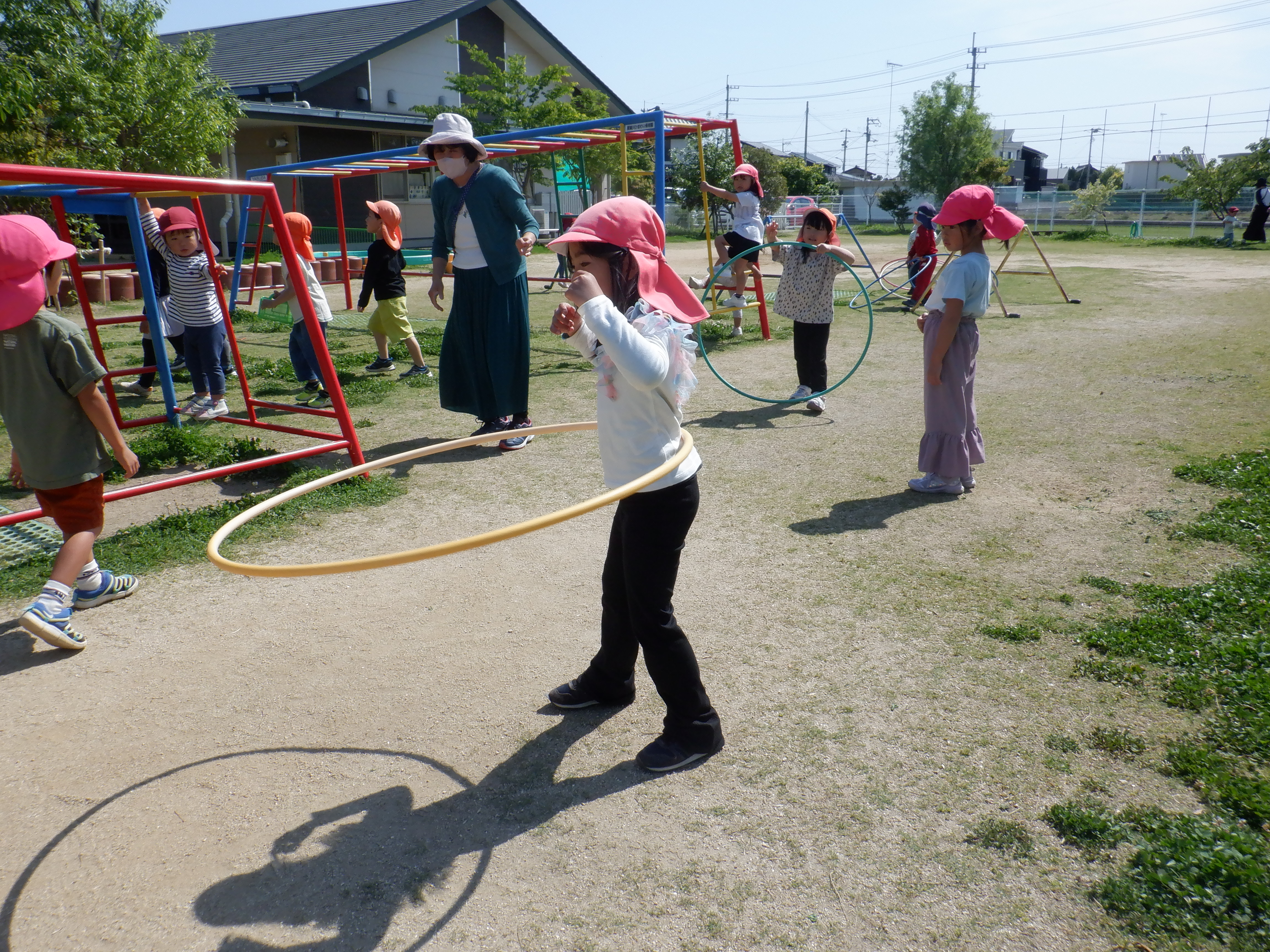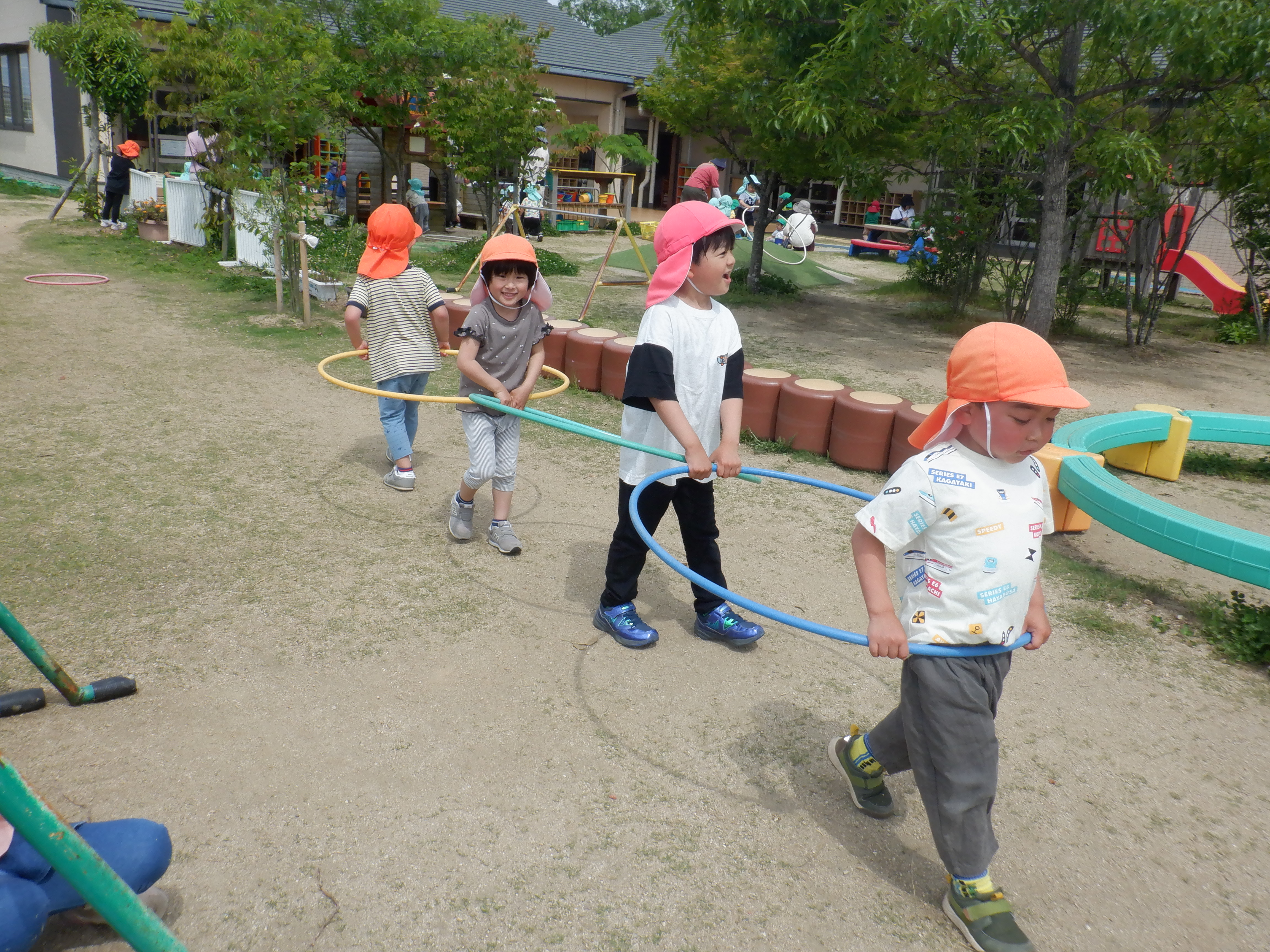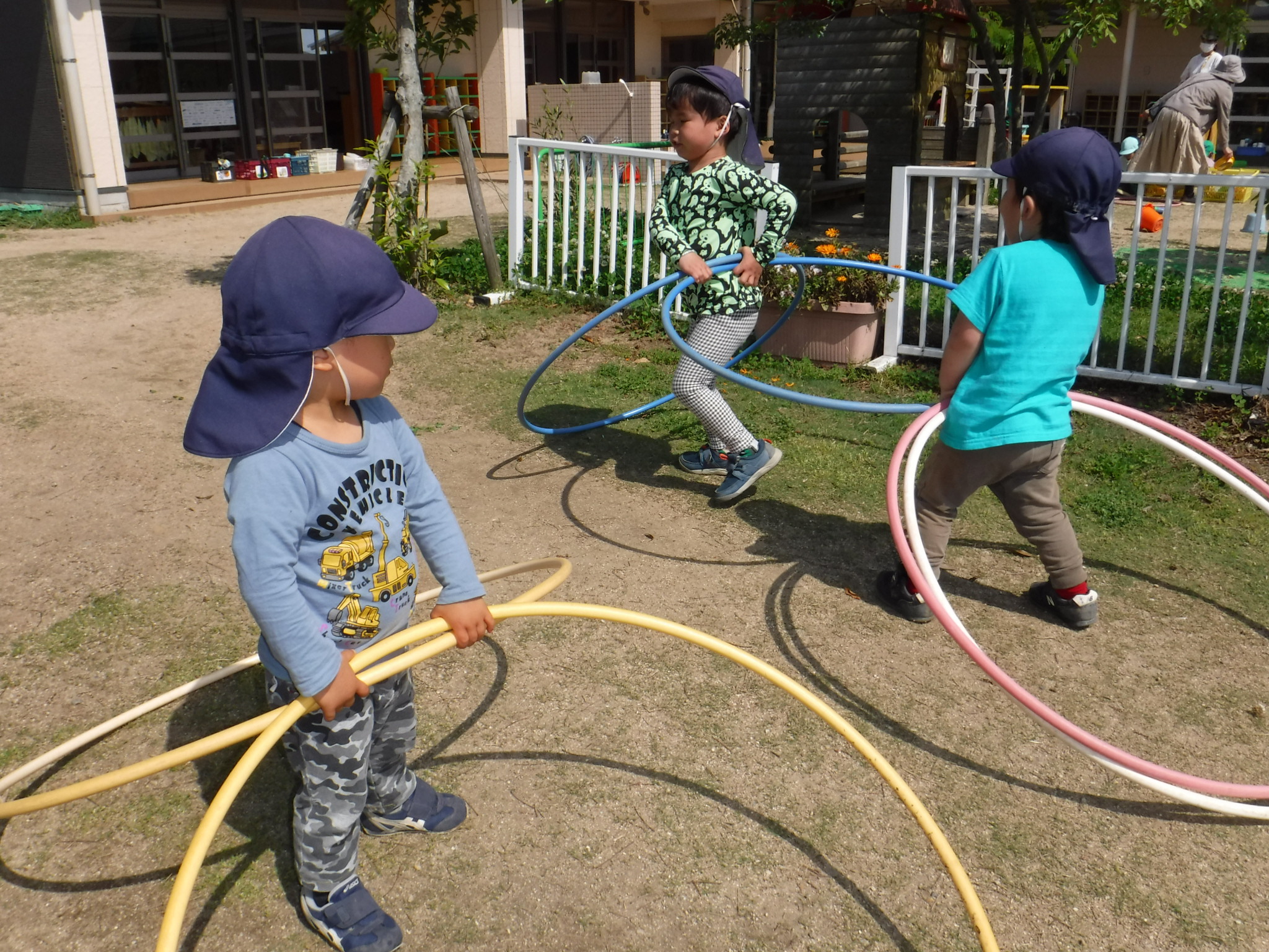 フラフープで遊ぶのが大好きでよく友だちと一緒に遊んでいます。繋げて汽車に見立てると「お買い物に行ってくる」「東京まで行ってくるね」など遊びに行ったり、「お乗りください〜。駅に着きました」と車掌さんになりきってお客さんを乗せて園庭の様々な所に行ったりして遊んでいました。また、フラフープを自分のお腹の部分で回すだけでなく、腕や足でも回してみようと挑戦して楽しんでいます。