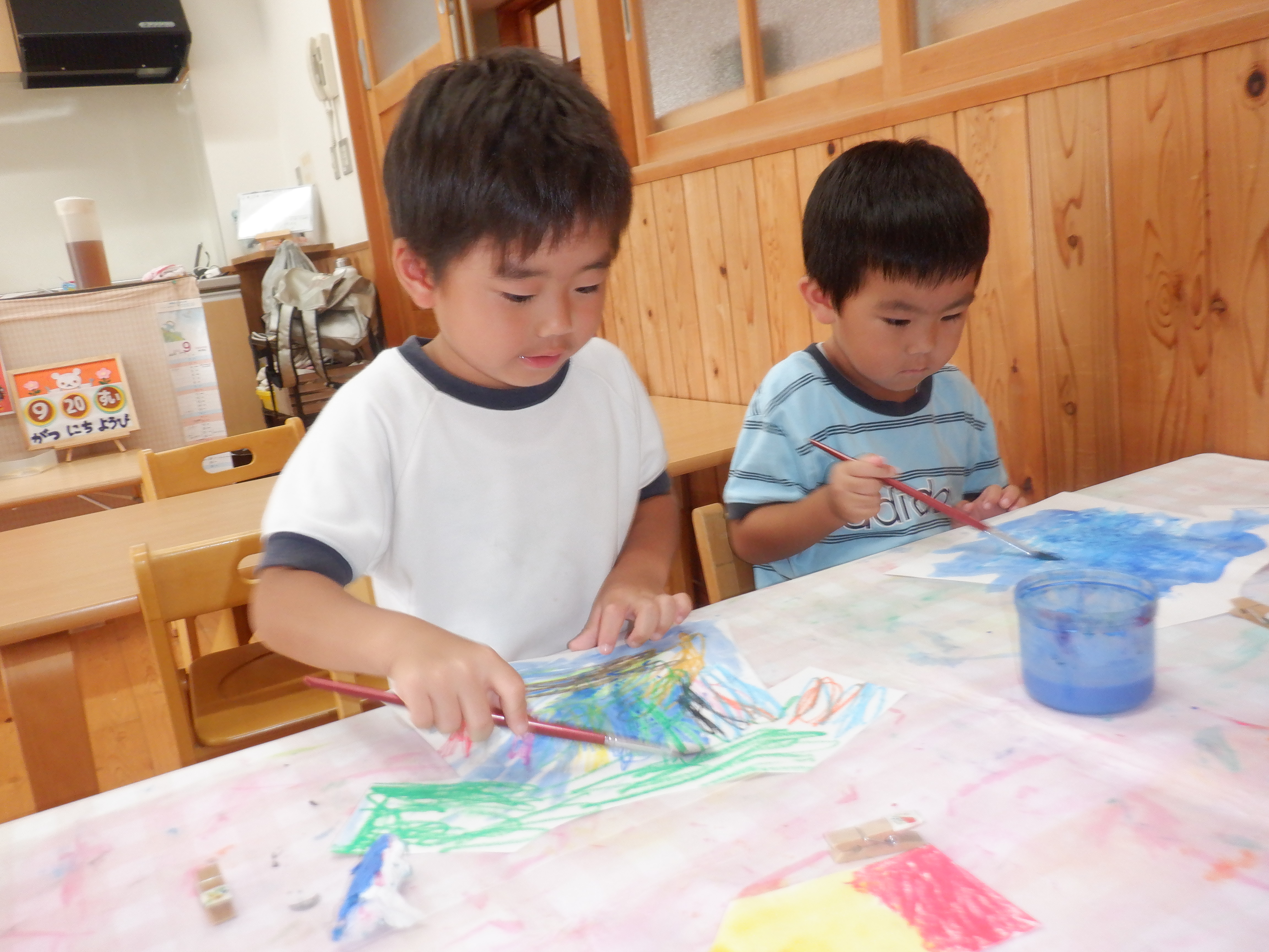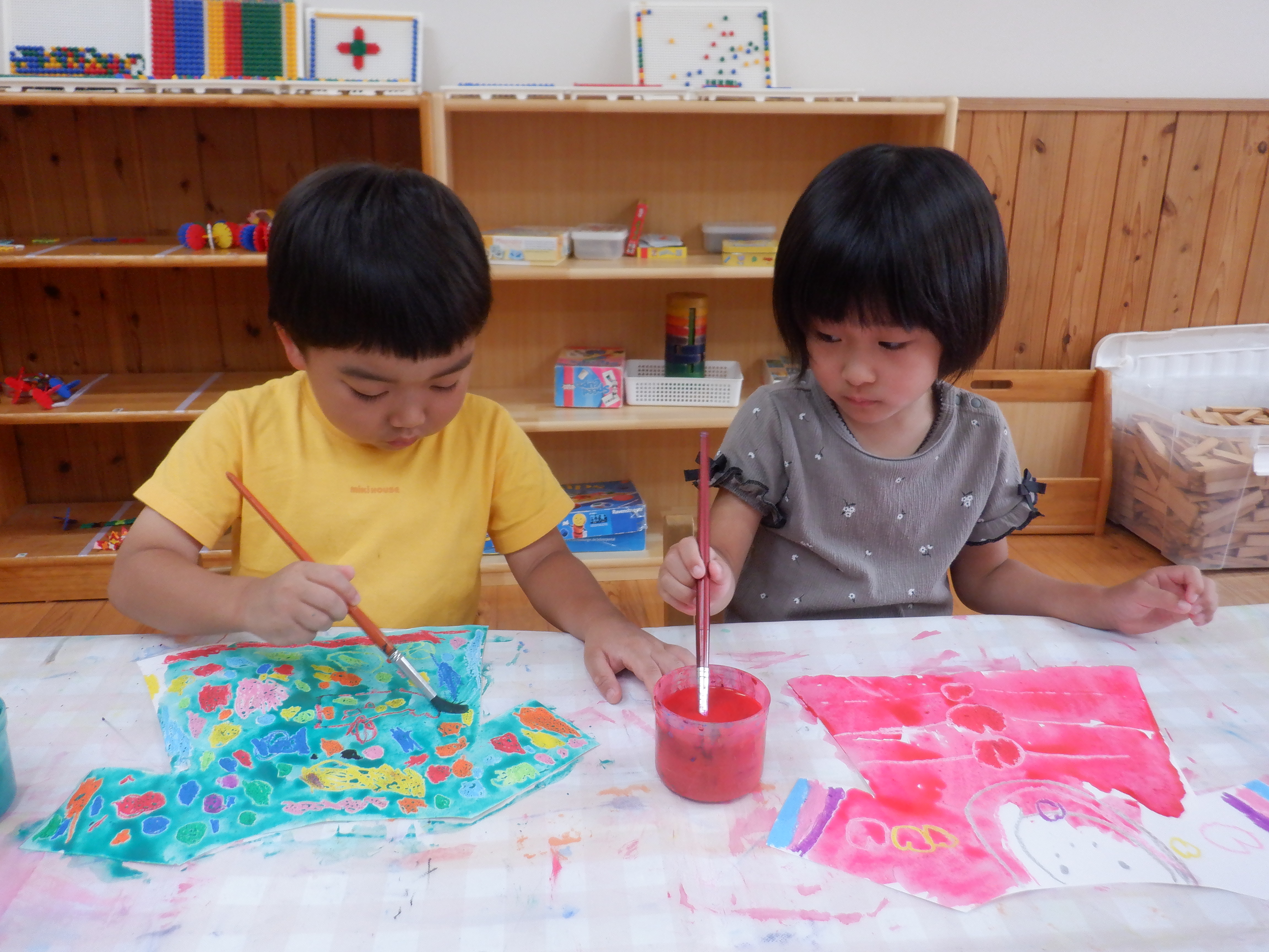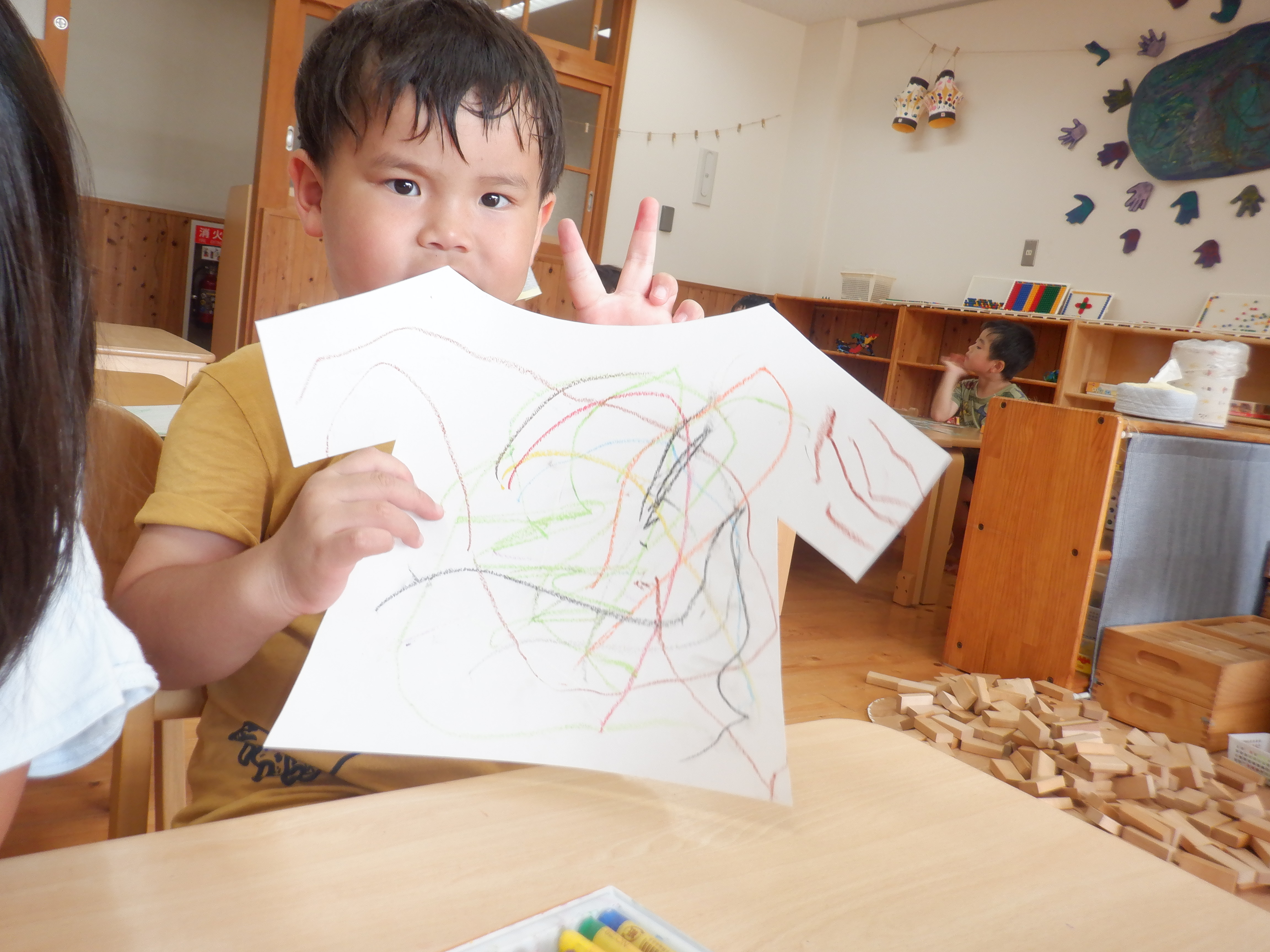 服の形に切った画用紙にクレパスで模様を描きました。好きな絵や線を描いたり本物の服のようなデザインにしたり、思い思いに描いていました。「何色にしようかな」「丸がいっぱい!」と楽しんでいました。そしてクレパスの上から絵の具で色付けしました。ばるばるさんは造形でよく絵の具を使っているので筆も慣れた様子で使っており、ぐりぐらさんやわにわにさんも喜んで色を塗っていました。