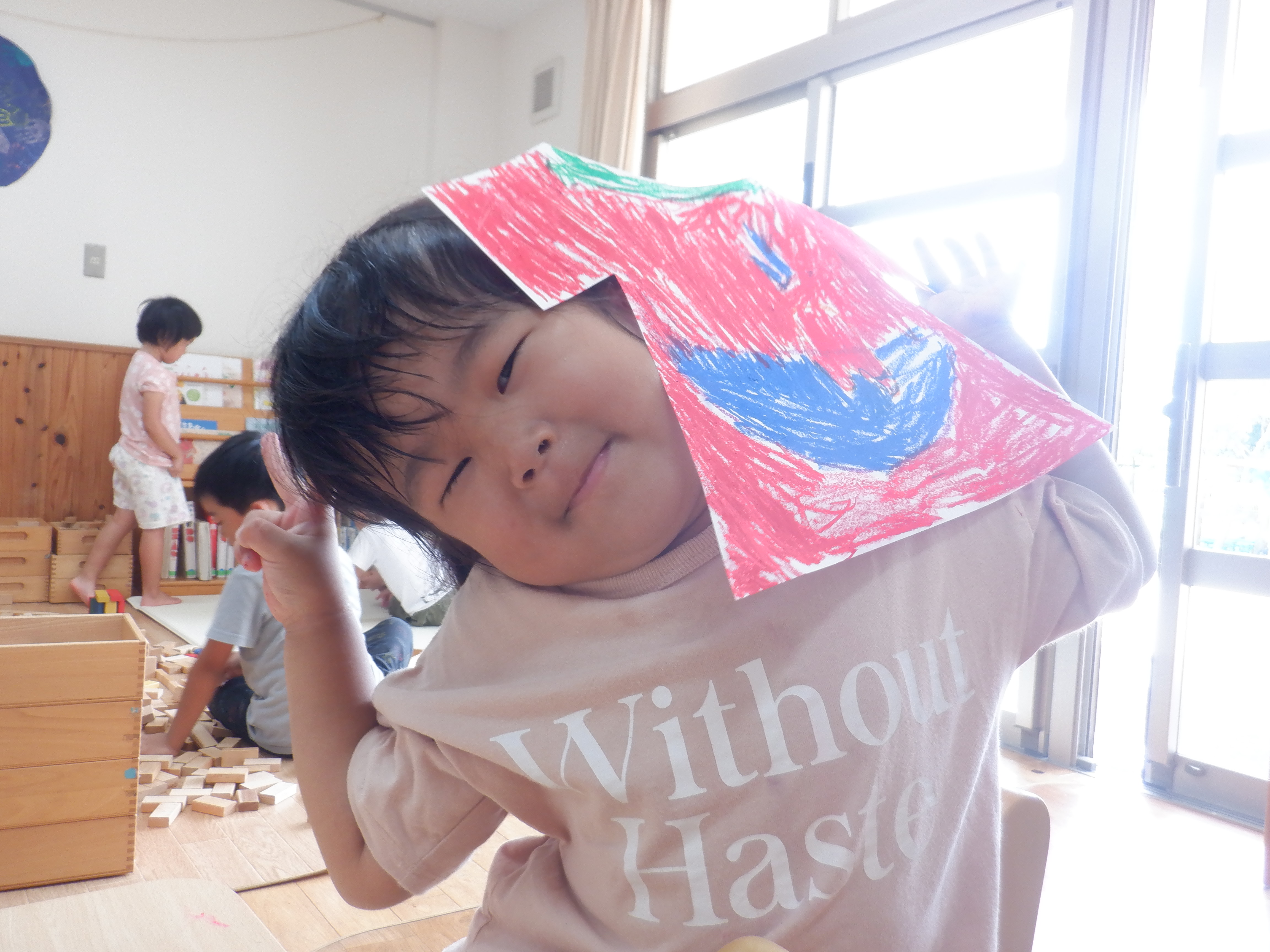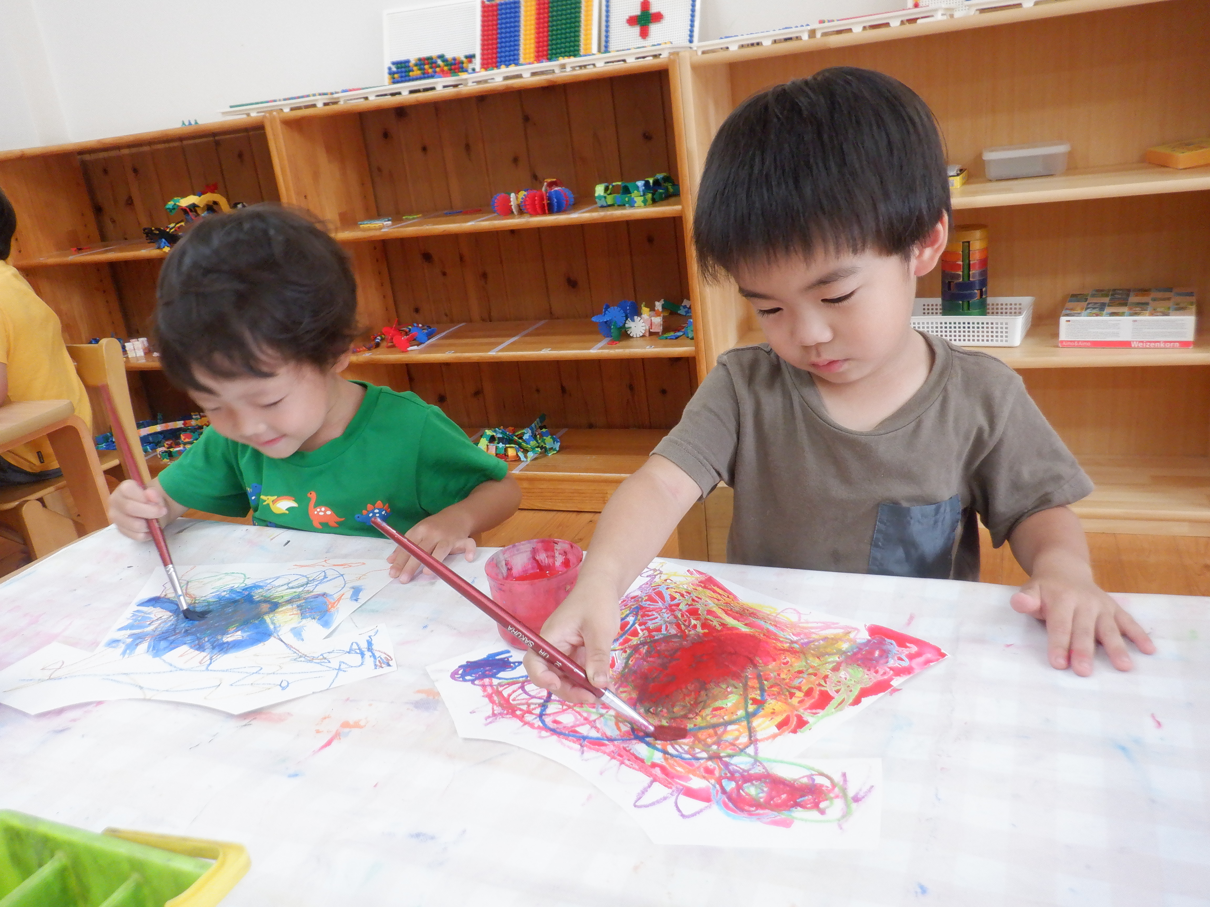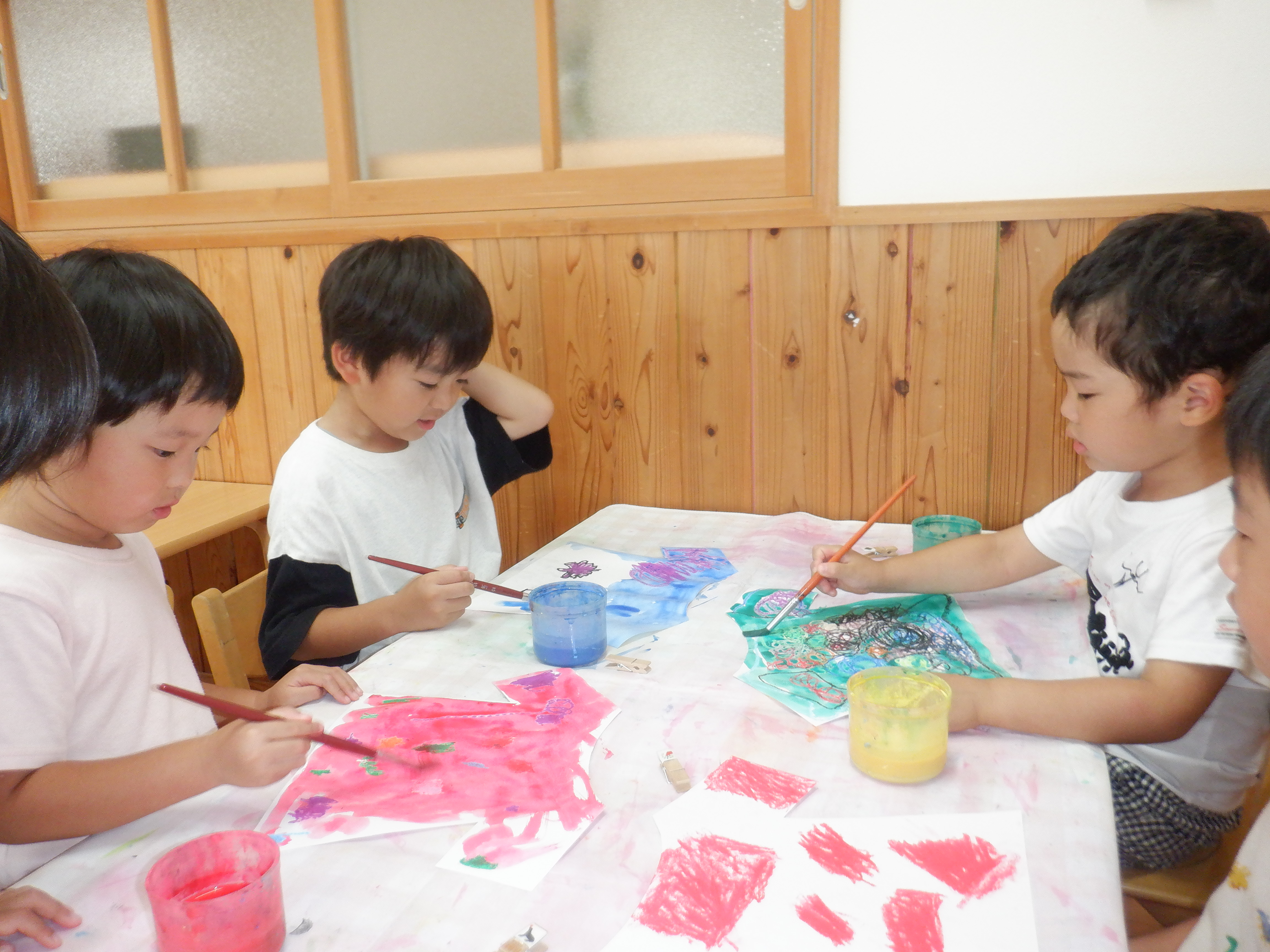 服の形に切った画用紙にクレパスで模様を描きました。好きな絵や線を描いたり本物の服のようなデザインにしたり、思い思いに描いていました。「何色にしようかな」「丸がいっぱい!」と楽しんでいました。そしてクレパスの上から絵の具で色付けしました。ばるばるさんは造形でよく絵の具を使っているので筆も慣れた様子で使っており、ぐりぐらさんやわにわにさんも喜んで色を塗っていました。