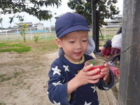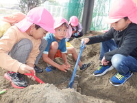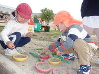 砂場では、カップに砂を入れて石や葉っぱなど自然のものを使ってデコレーションしています。「アイスどうぞ」「ケーキ作ったんよ」と嬉しそうに友だちと見せ合っています。また、大きく穴を掘ったり道のように繋げたりして遊んでいます。バケツで水を運んできて流すと「流れていった!」「こっちにも道を増やそう」と友だちと協力しながら楽しんでおり、砂場遊びが大好きです。