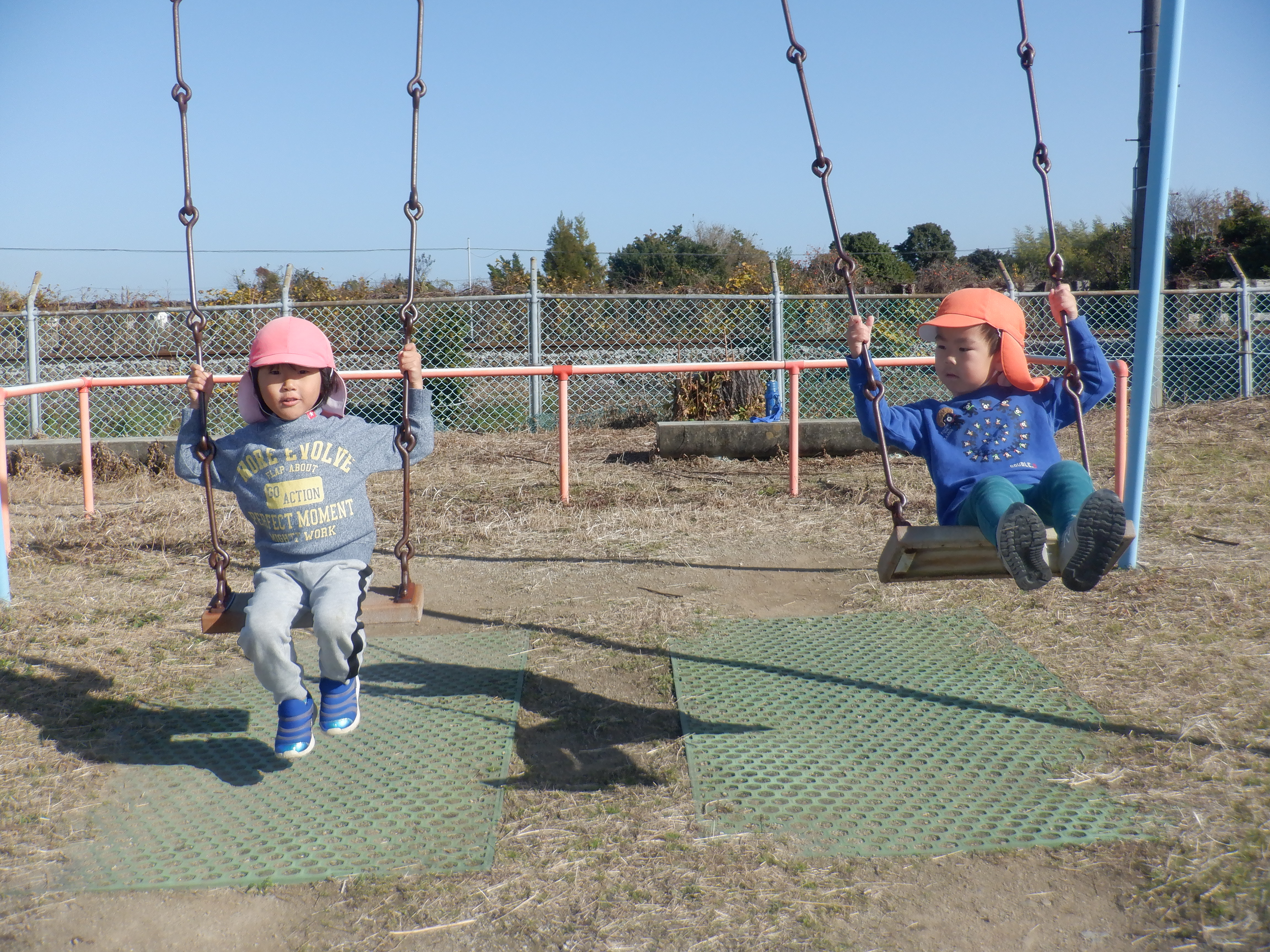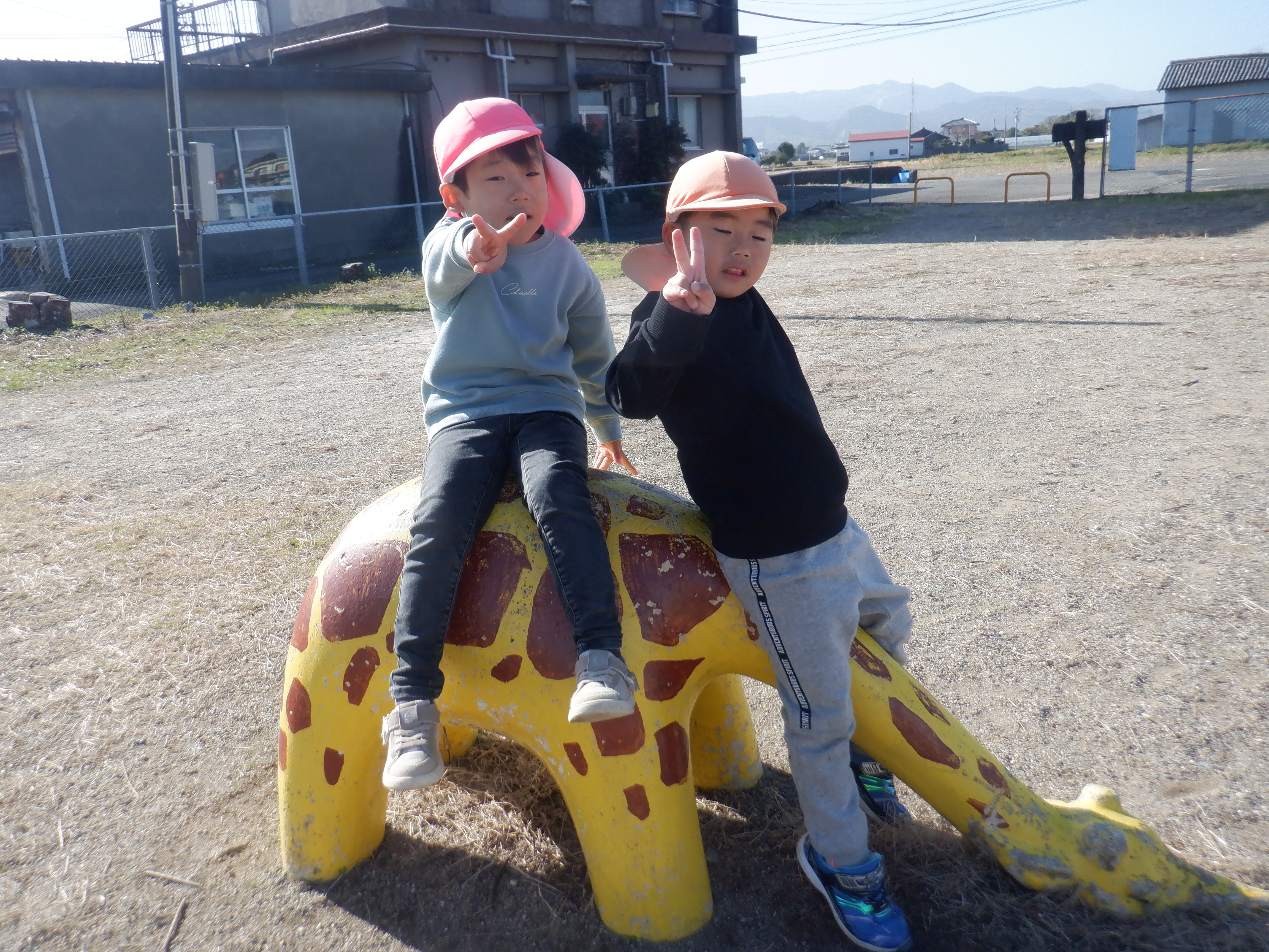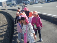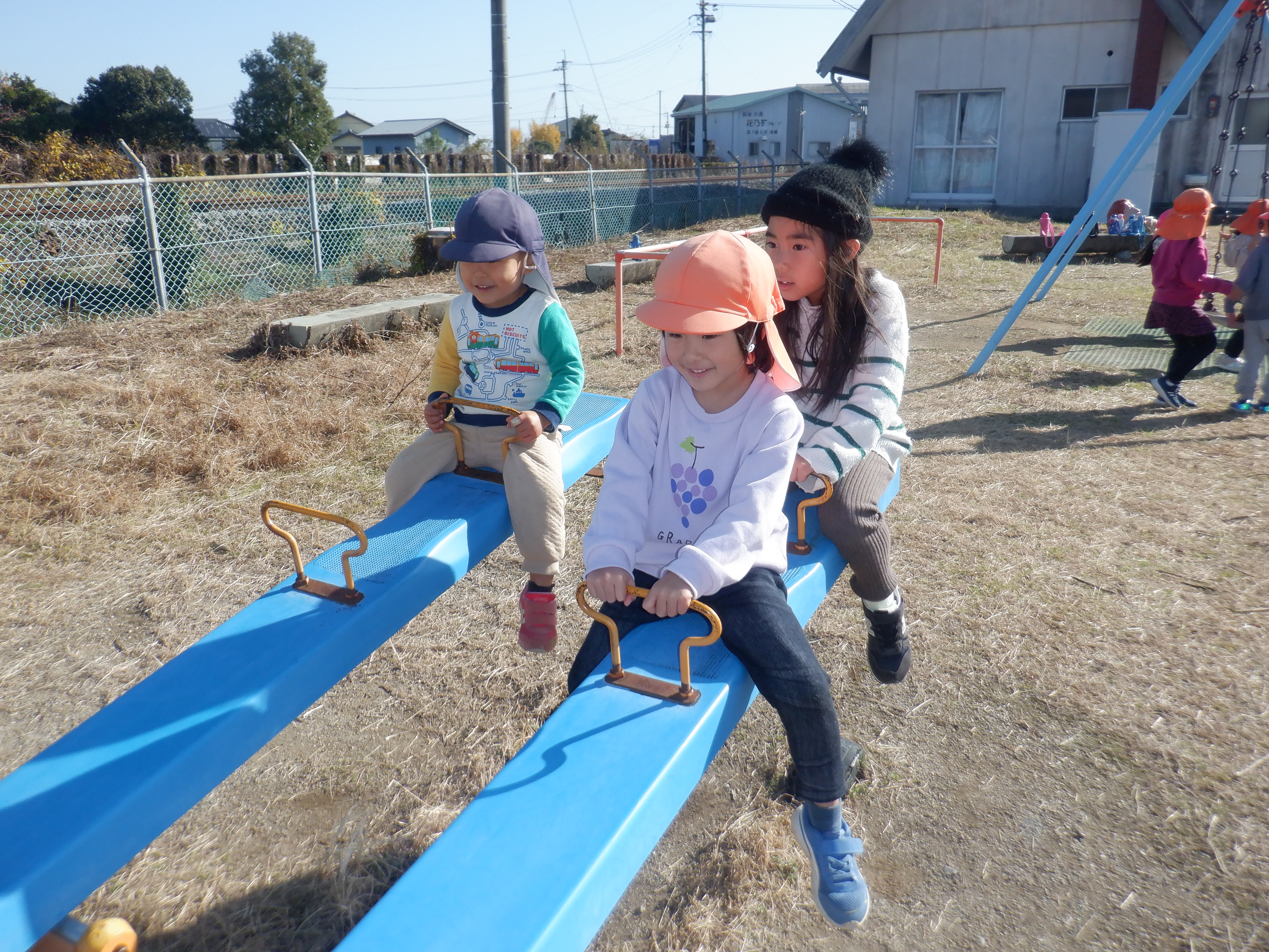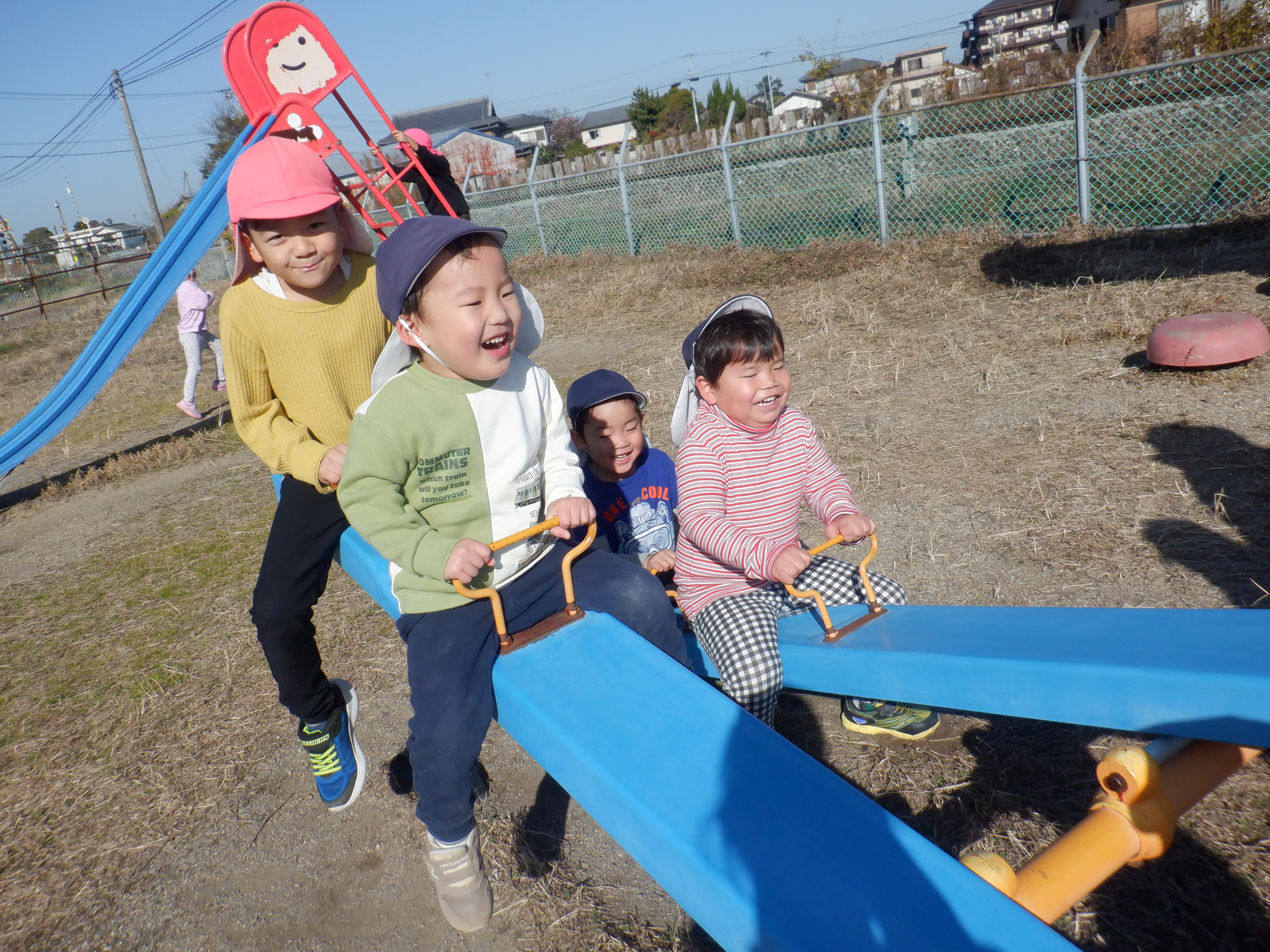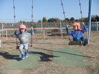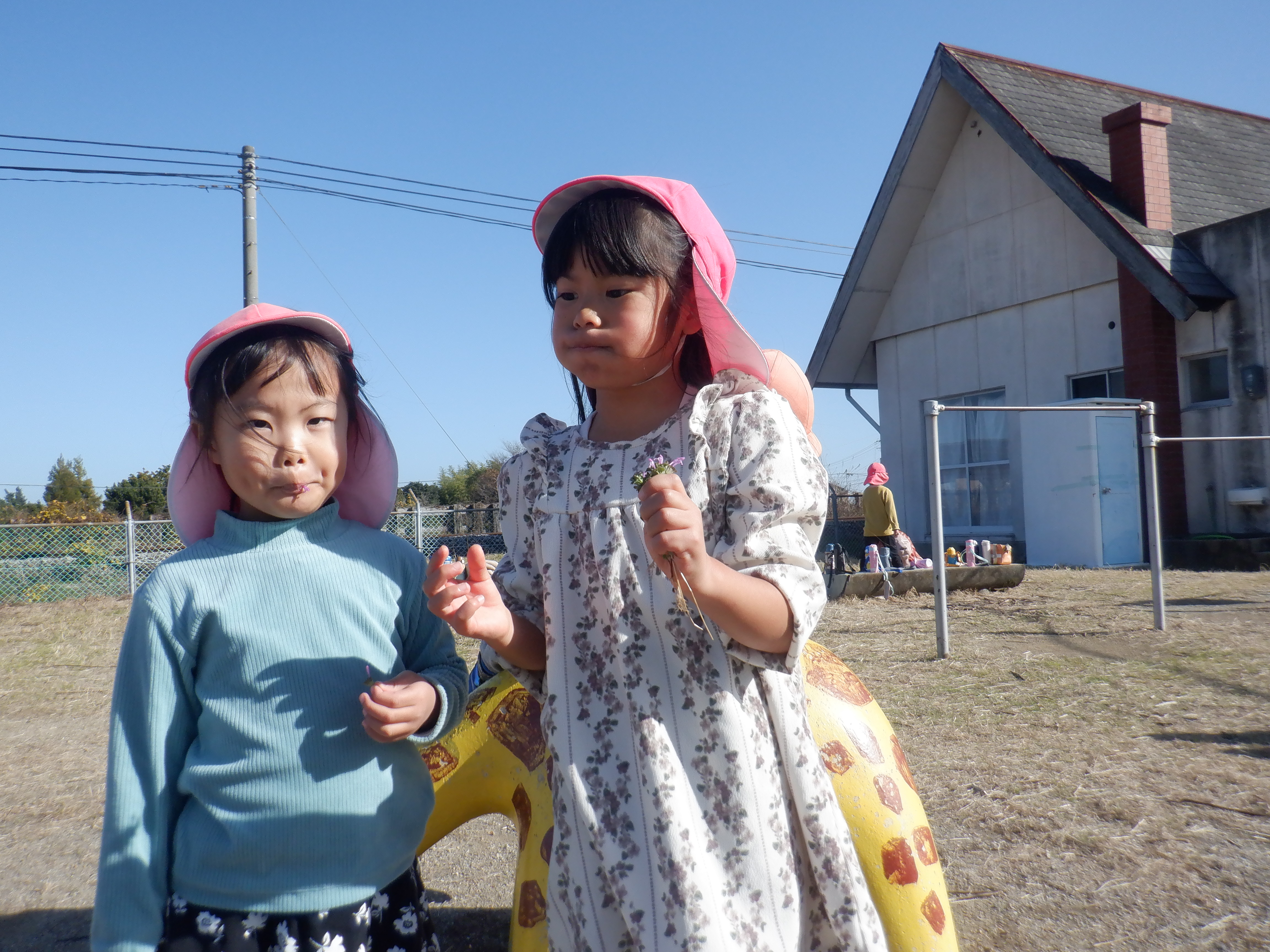散歩に行くのが好きで、歩きながら「あっ柿がなっとる。甘いかな?」「犬がおるなぁ」と友だちと会話を楽しみながら楽しんでいます。シーソーに乗るのも慣れてきて友だちと協力しながら地面を蹴って上下に動くのを楽しんでいます。また、暖かかったためホトケノザが咲いていました。「これって音鳴るんよな」と鳴らすのも挑戦していました。次は近くにある岩の公園にも行ってみたいと思います。
