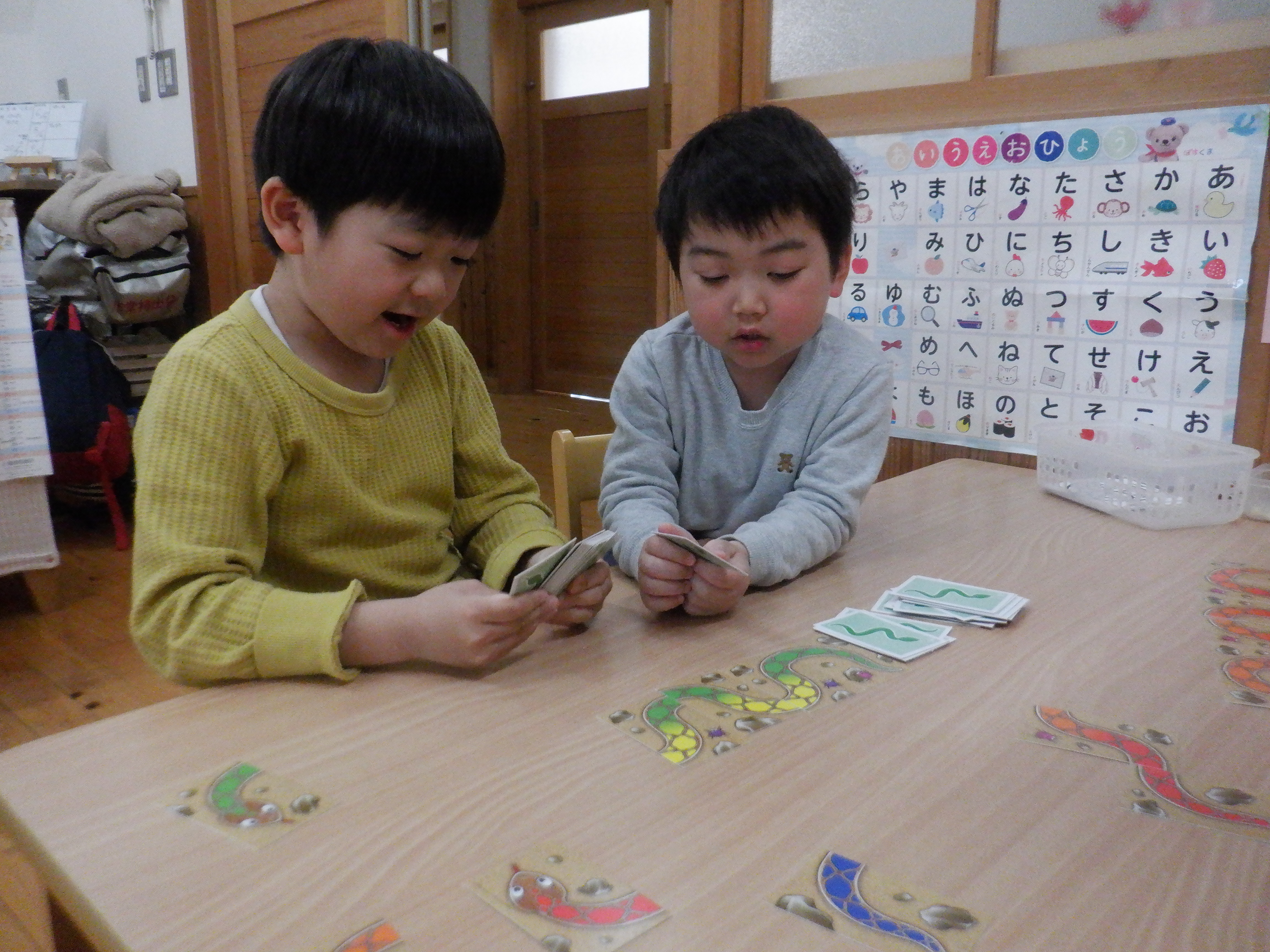 最近は、新しい遊びで”虹色のへび”というカードゲームに挑戦している子どもたちです。