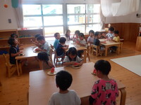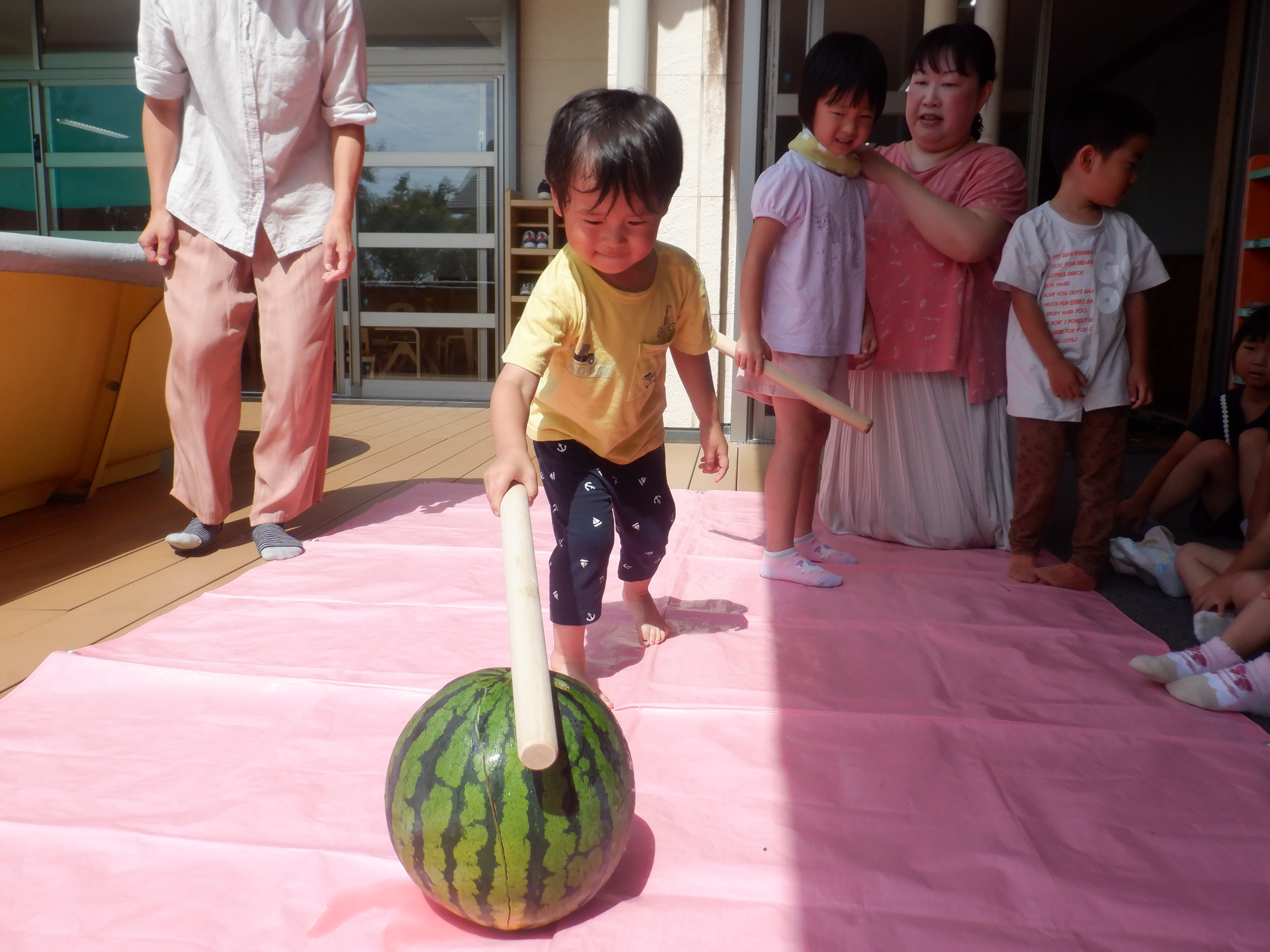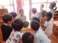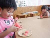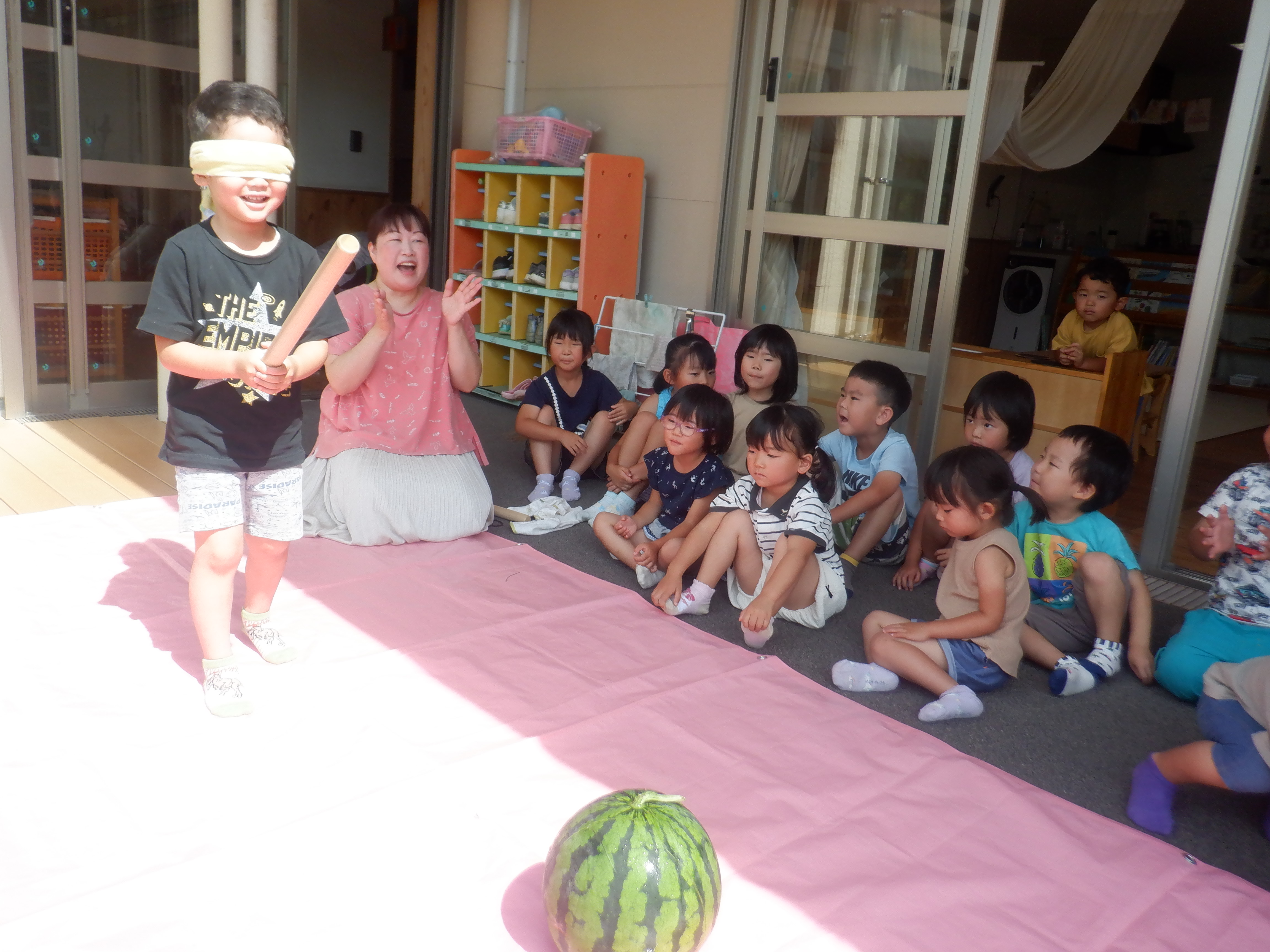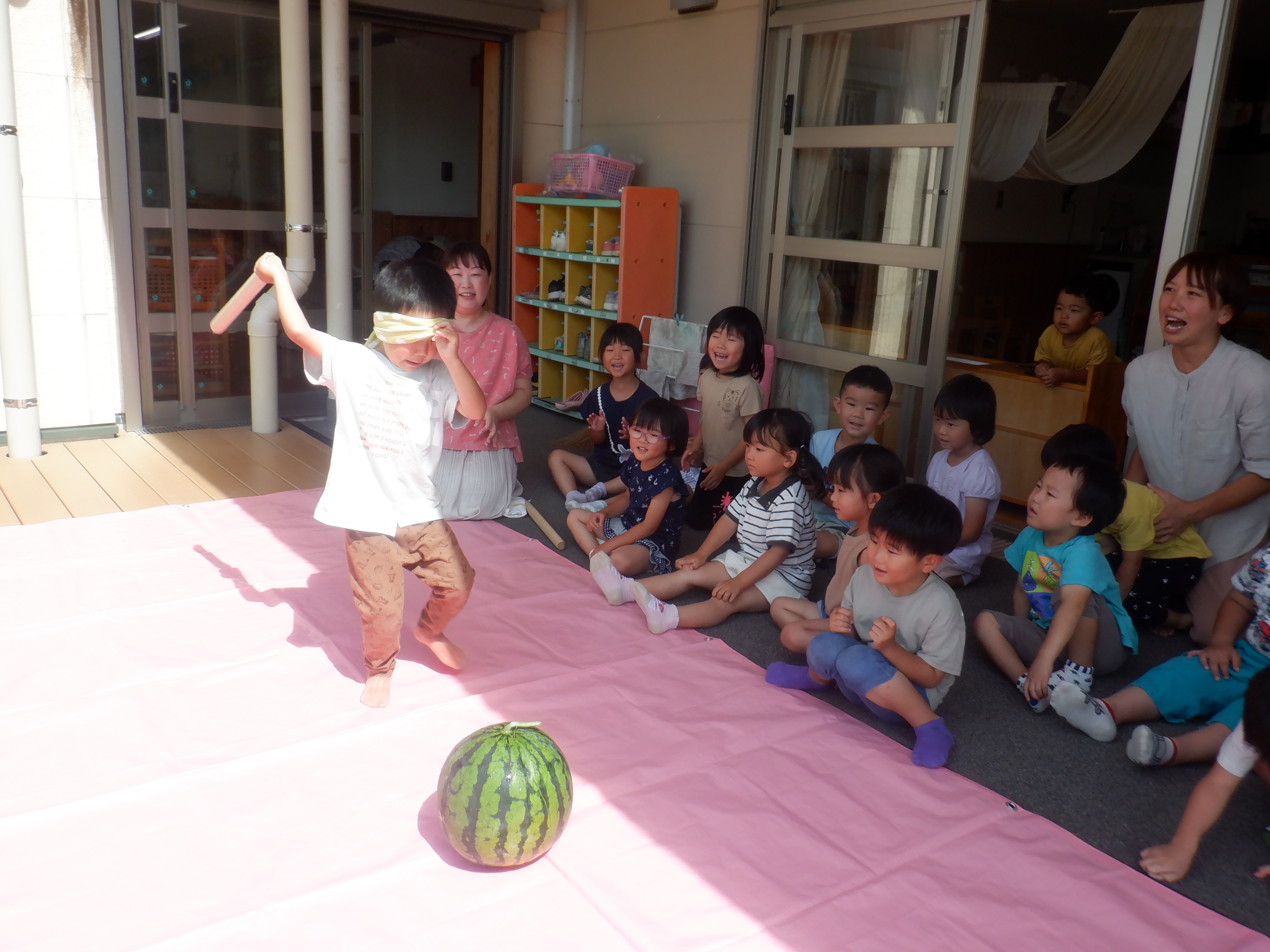大きなスイカに子どもたちは「うわ〜!おおきい!」「これですいかわりどうやってするん!?」と大騒ぎでした。目隠しをする友だちに「がんばれ〜!」と応援したり「まえよ!とまって!」と声をかけたりしながら盛り上がりました。割れたスイカはそれぞれが好きな大きさで食べました。苦手な子も「ちょっとだけ、、、」と言いながら口にしていました。