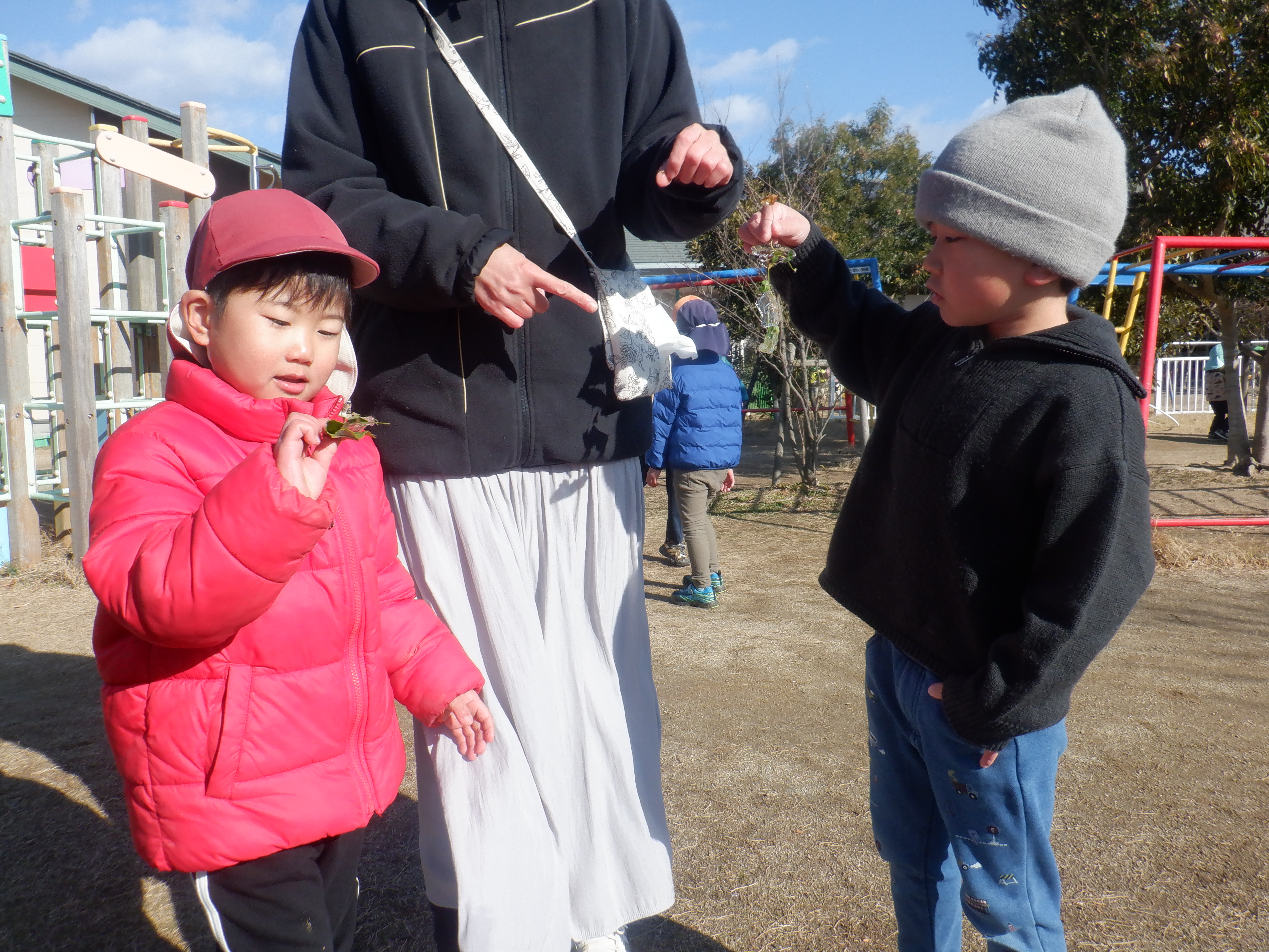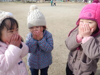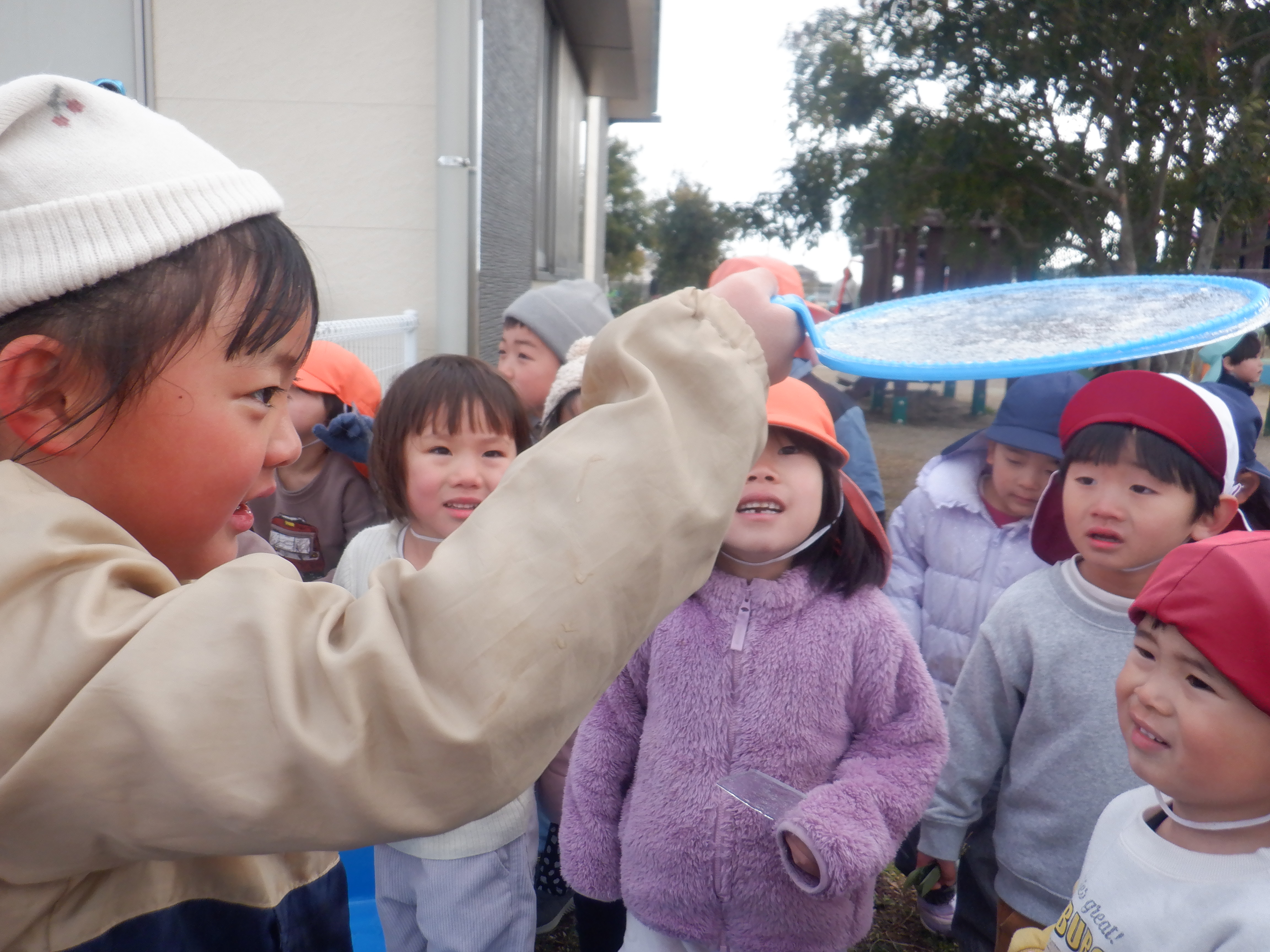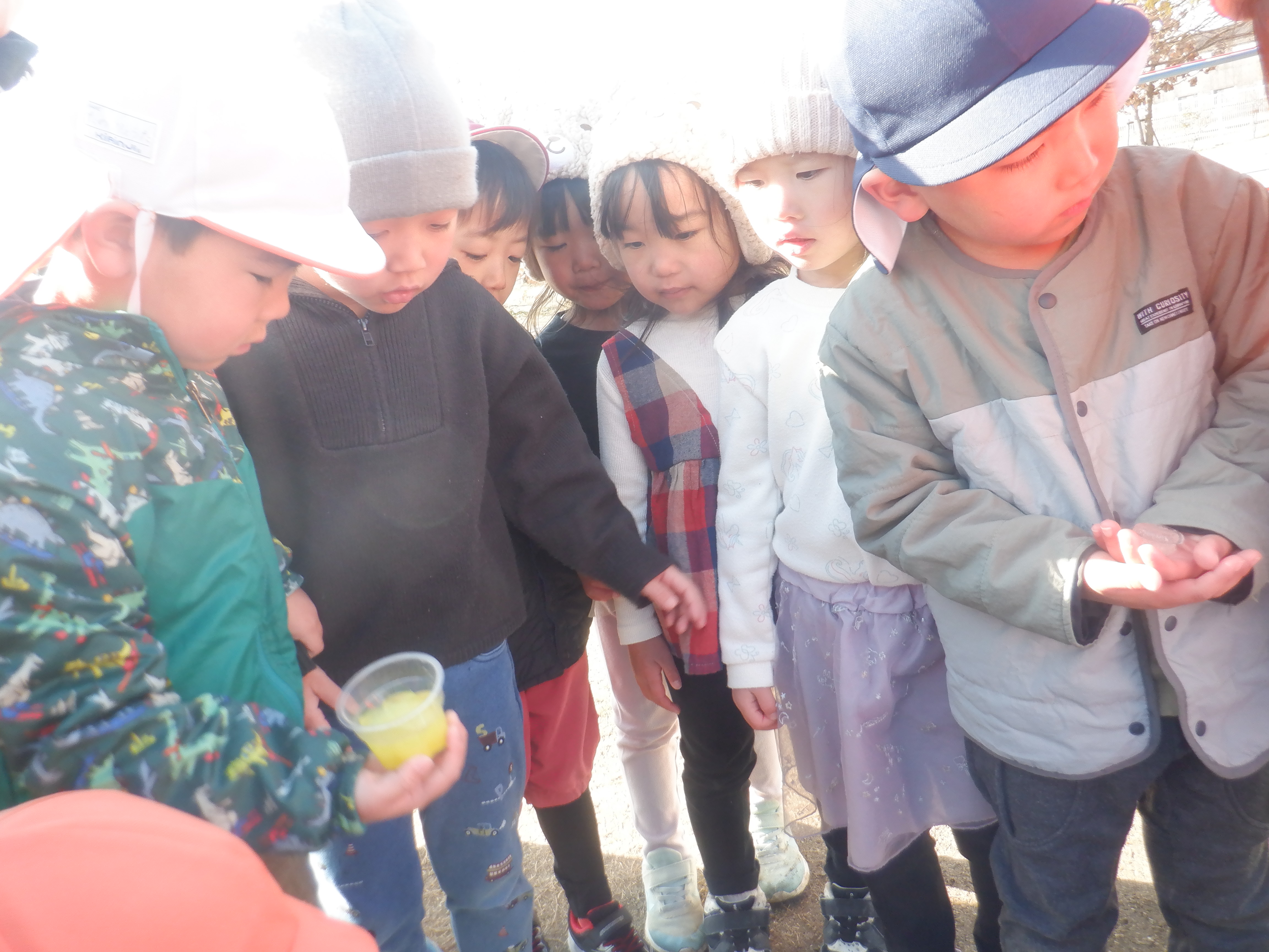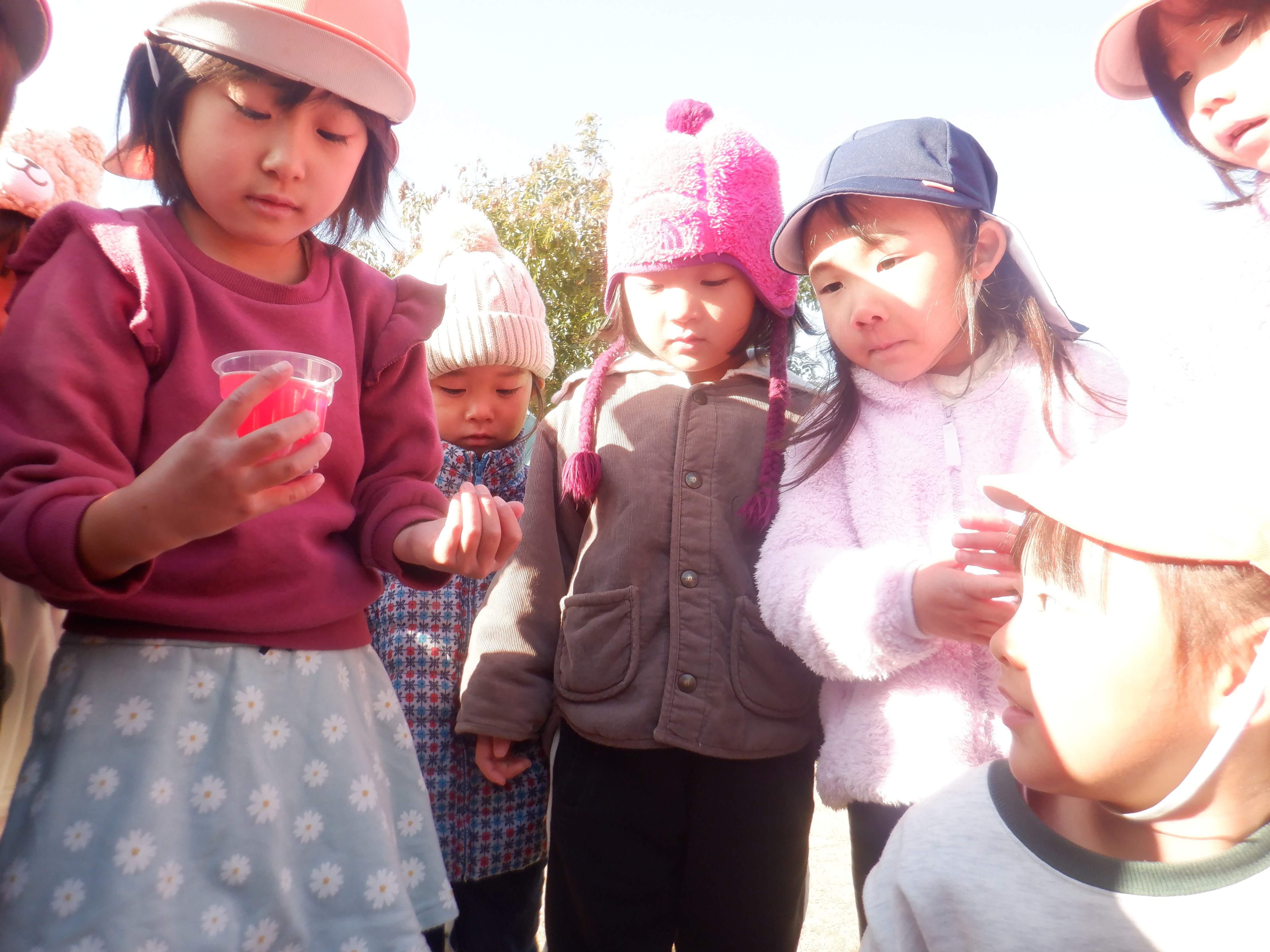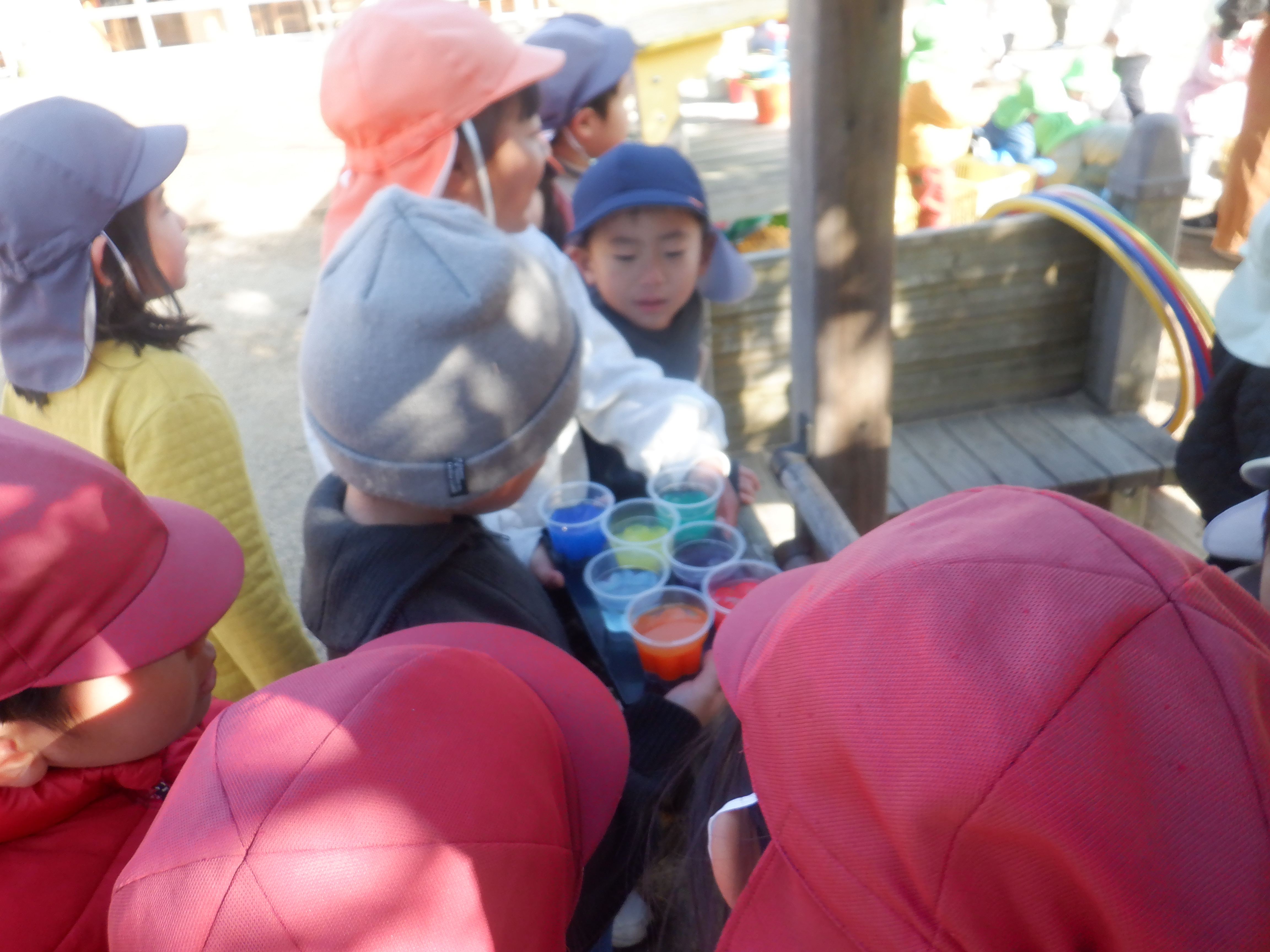 雪が降る予報だったので前日に水をいろんなものに入れて凍らせてみました。水曜には凍っていないものもあり残念そうなこどもたち。それでも次の日に再チャレンジした氷は大成功!「こすもすの子にも見せてあげよう」と嬉しそうに見せにいきます。プリンカップの色水の氷は「なんかおいしそうやな」とつぶやく子どもたちです。