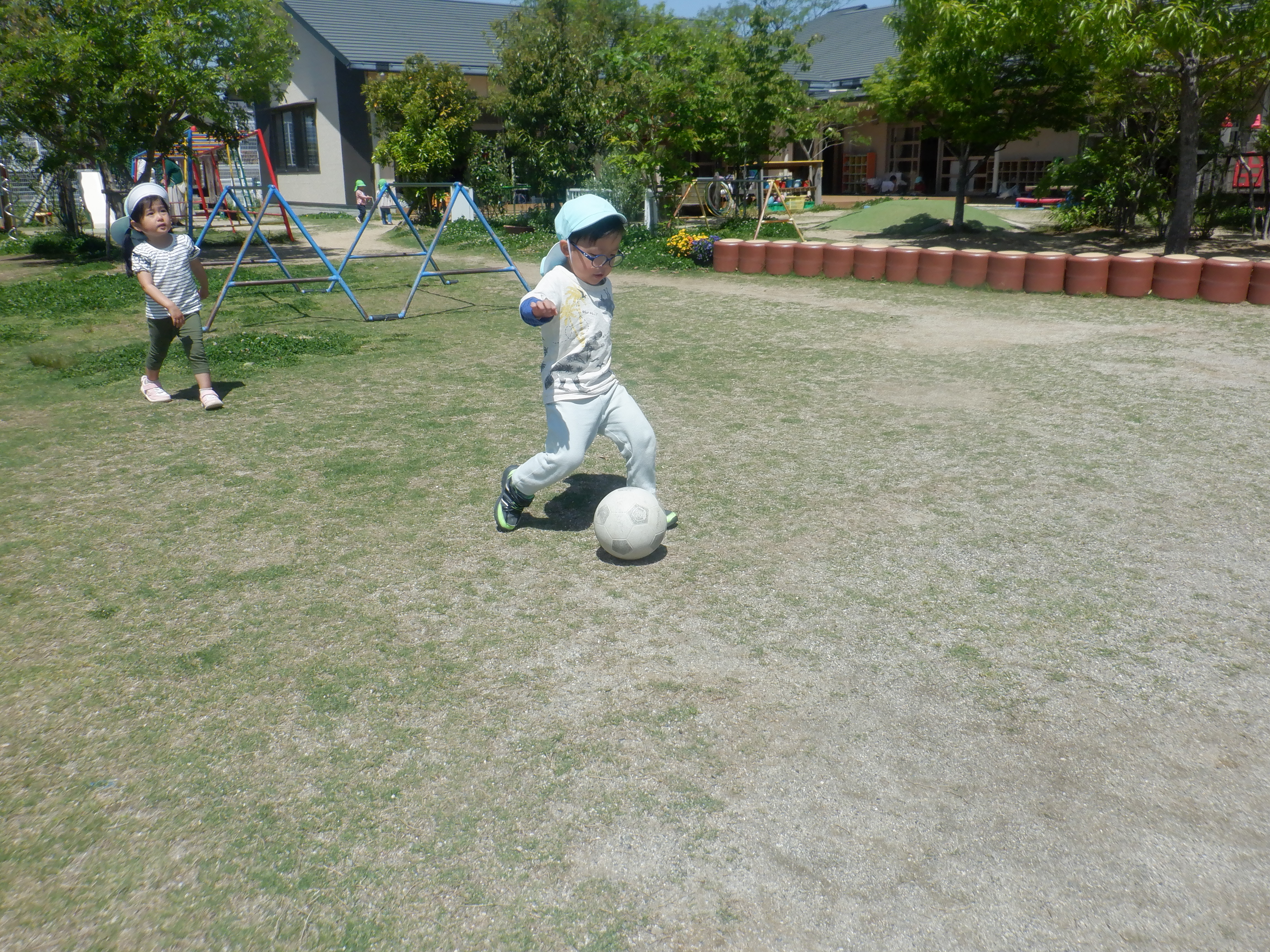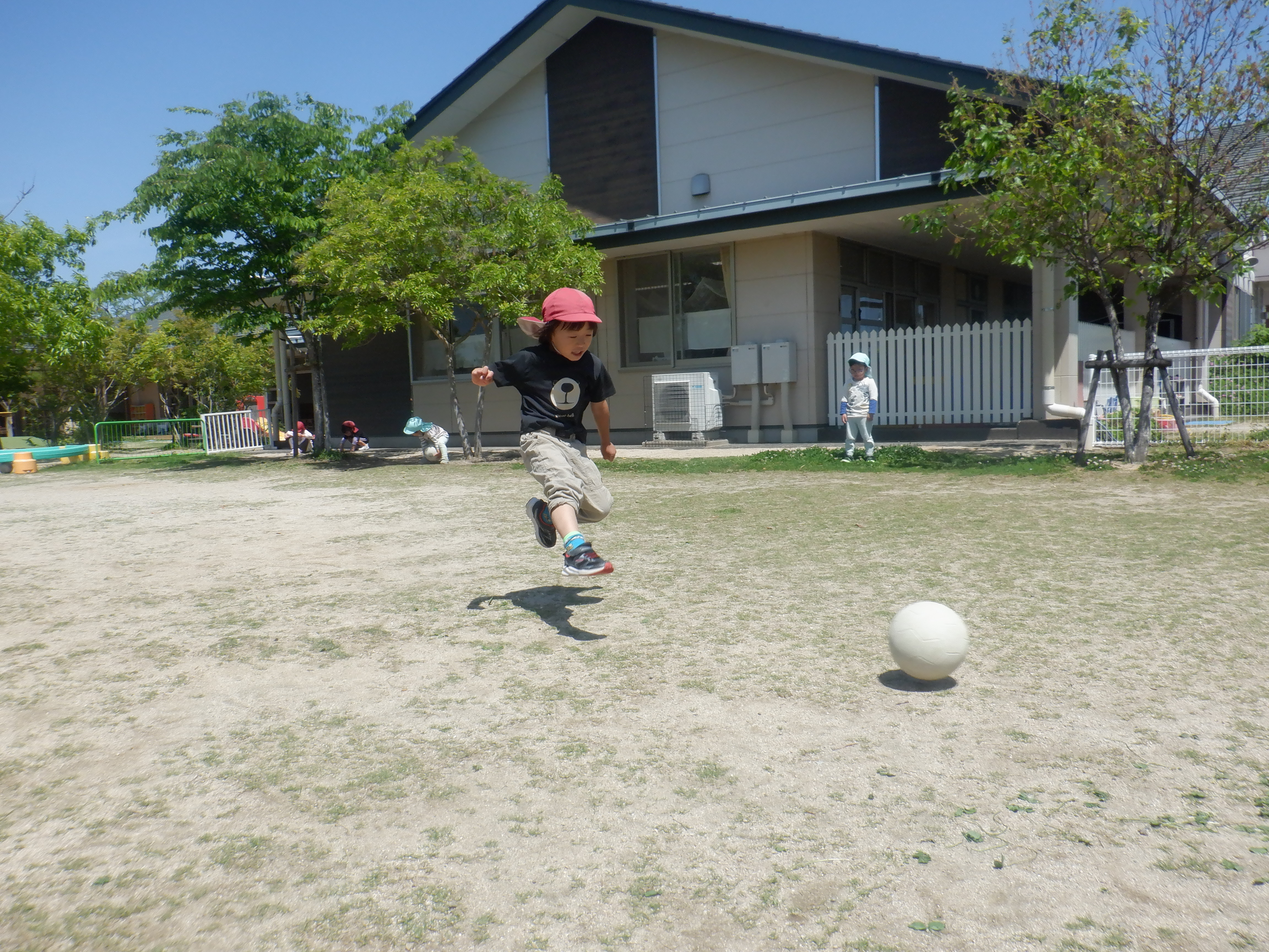 春らしく過ごしやすい気候で、園庭では、伸び伸びと、友達と一緒に遊具で遊んだり、サッカーボールを蹴り合ったりしています。