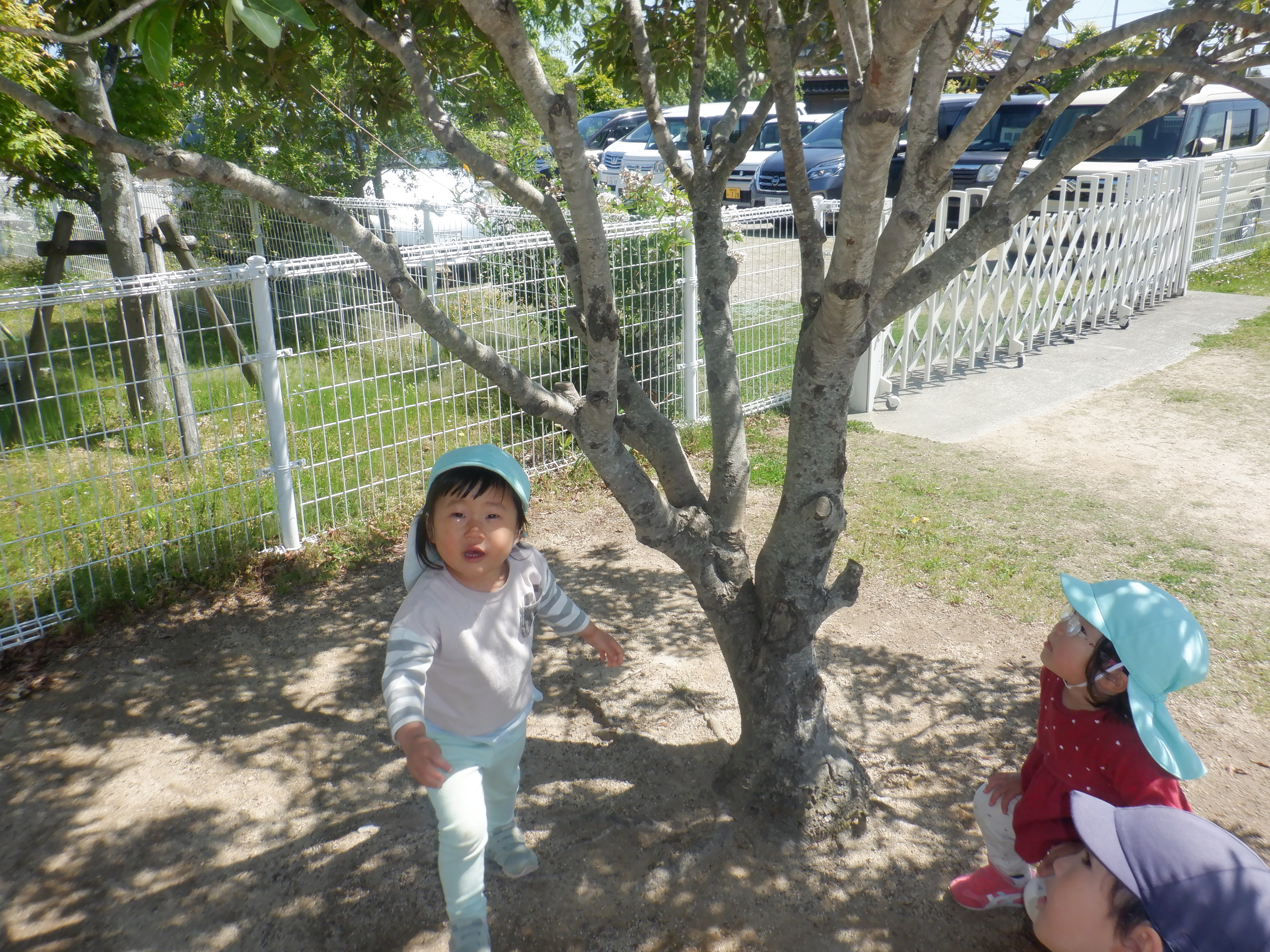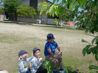 ヤマモモやサクランボ、ウメなど、木に実がなっていることに気がついた子どもたち。「まだ、小ちゃいなぁ。」「ちょっと赤くなってる。」と、楽しみにしているようです。