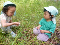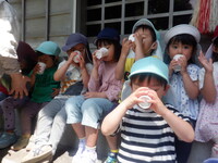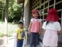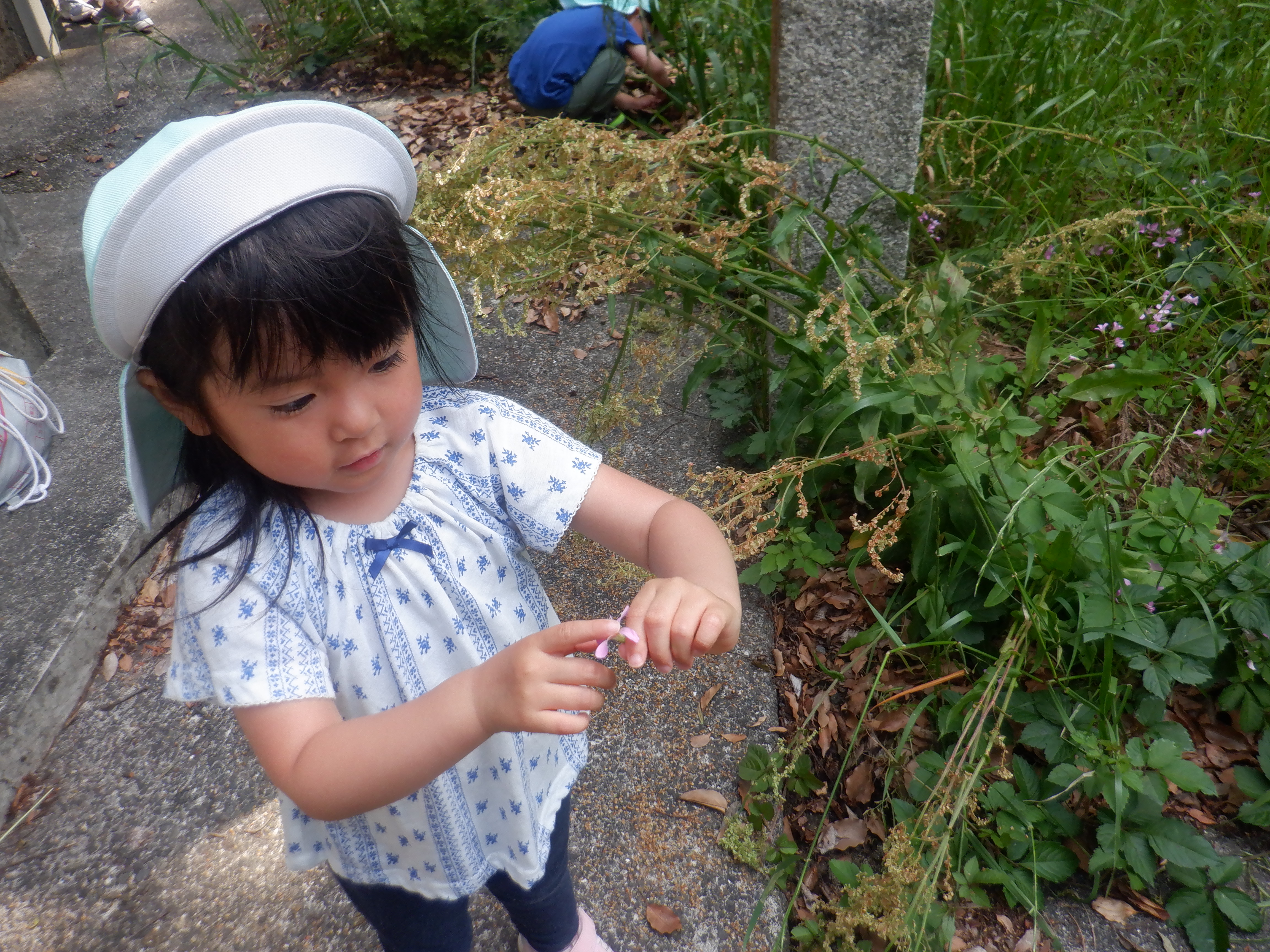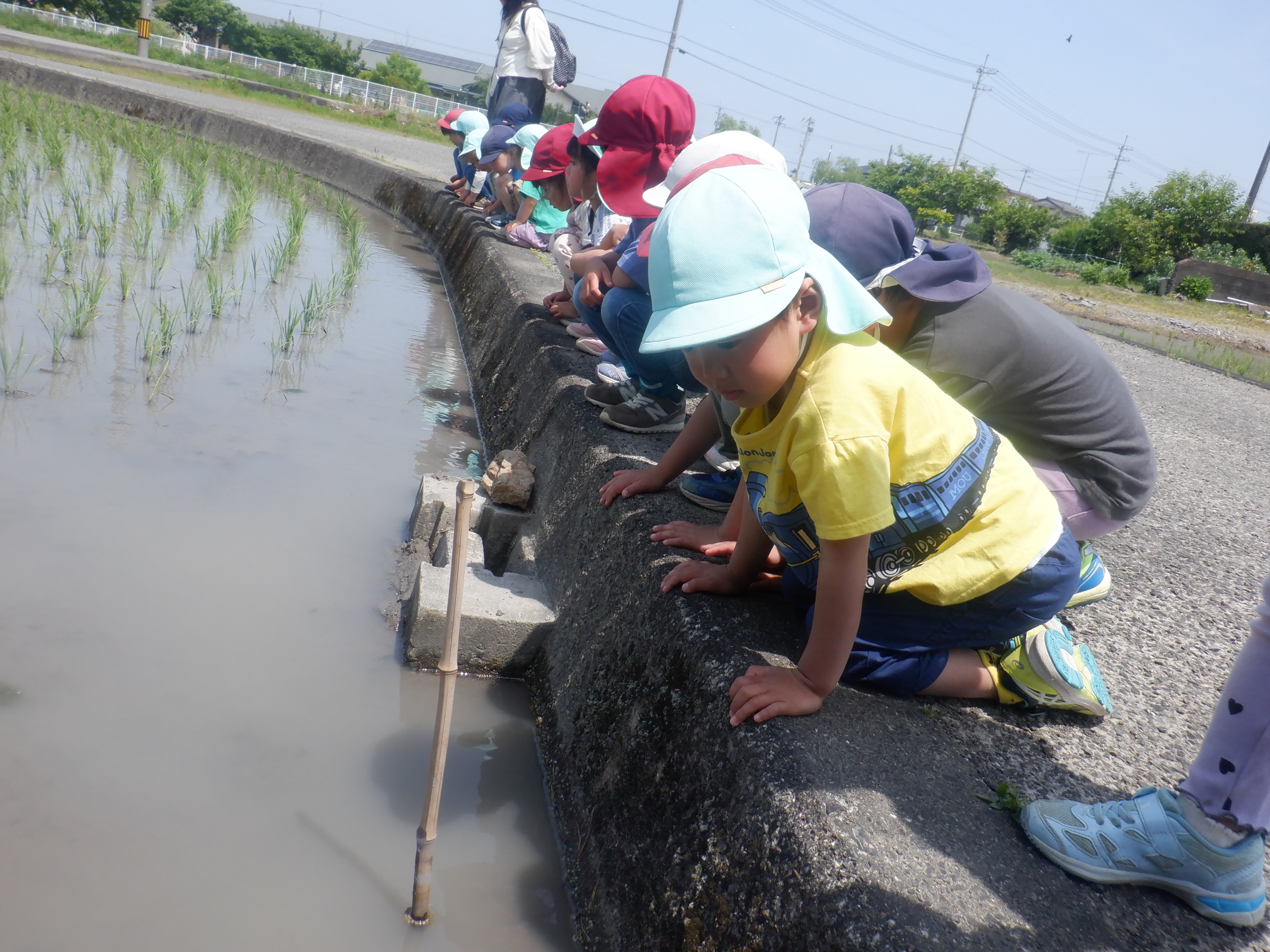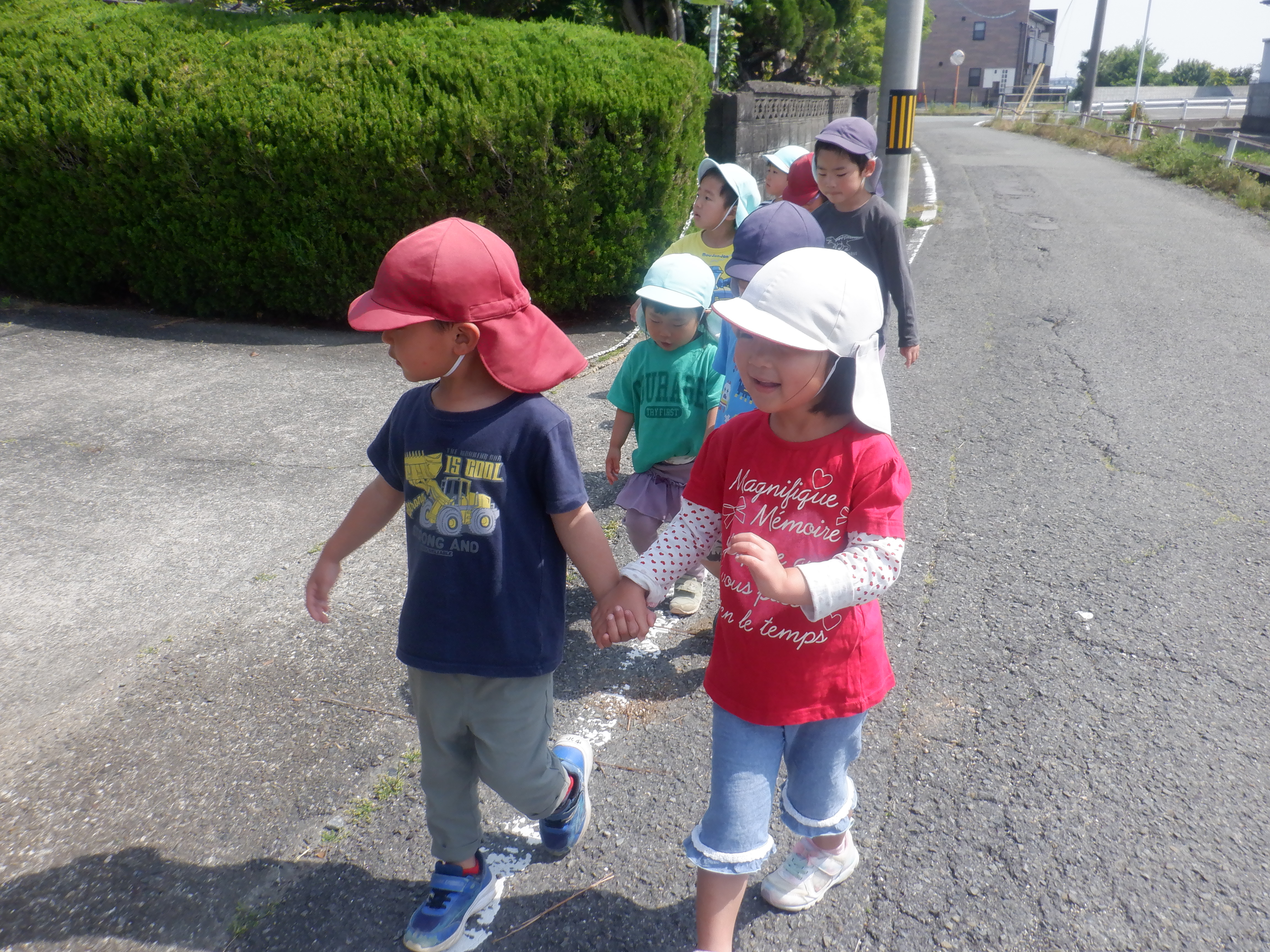 今年度に入って初めての散歩に行きました。新しくペアになった友だちと手を繋ぎ、宮神社まで歩きました。道中、田んぼにあめんぼやおたまじゃくし、イモリなどが居るのを見つけ、「およぐんじょうずやな。」「いっぱいおるな!」と盛り上がっていました。